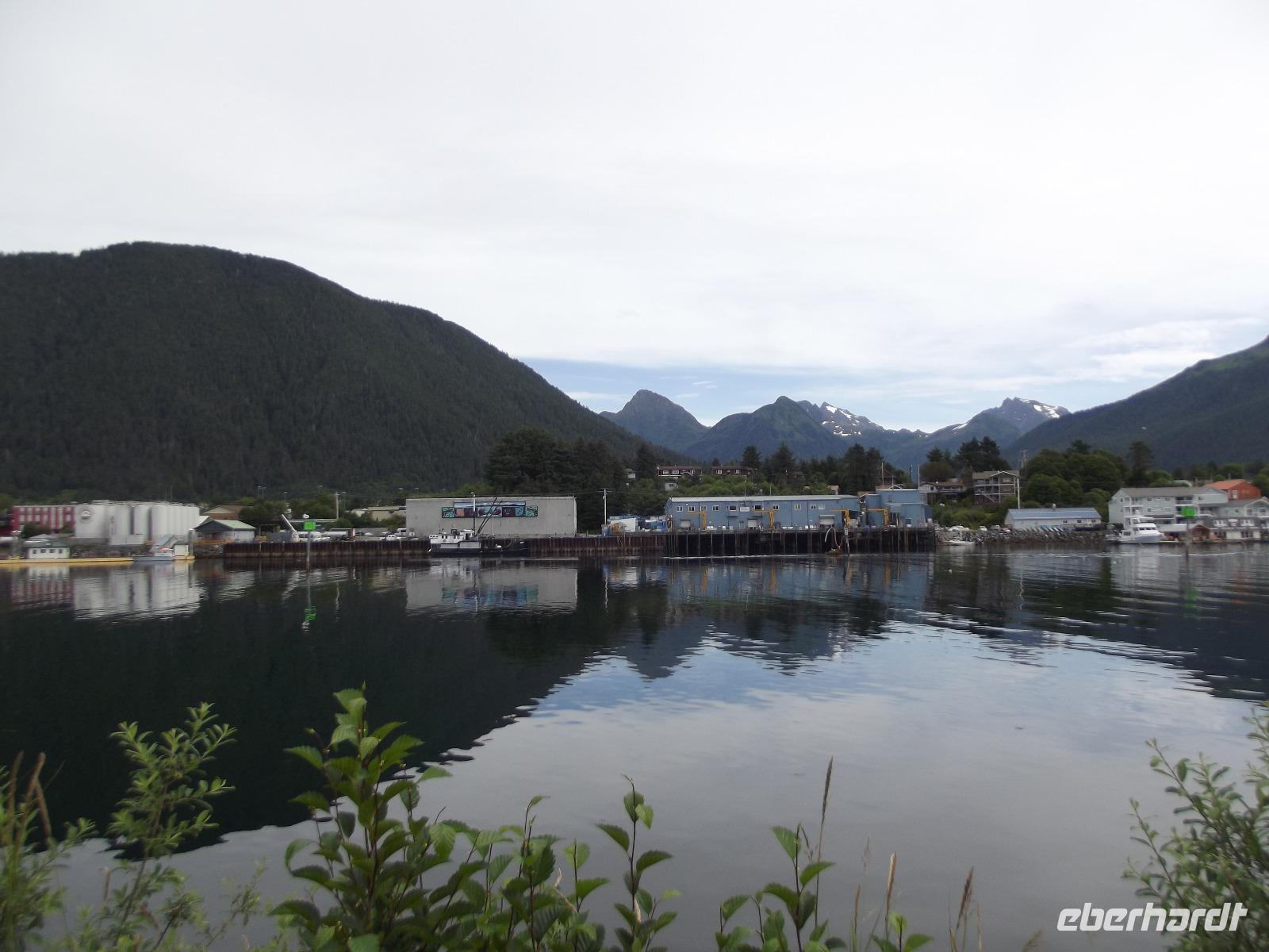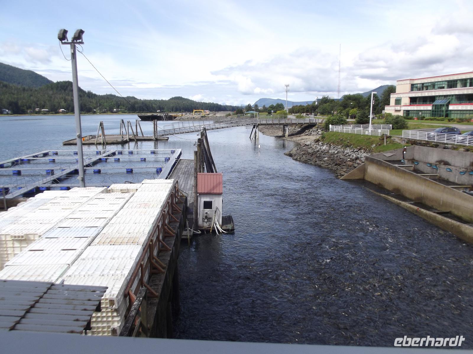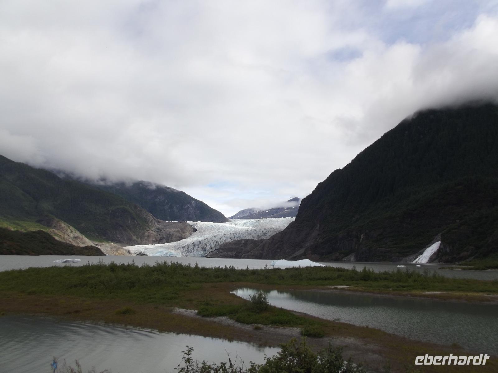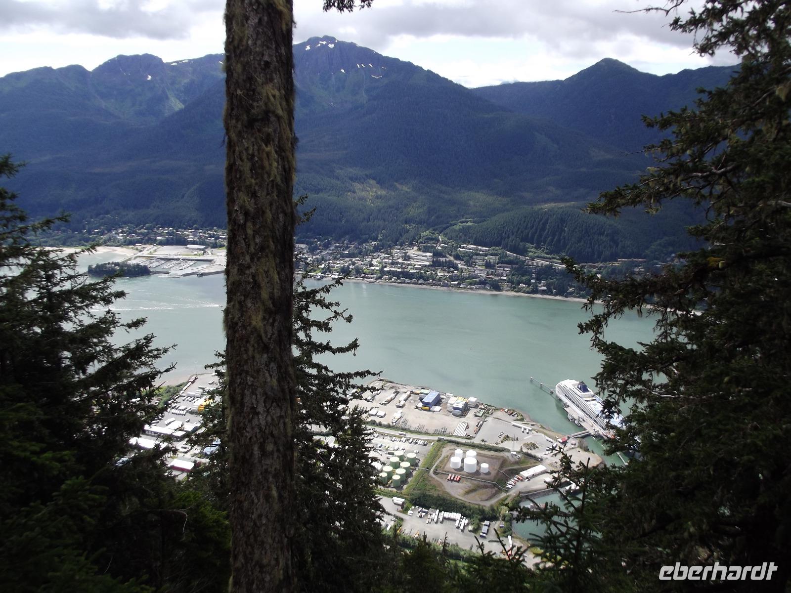 Heute steht unser exklusiver Eberhardt-Ausflug in Juneau auf dem Programm. Nach dem Frühstück holt uns unsere Fahrerin Peggi vom Pier ab - und los geht's! Es zieht uns zunächst zum Mendenhall Gletscher, der königlich zwischen zwei Berghängen sitzt und in einem tollen Blau strahlt. Das Eis an der Gletscherkante ist bis zu 150 Jahre alt und es gibt über 100 Gletscherzungen. Im Besucherzentrum kann man sich über die Entstehung des Gletschers und über die umliegende Tierwelt informieren. Auf dem Gelände befinden sich einige Wanderwege, die sich durch die Natur schlängeln. Die gefüllten Lachsbäche und das platt gedrückte Gras lässt stark vermuten, dass die Bären nicht weit sind, aber trotz unserer Ausdauer haben wir leider kein Glück. Der rote, springende Lachs ist allerdings genauso beeindruckend. Um mehr über den Lachs zu lernen, fahren wir zu einer naheliegenden Aufzuchtstation, wo uns der Mitarbeiter über die Zucht und den Lebenslauf des Fisches erzählt. Wir besuchen eine Hütte, in der sich mehr als eine Million Baby-Lachse tummeln und beim Heraustreten aus der Hütte, können wir unseren Augen kaum glauben: da schwimmen Seehunde um die Fischbecken und lassen es sich gut gehen. Unsere Fahrerin Peggi möchte die Zeit noch nutzen und macht eine kleine Stadtrundfahrt mit der Gruppe bis hin zur Mount Robert Tramway - eine der steilsten Pendelbahnen der Welt, die wir natürlich auch hochfahren. Von oben hat man einen fantastischen Blick auf die Kreuzfahrtschiffe und den Hafen. Auf der Fahrt nach unten sehen wir, wie Weißkopfseeadler um die Gondel kreisen und uns willkommen heißen. Der restliche Tag steht zur freien Verfügung und viele bummeln noch durch Juneau, bis wir uns bei Abendessen wiedertreffen.