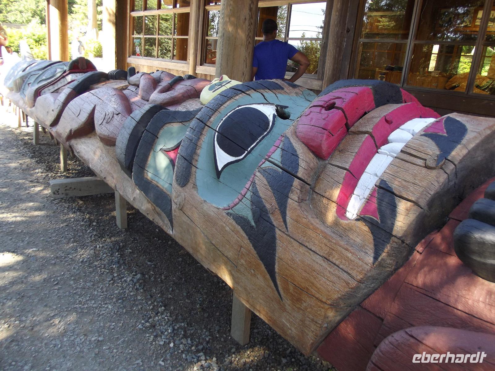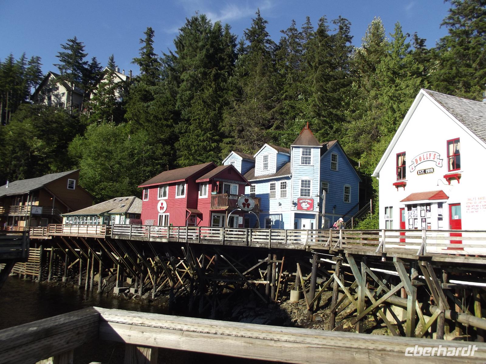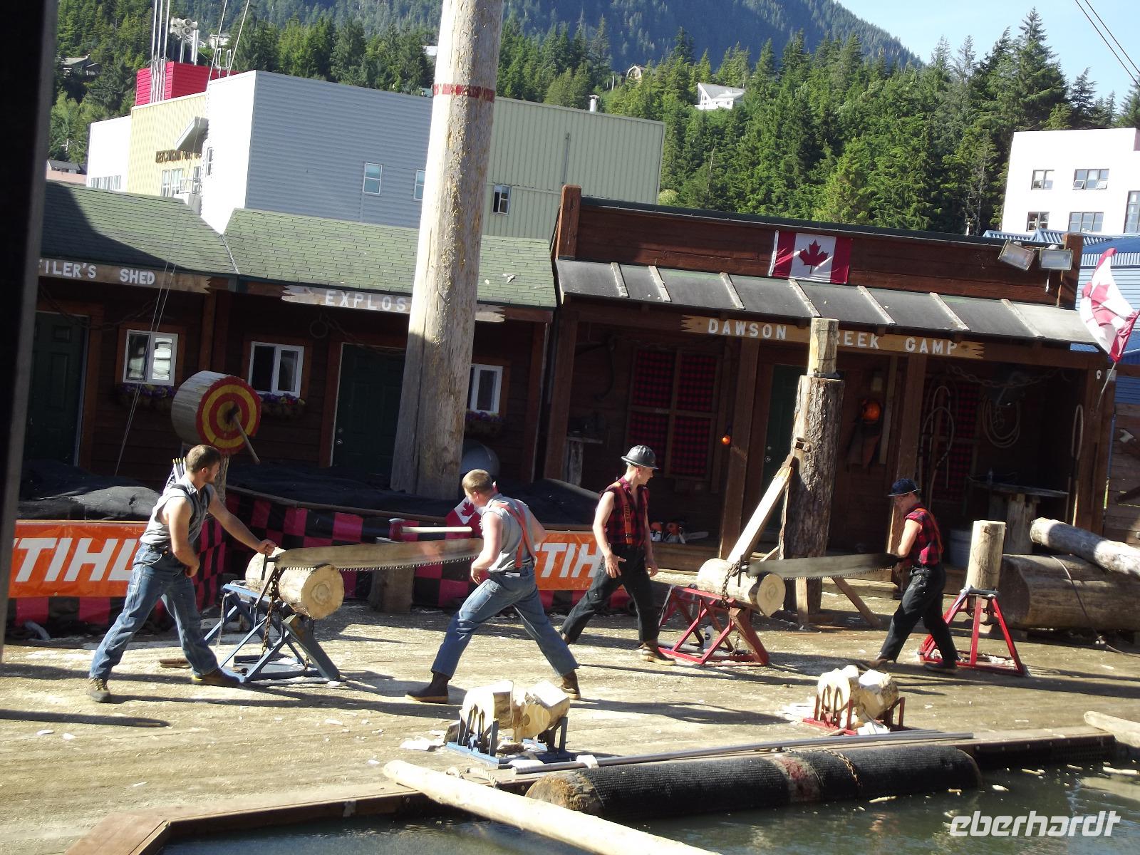 Heute haben wir eine ganz besondere Ehre: wir werden von der Crew eingeladen, die Einfahrt in den Hafen von Ketchikan auf dem Helipad zu sehen. Auch heute Nachmittag steht ein wunderbarer Ausflug an: wir lernen die Lachshauptstadt Alaskas kennen. Wir besuchen zunächst das „Saxman Native Village" - ein ehemaliges Indianerdorf mit Totempfählen, Winterscheunen und einer Werkstatt, in der noch immer Totempfähle geschnitzt werden. Jeder dieser Pfähle hat seine eigene mystische Geschichte, oft Familiendramen oder politische Themen. Danach geht es zur Lumberjackshow: eine Unterhaltungsshow, in der junge, starke Männer sich in verschiedenen Disziplinen duellieren, wie z.B. beim Holzhacken, Axtwerfen oder Sägen.