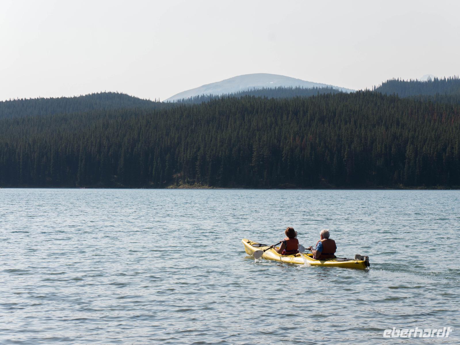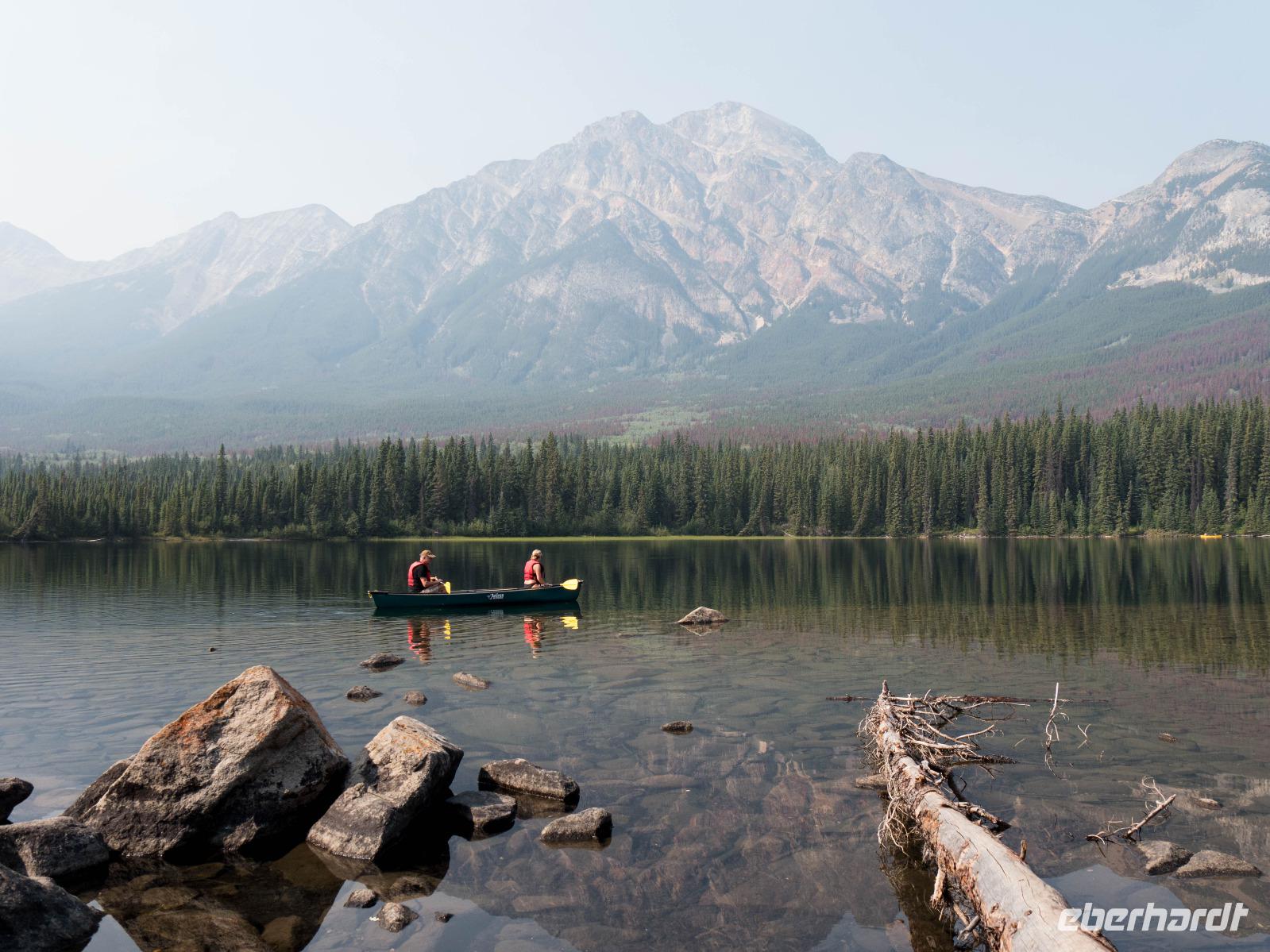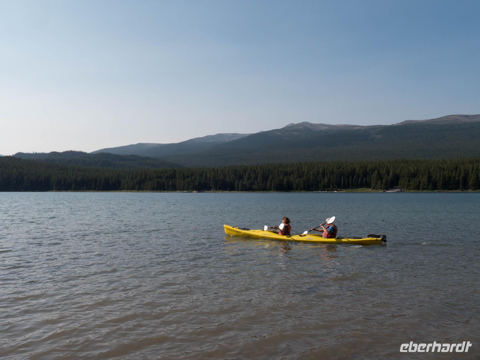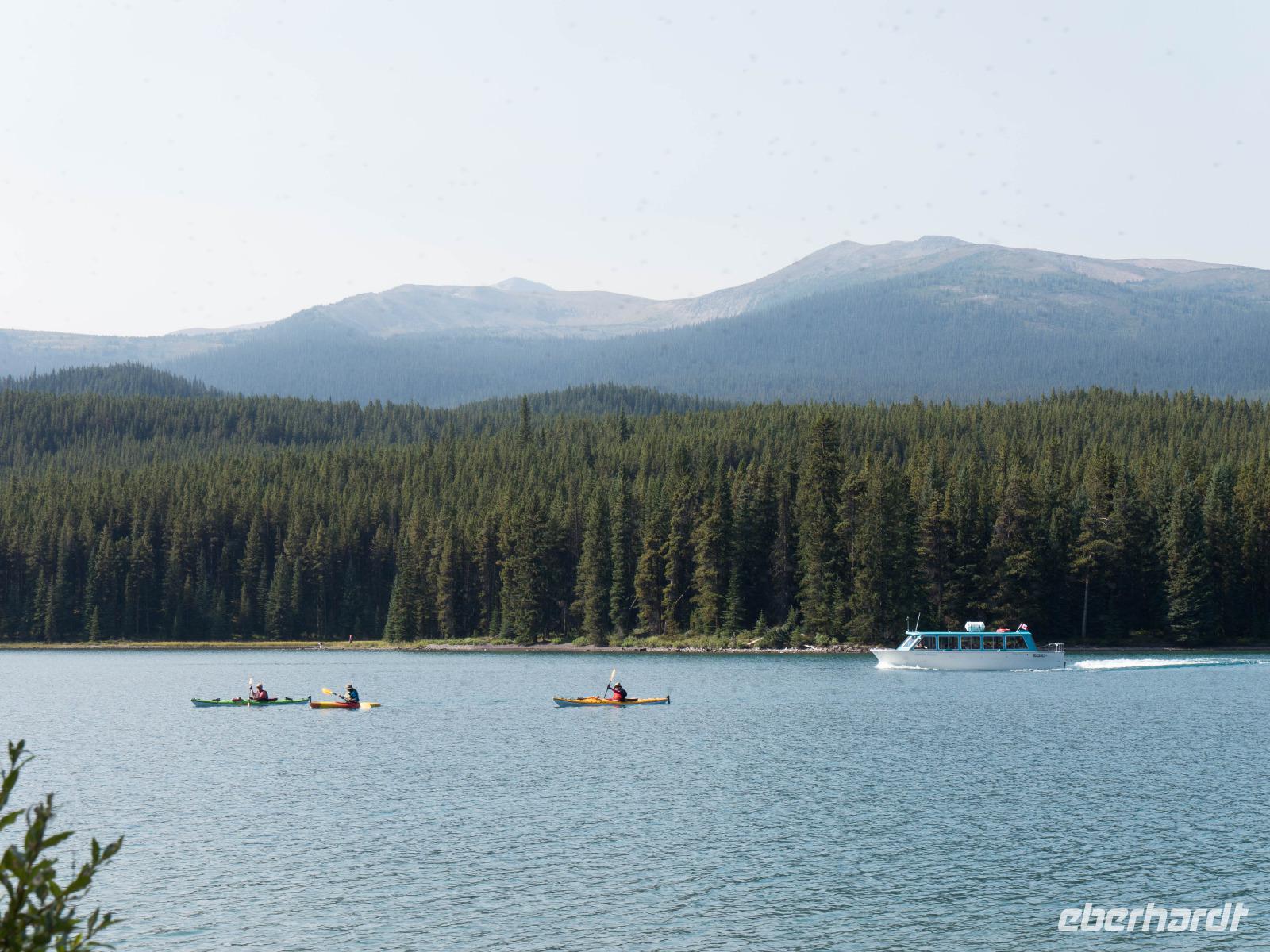 Am Morgen besuchen Hirsche unsere Lodge und schauen fast schon zum Fenster hinein! So geht der Tag gut los und auch das Frühstück lässt keine Wünsche offen. Über die Maligne Lake Road fahren wir ins Maligne-Tal. Namensgeber ist der "böse Fluss" aus dem Französischen. Am Maligne Canyon machen wir einen kurzen Spaziergang und fahren weiter zum Medicine Lake. Kanada hat einen sehr trockenen Sommer hinter sich, der leider viele Waldbrände begünstigte. Über größere Flächen sehen wir leider auch immer mal wieder dessen Folgen und an einigen Tagen liegt ein Schleier aus Rauch in der Luft, der die Sicht beeinträchtigt. Dennoch haben wir auch heute einen sonnigen und sommerlichen Tag mit Temperaturen bis 28 Grad - man mag es kaum glauben... im September in Kanada! Am Maligne Lake besteht nun die Möglichkeit für eine Bootsfahrt zur Mystery Island oder zum Kajak fahren oder für eine leichte Wanderung am See-Ufer. Auf der Rückfahrt nach Jasper legen wir noch einen Halt am Pyramidensee ein und haben dann etwas Freizeit in der Kleinstadt.