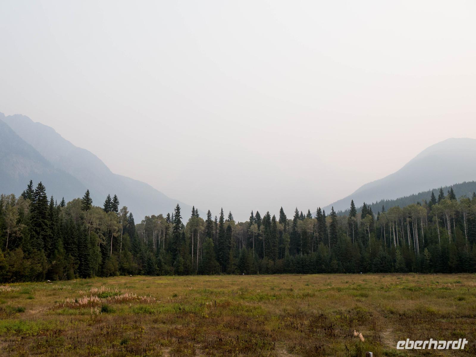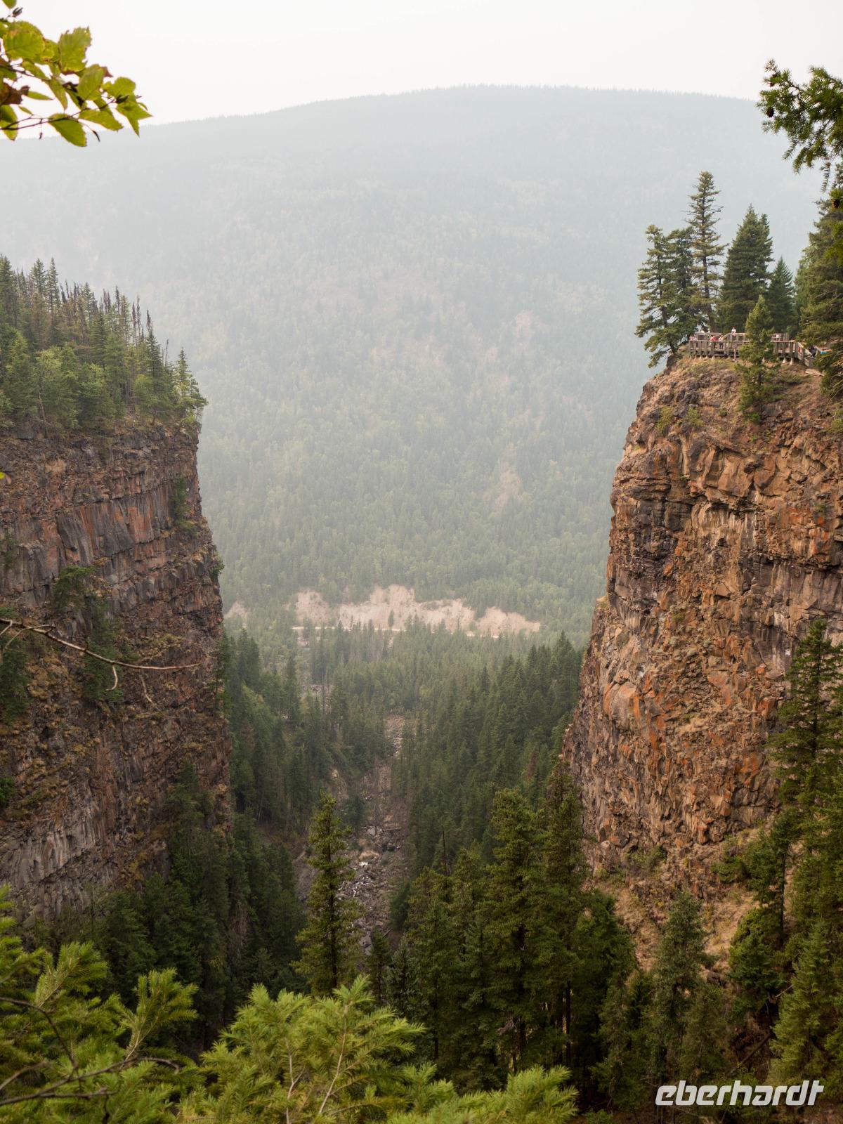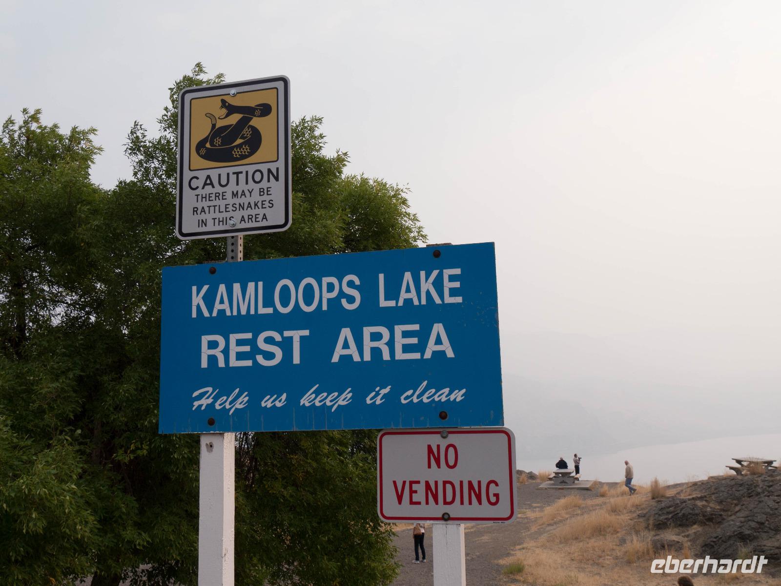 Heute müssen wir etwas "Strecke machen" und haben daher viel Zeit im Bus, die uns Al mit seiner spannenden Lebensgeschichte versüßt. Am Straßenrand sehen wir noch einmal Wapiti-Hirsche und wir überqueren bald die Grenze von Alberta nach British Columbia, wo uns eine Stunde Zeit geschenkt wird. Die Vegetation aus reinem Nadelwald wandelt sich in Mischwald, aber die Berge verstecken sich heute im Dunst, so dass wir auch vom höchsten Berg der kanadischen Rockies, dem Mount Robson, leider rein gar nichts sehen können. Wir verlassen nun die Rocky Mountains und kommen bald ins Columbia Gebirgsmassiv. An einem Picknickplatz lüften wir das Geheimnis unserer gestrigen Shoppingtour und es werden allerlei Leckereien aufgetischt. Guten Appetit und zum Wohl! Bei Clearwater machen wir einen Abstecher zum Spahats Viewpoint: eine tiefe, senkrechte Schlucht aus Vulkangestein mit einem 60 Meter hohen Wasserfall und am späten Nachmittag checken wir auf unserer Ranch bei Kamloops ein. Nach dem Abendessen wird draußen die Feuerstelle angeheizt und wir probieren uns in gemütlicher Runde in einer kanadischen Tradition: Marshmallows grillen und als Sandwich vernaschen („S'More").