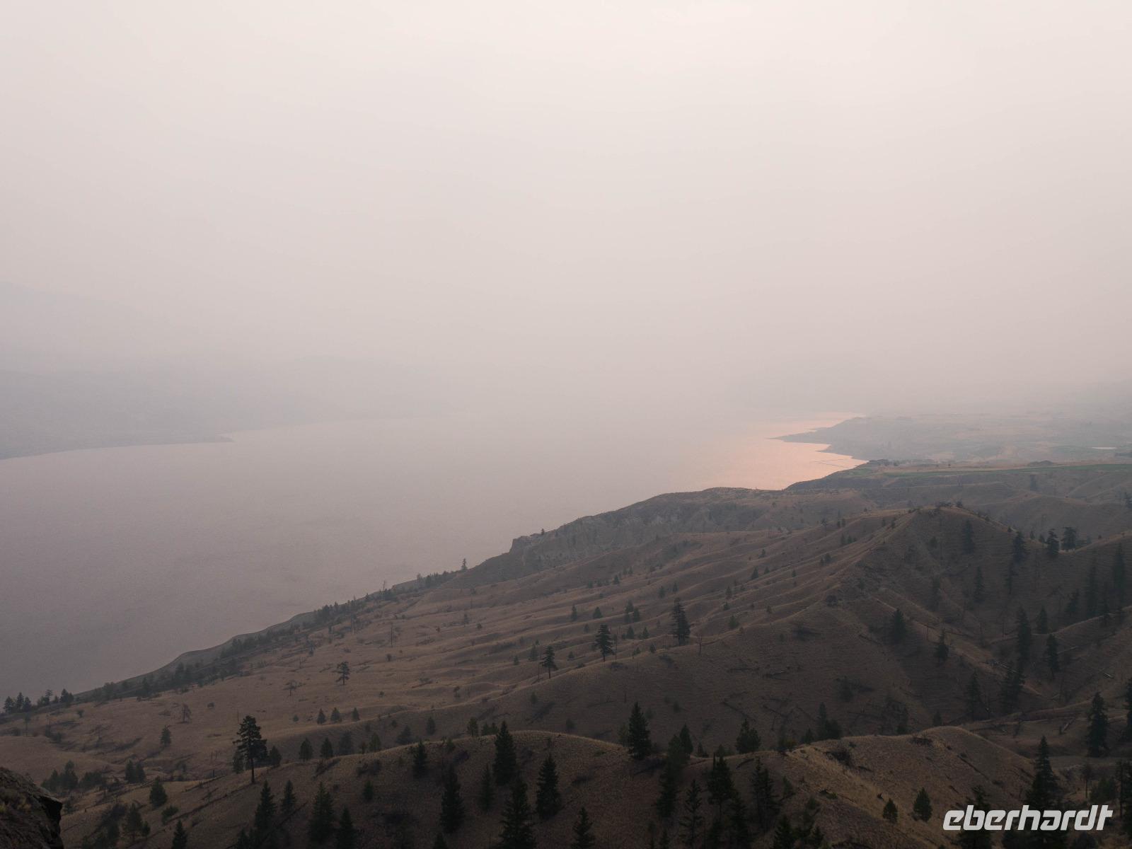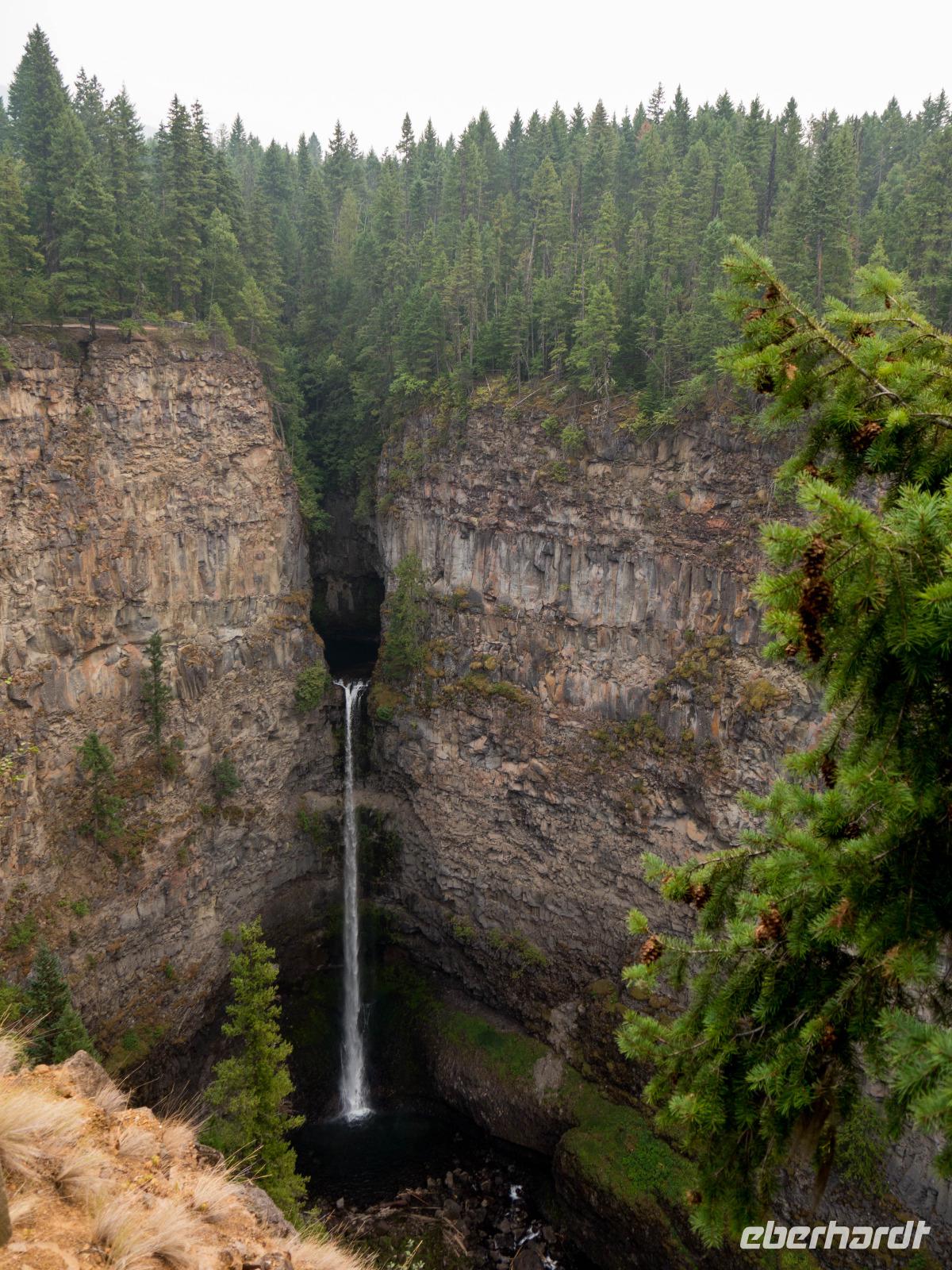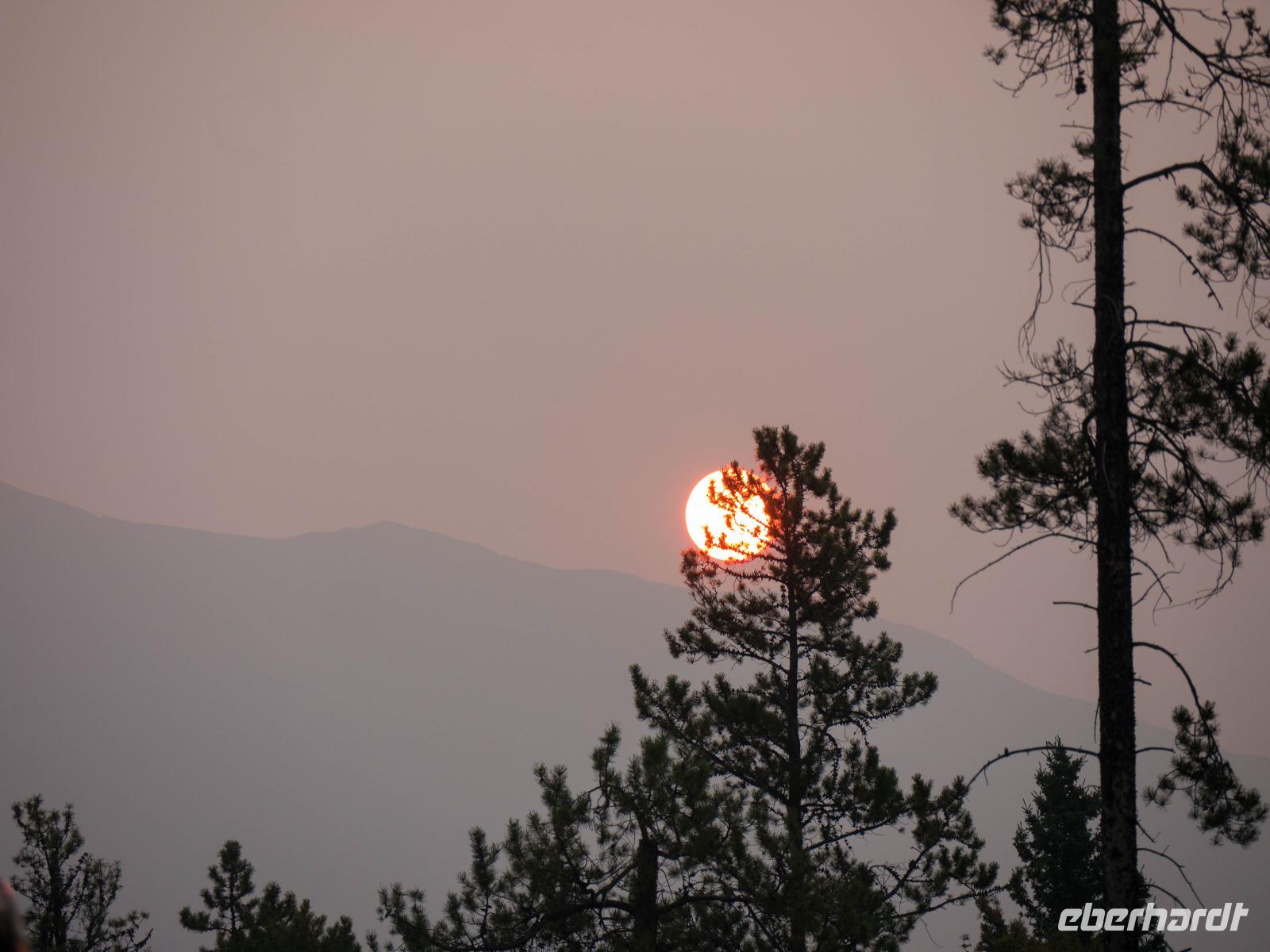 Heute müssen wir etwas "Strecke machen" und haben daher viel Zeit im Bus, die uns Al mit seiner spannenden Lebensgeschichte versüßt. Am Straßenrand sehen wir noch einmal Wapiti-Hirsche und wir überqueren bald die Grenze von Alberta nach British Columbia, wo uns eine Stunde Zeit geschenkt wird. Die Vegetation aus reinem Nadelwald wandelt sich in Mischwald, aber die Berge verstecken sich heute im Dunst, so dass wir auch vom höchsten Berg der kanadischen Rockies, dem Mount Robson, leider rein gar nichts sehen können. Wir verlassen nun die Rocky Mountains und kommen bald ins Columbia Gebirgsmassiv. An einem Picknickplatz lüften wir das Geheimnis unserer gestrigen Shoppingtour und es werden allerlei Leckereien aufgetischt. Guten Appetit und zum Wohl! Bei Clearwater machen wir einen Abstecher zum Spahats Viewpoint: eine tiefe, senkrechte Schlucht aus Vulkangestein mit einem 60 Meter hohen Wasserfall und am späten Nachmittag checken wir auf unserer Ranch bei Kamloops ein. Nach dem Abendessen wird draußen die Feuerstelle angeheizt und wir probieren uns in gemütlicher Runde in einer kanadischen Tradition: Marshmallows grillen und als Sandwich vernaschen („S'More").