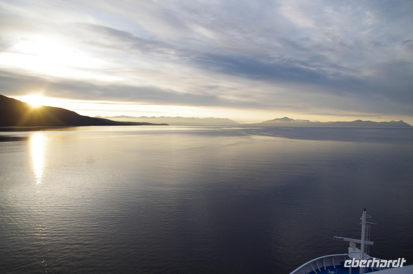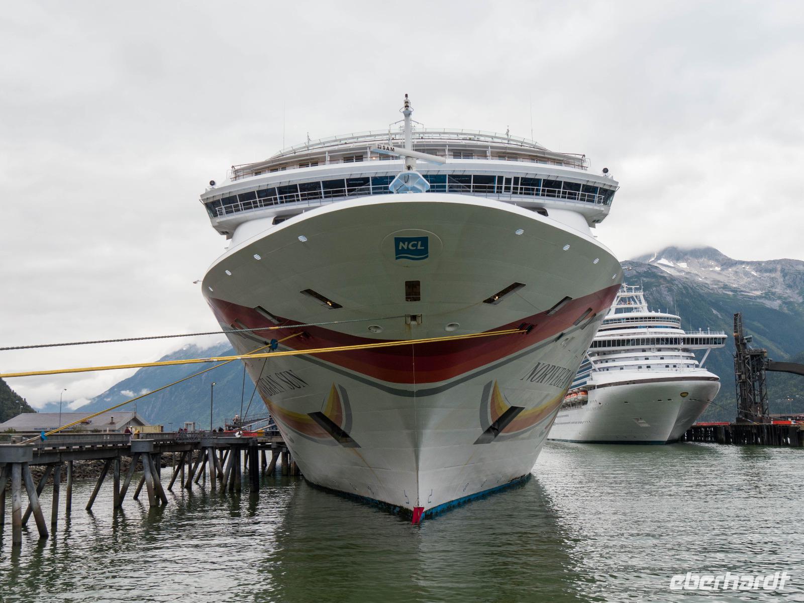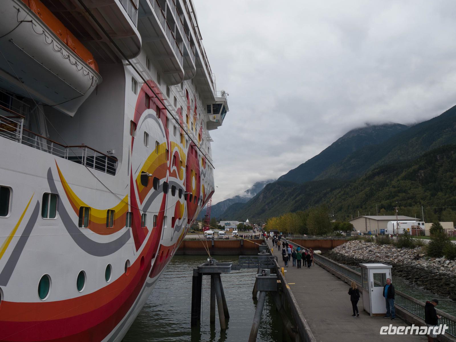 Da heute ein sonniger Tag ist, machen wir auf dem Weg zum Hafen noch einmal einen Abstecher zu den Sehenswürdigkeiten von Vancouver. Dann ist es Zeit, uns von unserem Reiseleiter Al zu verabschieden und zu unserem zweiten Reiseabschnitt aufzubrechen. Der Check In auf die Norwegian Sun geht relativ fix und so sind wir pünktlich zum Mittag an Bord unseres schwimmenden Hotels. Bald sind auch unsere Kabinen bezugsfertig und wir können uns für die einwöchige Alaska-Kreuzfahrt einrichten. Nach der obligatorischen Seenotrettungsübung heißt es um 16 Uhr "Leinen los!" und wir verlassen den Hafen von Vancouver. Mit einem erfrischenden Drink in der Hand und der Sonne im Gesicht lassen wir die Skyline Vancouvers hinter uns, durchqueren die Lions Gate Brücke und lassen die umliegenden Inseln und Buchten an uns vorbei ziehen. Schiff ahoi!