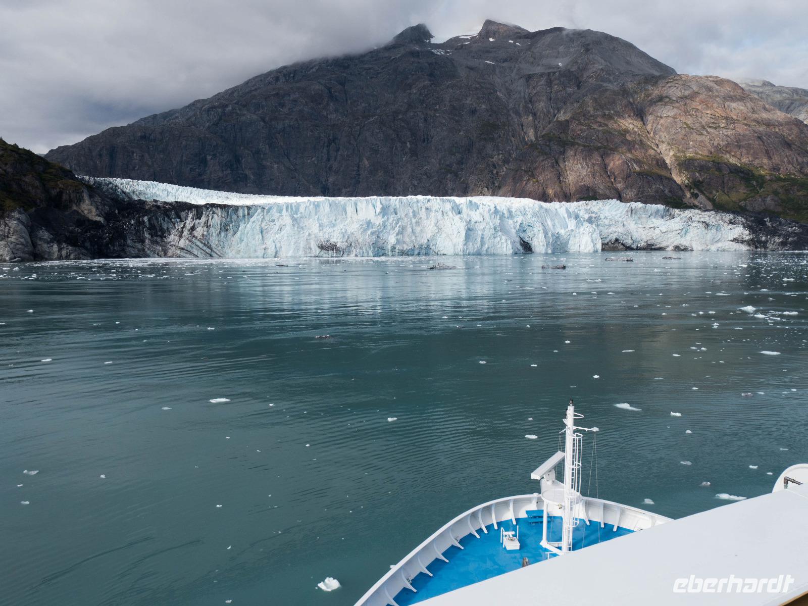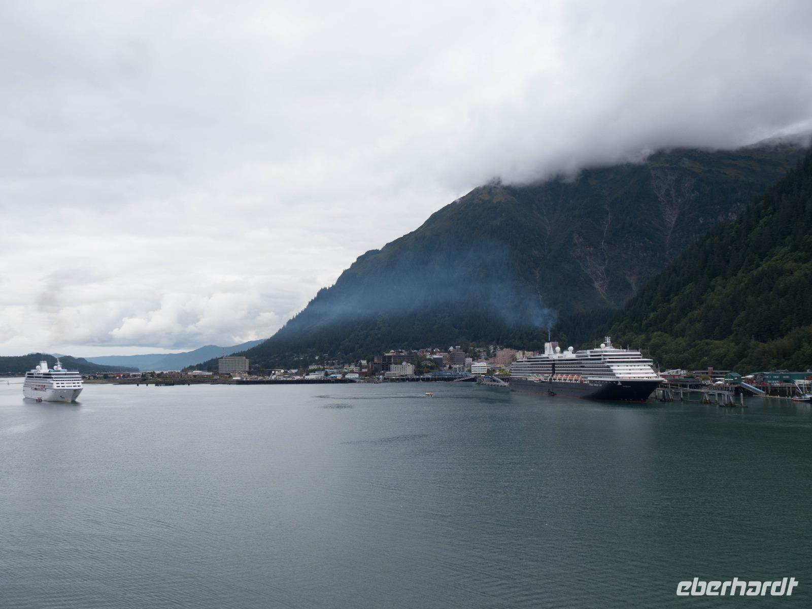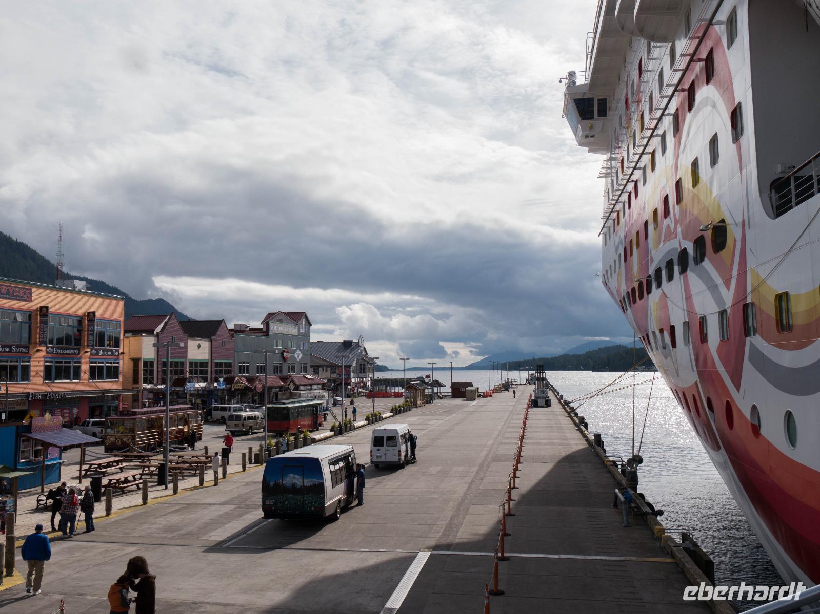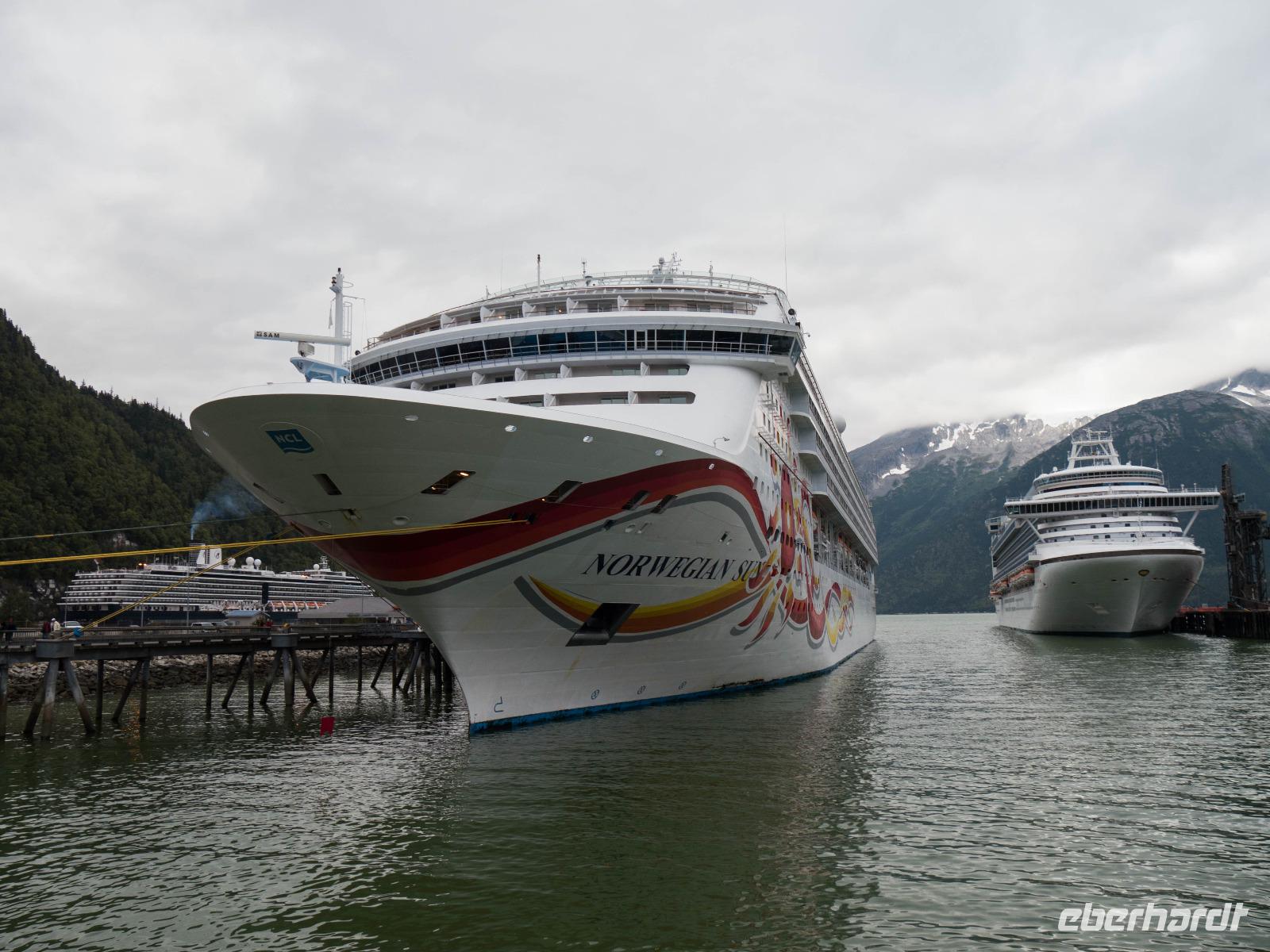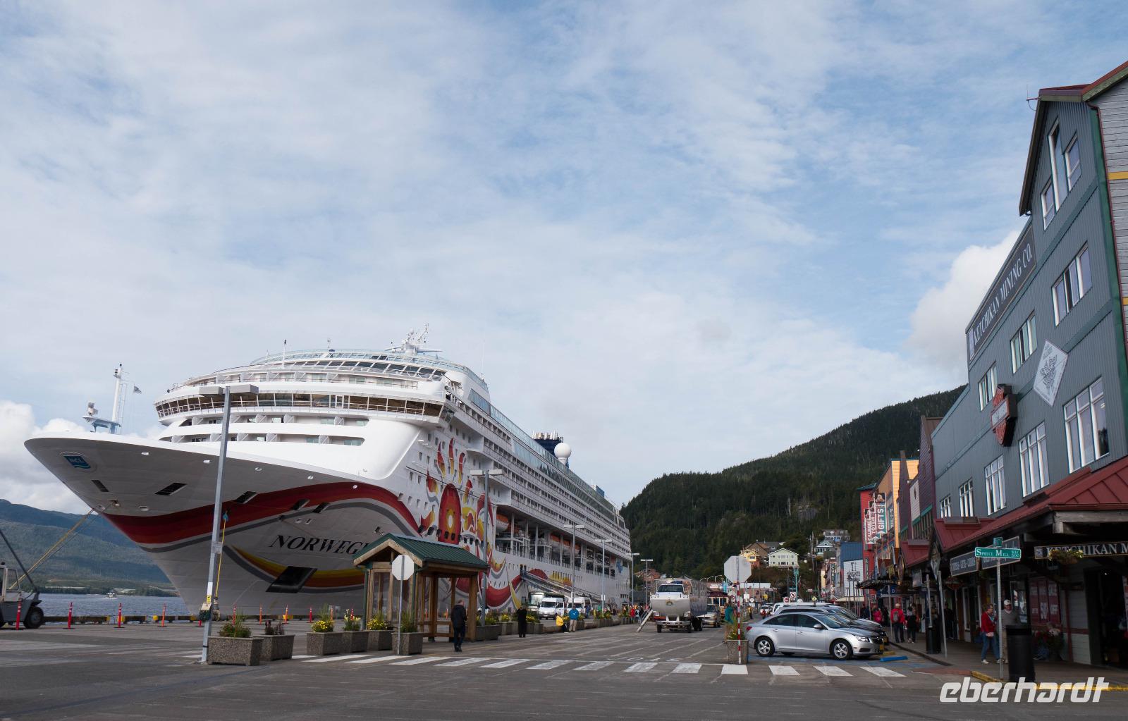 Willkommen in Alaska! Der größte Bundesstaat der USA (ca. 4x so groß wie Deutschland) ist gleichzeitig der am dünnsten besiedelte (für die Statistik-Freunde 0,4 EW pro km²) - hier gibt es mehr Tiere als Menschen, mehr Berge als Gebäude und mehr Gletscher als Verkehrsampeln. Die Hauptstadt Juneau ist nur über den Wasserweg oder aus der Luft zu erreichen, nicht über Straßen! Unser Weg führte uns mit der Norwegian Sun durch die wunderbare Inside Passage: eine 800 Kilometer lange, dicht bewaldete Fjord- und Insellandschaft. Und nun befinden wir uns - gemeinsam mit 3 weiteren Kreuzfahrtschiffen - im Herzen des Tongass National Forest, dem größten gemäßigten Regenwald Nordamerikas. Etwa 20 Kilometer von Juneau entfernt befindet sich der Mendenhall Gletscher - vor dieser herrlichen Kulisse ist endlich Gelegenheit für ein Eberhardt-Gruppenfoto. Seinen Ursprung hat der Mendenhall Gletscher in dem riesigen Juneau Icefield. Das Meeresklima in Verbindung mit dem Küstengebirge schafft ideale Bedingungen für eine Vergletscherung - der ewige Kampf zwischen Neuschnee und Schneeschmelze. Im Anschluss besuchen wir noch eine Lachs-Aufzuchtstation und erfahren viel Wissenswertes über die Besonderheiten und den Lebenszyklus des beliebten Speisefisches. Der Lachs wächst im Süßwasser heran und prägt sich in den ersten Lebensmonaten seine Umgebung bzw. die mineralische Zusammensetzung des Wassers ein, so dass er zur Laichwanderung exakt in seine "Kinderstube" zurück findet. Durch Osmoseregulation stellt sich der Lachs nach seiner Reise vom Fluss (Süßwasser) ins Meer auf Salzwasser um und wächst hier heran, bis er seinem Fortpflanzungstrieb folgend wieder "nach Hause" schwimmt und dabei viele Hindernisse bewältigt. Es ist nicht verwunderlich, dass Lachs während unserer Reise das ein oder andere Mal auf der Speisekarte steht und die Lachsaufzucht ist im Gegensatz zu vielen anderen Ländern in Alaska verboten. Zum Ende des Ausfluges fahren wir mit der Gondel auf den Hausberg Mount Roberts und haben von der 548 Meter hoch gelegenen Station einen schönen Panoramablick auf Juneau, die Berge, die Bucht und unser Schiff. Erinnerungen an die Pionierzeit Alaskas weckt der Red Dog Saloon mit seiner urigen Einrichtung und Live Musik. Nach einem abschließenden Stadtbummel kehren wir am Abend zurück an Bord.