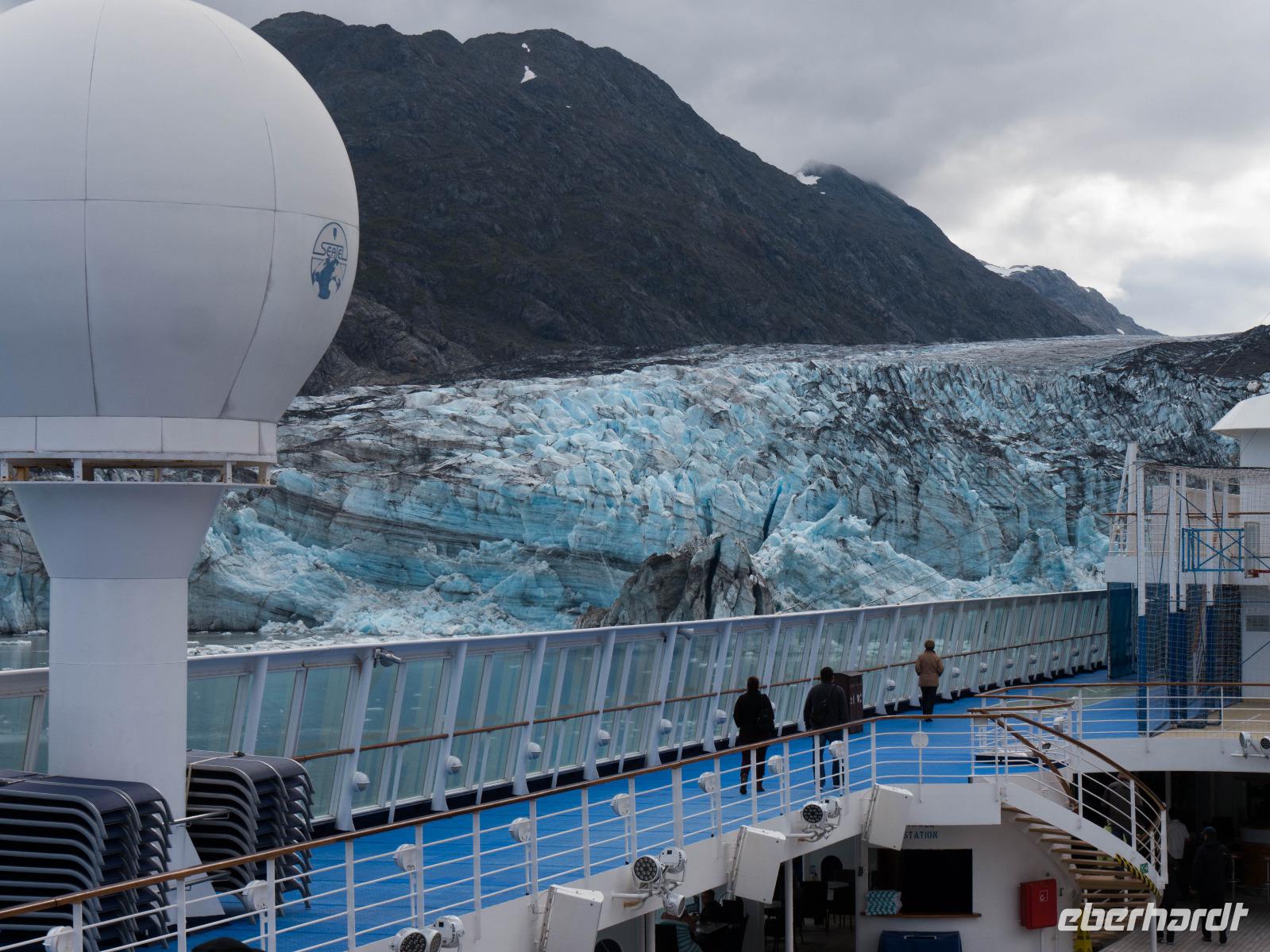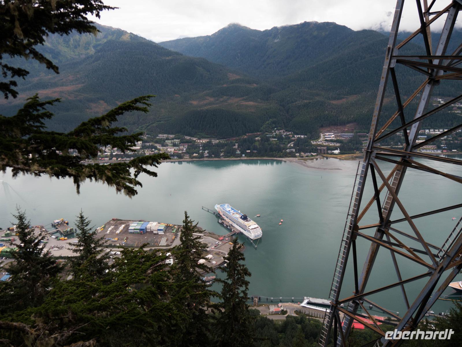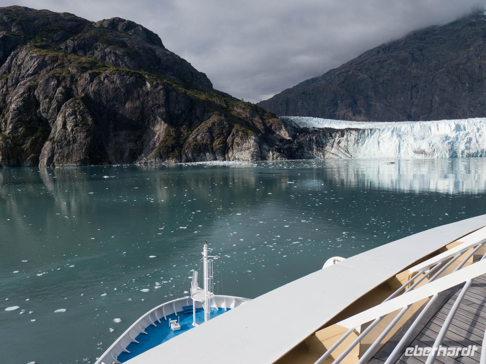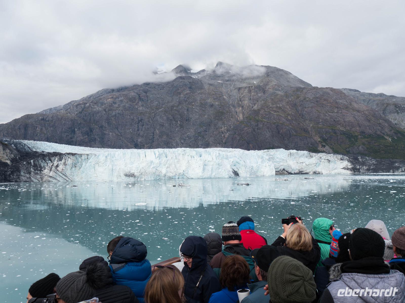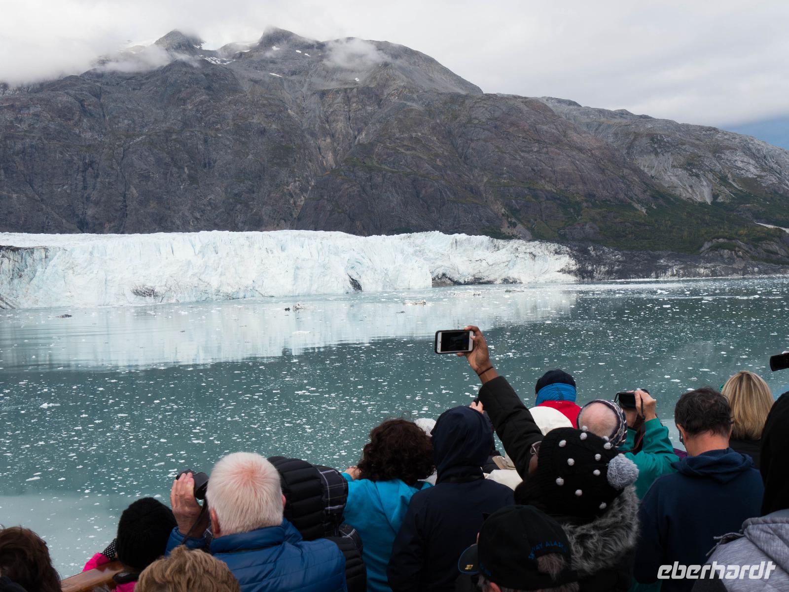 Willkommen in Alaska! Der größte Bundesstaat der USA (ca. 4x so groß wie Deutschland) ist gleichzeitig der am dünnsten besiedelte (für die Statistik-Freunde 0,4 EW pro km²) - hier gibt es mehr Tiere als Menschen, mehr Berge als Gebäude und mehr Gletscher als Verkehrsampeln. Die Hauptstadt Juneau ist nur über den Wasserweg oder aus der Luft zu erreichen, nicht über Straßen! Unser Weg führte uns mit der Norwegian Sun durch die wunderbare Inside Passage: eine 800 Kilometer lange, dicht bewaldete Fjord- und Insellandschaft. Und nun befinden wir uns - gemeinsam mit 3 weiteren Kreuzfahrtschiffen - im Herzen des Tongass National Forest, dem größten gemäßigten Regenwald Nordamerikas. Etwa 20 Kilometer von Juneau entfernt befindet sich der Mendenhall Gletscher - vor dieser herrlichen Kulisse ist endlich Gelegenheit für ein Eberhardt-Gruppenfoto. Seinen Ursprung hat der Mendenhall Gletscher in dem riesigen Juneau Icefield. Das Meeresklima in Verbindung mit dem Küstengebirge schafft ideale Bedingungen für eine Vergletscherung - der ewige Kampf zwischen Neuschnee und Schneeschmelze. Im Anschluss besuchen wir noch eine Lachs-Aufzuchtstation und erfahren viel Wissenswertes über die Besonderheiten und den Lebenszyklus des beliebten Speisefisches. Der Lachs wächst im Süßwasser heran und prägt sich in den ersten Lebensmonaten seine Umgebung bzw. die mineralische Zusammensetzung des Wassers ein, so dass er zur Laichwanderung exakt in seine "Kinderstube" zurück findet. Durch Osmoseregulation stellt sich der Lachs nach seiner Reise vom Fluss (Süßwasser) ins Meer auf Salzwasser um und wächst hier heran, bis er seinem Fortpflanzungstrieb folgend wieder "nach Hause" schwimmt und dabei viele Hindernisse bewältigt. Es ist nicht verwunderlich, dass Lachs während unserer Reise das ein oder andere Mal auf der Speisekarte steht und die Lachsaufzucht ist im Gegensatz zu vielen anderen Ländern in Alaska verboten. Zum Ende des Ausfluges fahren wir mit der Gondel auf den Hausberg Mount Roberts und haben von der 548 Meter hoch gelegenen Station einen schönen Panoramablick auf Juneau, die Berge, die Bucht und unser Schiff. Erinnerungen an die Pionierzeit Alaskas weckt der Red Dog Saloon mit seiner urigen Einrichtung und Live Musik. Nach einem abschließenden Stadtbummel kehren wir am Abend zurück an Bord.