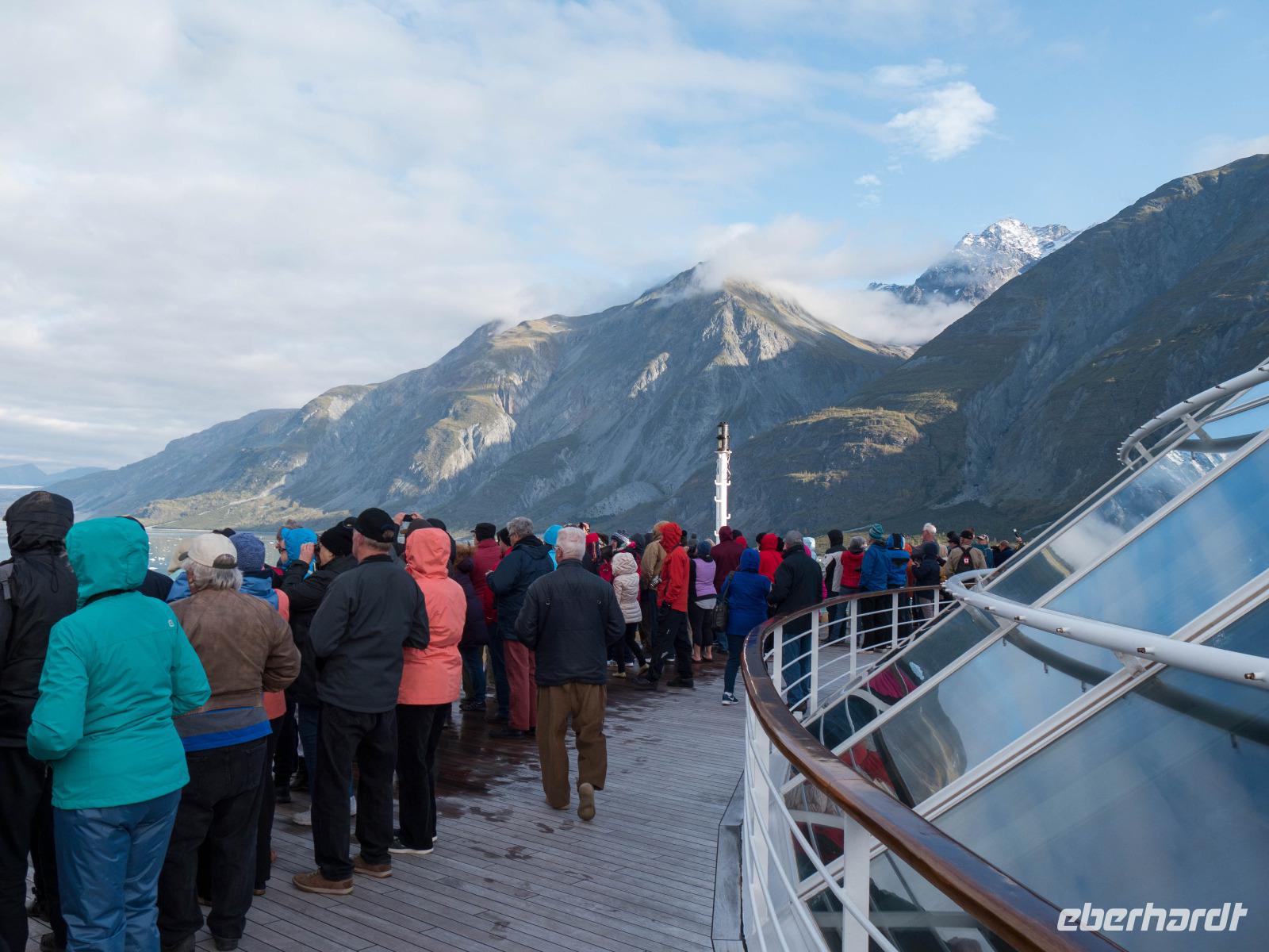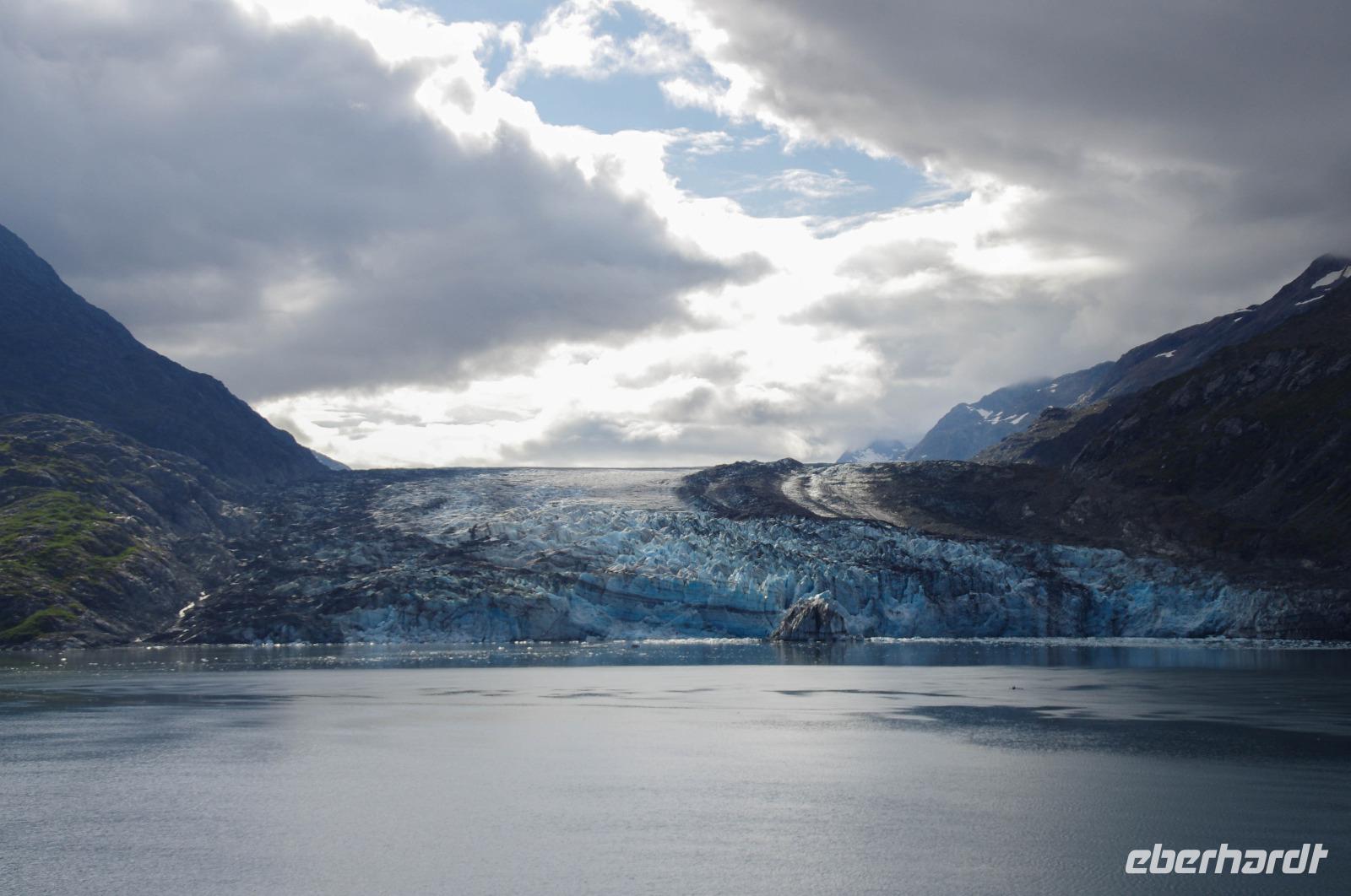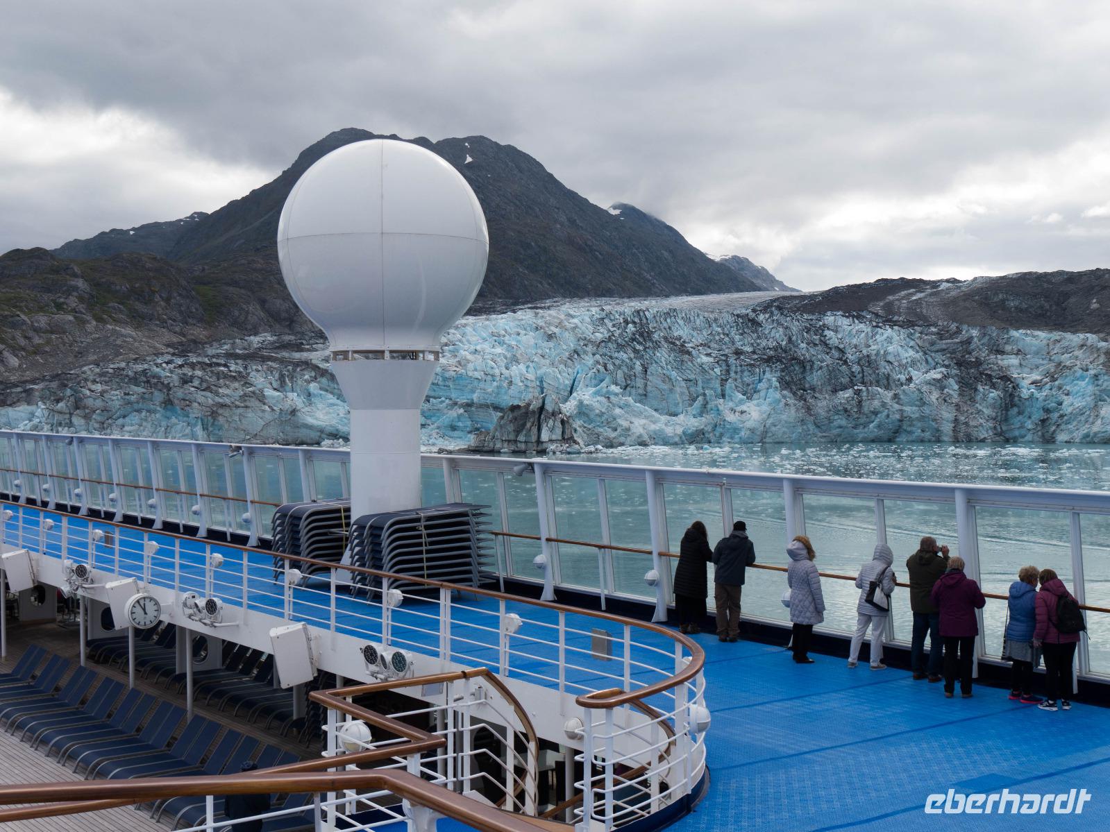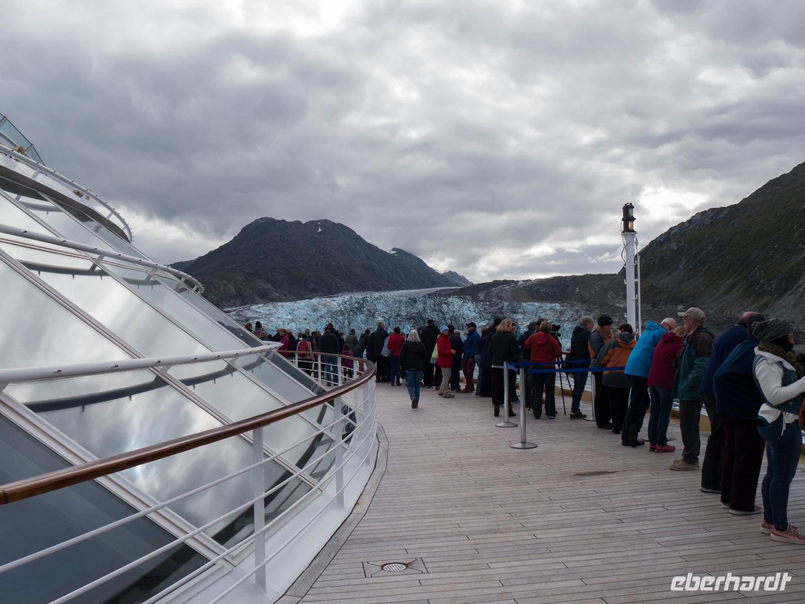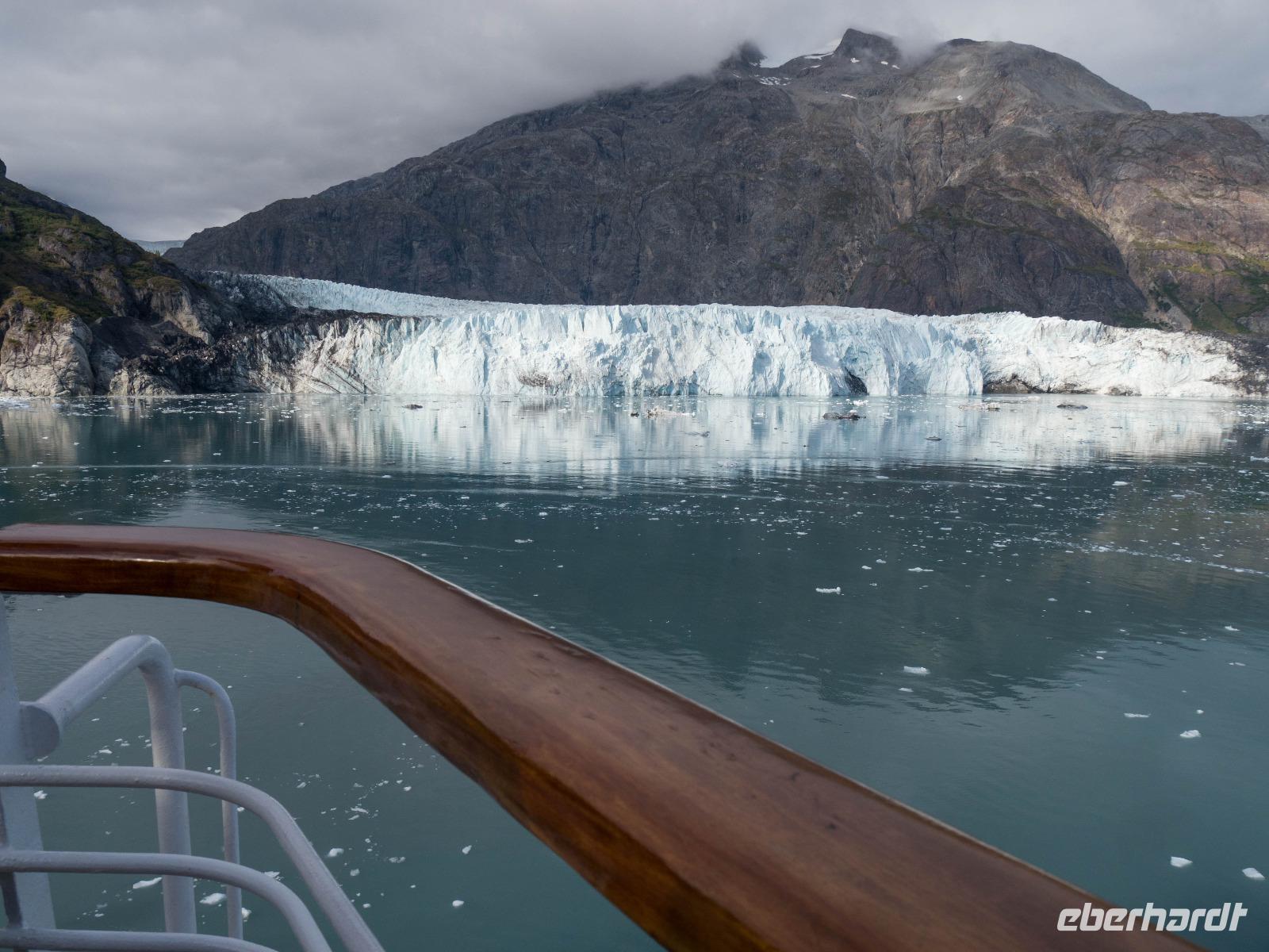 Willkommen in Alaska! Der größte Bundesstaat der USA (ca. 4x so groß wie Deutschland) ist gleichzeitig der am dünnsten besiedelte (für die Statistik-Freunde 0,4 EW pro km²) - hier gibt es mehr Tiere als Menschen, mehr Berge als Gebäude und mehr Gletscher als Verkehrsampeln. Die Hauptstadt Juneau ist nur über den Wasserweg oder aus der Luft zu erreichen, nicht über Straßen! Unser Weg führte uns mit der Norwegian Sun durch die wunderbare Inside Passage: eine 800 Kilometer lange, dicht bewaldete Fjord- und Insellandschaft. Und nun befinden wir uns - gemeinsam mit 3 weiteren Kreuzfahrtschiffen - im Herzen des Tongass National Forest, dem größten gemäßigten Regenwald Nordamerikas. Etwa 20 Kilometer von Juneau entfernt befindet sich der Mendenhall Gletscher - vor dieser herrlichen Kulisse ist endlich Gelegenheit für ein Eberhardt-Gruppenfoto. Seinen Ursprung hat der Mendenhall Gletscher in dem riesigen Juneau Icefield. Das Meeresklima in Verbindung mit dem Küstengebirge schafft ideale Bedingungen für eine Vergletscherung - der ewige Kampf zwischen Neuschnee und Schneeschmelze. Im Anschluss besuchen wir noch eine Lachs-Aufzuchtstation und erfahren viel Wissenswertes über die Besonderheiten und den Lebenszyklus des beliebten Speisefisches. Der Lachs wächst im Süßwasser heran und prägt sich in den ersten Lebensmonaten seine Umgebung bzw. die mineralische Zusammensetzung des Wassers ein, so dass er zur Laichwanderung exakt in seine "Kinderstube" zurück findet. Durch Osmoseregulation stellt sich der Lachs nach seiner Reise vom Fluss (Süßwasser) ins Meer auf Salzwasser um und wächst hier heran, bis er seinem Fortpflanzungstrieb folgend wieder "nach Hause" schwimmt und dabei viele Hindernisse bewältigt. Es ist nicht verwunderlich, dass Lachs während unserer Reise das ein oder andere Mal auf der Speisekarte steht und die Lachsaufzucht ist im Gegensatz zu vielen anderen Ländern in Alaska verboten. Zum Ende des Ausfluges fahren wir mit der Gondel auf den Hausberg Mount Roberts und haben von der 548 Meter hoch gelegenen Station einen schönen Panoramablick auf Juneau, die Berge, die Bucht und unser Schiff. Erinnerungen an die Pionierzeit Alaskas weckt der Red Dog Saloon mit seiner urigen Einrichtung und Live Musik. Nach einem abschließenden Stadtbummel kehren wir am Abend zurück an Bord.