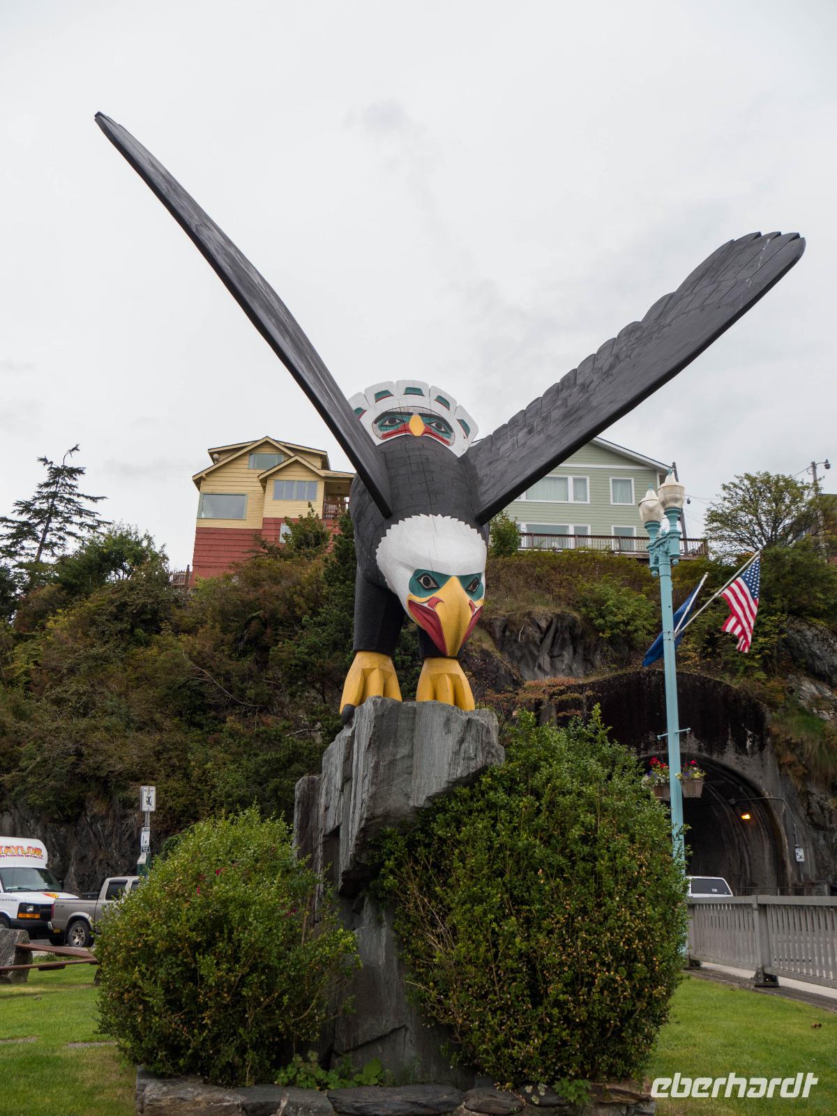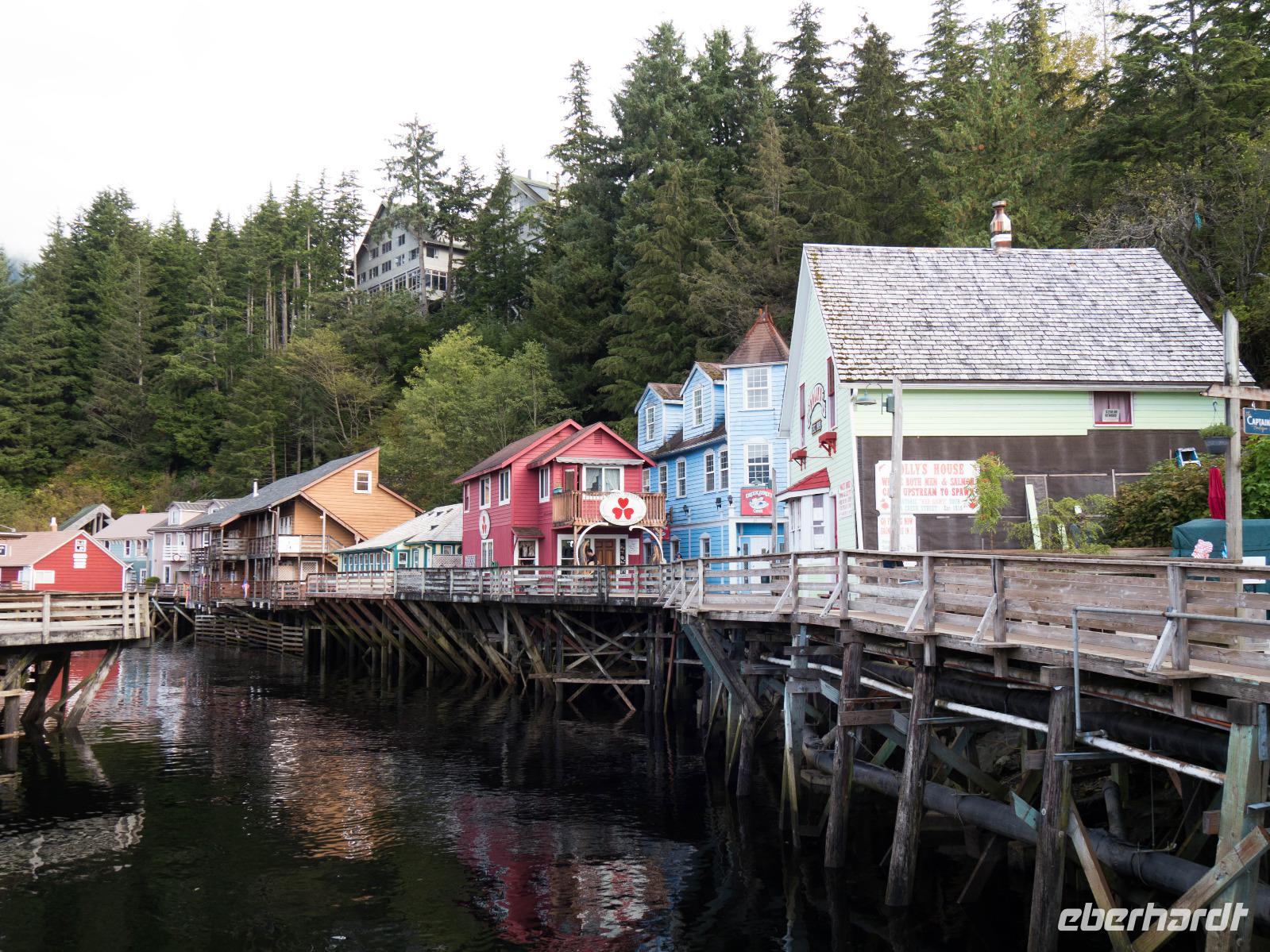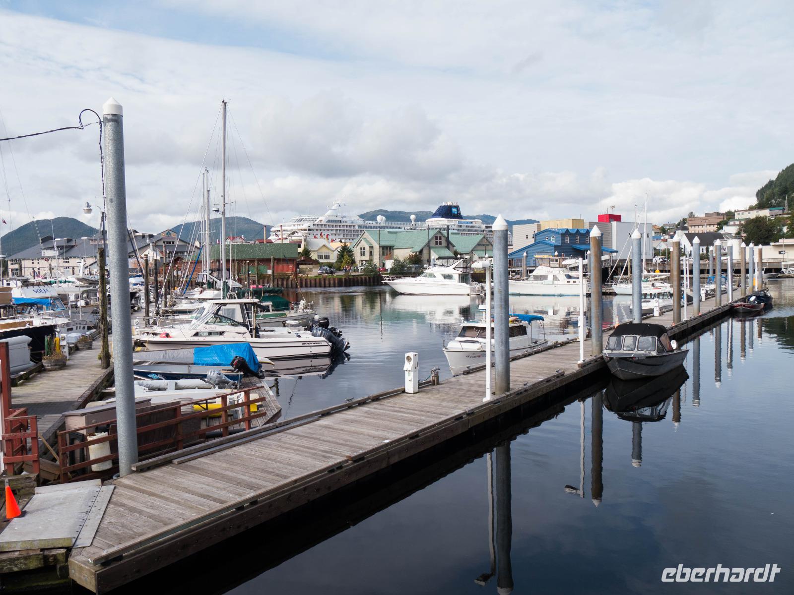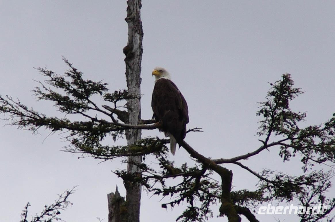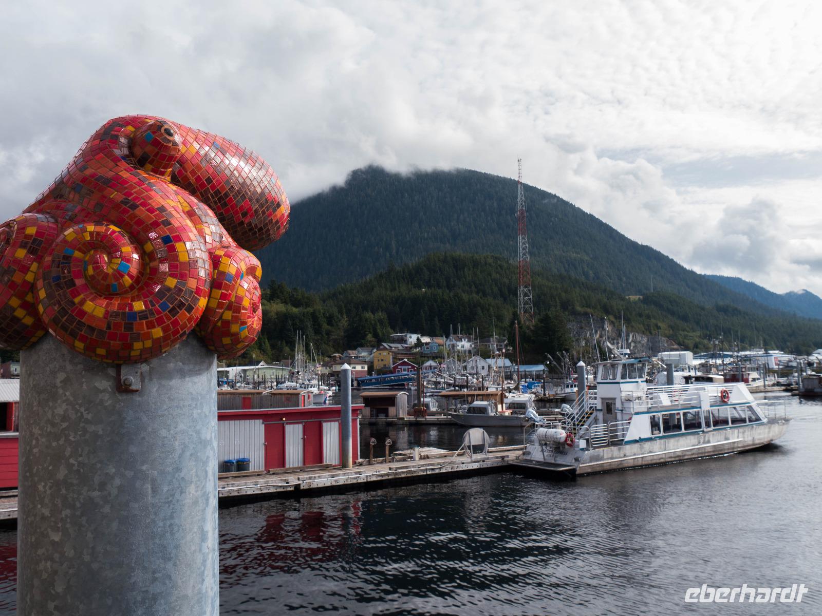 Auch in Ketchikan liegen wir wieder "mitten in der Stadt". Das ehemalige Rotlichtviertel an der Creek Street ist (auch) heute ein attraktives Stadtviertel - nur mit einem anderen Hintergrund ;-)! Die malerischen Holzhäuser stehen auf Pfählen im Wasser und beherbergen heute nette kleine Souvenirgeschäfte. Am Nachmittag begeben wir uns auf den Ausflug "Leuchtturm, Totems und Adler". Der Weißkopfseeadler (Bald Eagle) zählt zu den größten Greifvögeln Nordamerikas und ist der Wappenvogel der USA. Unser Kapitän Bob schippert mit uns die Küste entlang und zeigt uns mehrere Adlernester. Mit dem Fernglas können wir sogar den einen oder anderen Seeadler sowie Robben beobachten.