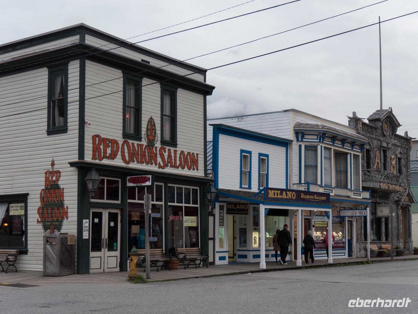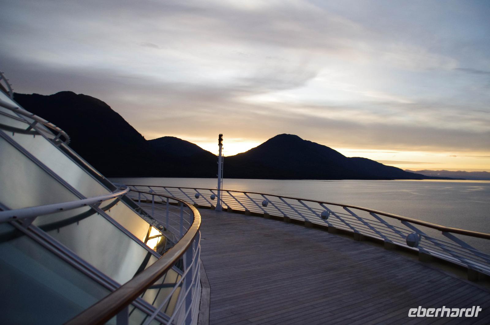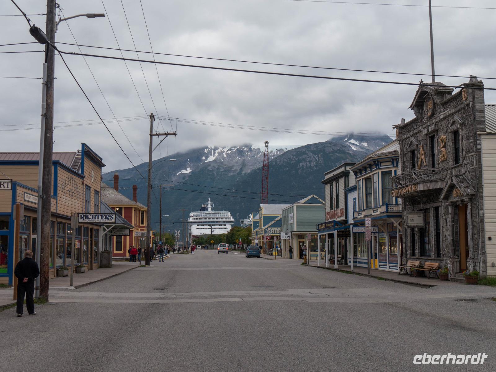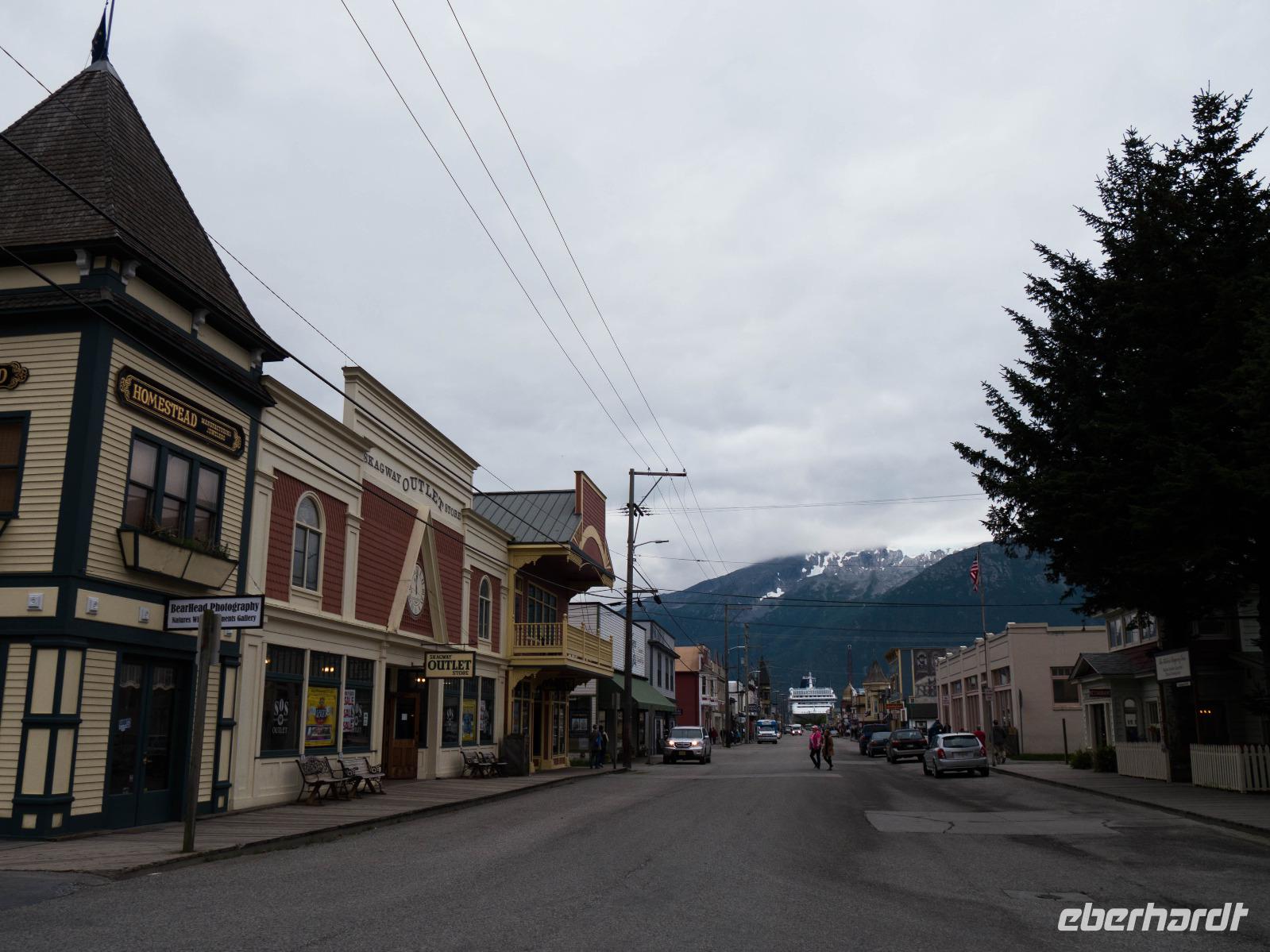 Skagway war einst das Tor zu den Goldfeldern des Klondike und ist heute ein kleines Städtchen mit äußerst charmanter Goldgräberatmosphäre und netten Souvenirgeschäften. Zur Zeit des Goldrausches 1896/97 explodierte die Einwohnerzahl in Skagway und die Stampeders machten Skagway zu einem gesetzlosen Ort. Unser Schiff legt quasi am Ende des Broadway an und so ist es nur ein Katzensprung "Downtown". DIE Sehenswürdigkeit von Skagway ist die "White Pass & Yukon Route Railway", eine historisch interessante und landschaftlich reizvolle Bahnstrecke entlang des alten Goldsuchertrails. In einer Rekordbauzeit von 2 Jahren wurde 1898 die 110 Meilen lange Bahntrasse von Skagway nach Whitehorse mit Hilfe von 35.000 Arbeitern fertig gestellt. Das gebirgige Terrain war ausgesprochen schwierig und die Witterung rauh, aber die Motivation war groß. Am Nachmittag wollen wir uns selbst von dem technischen Meisterwerk überzeugen und begeben uns auf eine Fahrt zum White Pass. Während der dreistündigen Bahnfahrt erhalten wir allerlei Informationen zur Strecke, zum Goldrausch und zum Leben der Stampeders und Glücksritter in damaliger Zeit. Auf dem 879 Meter hohen White Pass, der Grenze zwischen Alaska und Kanada, machen wir Kehrt und fahren durch die Bergwelt zurück nach Skagway. Jeden Abend gibt es an Bord verschiedene Unterhaltungsprogramme, ob Theater, Bars und Bands oder Casino. Heute lauschen wir nach dem Dinner einem wunderschönen Streichkonzert in der Observation Lounge.