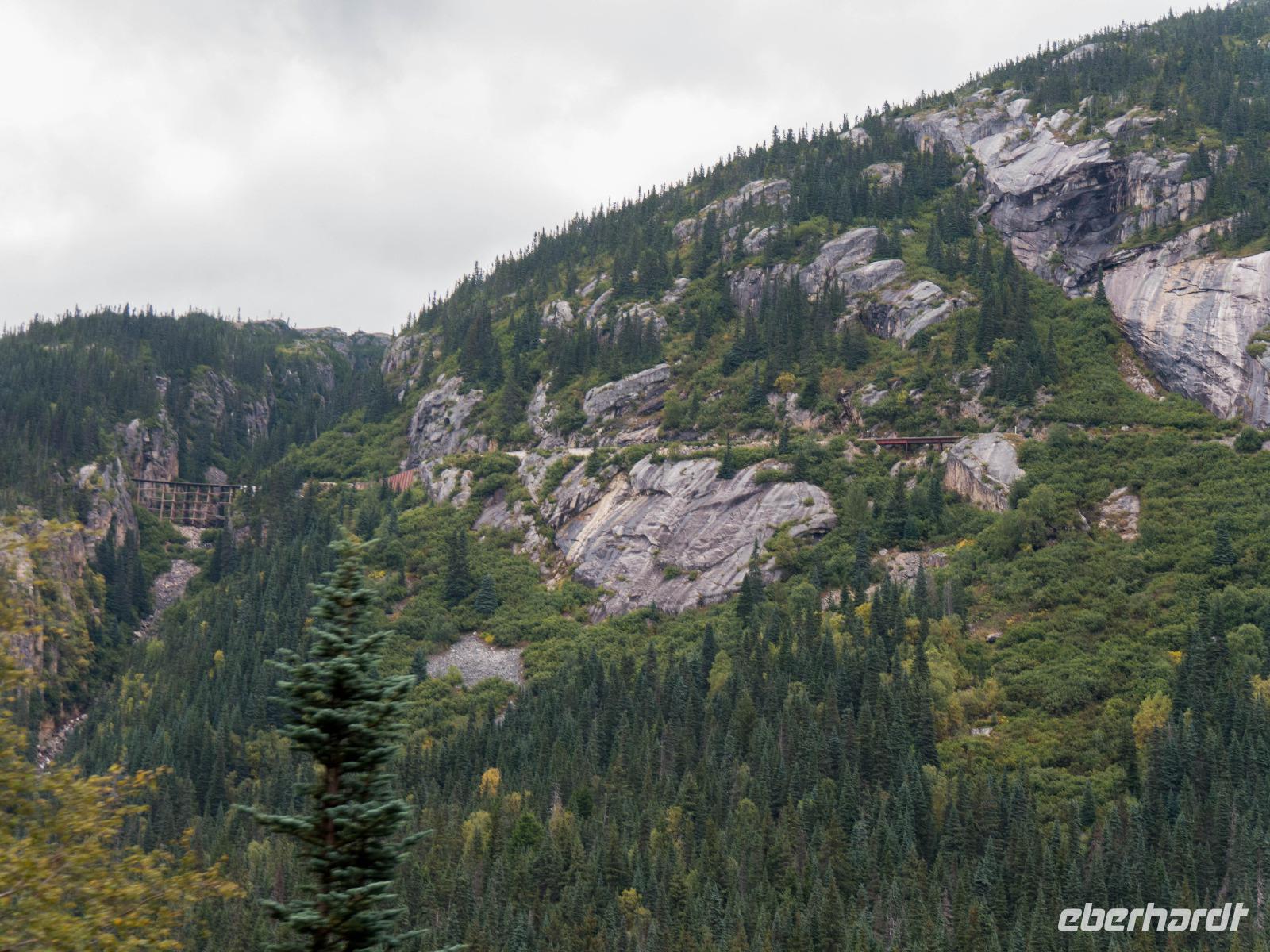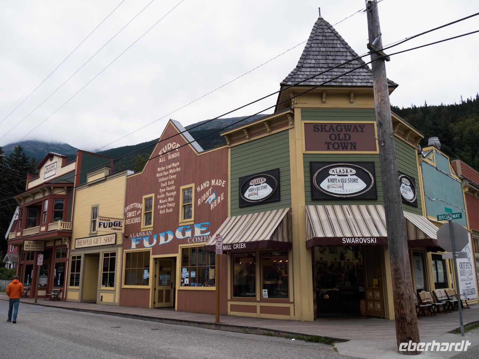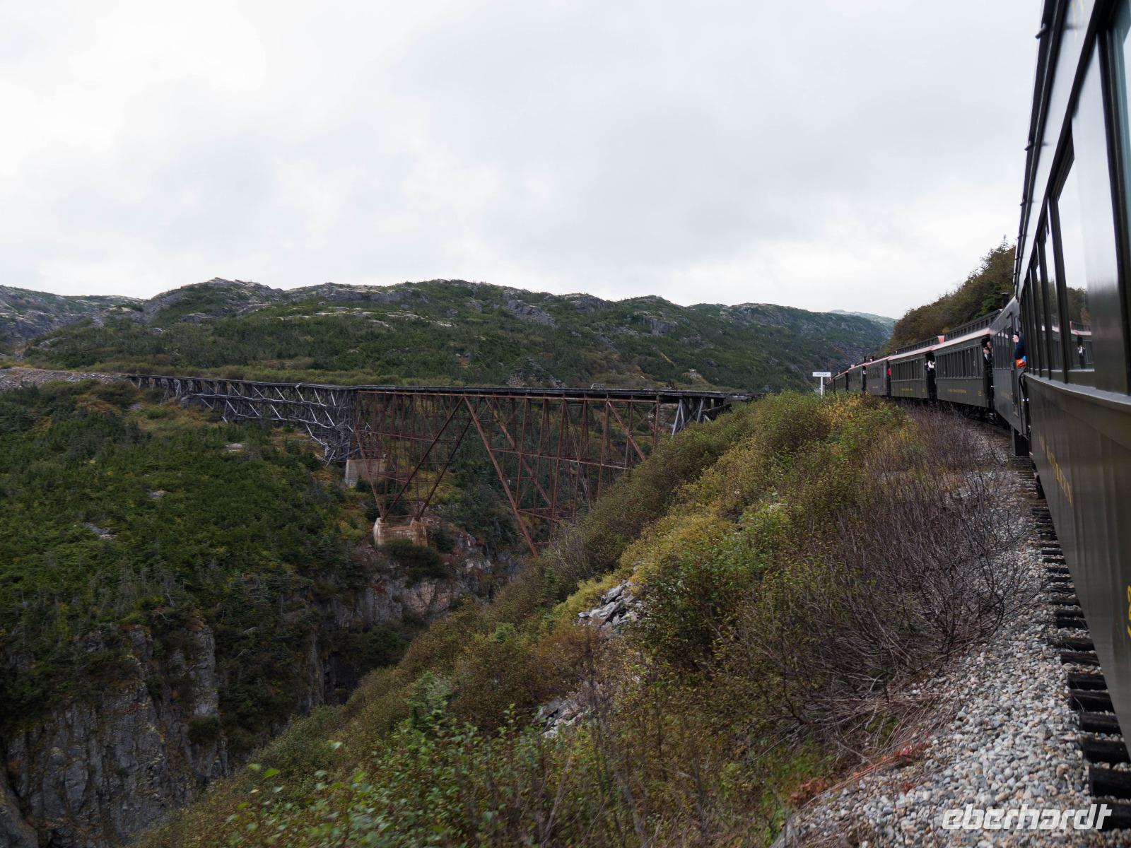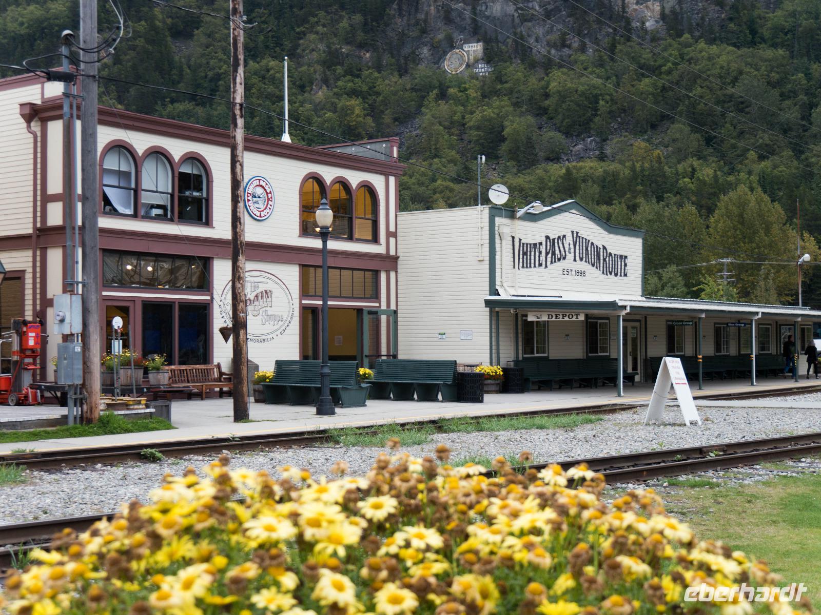 Skagway war einst das Tor zu den Goldfeldern des Klondike und ist heute ein kleines Städtchen mit äußerst charmanter Goldgräberatmosphäre und netten Souvenirgeschäften. Zur Zeit des Goldrausches 1896/97 explodierte die Einwohnerzahl in Skagway und die Stampeders machten Skagway zu einem gesetzlosen Ort. Unser Schiff legt quasi am Ende des Broadway an und so ist es nur ein Katzensprung "Downtown". DIE Sehenswürdigkeit von Skagway ist die "White Pass & Yukon Route Railway", eine historisch interessante und landschaftlich reizvolle Bahnstrecke entlang des alten Goldsuchertrails. In einer Rekordbauzeit von 2 Jahren wurde 1898 die 110 Meilen lange Bahntrasse von Skagway nach Whitehorse mit Hilfe von 35.000 Arbeitern fertig gestellt. Das gebirgige Terrain war ausgesprochen schwierig und die Witterung rauh, aber die Motivation war groß. Am Nachmittag wollen wir uns selbst von dem technischen Meisterwerk überzeugen und begeben uns auf eine Fahrt zum White Pass. Während der dreistündigen Bahnfahrt erhalten wir allerlei Informationen zur Strecke, zum Goldrausch und zum Leben der Stampeders und Glücksritter in damaliger Zeit. Auf dem 879 Meter hohen White Pass, der Grenze zwischen Alaska und Kanada, machen wir Kehrt und fahren durch die Bergwelt zurück nach Skagway. Jeden Abend gibt es an Bord verschiedene Unterhaltungsprogramme, ob Theater, Bars und Bands oder Casino. Heute lauschen wir nach dem Dinner einem wunderschönen Streichkonzert in der Observation Lounge.