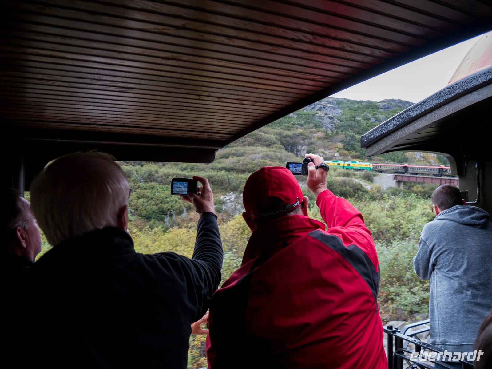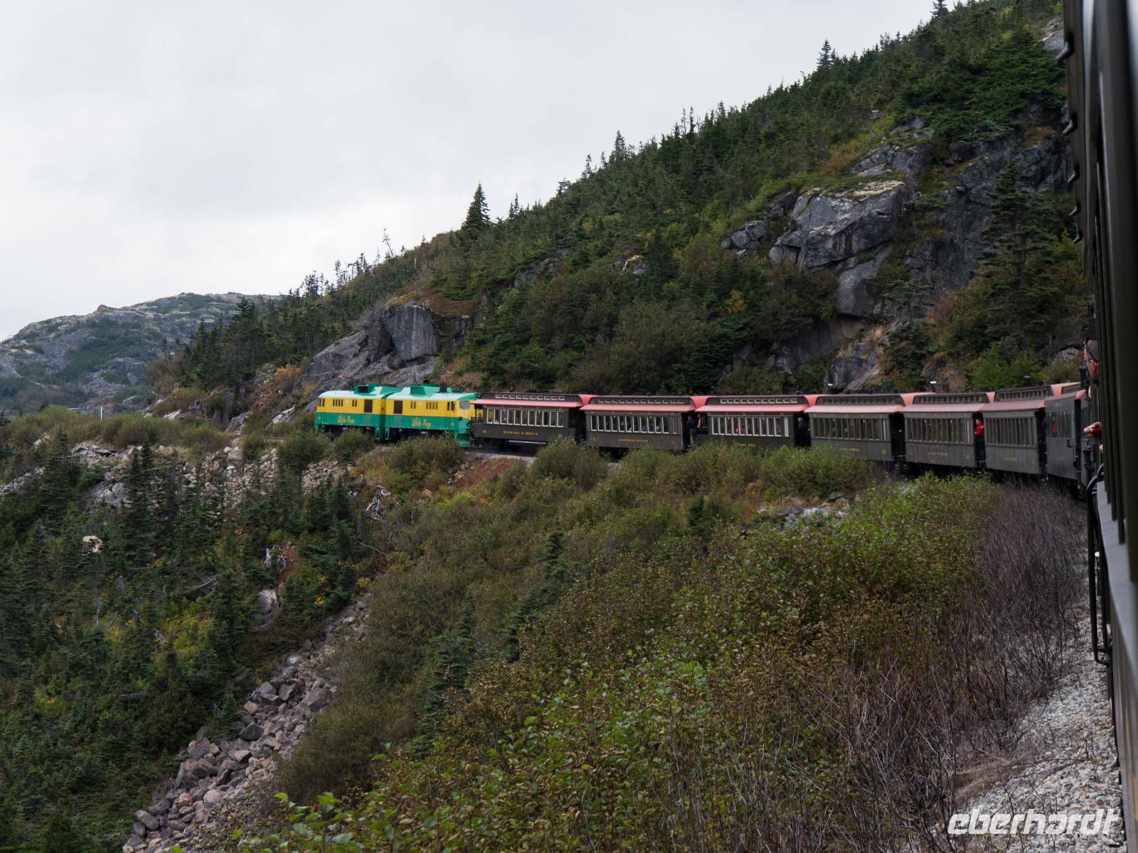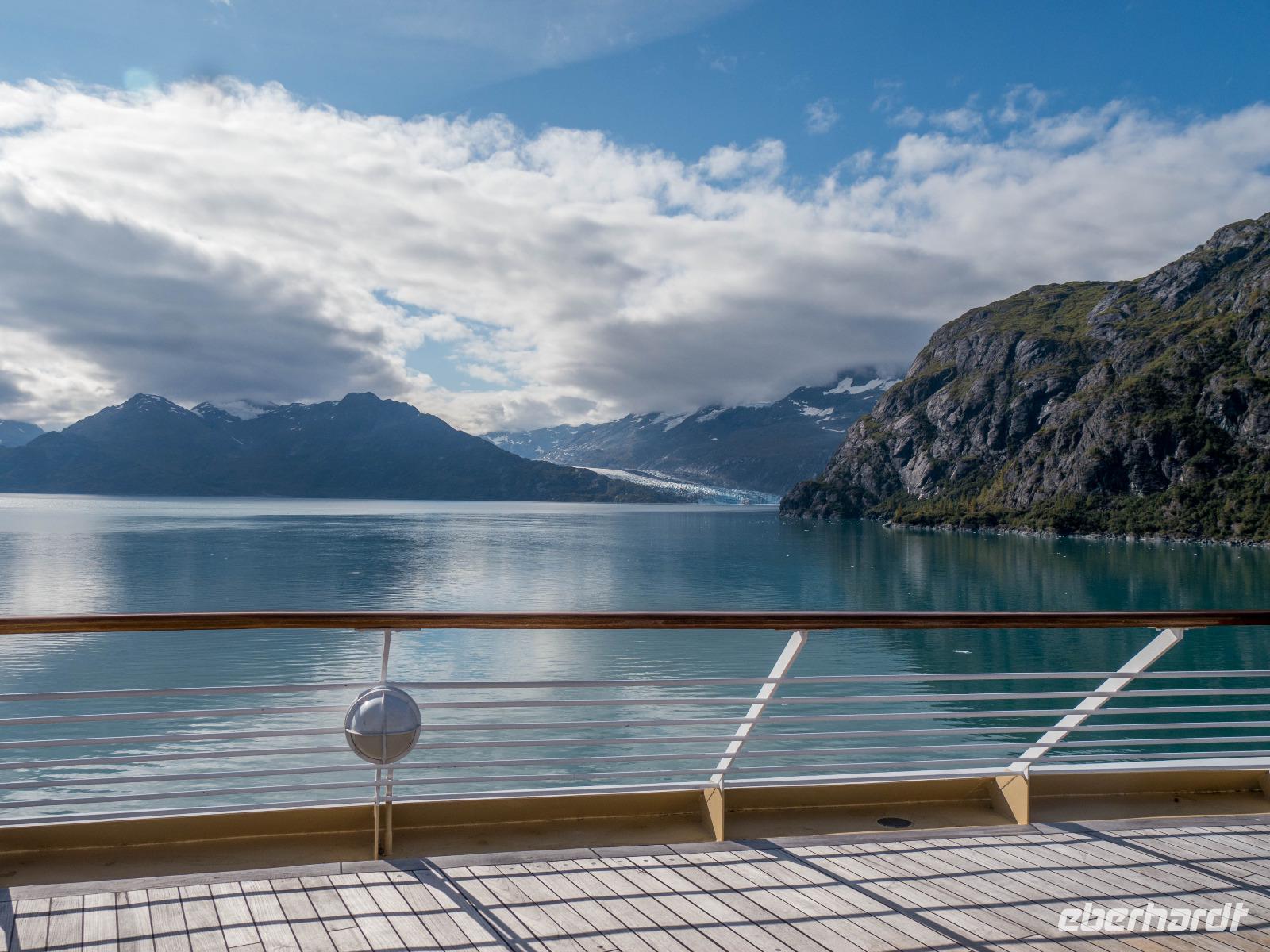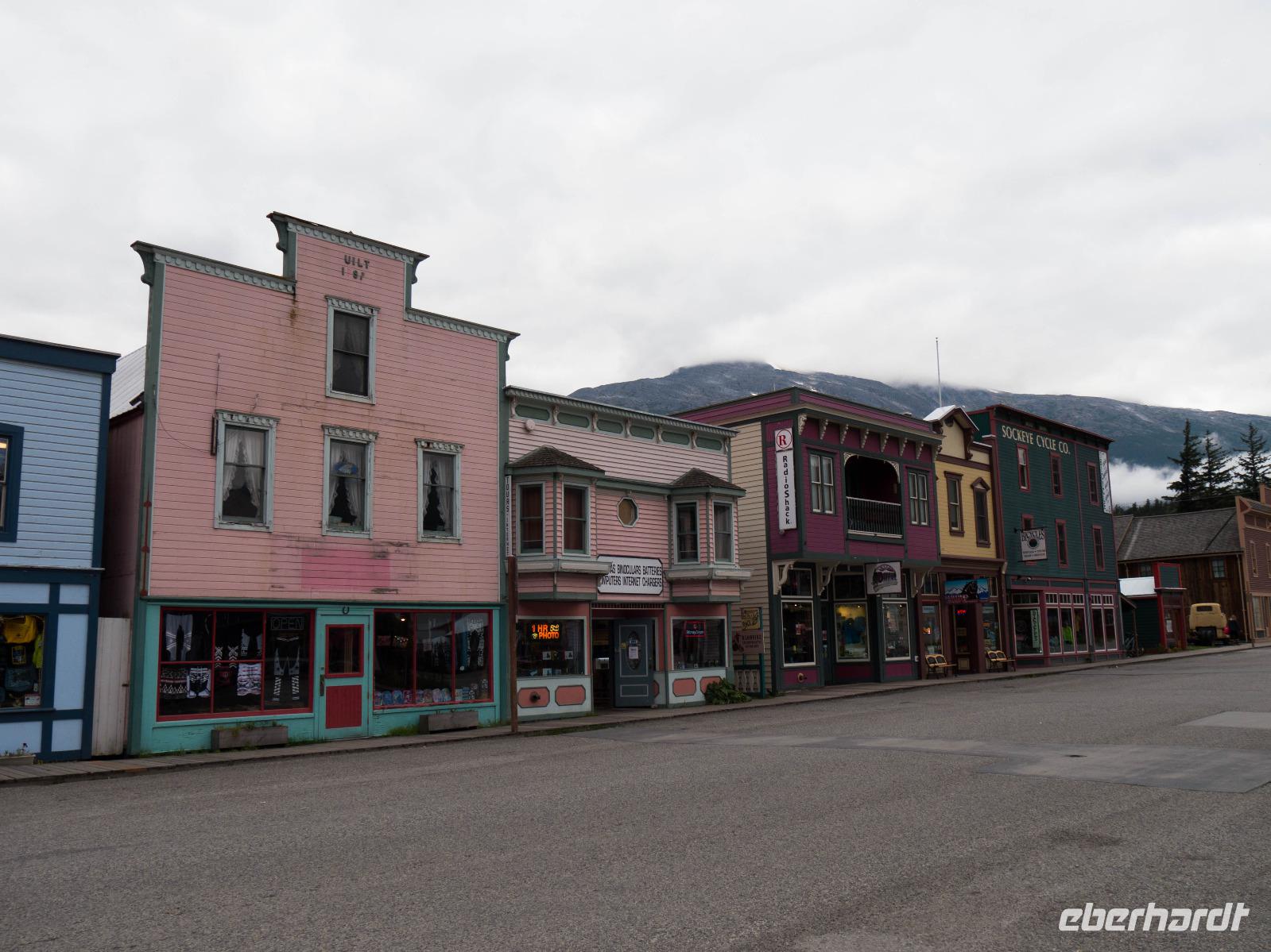 Skagway war einst das Tor zu den Goldfeldern des Klondike und ist heute ein kleines Städtchen mit äußerst charmanter Goldgräberatmosphäre und netten Souvenirgeschäften. Zur Zeit des Goldrausches 1896/97 explodierte die Einwohnerzahl in Skagway und die Stampeders machten Skagway zu einem gesetzlosen Ort. Unser Schiff legt quasi am Ende des Broadway an und so ist es nur ein Katzensprung "Downtown". DIE Sehenswürdigkeit von Skagway ist die "White Pass & Yukon Route Railway", eine historisch interessante und landschaftlich reizvolle Bahnstrecke entlang des alten Goldsuchertrails. In einer Rekordbauzeit von 2 Jahren wurde 1898 die 110 Meilen lange Bahntrasse von Skagway nach Whitehorse mit Hilfe von 35.000 Arbeitern fertig gestellt. Das gebirgige Terrain war ausgesprochen schwierig und die Witterung rauh, aber die Motivation war groß. Am Nachmittag wollen wir uns selbst von dem technischen Meisterwerk überzeugen und begeben uns auf eine Fahrt zum White Pass. Während der dreistündigen Bahnfahrt erhalten wir allerlei Informationen zur Strecke, zum Goldrausch und zum Leben der Stampeders und Glücksritter in damaliger Zeit. Auf dem 879 Meter hohen White Pass, der Grenze zwischen Alaska und Kanada, machen wir Kehrt und fahren durch die Bergwelt zurück nach Skagway. Jeden Abend gibt es an Bord verschiedene Unterhaltungsprogramme, ob Theater, Bars und Bands oder Casino. Heute lauschen wir nach dem Dinner einem wunderschönen Streichkonzert in der Observation Lounge.