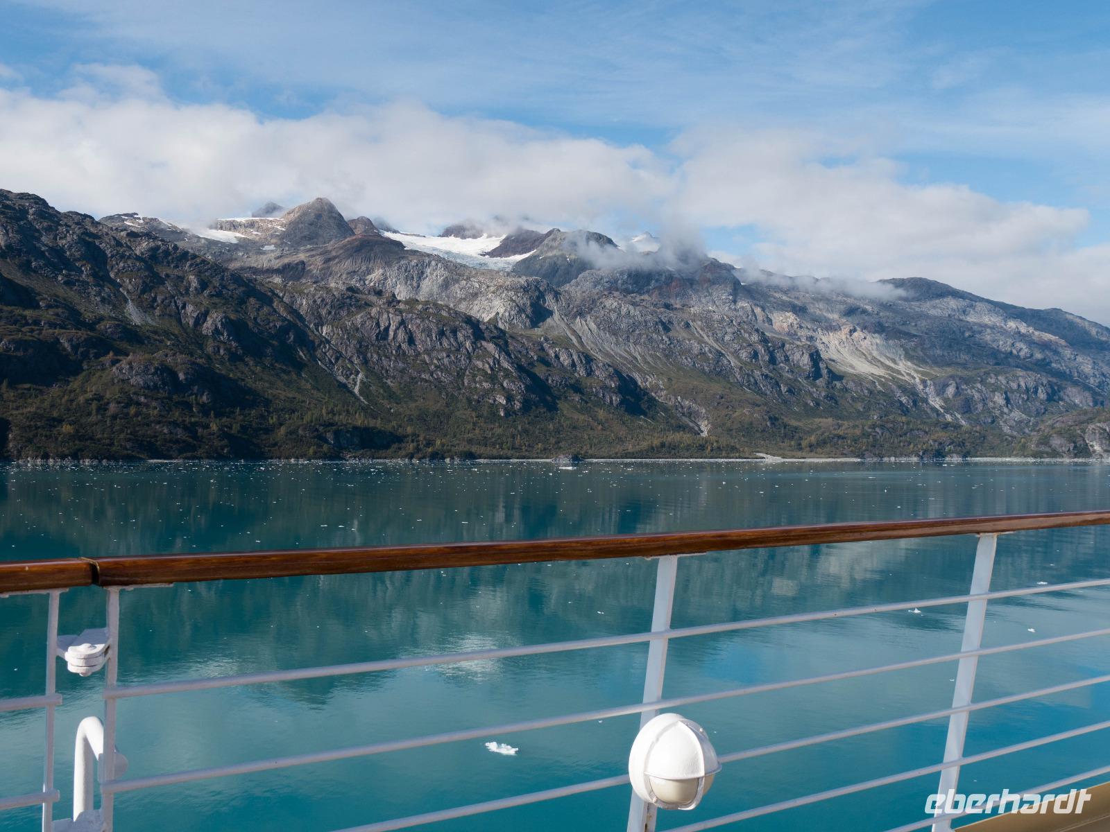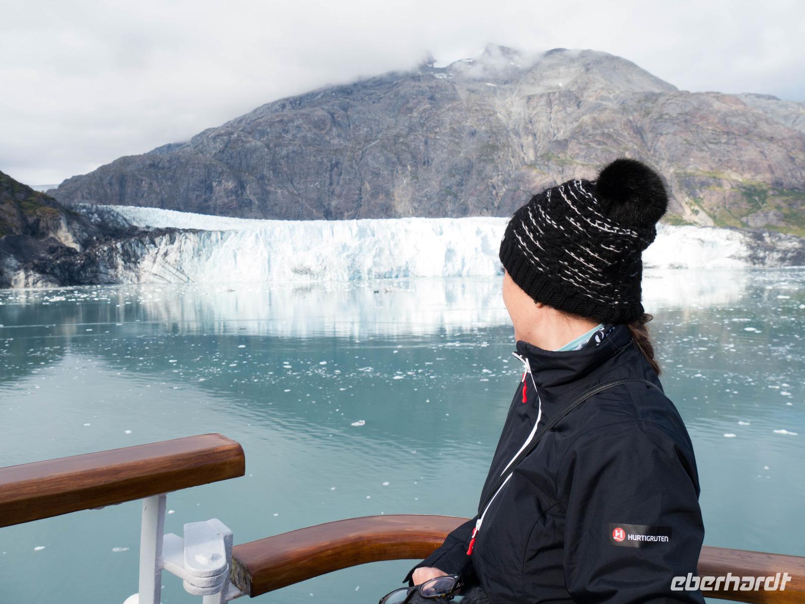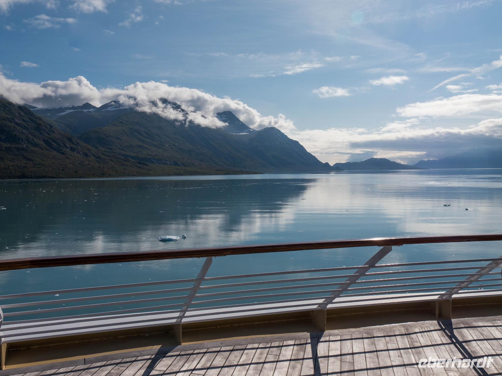 Heute ist wohl DAS Highlight der gesamten Alaska-Kreuzfahrt! Norwegian Sun fährt am Vormittag ein in die Glacier Bay und das bei bestem Wetter - was für ein Glück! Nun heißt es Lieblingsplatz sichern - ob gemütlich in der Observation Lounge vorn auf Deck 12 oder warm eingepackt draußen an Deck oder eingekuschelt auf dem eigenen Balkon (wohl dem, der einen hat). Im Nationalpark gehört mit seiner unberührten, einmaligen Natur zum UNESCO Weltnaturerbe. Die eisige Gletscherzunge des Margerie Gletscher reicht bis hinein ins Meerwasser, wo sich die Eisfront rund 75 Meter über das Wasser des Fjords erhebt. Der Grand Pacific Gletscher hat sich in den letzten Jahren deutlicher zurück gezogen und liegt davon weiter enfernt. Direkt vor der Gletscherzunge macht unser Schiff 3 Mal eine 360° Drehung, so dass jeder die Möglichkeit hat, tolle Fotos zu machen. Plötzlich kracht es und ein riesiges Eisstück bricht von der Kante ab, dessen Wellen selbst unser großes Schiff zum Wiegen bringen! Lautlos gleiten wir durch den Fjord zum nächsten Gletscher: der Lamplugh Gletscher schillert in verschiedenen Blautönen und bietet ebenfalls fantastische Fotomotive. Wer später noch Ausschau auf's Meer hält, hat Glück und kann sogar Wale beobachten!