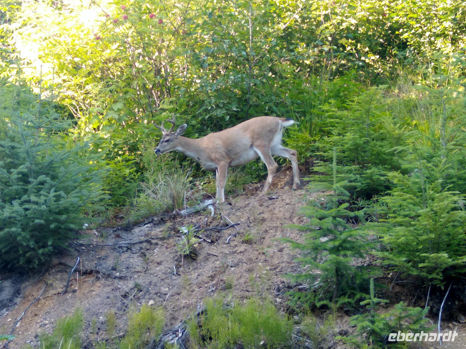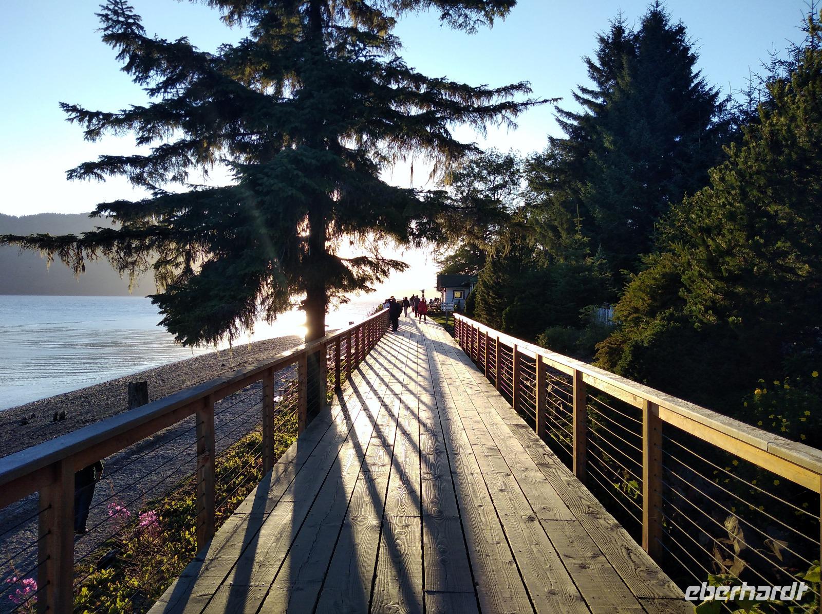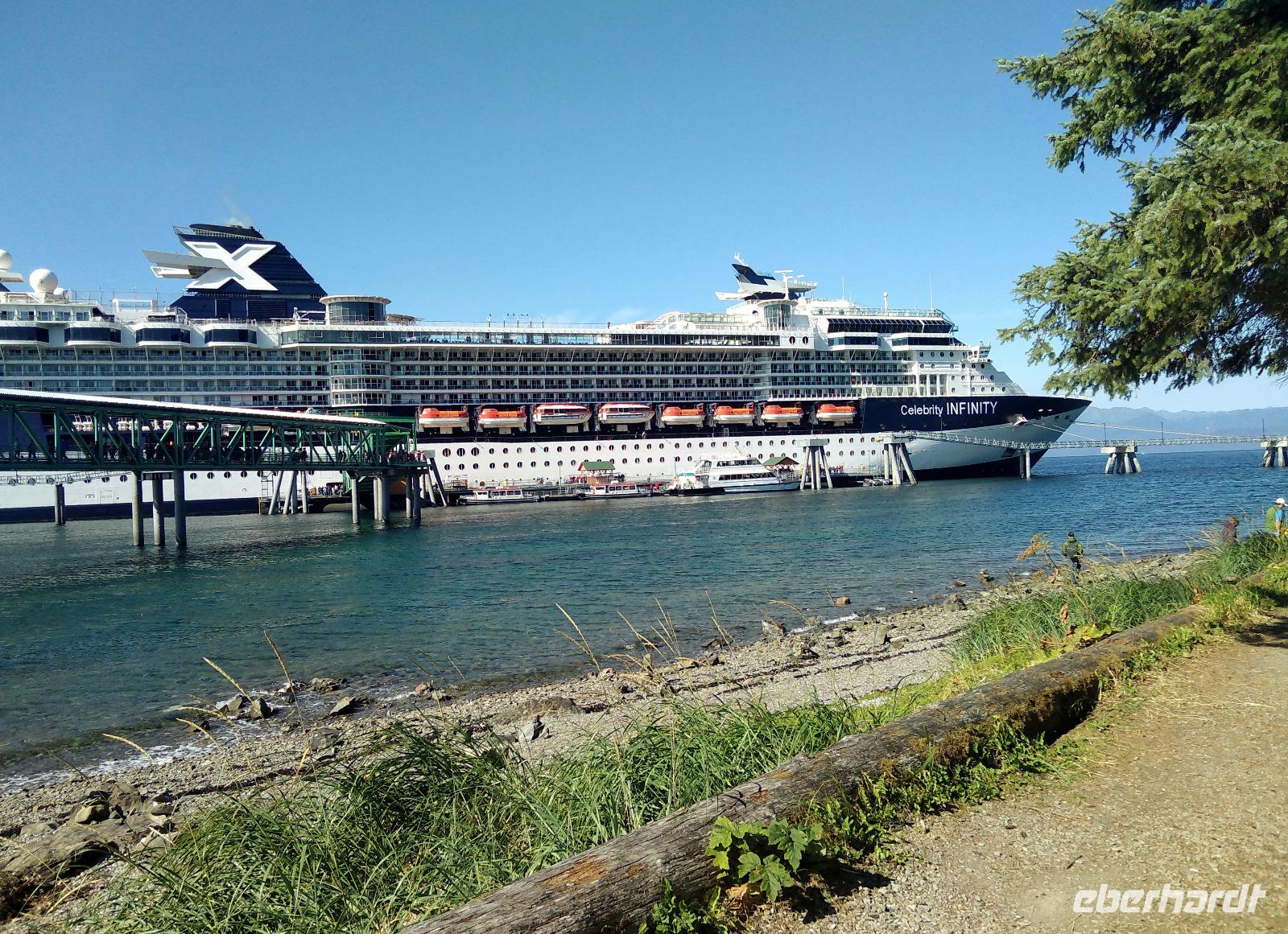 Nach dem Frühstück und dem vormittäglichen Treffen legte das Schiff kurz nach dem Mittag am Icy Strait Point an- unser erster Stopp in Alaska und angeblich der Ort mit der höchsten Bärenpopulation weltweit. Früher wurden am Icy Strait Point Fischkonserven hergestellt und in alle Welt verschickt. Heute erinnert ein Museum an diese Zeit. Vom Hafen aus unternahmen wir zunächst einen kleinen Spaziergang auf einen Naturpfad. Was für herrliche Wälder! Eigentlich wollten wir tiefer in den Wald, aber leider führte kein einziger Wanderweg hinein, sodass wir zunächst weiter am Ufer entlangspazierten bis wir ins Dorf Hoonah kamen. Spannend und zugleich deprimierend zu erleben, wie die Nachfahren der Tlingit-Indianer heute leben- ohne Beschäftigung, ohne Perspektive, aber trotzdem immer bestrebt, die eigene Kultur zu erhalten. Auch oberhalb des Dorfes Hoonah gab es keinen einzigen Wanderweg zurück zum Icy Strait Point. So entschied sich die Gruppe, am Ufer wieder zurück zum Schiff zu laufen. Ich versuchte weiter mein Glück, aber auch nach längerem Suchen entdeckte ich nicht einmal die Spur eines Wanderweges. Lediglich ein relativ stark befahrener Schotterweg führte hoch in den Wald, nur leider in die falsche Richtung. Wenigstens kreuzten noch zwei Sitka-Schwarzschwanzrehe meinen Weg und kamen mir ganz nah, ohne jegliche Scheu zu zeigen- sicherlich einer der Höhepunkte des heutigen Tages. Nachdem alle wieder auf dem Schiff waren, legte die Celebrity Infinity gegen 20:30 ab. Das Abendessen erfolgte heute individuell und wie schon in den letzten Tagen trafen sich alle Tanzbegeisterten ab 22:00 wieder auf Deck 11.