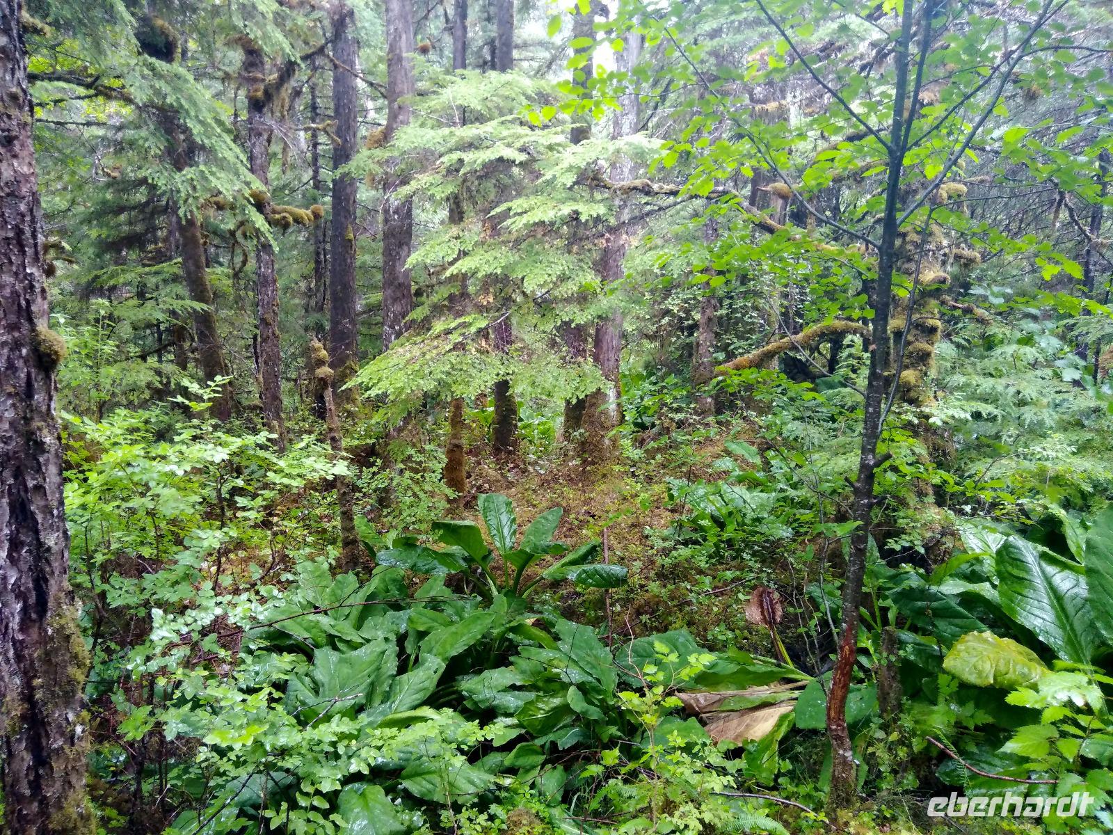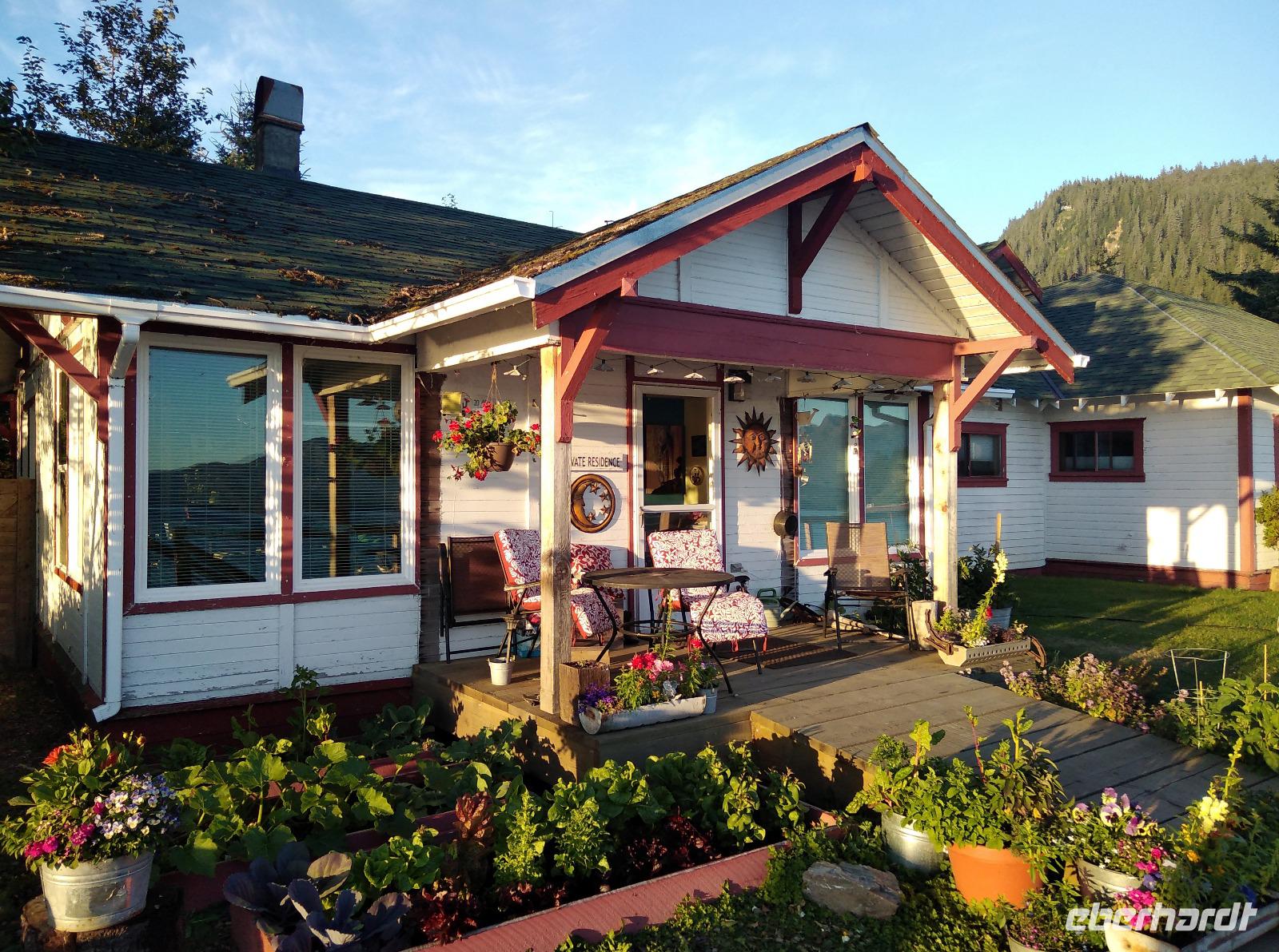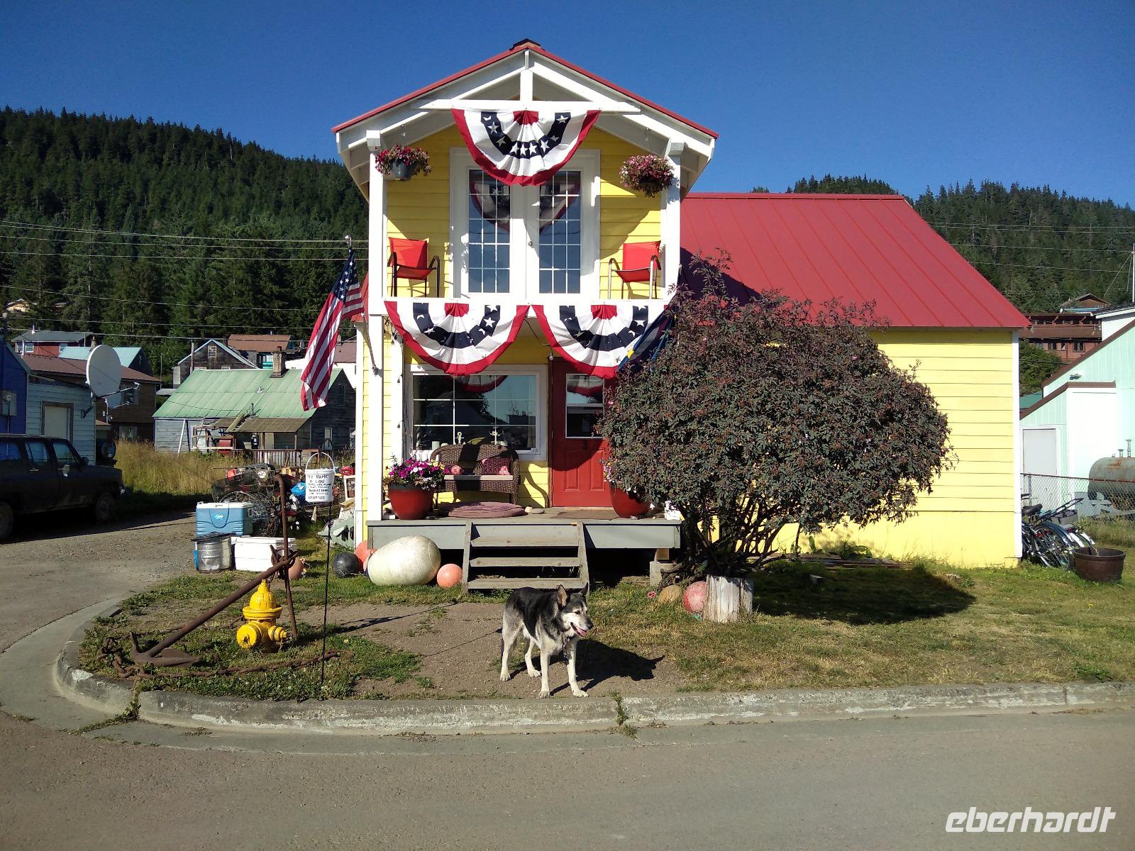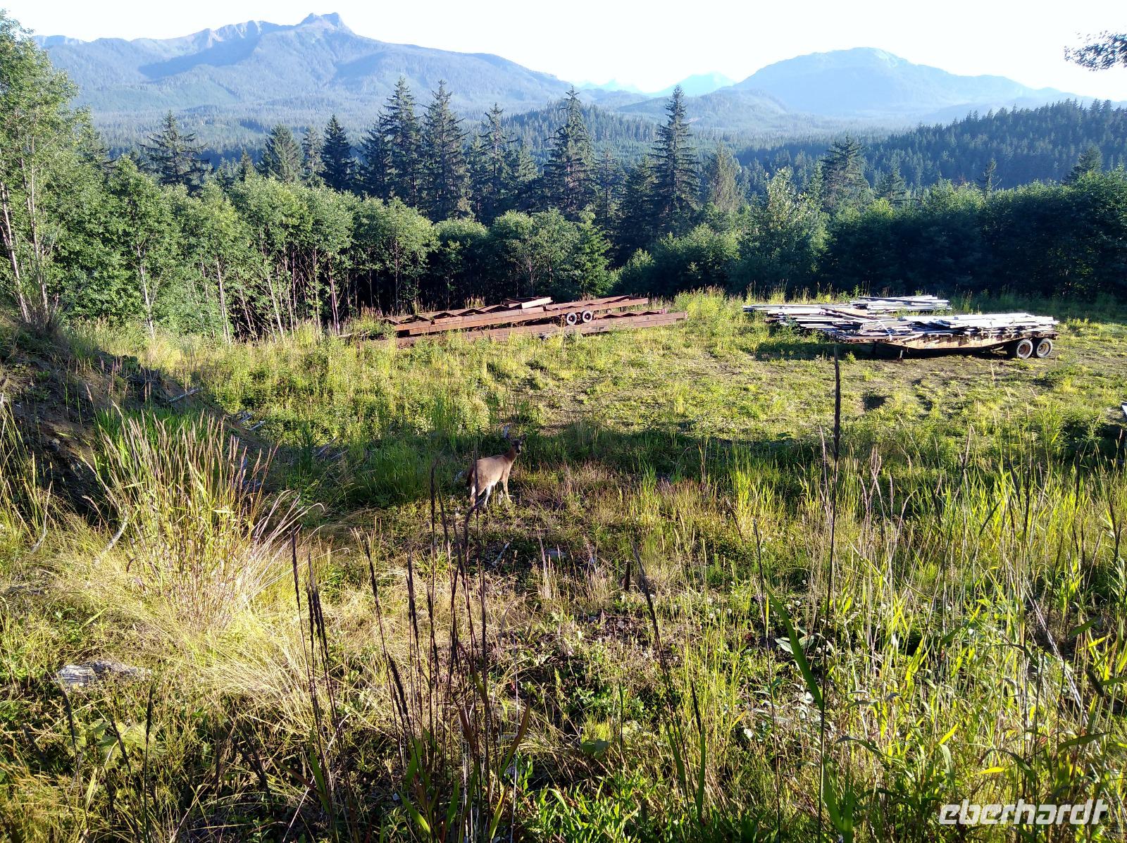 Nach dem Frühstück und dem vormittäglichen Treffen legte das Schiff kurz nach dem Mittag am Icy Strait Point an- unser erster Stopp in Alaska und angeblich der Ort mit der höchsten Bärenpopulation weltweit. Früher wurden am Icy Strait Point Fischkonserven hergestellt und in alle Welt verschickt. Heute erinnert ein Museum an diese Zeit. Vom Hafen aus unternahmen wir zunächst einen kleinen Spaziergang auf einen Naturpfad. Was für herrliche Wälder! Eigentlich wollten wir tiefer in den Wald, aber leider führte kein einziger Wanderweg hinein, sodass wir zunächst weiter am Ufer entlangspazierten bis wir ins Dorf Hoonah kamen. Spannend und zugleich deprimierend zu erleben, wie die Nachfahren der Tlingit-Indianer heute leben- ohne Beschäftigung, ohne Perspektive, aber trotzdem immer bestrebt, die eigene Kultur zu erhalten. Auch oberhalb des Dorfes Hoonah gab es keinen einzigen Wanderweg zurück zum Icy Strait Point. So entschied sich die Gruppe, am Ufer wieder zurück zum Schiff zu laufen. Ich versuchte weiter mein Glück, aber auch nach längerem Suchen entdeckte ich nicht einmal die Spur eines Wanderweges. Lediglich ein relativ stark befahrener Schotterweg führte hoch in den Wald, nur leider in die falsche Richtung. Wenigstens kreuzten noch zwei Sitka-Schwarzschwanzrehe meinen Weg und kamen mir ganz nah, ohne jegliche Scheu zu zeigen- sicherlich einer der Höhepunkte des heutigen Tages. Nachdem alle wieder auf dem Schiff waren, legte die Celebrity Infinity gegen 20:30 ab. Das Abendessen erfolgte heute individuell und wie schon in den letzten Tagen trafen sich alle Tanzbegeisterten ab 22:00 wieder auf Deck 11.