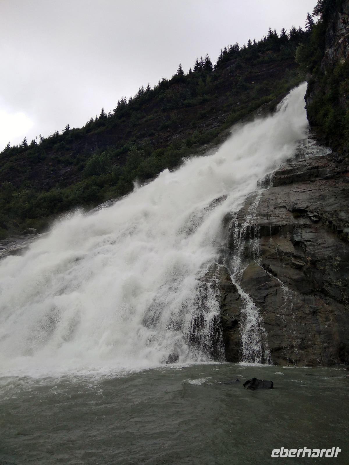 Nach dem Frühstück trafen wir uns alle vor dem Schiff, das bereits um 7:30 in Juneau angelegt hatte. Unser Guide erwartete uns bereits- eine junge Dame aus Salt Lake City, die während der Sommermonate in Alaska als Touristenführerin und Fahrerin jobbte. Zunächst fuhr sie mit uns zm Mendenhall-Gletscher, wo wir eine kurze Wanderung zu den Nugget Falls unternahmen. Die spektakulären Wasserfälle, die direkt in den vorgelagerten Mendenhall Lake stürzen, beeindruckten alle unsere Gäste nachhaltig. Von dort aus ging es zu einer Lachsbrüterei, in der kleine Lachse das Licht der Welt erblicken und dann als erwachsene Lachse zum Laichen wieder zurückkommen. Die Art und Weise, wie Lachse vor dem Laichen jedoch getötet werden, um dann den weiblichen Lachsen die Eier aus dem Bauch zu schneiden, schockierte uns alle. Zum Ende unserer Tour wurden wir an der Talstation des Mount Roberts abgesetzt und jeder konnte sich individuell entscheiden, ob er direkt auf Juneaus Hausberg fahren oder lieber abwarten wollte, ob sich das Wetter noch verbessern würde. Ich fuhr mit einem Teil der Gruppe direkt nach oben und begab mich auf eine Wanderung auf den knapp 1200m hohen Mount Roberts. Viele Steine, müde Beine, Aussicht keine- hätte das Fazit lauten können- nichtsdestotrotz eine nette Wanderung und nach all der relativ bewegungsarmen Zeit auf dem Schiff eine sehr wohltuende Erfahrung. Danach ging es mit der Seilbahn wieder in den Ort, der natürlich auch noch erkundet werden wollte. Insbesondere der legendäre Red Dog Saloon und die Bar des Alaskan Hotels lohnten einen Besuch. Triefend nass ging es dann zurück aufs Schiff. Sauna, Abendessen und Tanzen sorgten dann wieder für warme Gedanken, während das Schiff seit 20:00 auch wieder auf See war.