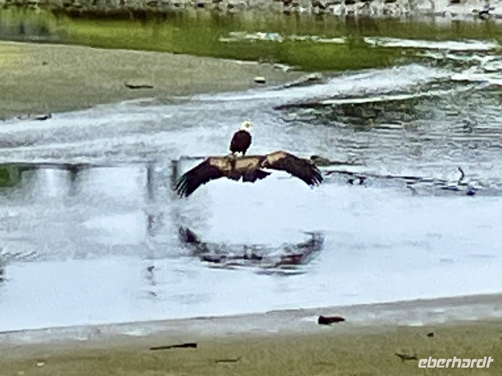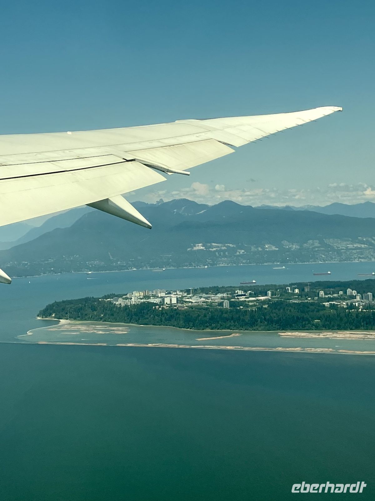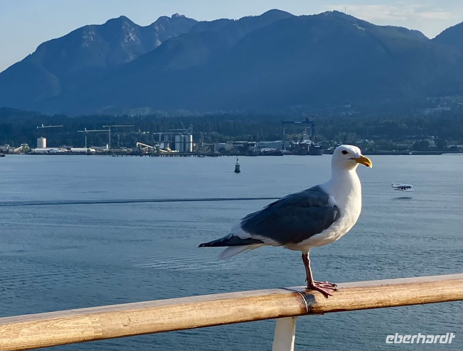 Beim heutigen Fruehstueck sitzt auch Jonathan auf dem Gelaender und schaut zu ob nicht doch irgendjemand etwas auf dem Tisch liegen laesst. Wir treffen uns alle um 8:15 in der Lobby, sodass wir alle gemeinsam von Bord gehen koennen. Ein bisschen mummelig ist es uns allen, manche haben nicht sehr gut geschlafen, auf einmal ist der Abschied nah. Das Auschecken geht ganz ring und schmerzlos, die Grenzkontrolle ist auch sehr flink und unsere Fahrerin Barbara steht mit ihrem Bus draussen bereit. Wir warten ein wenig aber dann entscheiden wir zu Fuss zum Bus zu gehen anstatt zu warten, bis sich der Bus-Knopf geloest hat. Heute sind rund 10‘000 Leute aus den 4 Kreuzschiffen alle gleichzeitig ausgestiegen. Da ist klar, dass es einen Koffer-Leute-Busse-Stau gibt. Puenktlichst verladet Barbara nun unsere Koffer unten hinein und los gehts zum Vancouver Flughafen YVR. Auch hier haben wir wieder viel Glueck denn ab heute gibt es auch in Vancouver ein Do it yourself Kofferhandhaben und Bordkarteausdruck. Die jungen neuen Angestellten stehen bereits an den Maschinen um zu helfen, bloss stehen die “Helfer” genauso ratlos vor den Flimmerkaestchen wie wir selbst. Ja, jetzt haben wir noch Zeit zum plaudern, letzte Einkaeufe zu taetigen, das Aquarium anzuschauen und noch einmal diese wunderschoene Reise Revue passieren zu lassen. Vieviele Schwarzbaeren waren es ? 4. Grizzlies ? Keine lebenden. Wapiti ? Herde. Krummhornschafe ? 2. Wale ? soviele…manche haben mehr, andere weniger gespottet, aber alle haben welche verschiedener Arten gesichtet. Dann hatten wir unzaehlige Weisskopfadler und Seeadler gesehen, eine Eule, viele Kolibris und sonst noch Streiffenhoernchen, Pikas, Erdhoernchen und sicher viele Ameisen und Wuermchen. Floehe gab es keine. Der Flug nach Europa vergeht eigentlich ereignisslos, vom Essen wollen wir nicht lange referieren. Die Sonne will in dieser langen Nacht nicht untergehen, und das Bordpersonal ist sehr nett.