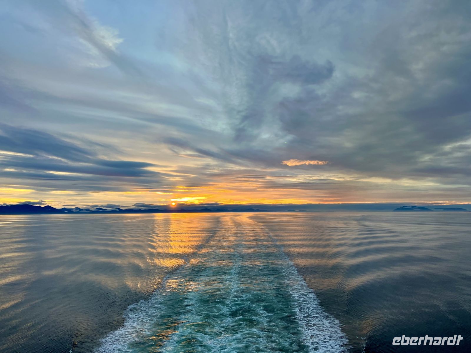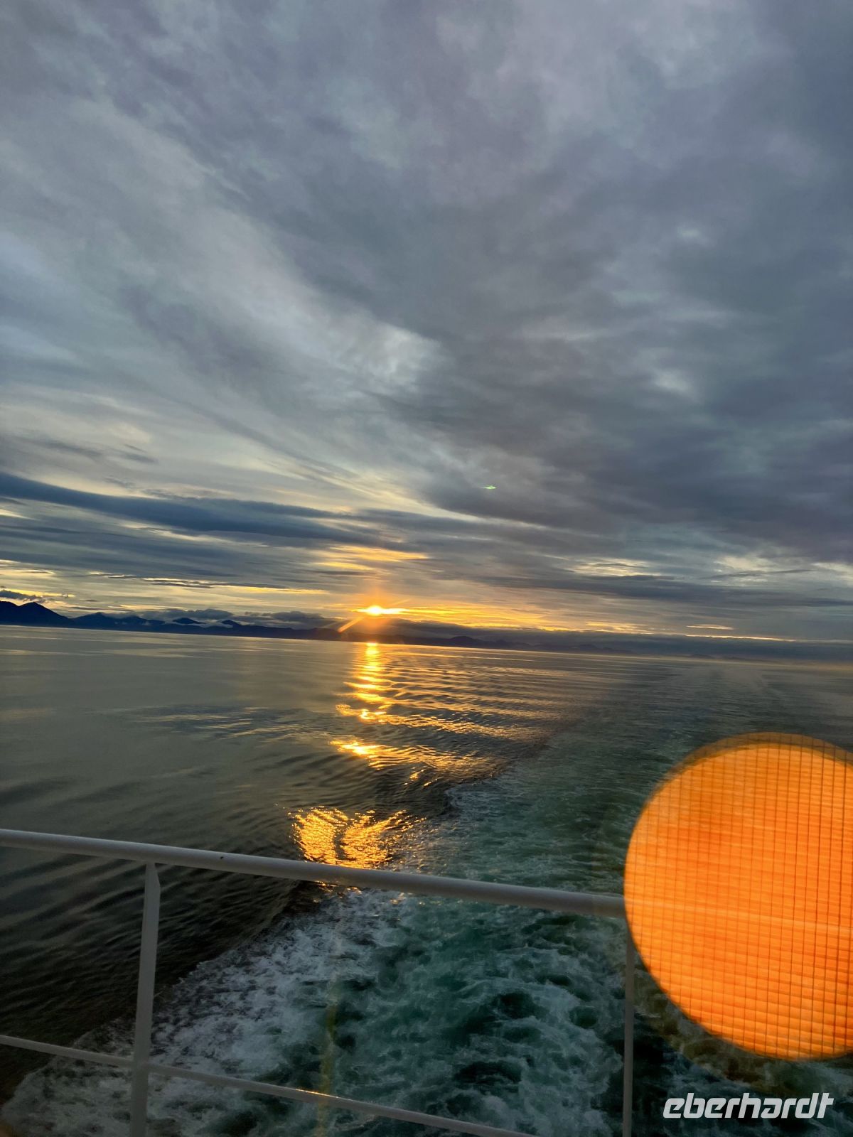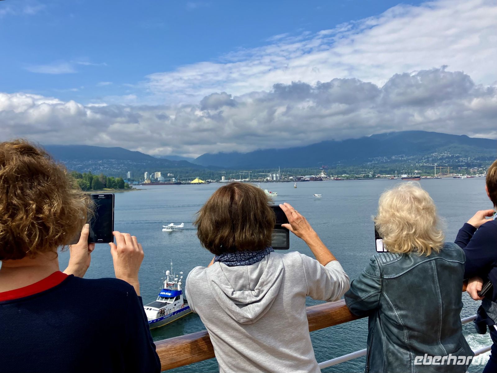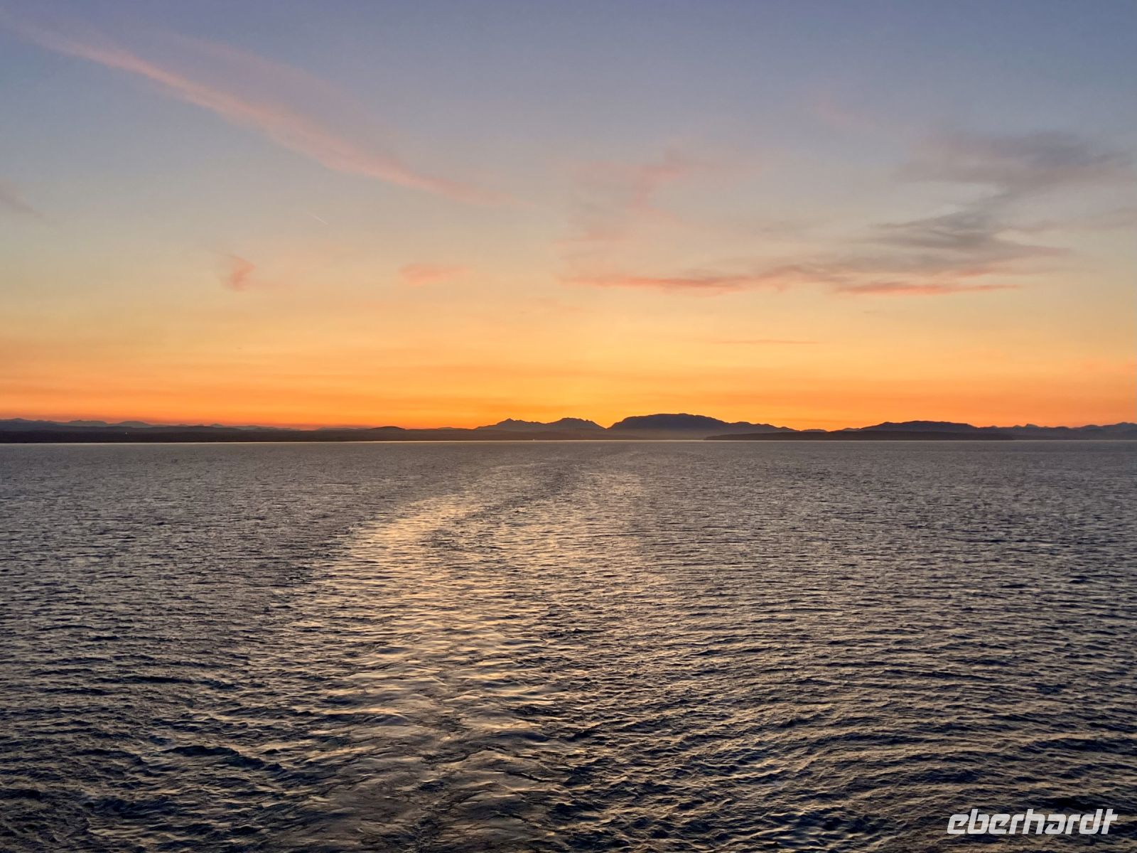 Buerostunde ist auch heute zwischen 9:00 und 10:00 Uhr. Wir fuellen auch gleich gemeinsam das Einreiseformular nach Kanada aus. Heute strahlt die Sonne und wir segeln gemuetlich an der Insel Haida Gawaii vorbei um danach zwischen Vancouver Island und dem Festland bis nach Vancouver zu gelangen. Dies dauert 2 Naechte und einen Tag. An Bord kann man sich so gut vergnuegen, niemandem wird es langweilig. Wale springen immer mal wieder, Inseln zieren die Kuestensicht, Bars sorgen fuer gute Stimmung, Buffets fuers leibliche Wohl und die 2 Pools kann man heute auch schoen nutzen. An den Bars werden die schmackhaftesten Cocktails gemischt und geschuettelt und die Liegestuehle helfen bei der Verdauung des ueppigen Essens und eben der Cocktails. Manche Liegen haben sogar Armlehnen sodass man nicht runterfaellt ! Aber nicht nur faulenzen denn um 11:00 gibt es wie fast jeden Tag Yoga und am Nachmittag spielen wir Cornhole (Ein Spiel zwischen Boccia und Minigolf !) auf Deck 9 und spaeter Tischtennis beim Pool. Ach, das Letztere wird wegen viel zu schoenem Wetter und Walsichtungen abgesagt. Ein gemeinsames schmuckes Abendessen im teueren Restaurant und ein wunderbarer Sonntenuntergang runden diese schoene Reise ab. Bald aber verschwinden alle schon in ihre Kabinen, denn nun heisst es packen.