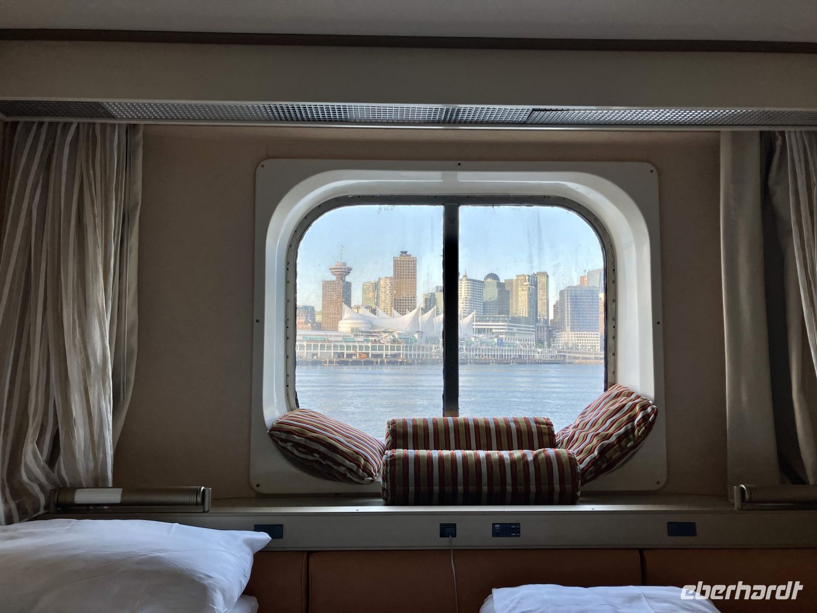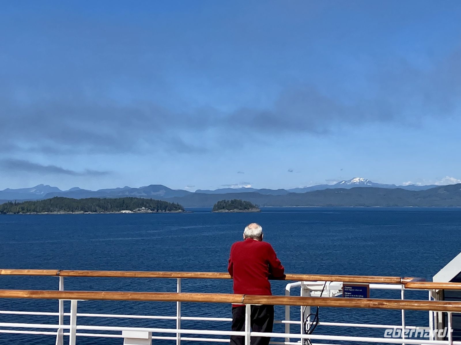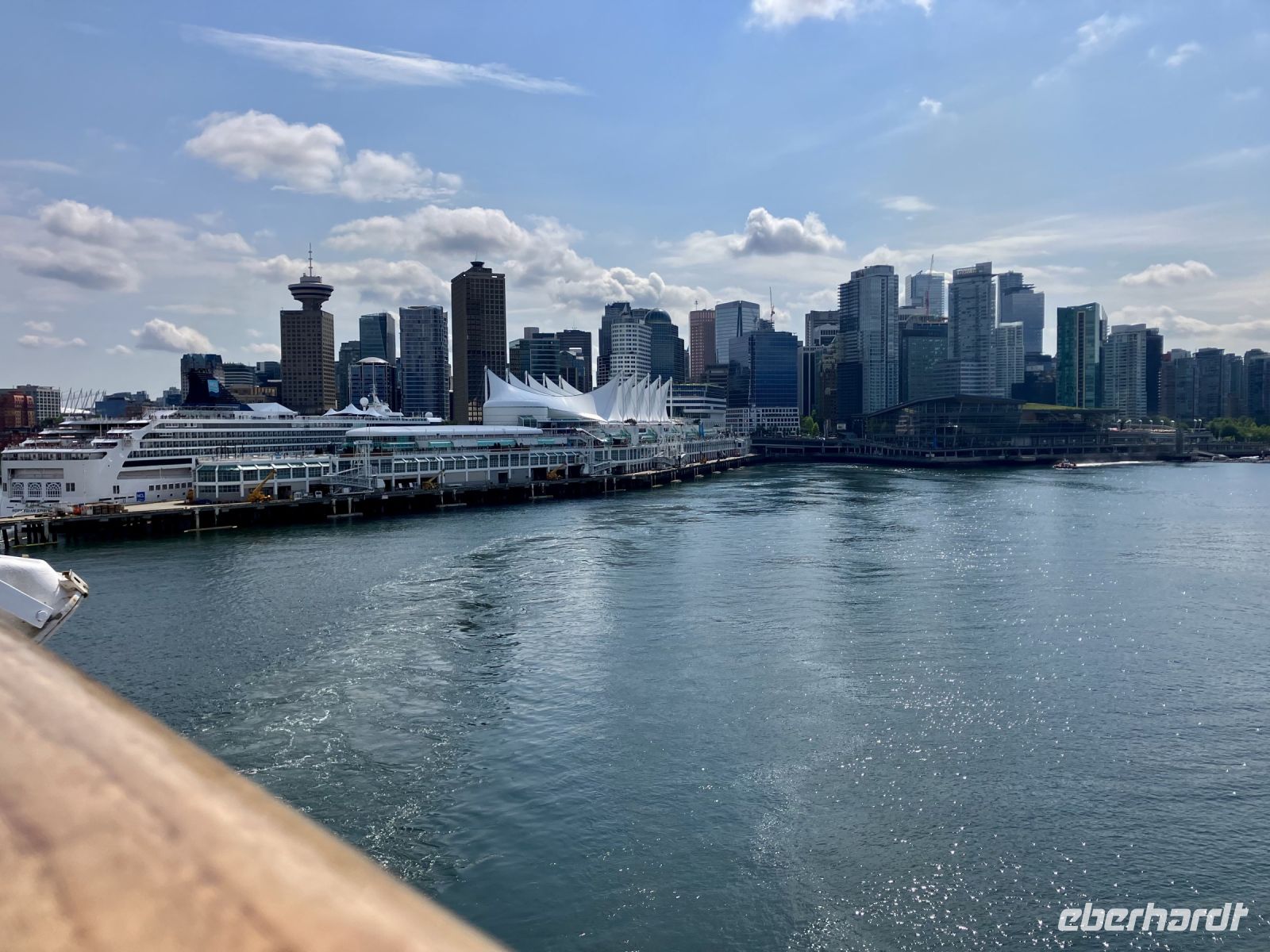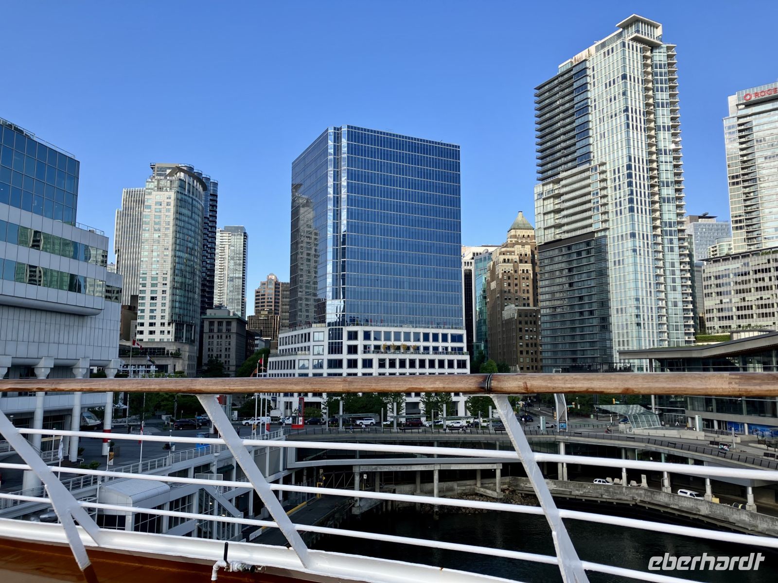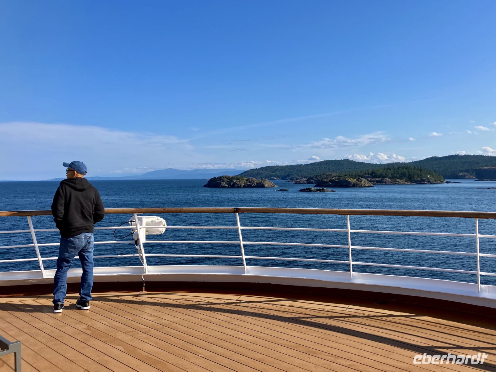 Buerostunde ist auch heute zwischen 9:00 und 10:00 Uhr. Wir fuellen auch gleich gemeinsam das Einreiseformular nach Kanada aus. Heute strahlt die Sonne und wir segeln gemuetlich an der Insel Haida Gawaii vorbei um danach zwischen Vancouver Island und dem Festland bis nach Vancouver zu gelangen. Dies dauert 2 Naechte und einen Tag. An Bord kann man sich so gut vergnuegen, niemandem wird es langweilig. Wale springen immer mal wieder, Inseln zieren die Kuestensicht, Bars sorgen fuer gute Stimmung, Buffets fuers leibliche Wohl und die 2 Pools kann man heute auch schoen nutzen. An den Bars werden die schmackhaftesten Cocktails gemischt und geschuettelt und die Liegestuehle helfen bei der Verdauung des ueppigen Essens und eben der Cocktails. Manche Liegen haben sogar Armlehnen sodass man nicht runterfaellt ! Aber nicht nur faulenzen denn um 11:00 gibt es wie fast jeden Tag Yoga und am Nachmittag spielen wir Cornhole (Ein Spiel zwischen Boccia und Minigolf !) auf Deck 9 und spaeter Tischtennis beim Pool. Ach, das Letztere wird wegen viel zu schoenem Wetter und Walsichtungen abgesagt. Ein gemeinsames schmuckes Abendessen im teueren Restaurant und ein wunderbarer Sonntenuntergang runden diese schoene Reise ab. Bald aber verschwinden alle schon in ihre Kabinen, denn nun heisst es packen.