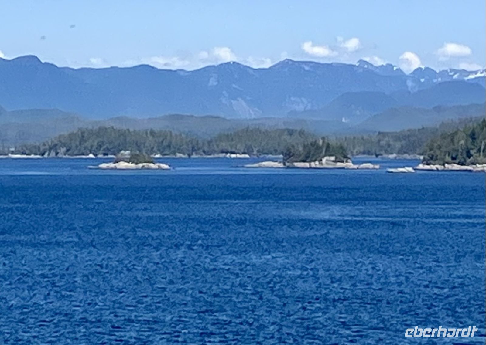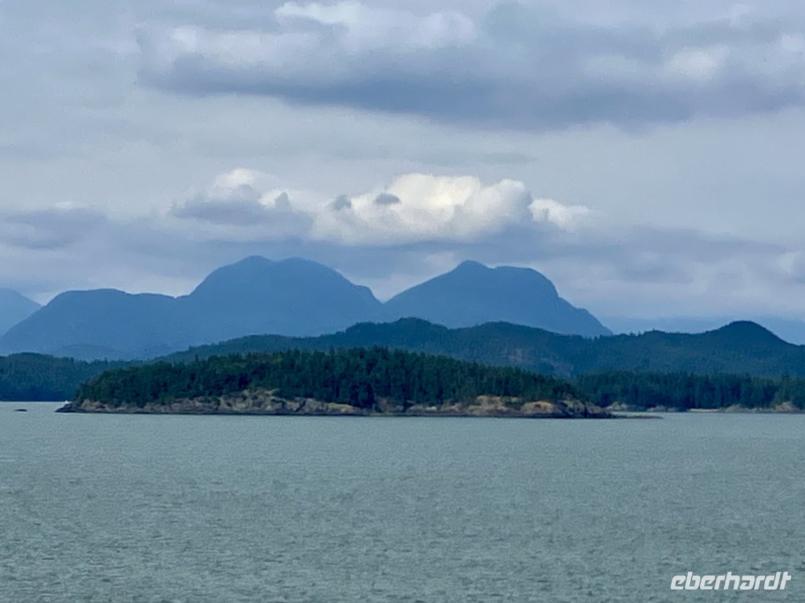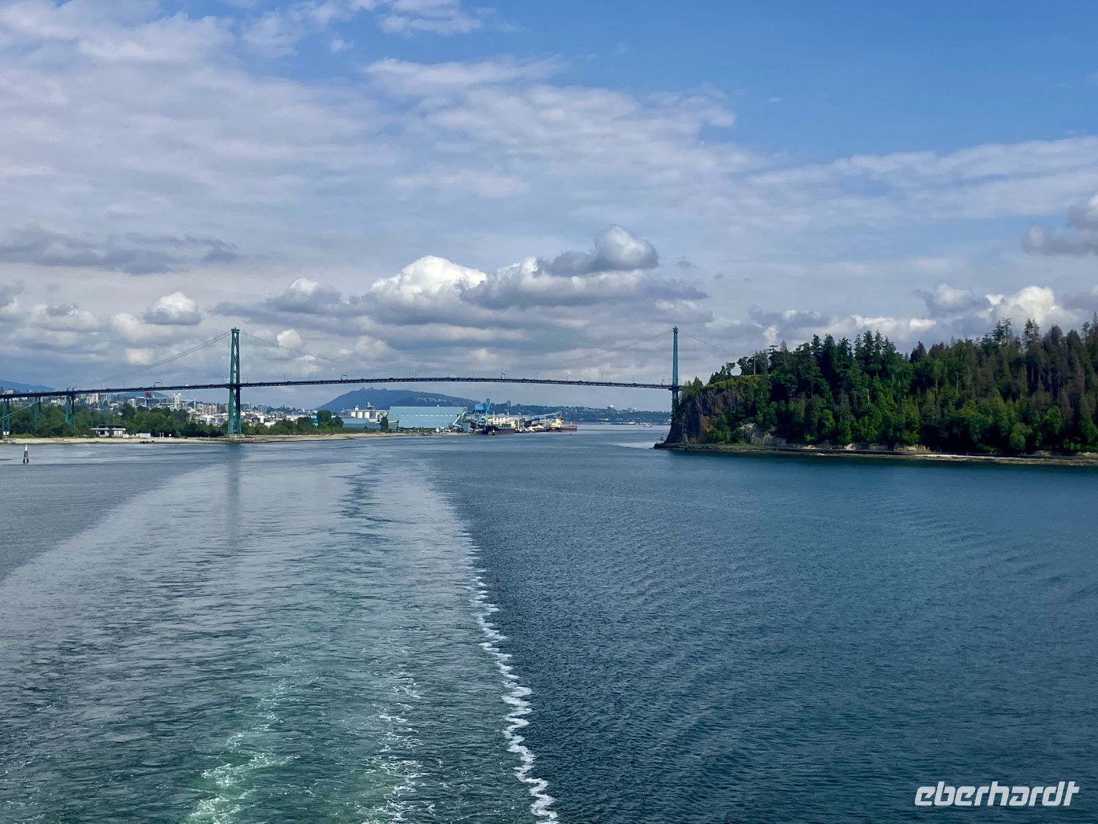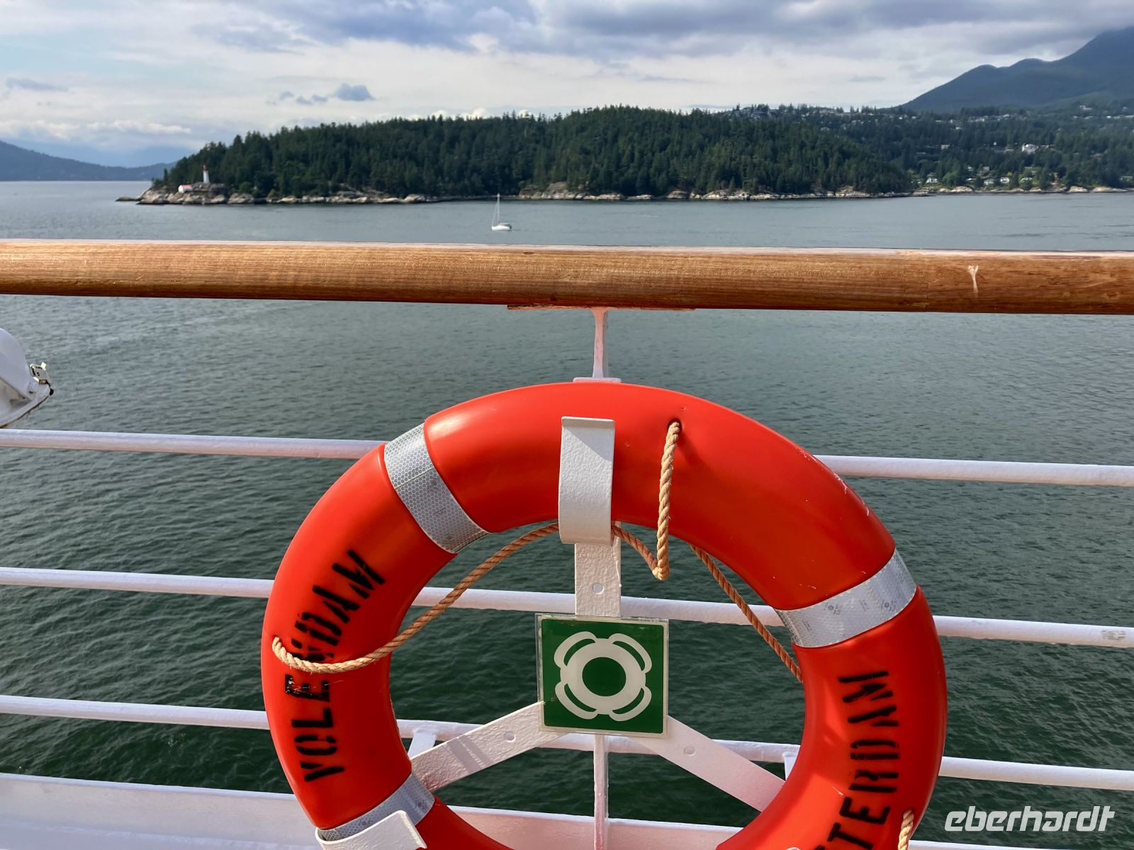 Buerostunde ist auch heute zwischen 9:00 und 10:00 Uhr. Wir fuellen auch gleich gemeinsam das Einreiseformular nach Kanada aus. Heute strahlt die Sonne und wir segeln gemuetlich an der Insel Haida Gawaii vorbei um danach zwischen Vancouver Island und dem Festland bis nach Vancouver zu gelangen. Dies dauert 2 Naechte und einen Tag. An Bord kann man sich so gut vergnuegen, niemandem wird es langweilig. Wale springen immer mal wieder, Inseln zieren die Kuestensicht, Bars sorgen fuer gute Stimmung, Buffets fuers leibliche Wohl und die 2 Pools kann man heute auch schoen nutzen. An den Bars werden die schmackhaftesten Cocktails gemischt und geschuettelt und die Liegestuehle helfen bei der Verdauung des ueppigen Essens und eben der Cocktails. Manche Liegen haben sogar Armlehnen sodass man nicht runterfaellt ! Aber nicht nur faulenzen denn um 11:00 gibt es wie fast jeden Tag Yoga und am Nachmittag spielen wir Cornhole (Ein Spiel zwischen Boccia und Minigolf !) auf Deck 9 und spaeter Tischtennis beim Pool. Ach, das Letztere wird wegen viel zu schoenem Wetter und Walsichtungen abgesagt. Ein gemeinsames schmuckes Abendessen im teueren Restaurant und ein wunderbarer Sonntenuntergang runden diese schoene Reise ab. Bald aber verschwinden alle schon in ihre Kabinen, denn nun heisst es packen.