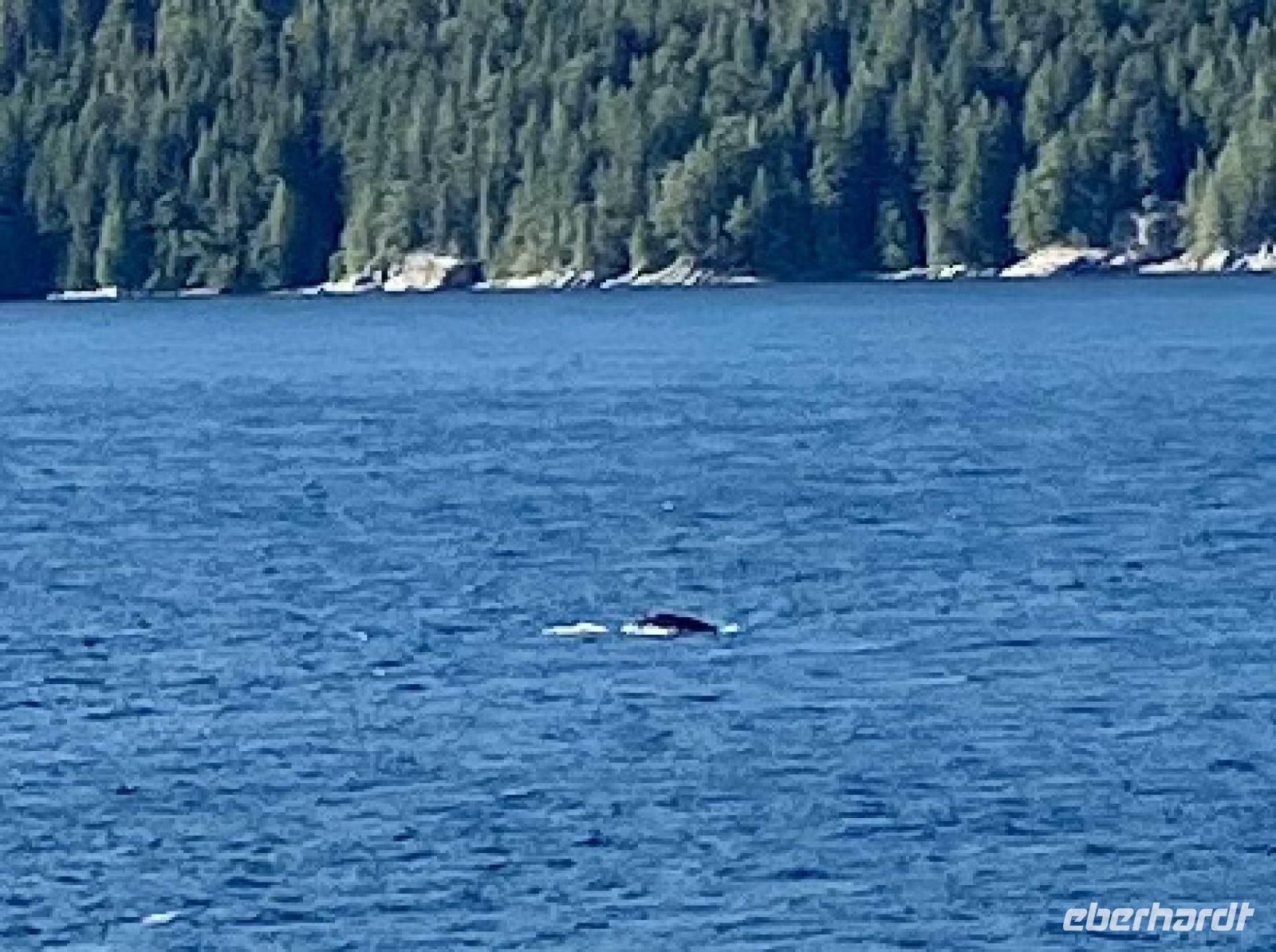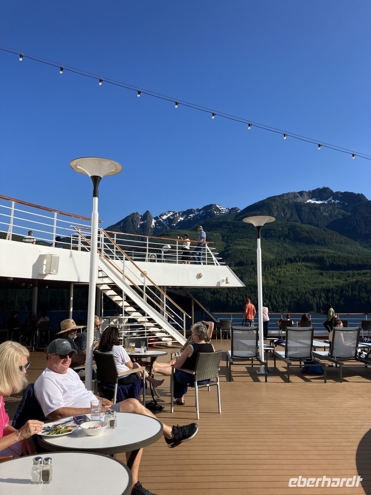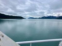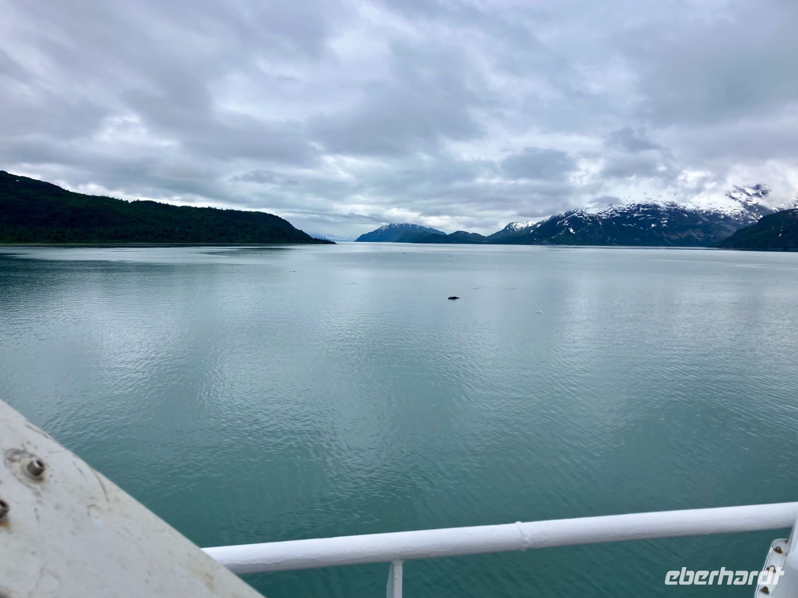 Auf diesem grossen Schiff muss man sich vorerst mal so richtig umschauen und jeder findet sich auch bald einigermassen zu recht anhand der ausgehaengten Deckplaene und der ueberaus freundlichen Crew. Nicht alles ist gut beschriftet und so rennen wir des oefteren im Kreis. Das Schiff ist halb so gross wie die normalen Alaska Kreuzschiffe und scheint auch nicht total ausverkauft zu sein. Es ist gemuetlich und gibt so viele Aufenthaltsorte, dass sich alles gut aufteilt. Heute gibt es spezial Eberhardt Yoga auf Deck 9 bereits um 7:00 Uhr morgends. Dies beschaeftigt uns bis zum Tai Chi Kurs. Danach gehen wir zum Fruehstuecksbuffet…….die Omeletten sind super fein. Zwischen 9:30 und 10:30 Uhr morgends sehen wir uns alle wieder auf Deck 9 im Lido. Nun koennen wir auch alle unsere Fragen anbringen und erfahren auch wo wir uns auf diesem Seetag wiedertreffen koennen. Am Nachmittag ist wunderschoenes Wetter also sehen wir uns alle auf dem hinteren Aussendeck und starren auf die Berge am Horizont, das tiefblaue ruhige Meer und die Buckelwale und Delphine die da immer wieder auftauchen. So ein herrlicher Nachmittag. Die Drinks an der Bar sind auch lecker, wir haben ja alles inklusive, das ist fein. Es gibt auch Aktivitaeten an Bord, wie Tanzkurse, Malstunden, Bowling und vieles mehr. Heute abend muessen wir uns auch fein machen, da heute ein eleganter Abend angesagt ist. Ouiiii da kommen ja einige Leute im langen Abendkleid, so wild sind wir nicht, wir sind gut und adrett gekleidet wie die meisten. Da wir eine froehliche und unternehmenslustige Gruppe sind, die auch gerne immer wieder gesellig zusammen sitzt, hecken wir auch einen Kommunikations-Plan aus fuer die naechsten Tage. Danke Brigitte.