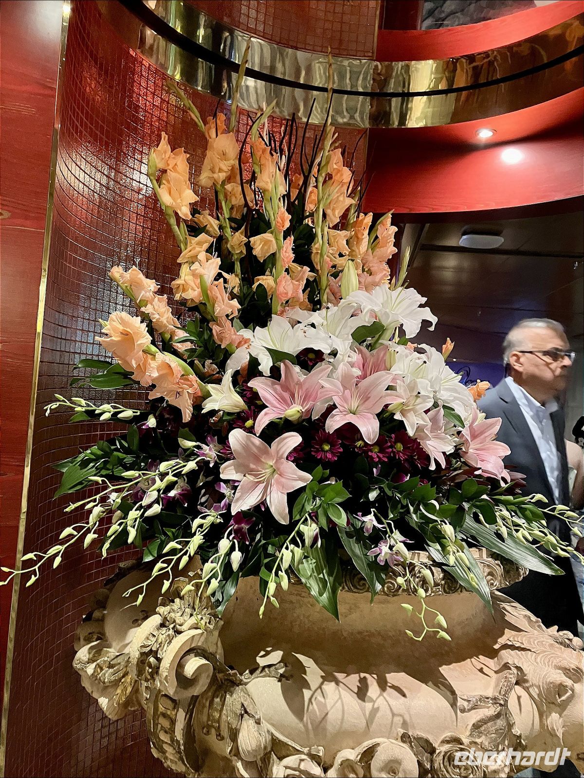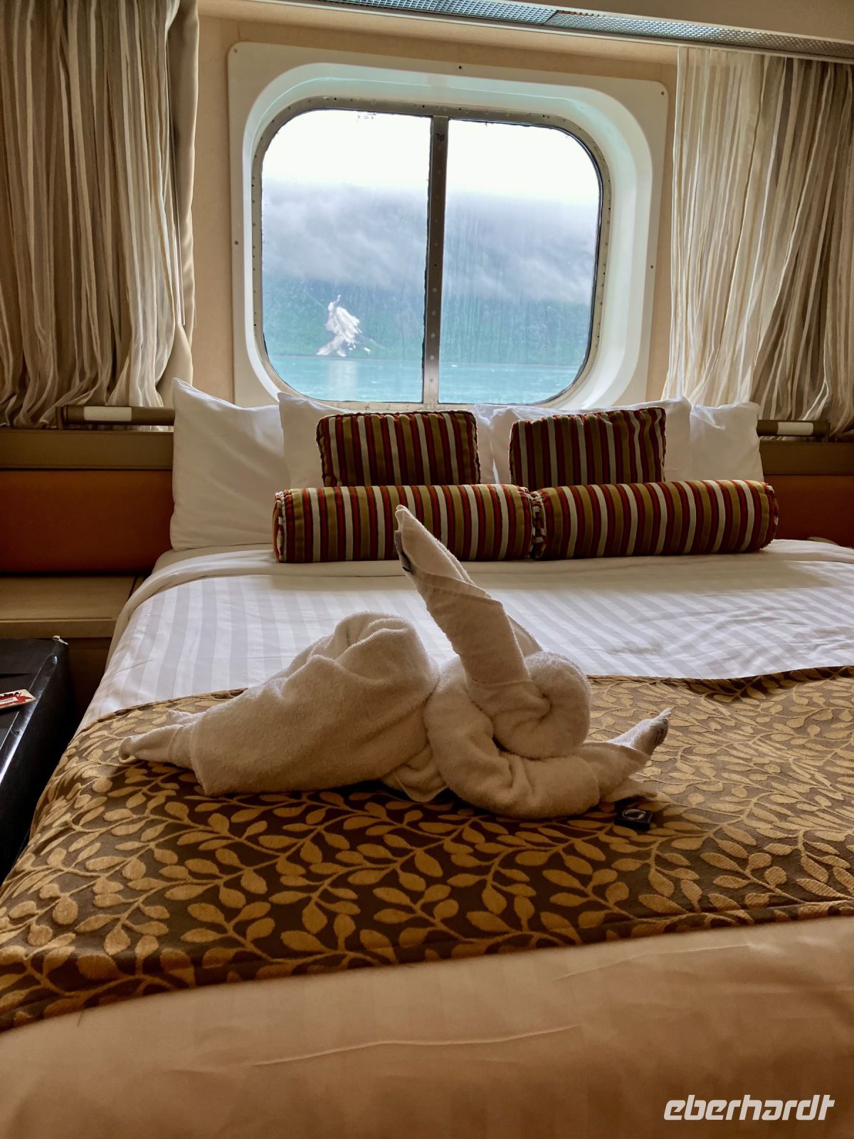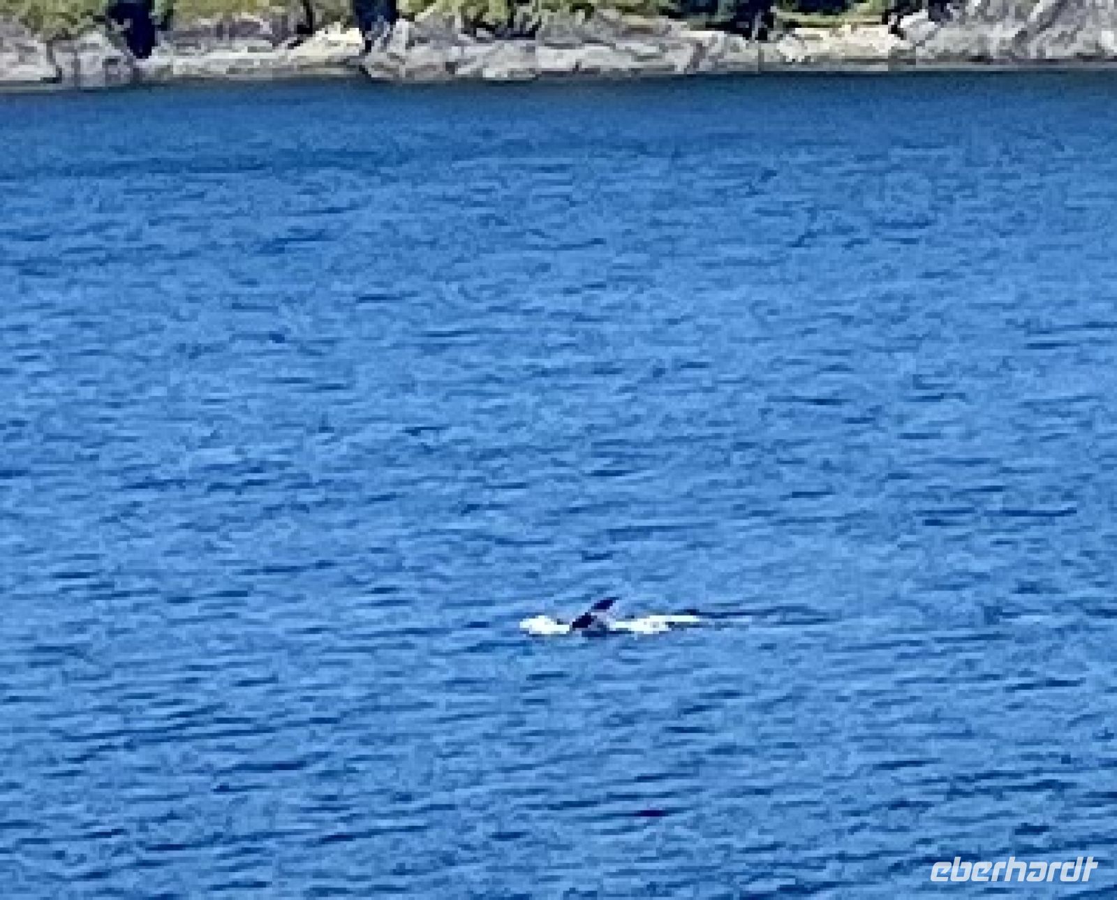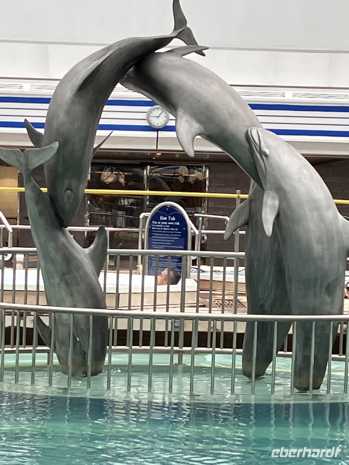 Auf diesem grossen Schiff muss man sich vorerst mal so richtig umschauen und jeder findet sich auch bald einigermassen zu recht anhand der ausgehaengten Deckplaene und der ueberaus freundlichen Crew. Nicht alles ist gut beschriftet und so rennen wir des oefteren im Kreis. Das Schiff ist halb so gross wie die normalen Alaska Kreuzschiffe und scheint auch nicht total ausverkauft zu sein. Es ist gemuetlich und gibt so viele Aufenthaltsorte, dass sich alles gut aufteilt. Heute gibt es spezial Eberhardt Yoga auf Deck 9 bereits um 7:00 Uhr morgends. Dies beschaeftigt uns bis zum Tai Chi Kurs. Danach gehen wir zum Fruehstuecksbuffet…….die Omeletten sind super fein. Zwischen 9:30 und 10:30 Uhr morgends sehen wir uns alle wieder auf Deck 9 im Lido. Nun koennen wir auch alle unsere Fragen anbringen und erfahren auch wo wir uns auf diesem Seetag wiedertreffen koennen. Am Nachmittag ist wunderschoenes Wetter also sehen wir uns alle auf dem hinteren Aussendeck und starren auf die Berge am Horizont, das tiefblaue ruhige Meer und die Buckelwale und Delphine die da immer wieder auftauchen. So ein herrlicher Nachmittag. Die Drinks an der Bar sind auch lecker, wir haben ja alles inklusive, das ist fein. Es gibt auch Aktivitaeten an Bord, wie Tanzkurse, Malstunden, Bowling und vieles mehr. Heute abend muessen wir uns auch fein machen, da heute ein eleganter Abend angesagt ist. Ouiiii da kommen ja einige Leute im langen Abendkleid, so wild sind wir nicht, wir sind gut und adrett gekleidet wie die meisten. Da wir eine froehliche und unternehmenslustige Gruppe sind, die auch gerne immer wieder gesellig zusammen sitzt, hecken wir auch einen Kommunikations-Plan aus fuer die naechsten Tage. Danke Brigitte.