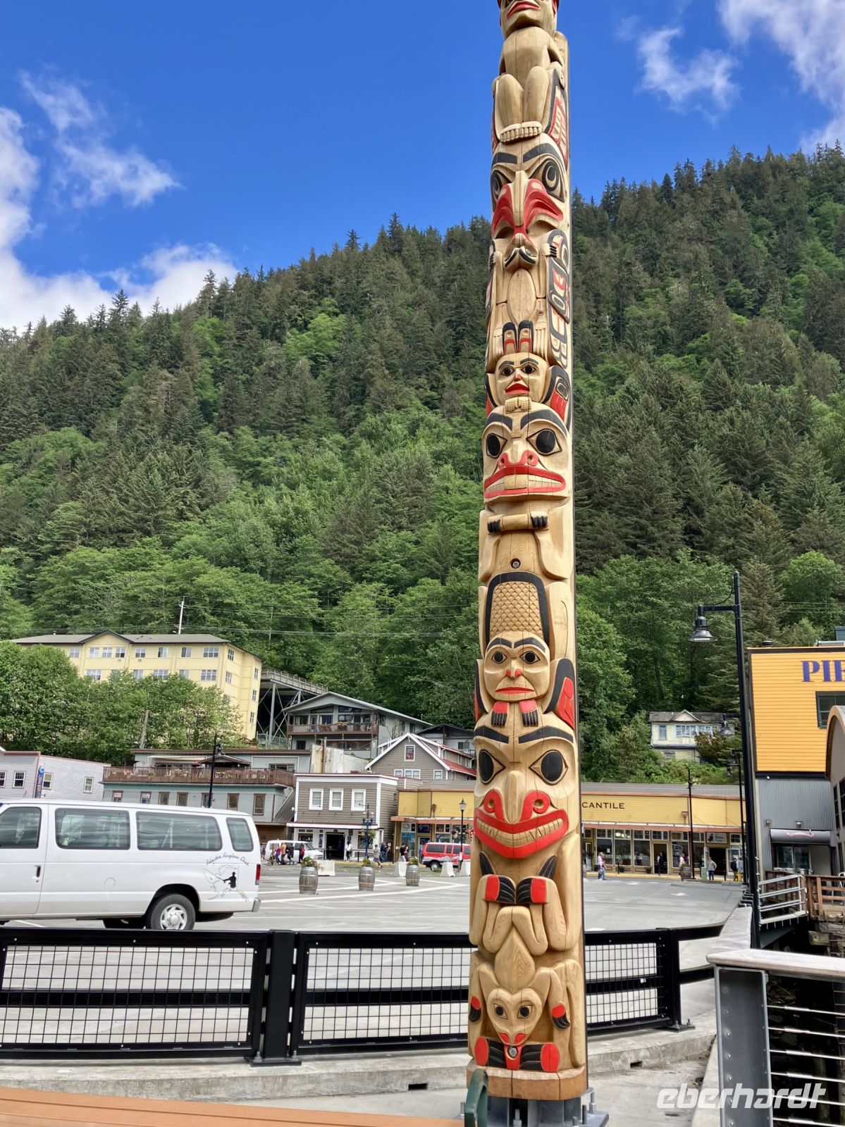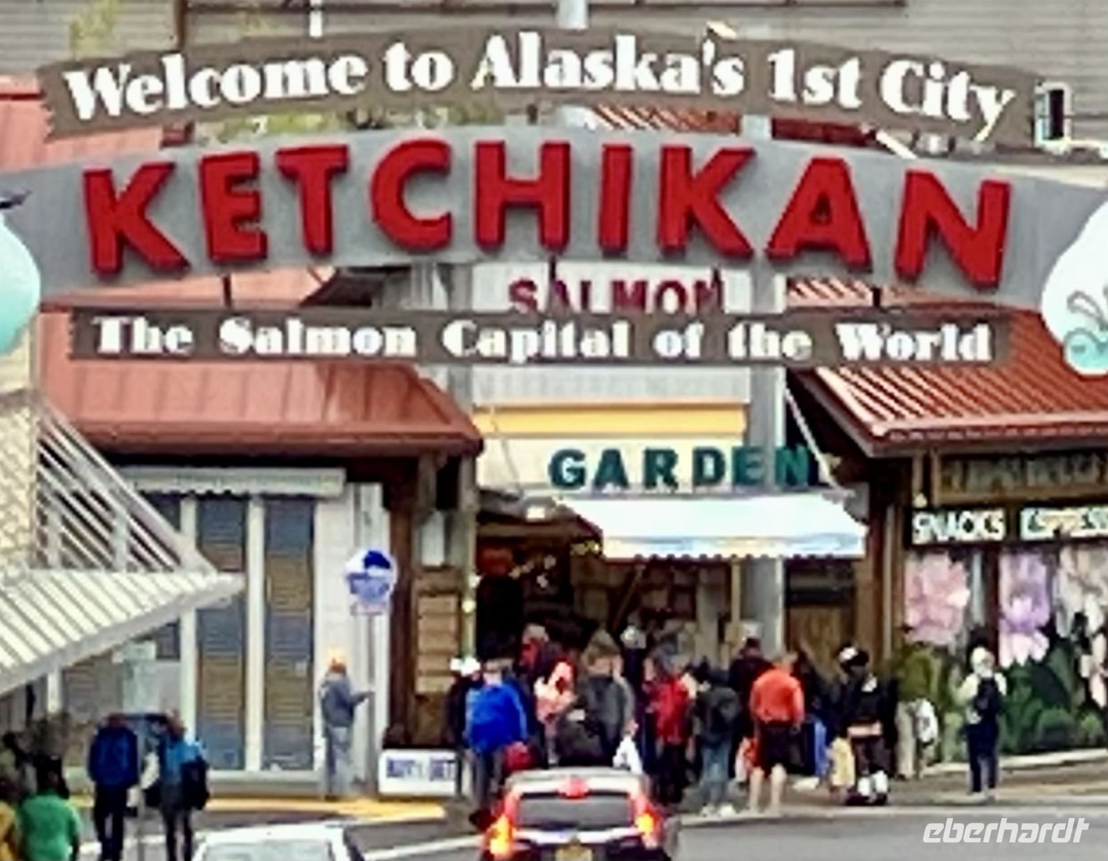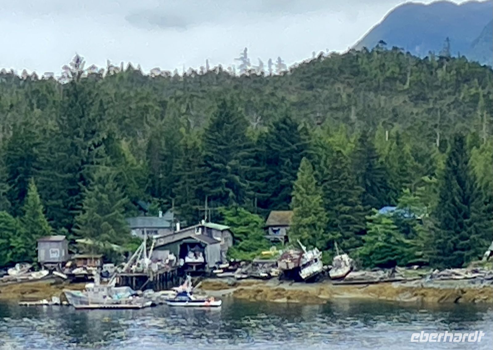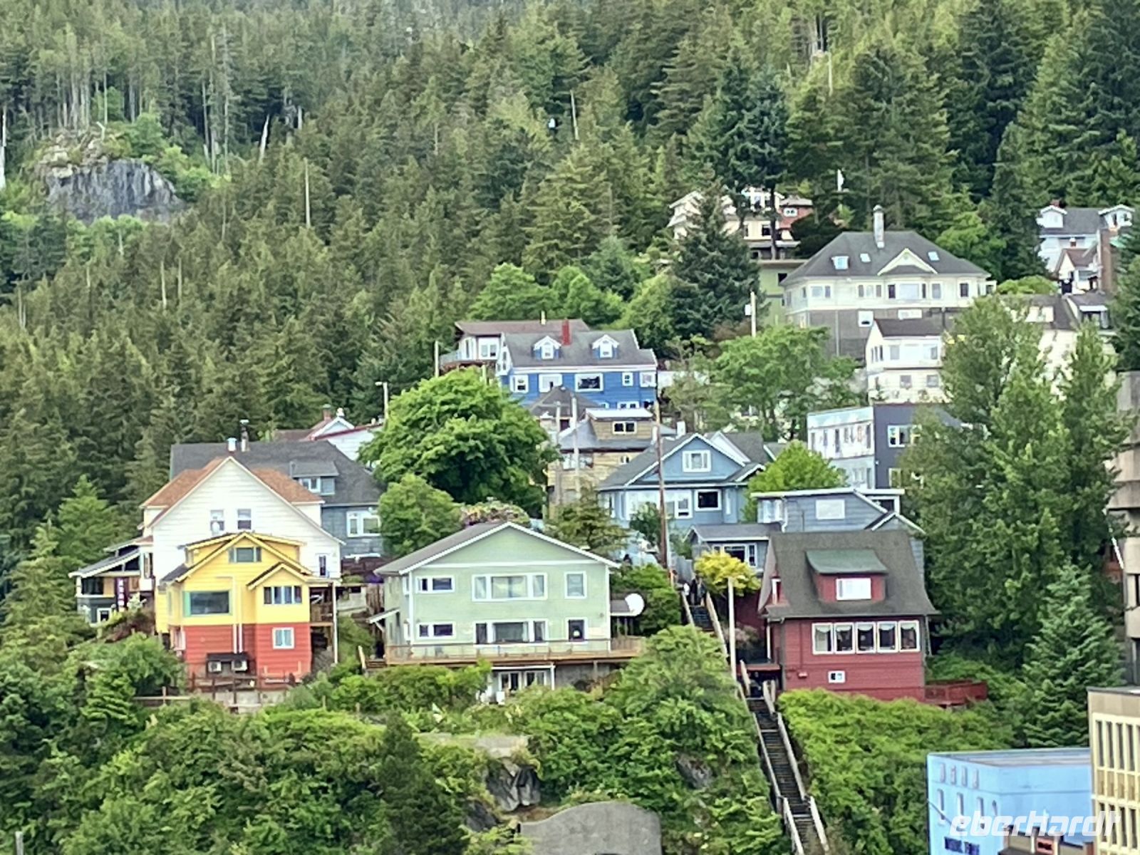 Fruehstueck in Ketchikan, Alaska. Die Sonne scheint hinter den Wolken die leicht beleuchteten, bunten Haeuser dieser Kleinstadt sind aeusserst pitoresk. Hier regnet es 1000 mml pro Jahr und wir sind hier im Trockenen geankert, also fuehlen wir uns bereits verwoehnt. Bitte heute die Regenbekleidung mitnehmen auf die Ausfluege, heisst es in der Broschuere, also haben wir wieder alles dabei. Nach der laengeren Fruehstuecksbesprechung und den Tips fuer Ketchikan sind wir alle bereit an den verschiedenen Ausfluegen teilzuhaben. Wir haben alle verschiedene Ausfluege gebucht, ein Grueppchen hat sich fuer einen Ausflug zum Indianerdorf "Saxman" entschlossen, vereinzelt gehen andere auf Walbeobachtung in den Misty Fjord und beobachten dabei auch Baeren. Andere wieder haben sich fuer eine Erkundungs-Wanderung im Regenwald mit Adler Reha Klinik Besuch gemeldet. Die Staedtchenfuehrung und der Gang zum Museum ist dann wieder fuer alle organisiert. Der Ausflug zu Saxman Village ist auch sehr interessant da uns die Tlingit Nation in ihre Taenze einfuehrt und uns auch eine kurze Tanz und Gesangs-Vorstellung bietet. Einige Taenzer sind kaum zu sehen in ihren roten, mit Muscheln bestickter Roben, da sie zwischen 2 und 6 Jahre alt sind und zwischen den Beinen der aelteren Buben, Maenner, Maedchen und Frauen ganz fuer sich alleine tanzen. Totem heissen ja nun Geschichtserzaehlende Pfaehle und davon gibt es in dem Dorf auch sehr viele. Der enthusiastische Fuehrer erzaehlt auch ein paar ulkige Geschichten. Ach ja, die Holzfaeller-Show ! Eine echt amerikanische Gaudi. Zwei Teams kaempfen im Axt schiessen, Baum-rollen, Saegen und Baeume kraxeln gegen einander an und das Publikum feuert die "Waldarbeiter" mit Begeisterung an. So haben alle sehr viel Spass an Land, freuen uns aber auch wieder in unseres Kreuzschiff zurueckzukehren. Im Misty Fjord war heute nicht sehr viel los, es hat sich ein Wal und ein Baer gezeigt und eine tolle Umgebung hat die rasante Bootsfahrt verschoenert. Der Regenwald Besuch war sehr interessant und wir haben wieder vieles ueber die hiesige Natur gelernt. Auch auf diesem Ausflug haben wir einen Bearen, viele Weisskopfadler gesehen. Die Geschichte eines Totems erklaert uns wie die Fischernetze ins Leben gerufen wurden. Nach diesen Ausfluegen treffen wir uns wieder, um Creek Street zu besuchen und kurz in das schoene kleine Museum der Ersten Nationen gehen. Nun habe wir uns alle aber einen schoenen Cocktail verdient vor dem gediegenen Abendessen. Danach gibt es wieder eine tolle Show mit Laser und Xylophon was sehr amuesant ist. Morgen ist ein See-Tag, also geniessen wir das Bordleben in vollen Zuegen.