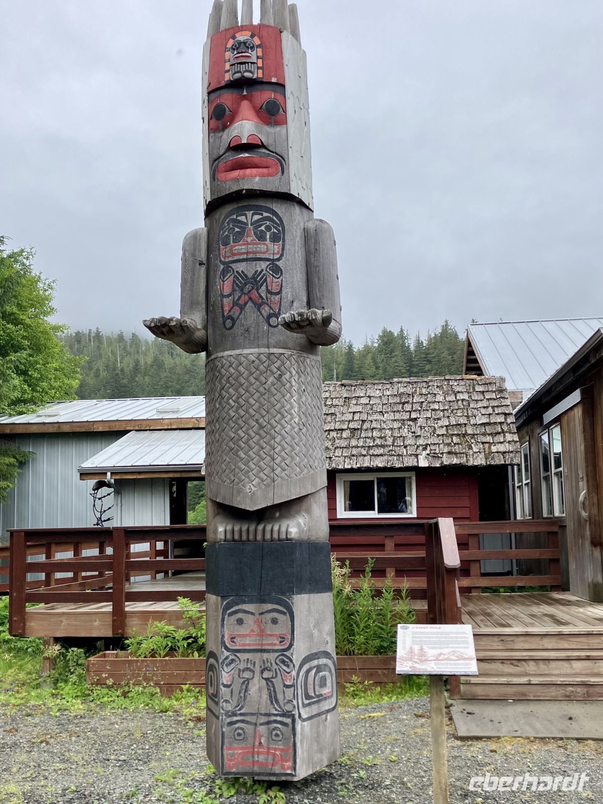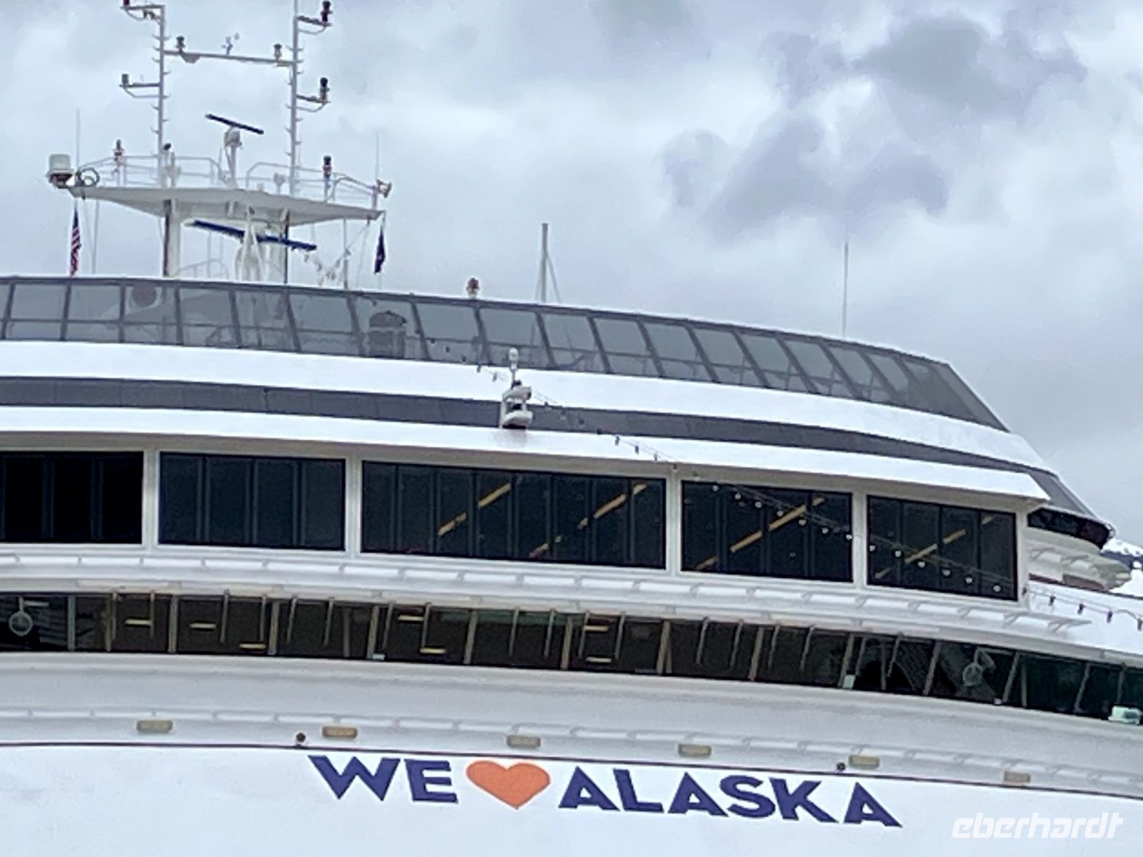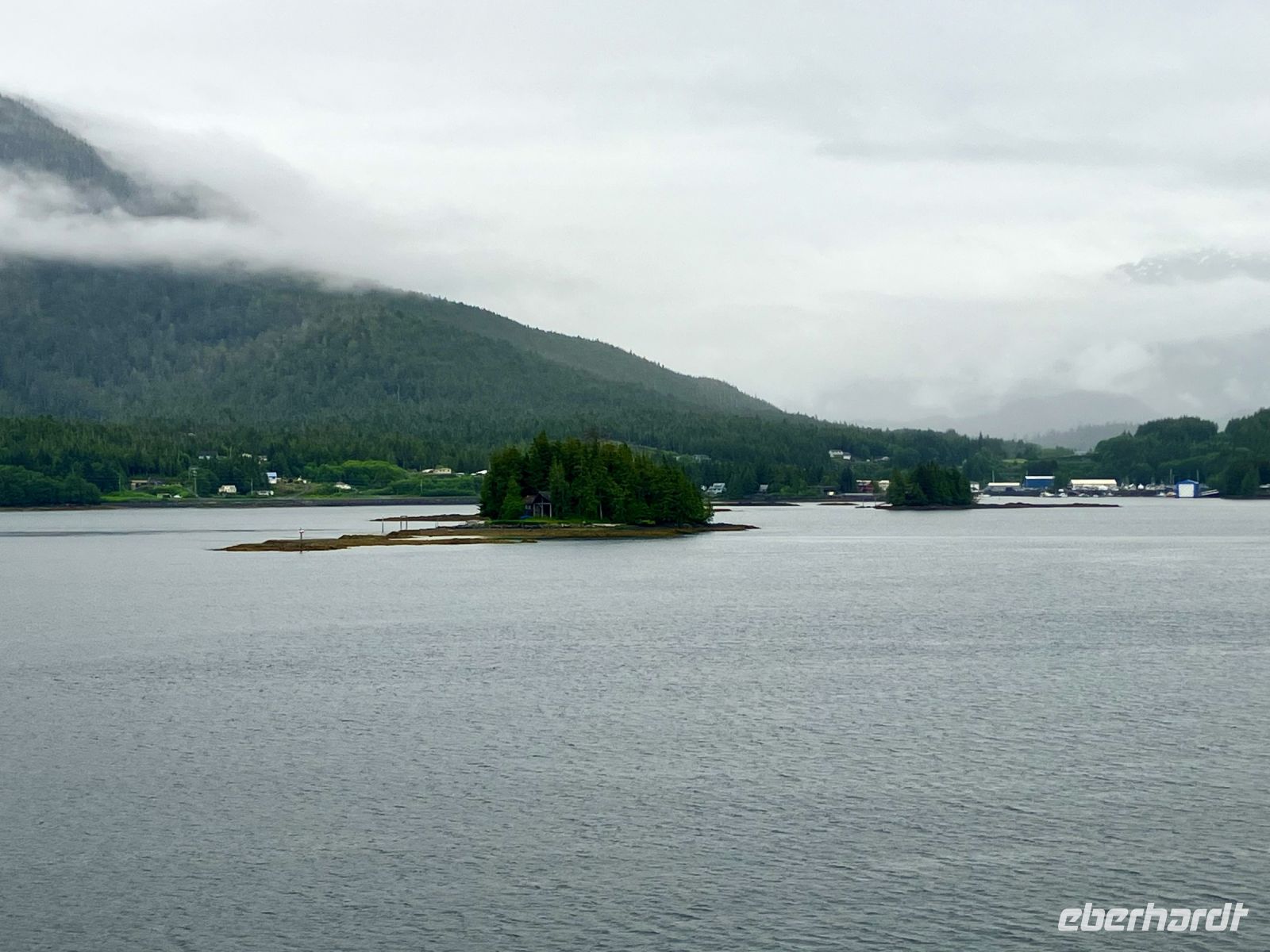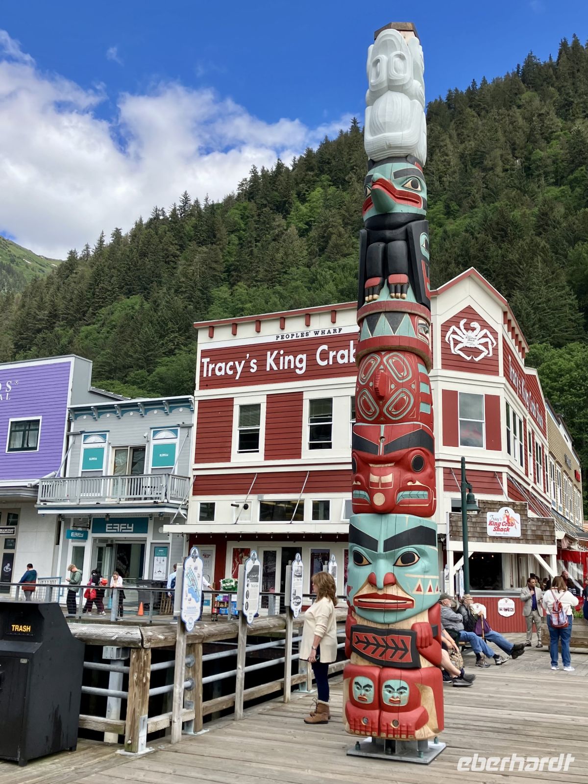 Fruehstueck in Ketchikan, Alaska. Die Sonne scheint hinter den Wolken die leicht beleuchteten, bunten Haeuser dieser Kleinstadt sind aeusserst pitoresk. Hier regnet es 1000 mml pro Jahr und wir sind hier im Trockenen geankert, also fuehlen wir uns bereits verwoehnt. Bitte heute die Regenbekleidung mitnehmen auf die Ausfluege, heisst es in der Broschuere, also haben wir wieder alles dabei. Nach der laengeren Fruehstuecksbesprechung und den Tips fuer Ketchikan sind wir alle bereit an den verschiedenen Ausfluegen teilzuhaben. Wir haben alle verschiedene Ausfluege gebucht, ein Grueppchen hat sich fuer einen Ausflug zum Indianerdorf "Saxman" entschlossen, vereinzelt gehen andere auf Walbeobachtung in den Misty Fjord und beobachten dabei auch Baeren. Andere wieder haben sich fuer eine Erkundungs-Wanderung im Regenwald mit Adler Reha Klinik Besuch gemeldet. Die Staedtchenfuehrung und der Gang zum Museum ist dann wieder fuer alle organisiert. Der Ausflug zu Saxman Village ist auch sehr interessant da uns die Tlingit Nation in ihre Taenze einfuehrt und uns auch eine kurze Tanz und Gesangs-Vorstellung bietet. Einige Taenzer sind kaum zu sehen in ihren roten, mit Muscheln bestickter Roben, da sie zwischen 2 und 6 Jahre alt sind und zwischen den Beinen der aelteren Buben, Maenner, Maedchen und Frauen ganz fuer sich alleine tanzen. Totem heissen ja nun Geschichtserzaehlende Pfaehle und davon gibt es in dem Dorf auch sehr viele. Der enthusiastische Fuehrer erzaehlt auch ein paar ulkige Geschichten. Ach ja, die Holzfaeller-Show ! Eine echt amerikanische Gaudi. Zwei Teams kaempfen im Axt schiessen, Baum-rollen, Saegen und Baeume kraxeln gegen einander an und das Publikum feuert die "Waldarbeiter" mit Begeisterung an. So haben alle sehr viel Spass an Land, freuen uns aber auch wieder in unseres Kreuzschiff zurueckzukehren. Im Misty Fjord war heute nicht sehr viel los, es hat sich ein Wal und ein Baer gezeigt und eine tolle Umgebung hat die rasante Bootsfahrt verschoenert. Der Regenwald Besuch war sehr interessant und wir haben wieder vieles ueber die hiesige Natur gelernt. Auch auf diesem Ausflug haben wir einen Bearen, viele Weisskopfadler gesehen. Die Geschichte eines Totems erklaert uns wie die Fischernetze ins Leben gerufen wurden. Nach diesen Ausfluegen treffen wir uns wieder, um Creek Street zu besuchen und kurz in das schoene kleine Museum der Ersten Nationen gehen. Nun habe wir uns alle aber einen schoenen Cocktail verdient vor dem gediegenen Abendessen. Danach gibt es wieder eine tolle Show mit Laser und Xylophon was sehr amuesant ist. Morgen ist ein See-Tag, also geniessen wir das Bordleben in vollen Zuegen.