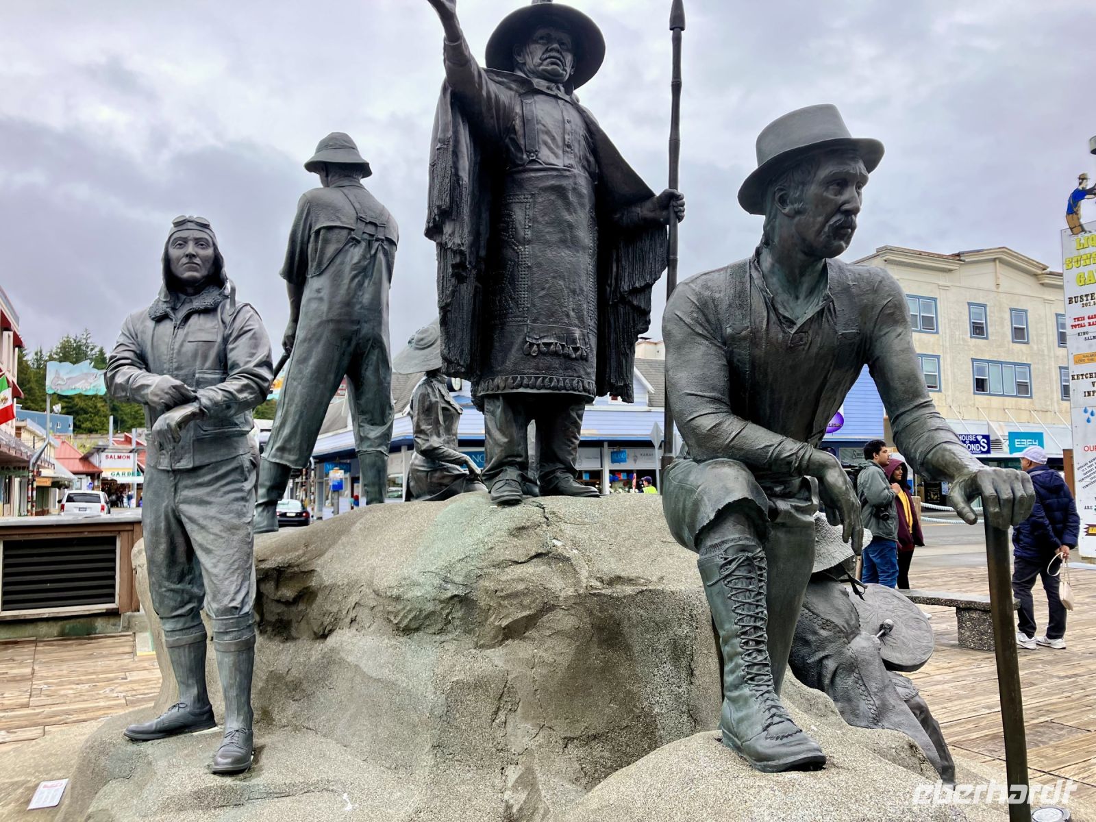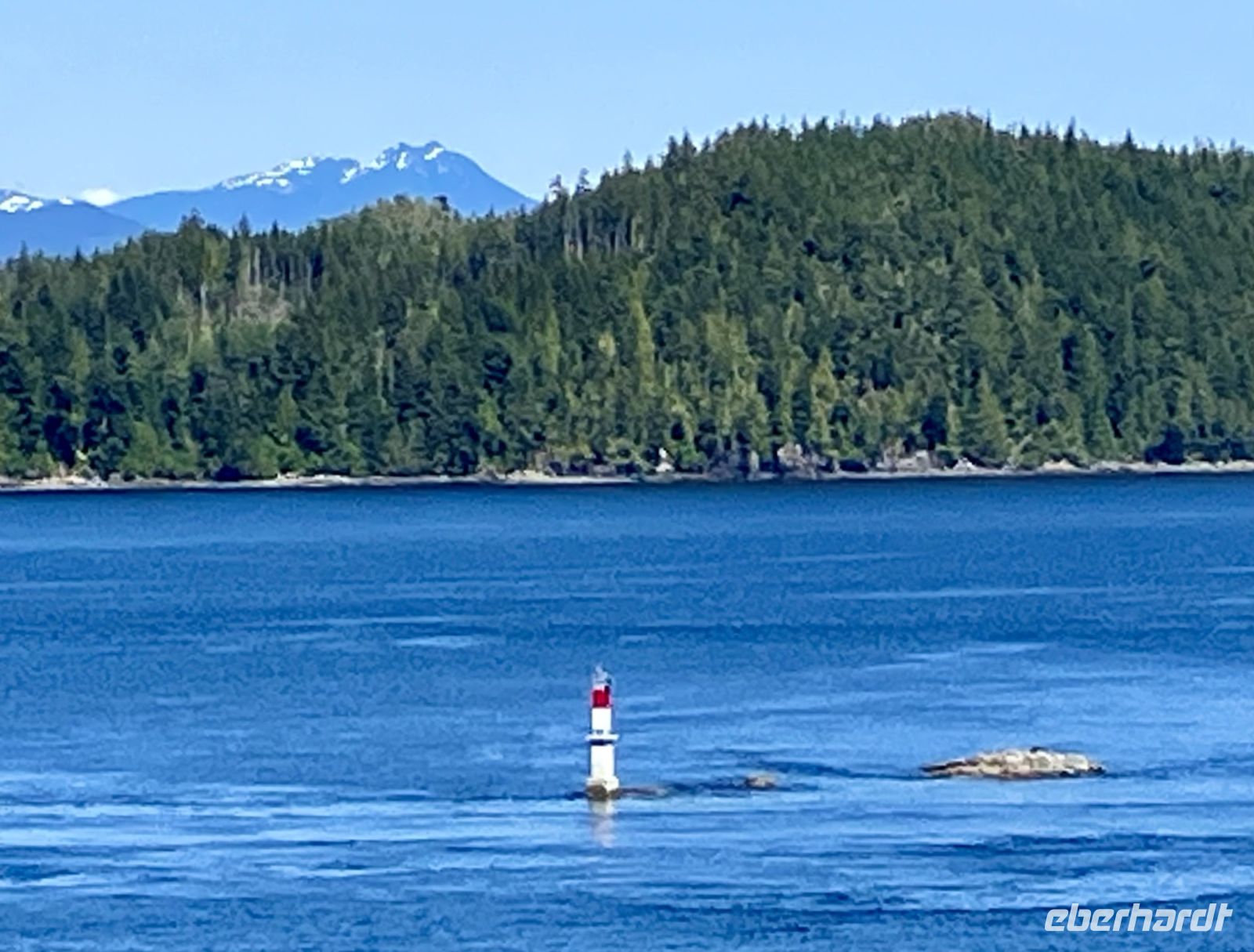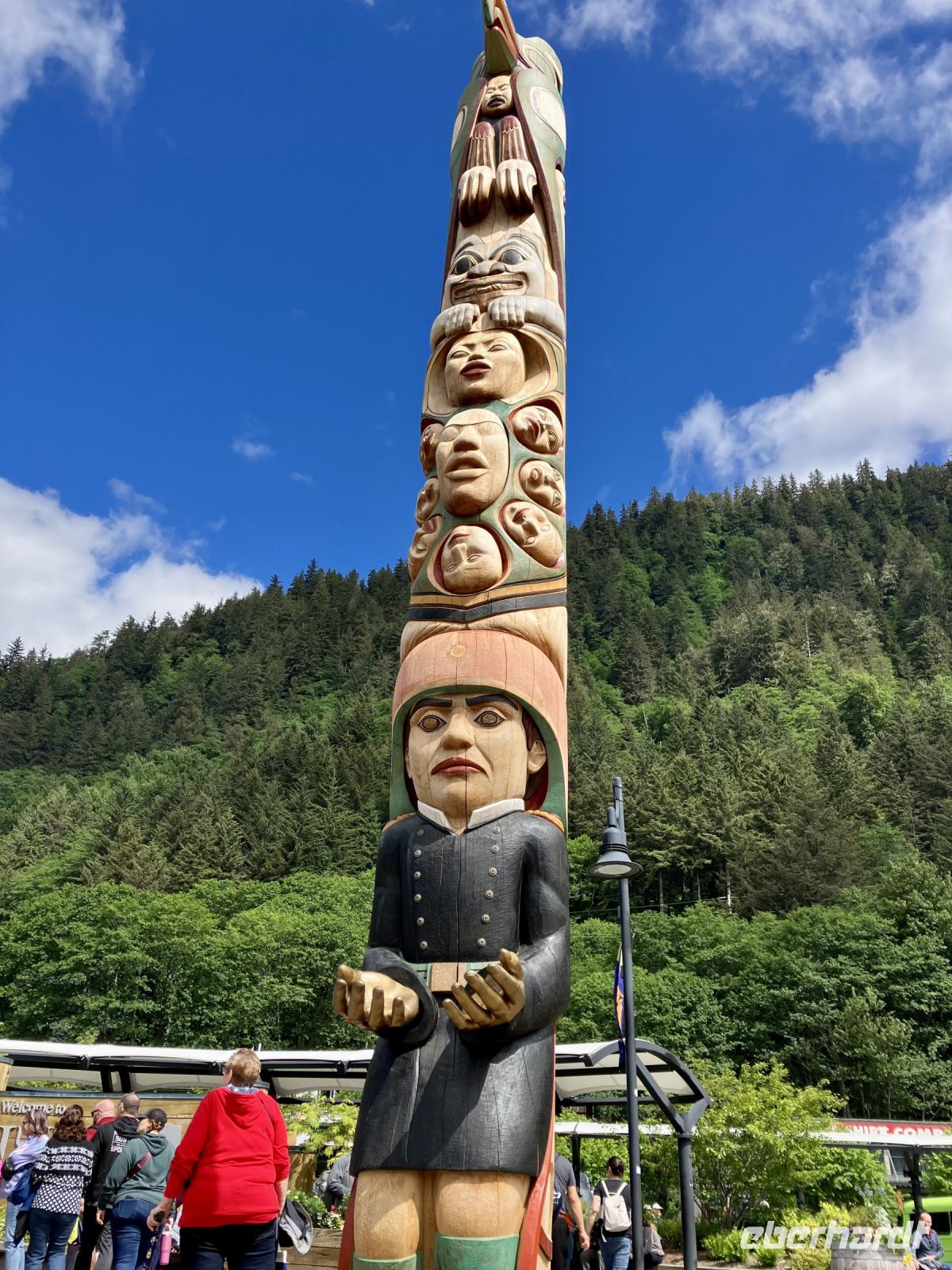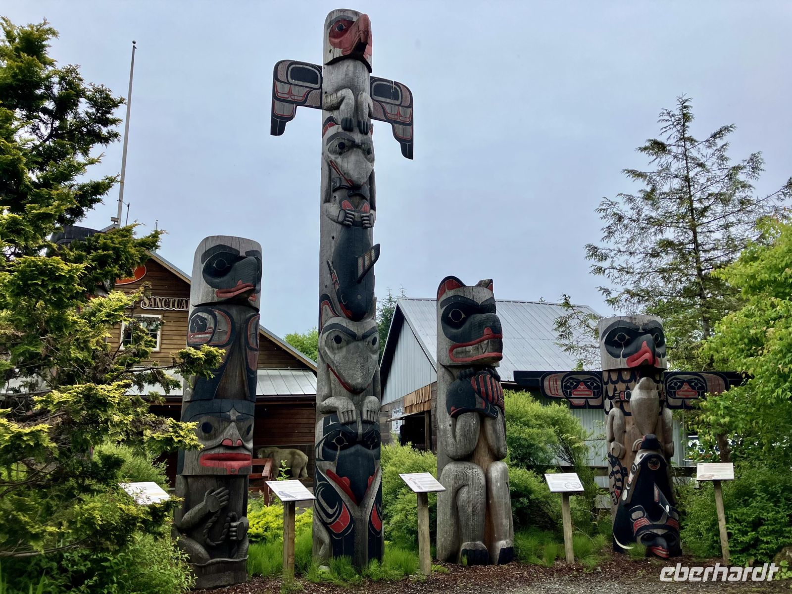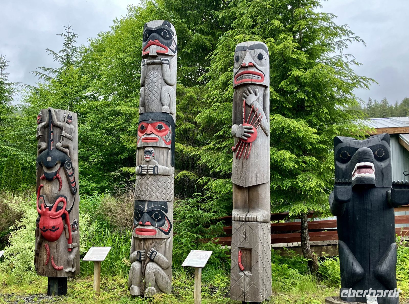 Fruehstueck in Ketchikan, Alaska. Die Sonne scheint hinter den Wolken die leicht beleuchteten, bunten Haeuser dieser Kleinstadt sind aeusserst pitoresk. Hier regnet es 1000 mml pro Jahr und wir sind hier im Trockenen geankert, also fuehlen wir uns bereits verwoehnt. Bitte heute die Regenbekleidung mitnehmen auf die Ausfluege, heisst es in der Broschuere, also haben wir wieder alles dabei. Nach der laengeren Fruehstuecksbesprechung und den Tips fuer Ketchikan sind wir alle bereit an den verschiedenen Ausfluegen teilzuhaben. Wir haben alle verschiedene Ausfluege gebucht, ein Grueppchen hat sich fuer einen Ausflug zum Indianerdorf "Saxman" entschlossen, vereinzelt gehen andere auf Walbeobachtung in den Misty Fjord und beobachten dabei auch Baeren. Andere wieder haben sich fuer eine Erkundungs-Wanderung im Regenwald mit Adler Reha Klinik Besuch gemeldet. Die Staedtchenfuehrung und der Gang zum Museum ist dann wieder fuer alle organisiert. Der Ausflug zu Saxman Village ist auch sehr interessant da uns die Tlingit Nation in ihre Taenze einfuehrt und uns auch eine kurze Tanz und Gesangs-Vorstellung bietet. Einige Taenzer sind kaum zu sehen in ihren roten, mit Muscheln bestickter Roben, da sie zwischen 2 und 6 Jahre alt sind und zwischen den Beinen der aelteren Buben, Maenner, Maedchen und Frauen ganz fuer sich alleine tanzen. Totem heissen ja nun Geschichtserzaehlende Pfaehle und davon gibt es in dem Dorf auch sehr viele. Der enthusiastische Fuehrer erzaehlt auch ein paar ulkige Geschichten. Ach ja, die Holzfaeller-Show ! Eine echt amerikanische Gaudi. Zwei Teams kaempfen im Axt schiessen, Baum-rollen, Saegen und Baeume kraxeln gegen einander an und das Publikum feuert die "Waldarbeiter" mit Begeisterung an. So haben alle sehr viel Spass an Land, freuen uns aber auch wieder in unseres Kreuzschiff zurueckzukehren. Im Misty Fjord war heute nicht sehr viel los, es hat sich ein Wal und ein Baer gezeigt und eine tolle Umgebung hat die rasante Bootsfahrt verschoenert. Der Regenwald Besuch war sehr interessant und wir haben wieder vieles ueber die hiesige Natur gelernt. Auch auf diesem Ausflug haben wir einen Bearen, viele Weisskopfadler gesehen. Die Geschichte eines Totems erklaert uns wie die Fischernetze ins Leben gerufen wurden. Nach diesen Ausfluegen treffen wir uns wieder, um Creek Street zu besuchen und kurz in das schoene kleine Museum der Ersten Nationen gehen. Nun habe wir uns alle aber einen schoenen Cocktail verdient vor dem gediegenen Abendessen. Danach gibt es wieder eine tolle Show mit Laser und Xylophon was sehr amuesant ist. Morgen ist ein See-Tag, also geniessen wir das Bordleben in vollen Zuegen.