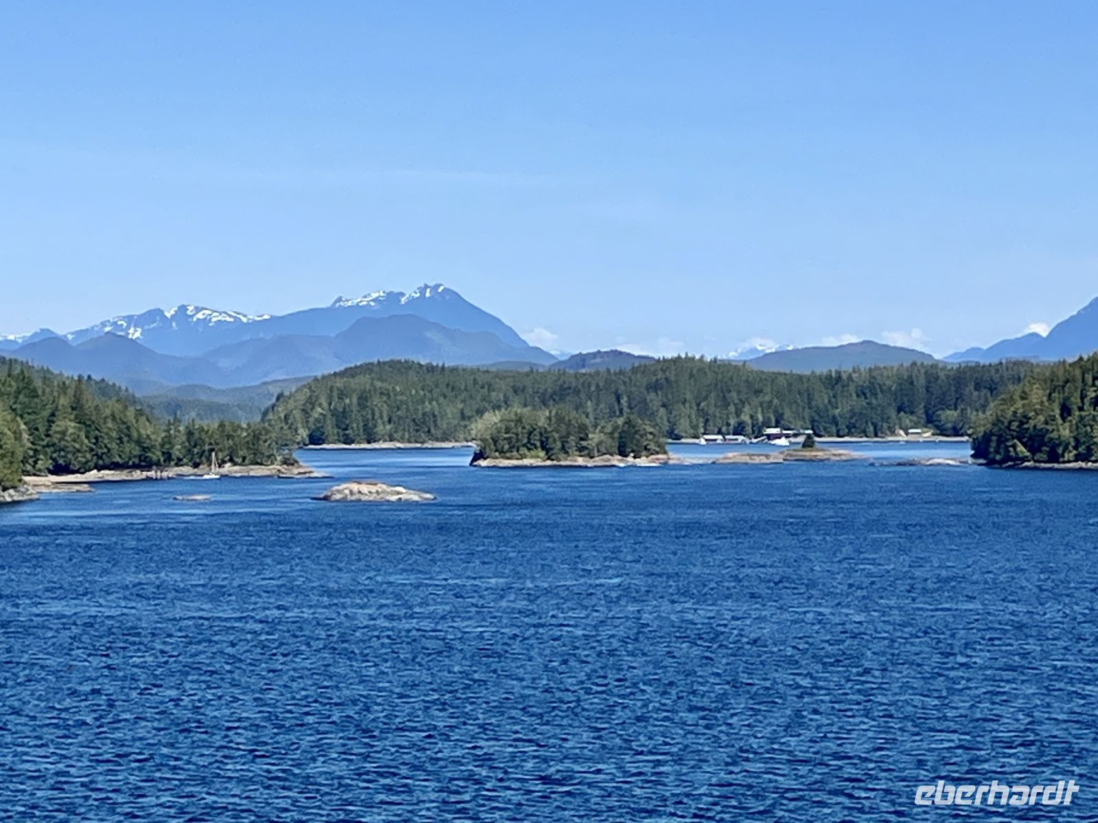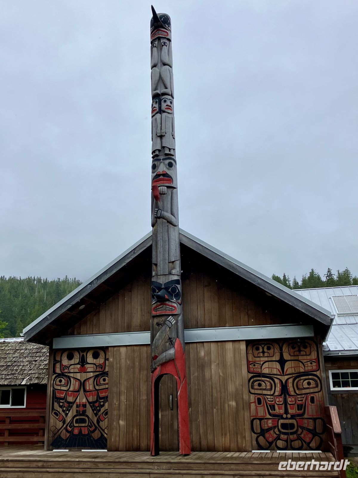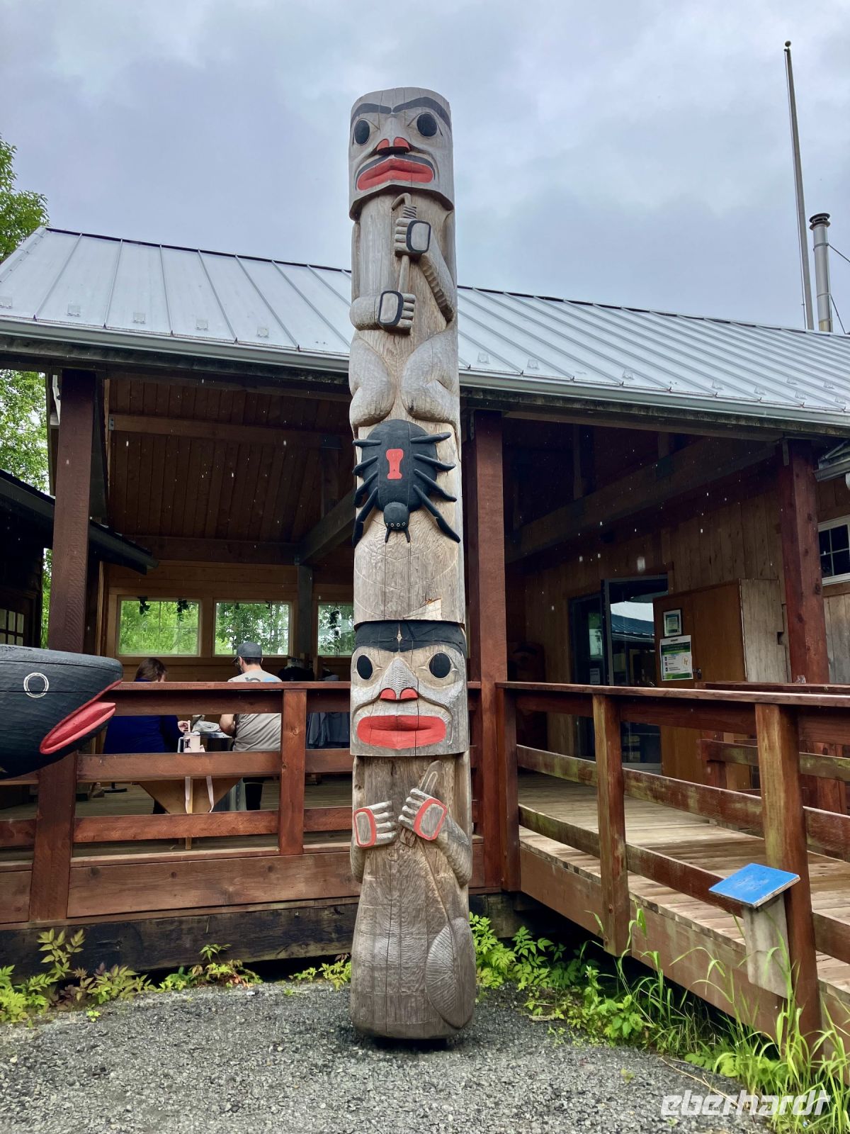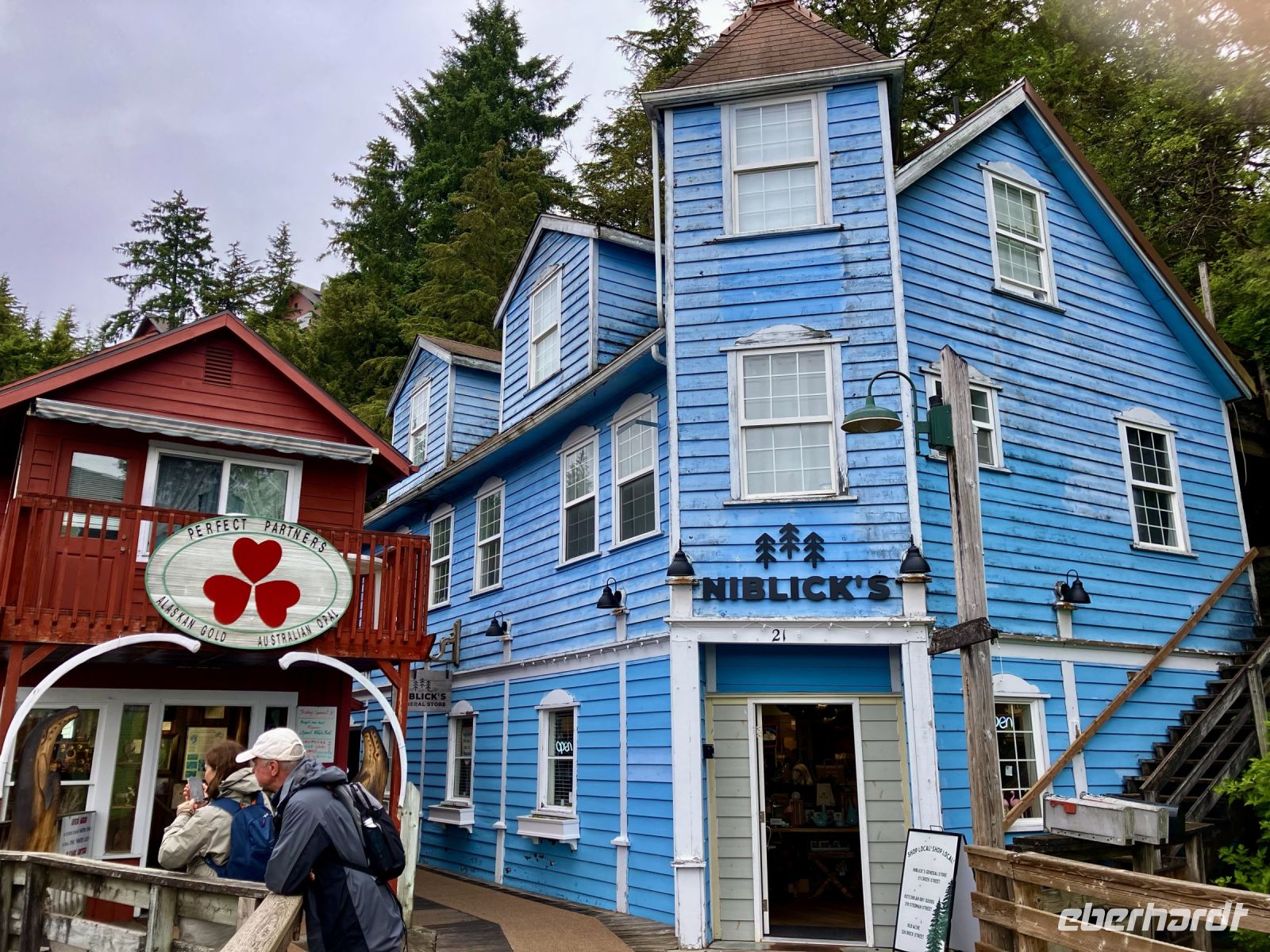Fruehstueck in Ketchikan, Alaska. Die Sonne scheint hinter den Wolken die leicht beleuchteten, bunten Haeuser dieser Kleinstadt sind aeusserst pitoresk. Hier regnet es 1000 mml pro Jahr und wir sind hier im Trockenen geankert, also fuehlen wir uns bereits verwoehnt. Bitte heute die Regenbekleidung mitnehmen auf die Ausfluege, heisst es in der Broschuere, also haben wir wieder alles dabei. Nach der laengeren Fruehstuecksbesprechung und den Tips fuer Ketchikan sind wir alle bereit an den verschiedenen Ausfluegen teilzuhaben. Wir haben alle verschiedene Ausfluege gebucht, ein Grueppchen hat sich fuer einen Ausflug zum Indianerdorf "Saxman" entschlossen, vereinzelt gehen andere auf Walbeobachtung in den Misty Fjord und beobachten dabei auch Baeren. Andere wieder haben sich fuer eine Erkundungs-Wanderung im Regenwald mit Adler Reha Klinik Besuch gemeldet. Die Staedtchenfuehrung und der Gang zum Museum ist dann wieder fuer alle organisiert. Der Ausflug zu Saxman Village ist auch sehr interessant da uns die Tlingit Nation in ihre Taenze einfuehrt und uns auch eine kurze Tanz und Gesangs-Vorstellung bietet. Einige Taenzer sind kaum zu sehen in ihren roten, mit Muscheln bestickter Roben, da sie zwischen 2 und 6 Jahre alt sind und zwischen den Beinen der aelteren Buben, Maenner, Maedchen und Frauen ganz fuer sich alleine tanzen. Totem heissen ja nun Geschichtserzaehlende Pfaehle und davon gibt es in dem Dorf auch sehr viele. Der enthusiastische Fuehrer erzaehlt auch ein paar ulkige Geschichten. Ach ja, die Holzfaeller-Show ! Eine echt amerikanische Gaudi. Zwei Teams kaempfen im Axt schiessen, Baum-rollen, Saegen und Baeume kraxeln gegen einander an und das Publikum feuert die "Waldarbeiter" mit Begeisterung an. So haben alle sehr viel Spass an Land, freuen uns aber auch wieder in unseres Kreuzschiff zurueckzukehren. Im Misty Fjord war heute nicht sehr viel los, es hat sich ein Wal und ein Baer gezeigt und eine tolle Umgebung hat die rasante Bootsfahrt verschoenert. Der Regenwald Besuch war sehr interessant und wir haben wieder vieles ueber die hiesige Natur gelernt. Auch auf diesem Ausflug haben wir einen Bearen, viele Weisskopfadler gesehen. Die Geschichte eines Totems erklaert uns wie die Fischernetze ins Leben gerufen wurden. Nach diesen Ausfluegen treffen wir uns wieder, um Creek Street zu besuchen und kurz in das schoene kleine Museum der Ersten Nationen gehen. Nun habe wir uns alle aber einen schoenen Cocktail verdient vor dem gediegenen Abendessen. Danach gibt es wieder eine tolle Show mit Laser und Xylophon was sehr amuesant ist. Morgen ist ein See-Tag, also geniessen wir das Bordleben in vollen Zuegen.