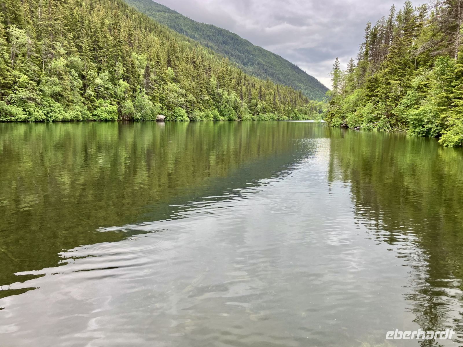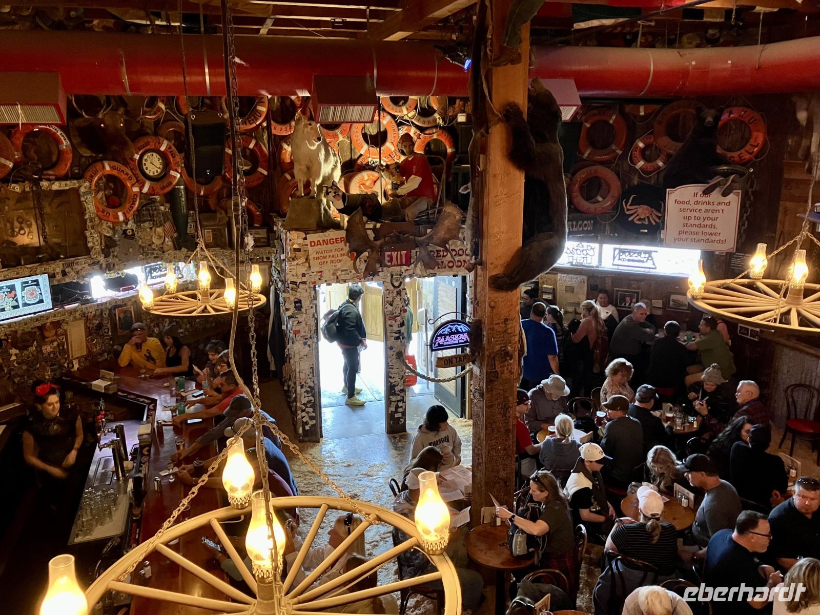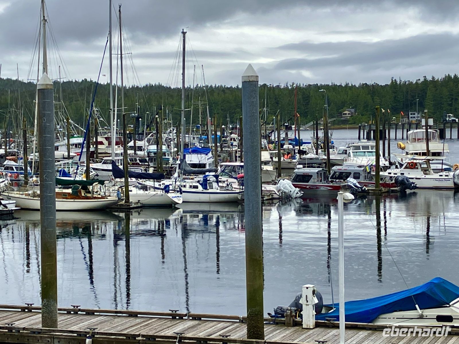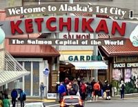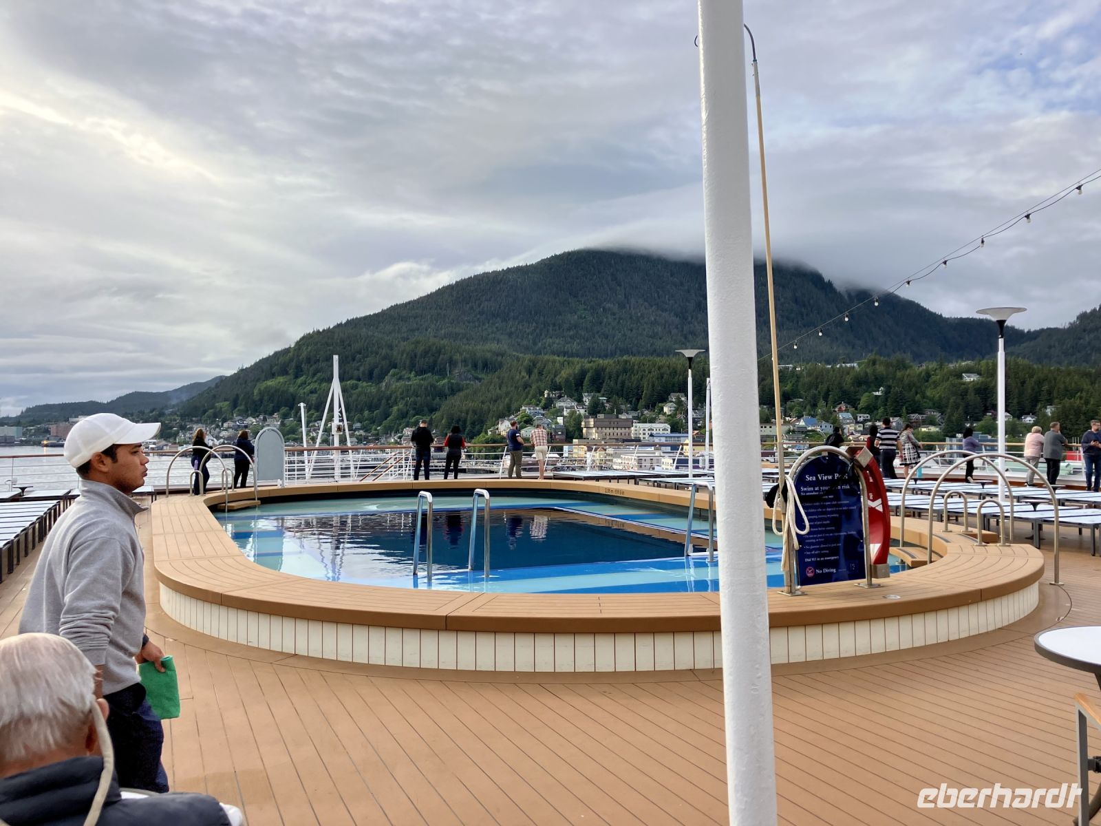Fruehstueck in Ketchikan, Alaska. Die Sonne scheint hinter den Wolken die leicht beleuchteten, bunten Haeuser dieser Kleinstadt sind aeusserst pitoresk. Hier regnet es 1000 mml pro Jahr und wir sind hier im Trockenen geankert, also fuehlen wir uns bereits verwoehnt. Bitte heute die Regenbekleidung mitnehmen auf die Ausfluege, heisst es in der Broschuere, also haben wir wieder alles dabei. Nach der laengeren Fruehstuecksbesprechung und den Tips fuer Ketchikan sind wir alle bereit an den verschiedenen Ausfluegen teilzuhaben. Wir haben alle verschiedene Ausfluege gebucht, ein Grueppchen hat sich fuer einen Ausflug zum Indianerdorf "Saxman" entschlossen, vereinzelt gehen andere auf Walbeobachtung in den Misty Fjord und beobachten dabei auch Baeren. Andere wieder haben sich fuer eine Erkundungs-Wanderung im Regenwald mit Adler Reha Klinik Besuch gemeldet. Die Staedtchenfuehrung und der Gang zum Museum ist dann wieder fuer alle organisiert. Der Ausflug zu Saxman Village ist auch sehr interessant da uns die Tlingit Nation in ihre Taenze einfuehrt und uns auch eine kurze Tanz und Gesangs-Vorstellung bietet. Einige Taenzer sind kaum zu sehen in ihren roten, mit Muscheln bestickter Roben, da sie zwischen 2 und 6 Jahre alt sind und zwischen den Beinen der aelteren Buben, Maenner, Maedchen und Frauen ganz fuer sich alleine tanzen. Totem heissen ja nun Geschichtserzaehlende Pfaehle und davon gibt es in dem Dorf auch sehr viele. Der enthusiastische Fuehrer erzaehlt auch ein paar ulkige Geschichten. Ach ja, die Holzfaeller-Show ! Eine echt amerikanische Gaudi. Zwei Teams kaempfen im Axt schiessen, Baum-rollen, Saegen und Baeume kraxeln gegen einander an und das Publikum feuert die "Waldarbeiter" mit Begeisterung an. So haben alle sehr viel Spass an Land, freuen uns aber auch wieder in unseres Kreuzschiff zurueckzukehren. Im Misty Fjord war heute nicht sehr viel los, es hat sich ein Wal und ein Baer gezeigt und eine tolle Umgebung hat die rasante Bootsfahrt verschoenert. Der Regenwald Besuch war sehr interessant und wir haben wieder vieles ueber die hiesige Natur gelernt. Auch auf diesem Ausflug haben wir einen Bearen, viele Weisskopfadler gesehen. Die Geschichte eines Totems erklaert uns wie die Fischernetze ins Leben gerufen wurden. Nach diesen Ausfluegen treffen wir uns wieder, um Creek Street zu besuchen und kurz in das schoene kleine Museum der Ersten Nationen gehen. Nun habe wir uns alle aber einen schoenen Cocktail verdient vor dem gediegenen Abendessen. Danach gibt es wieder eine tolle Show mit Laser und Xylophon was sehr amuesant ist. Morgen ist ein See-Tag, also geniessen wir das Bordleben in vollen Zuegen.