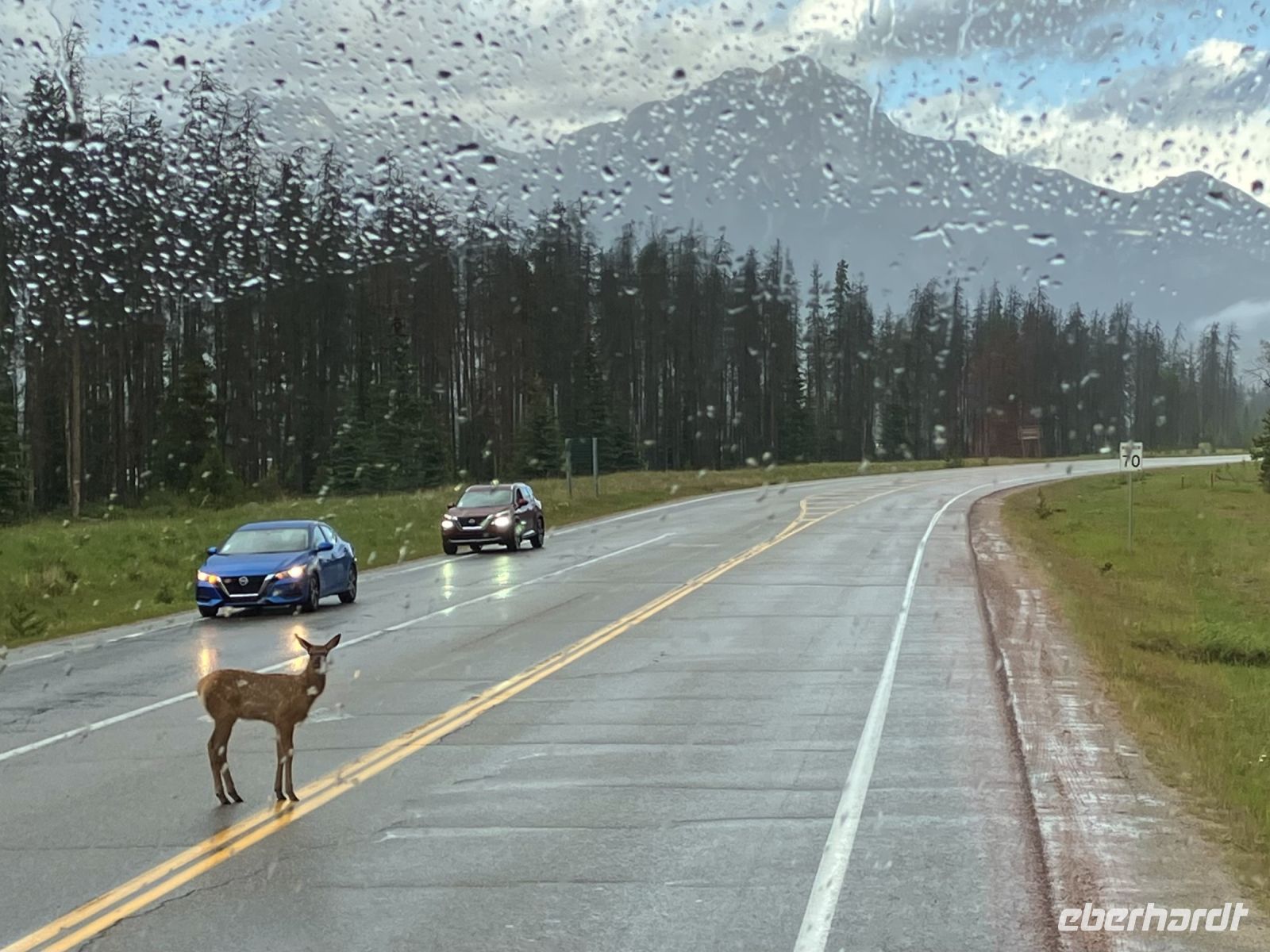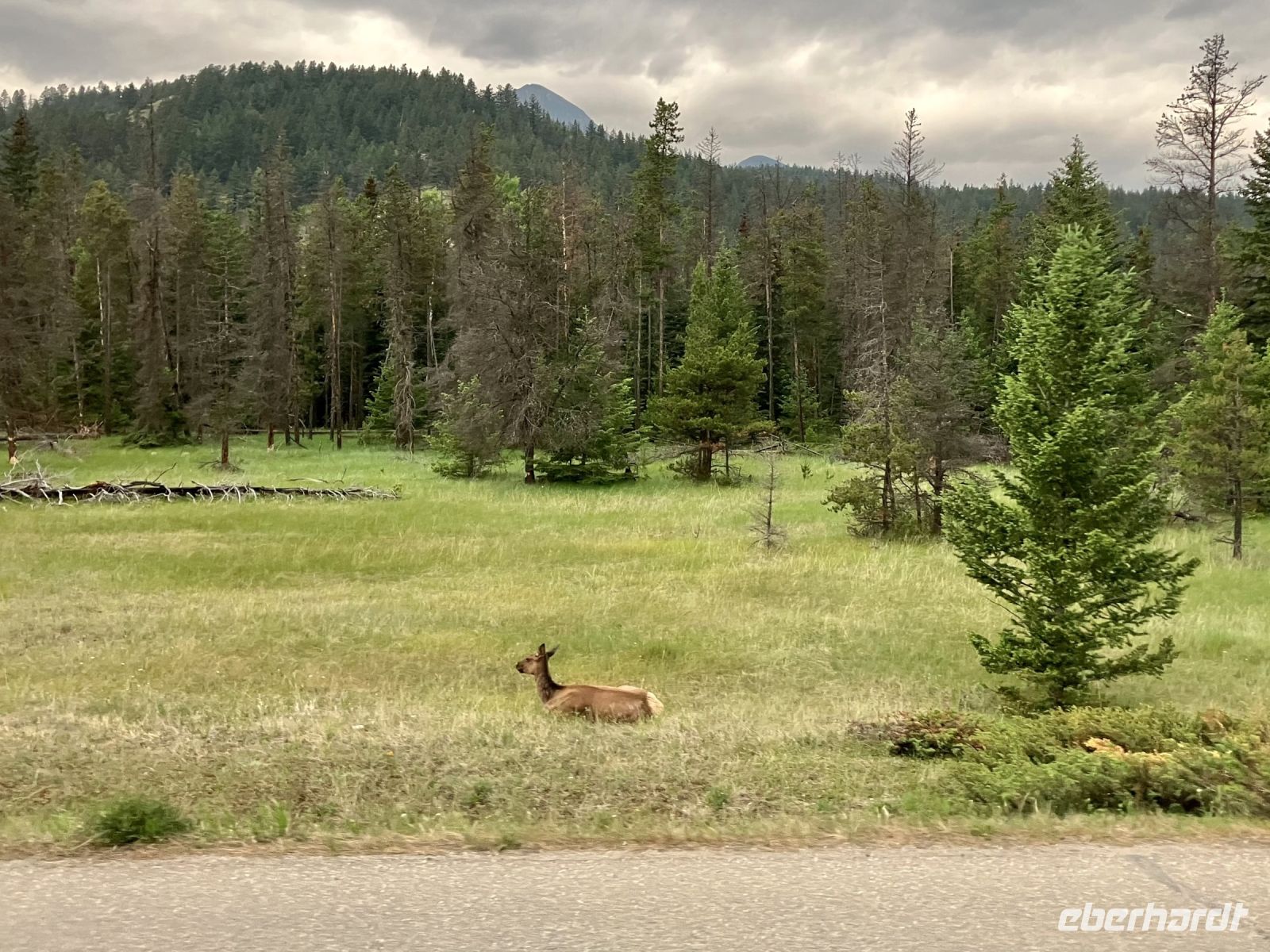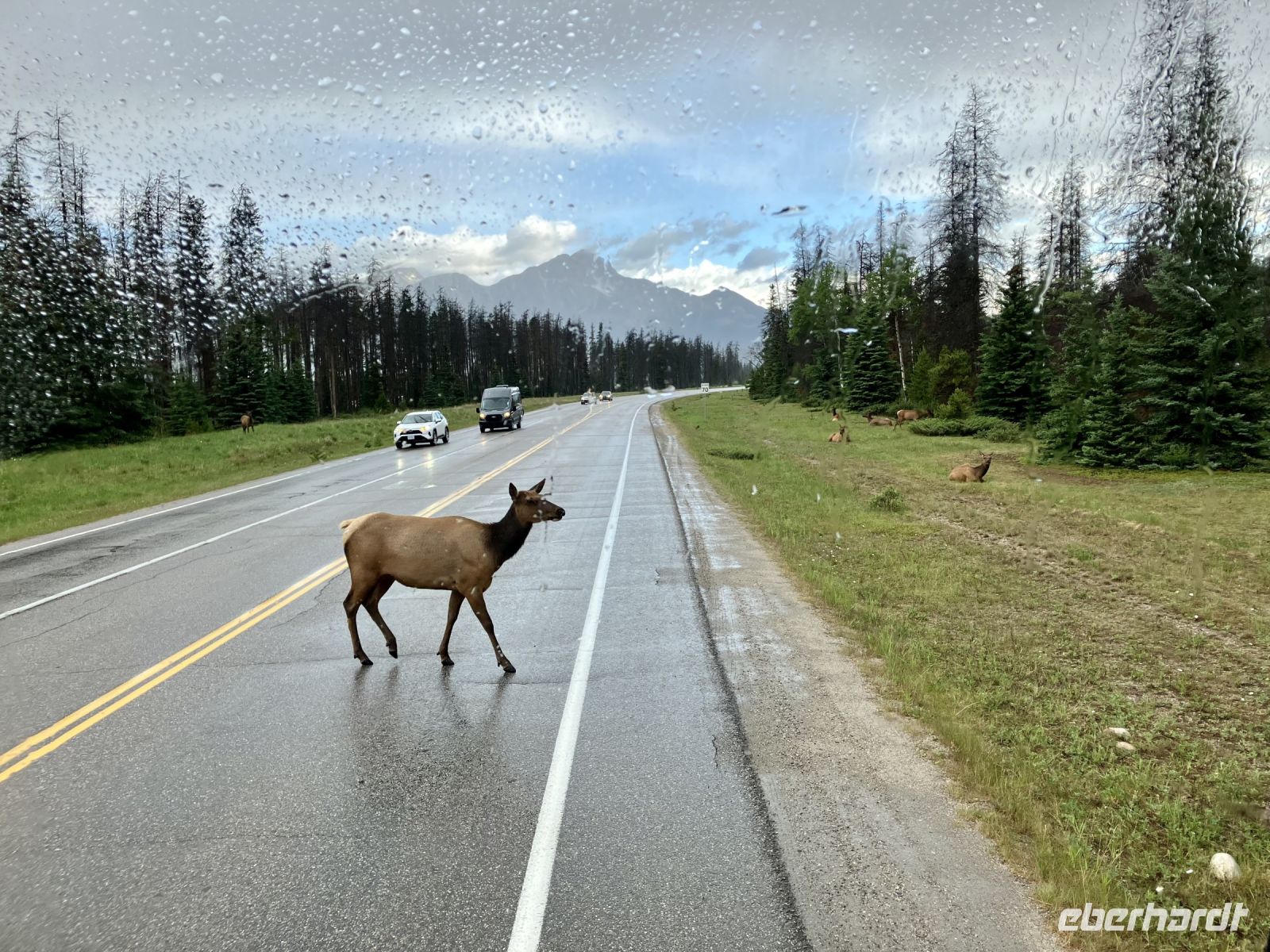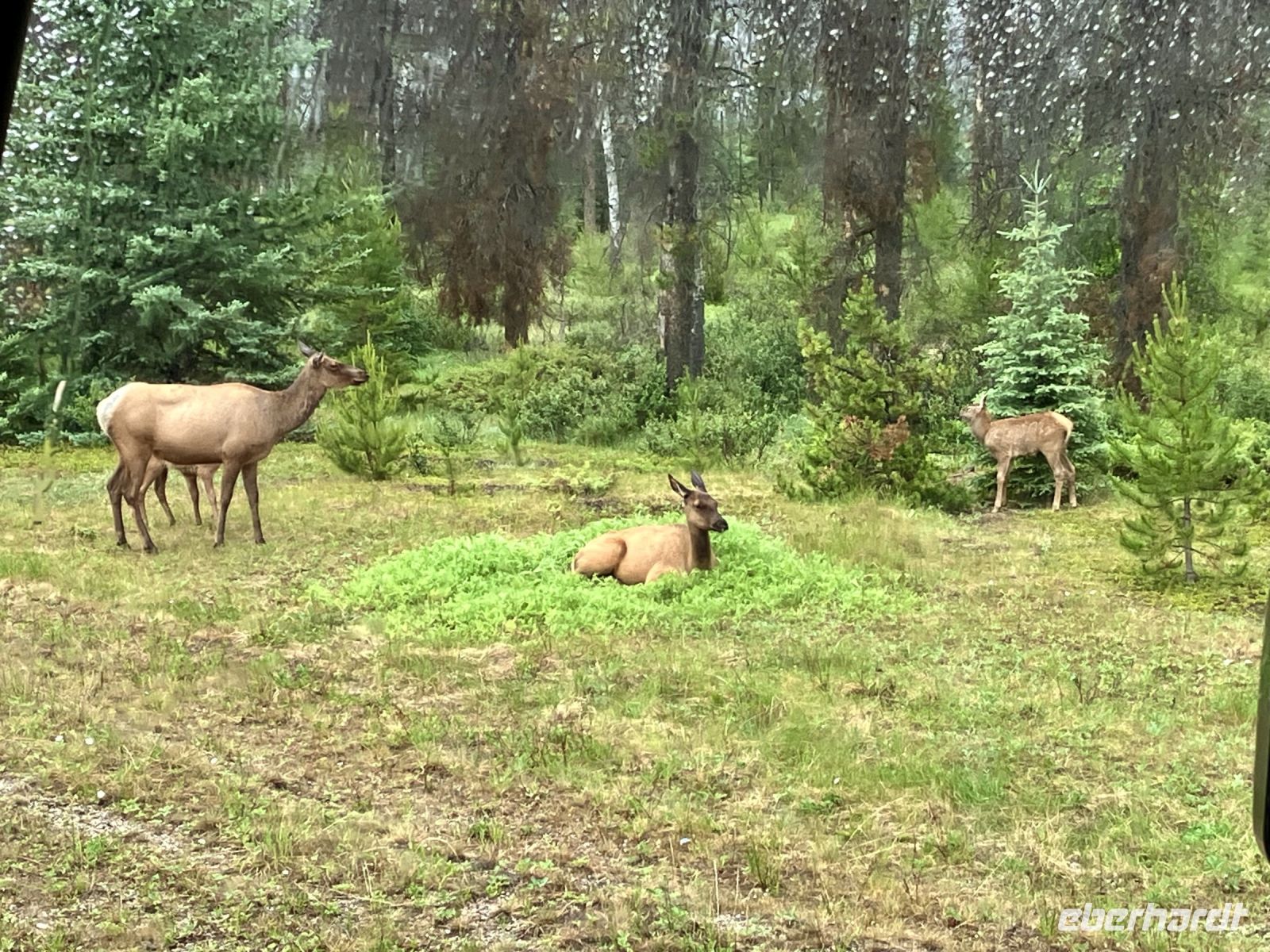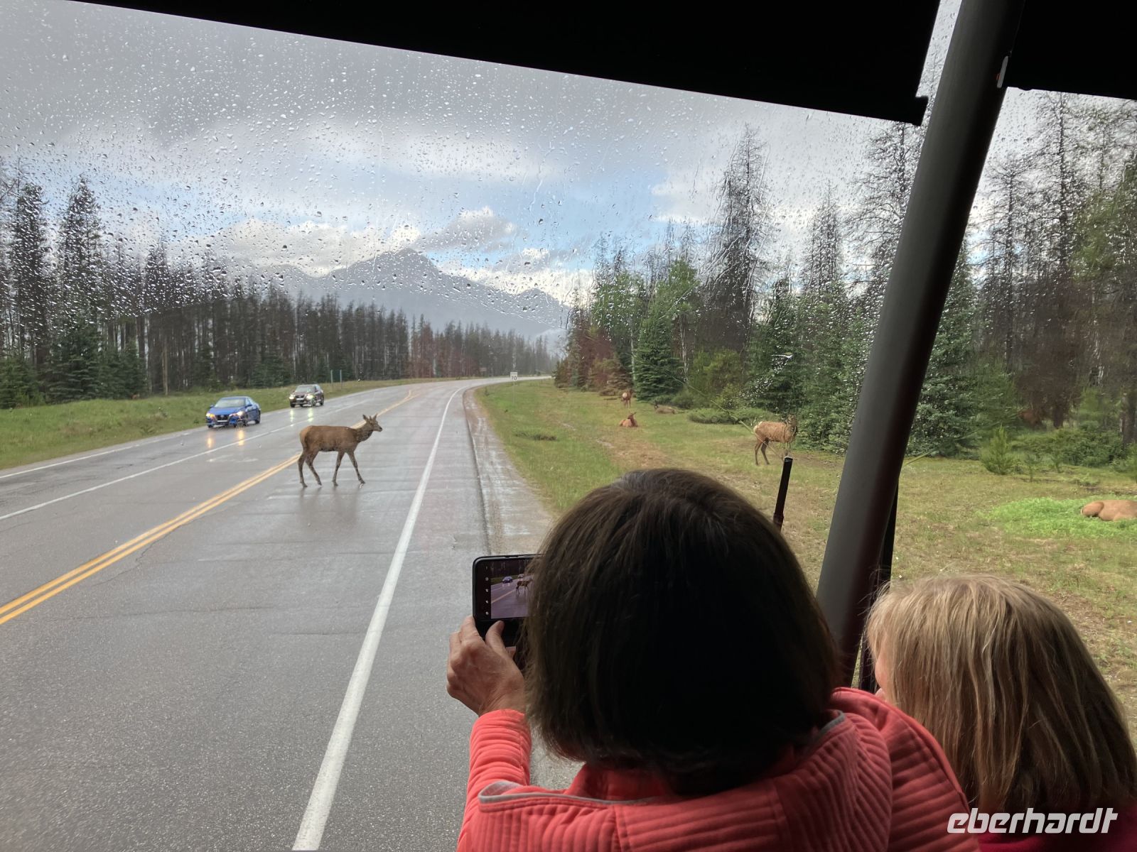 Die Nacht war kalt aber die schoen warmen Zudecken haben ihren Dienst gut geleistet. Frisch sehen wir uns alle wieder beim Fruehstuecksbuffet welches nur fuer uns hergerichtet ist. Heute fahren wir vorerst zu zwei kleineren Bergseen. Aber gleich schon beim Verlassen des Hotelareals auf der HWY sehen wir eine ganze Herde von Wapitidamen mit ihren Kids. Ploetzlich rennt auch ein gepunktetes Bambi ueber die Strasse, steht mitten drinnen stehen und schaut sich um. Alle Autos schauen gespannt dem Baby zu und es schaut angespannt wo denn auch die Mama bleibt. Ahhh da kommt sie ja, bleibt auch auf dem Mittelstreifen stehen schaut sich um, sieht dass alle Autos und Busse stehen, das Bambi kommt hungrig nahe und faengt auch an zu saeugen. Na sowas, die Kameras sind total im Stress denn niemand kann glauben was wir da gerade sehen. Das Schauspiel dauert etwa 3 Minuten, bis uns nicht ein Pickup ueberholt und die beiden Protagonisten von dem Buehnenbild verjagt. Wir werden diese Szene nie mehr vergessen. Nun ist es aber Zeit weiterzufahren wir wollen doch zu Patricia und Pyramid Lake. Beim ersten halten wir auch schnellstens an, denn das Wasser ist glatt, die Spiegelung perfekt und der schoene rote Pyramid Mountain hat sogar einen Wolken Schal um sich gewickelt. Nun schauen wir auch noch gleich ob die Habakuk Geschichte auch wahr sei. Ja, wir sehen die Fotos der Schiffswerft aus dem 2. Weltkrieg, eine unglaubliche Geschichte. Nach den vielen Fotos der Spiegelung gehts nun zu Pyramid Lake. Wir spazieren gemuetlich um die Insel und knipsen noch ein tolles Foto von uns fuer uns. Jetzt gehts aber weiter da wir heute noch viel vor haben. Uiii, da steht ja ein Baer mitten im Gebuesch, er knabbert was und graebt nach Wurzeln, wir koennen ihm zuschauen aber sehr fotogen ist er leider nicht. Unterwegs nach Clearwater halten wir bei der Grenze von Alberta-Britisch Kolumbien und stellen auch die Uhr eine Stunde zurueck. So verabschieden wir uns auch von den Rockies, fahren noch ein Stuendchen bis wir bei Mount Robson ankommen. Mit der Zeitverschiebung haben wir heute ein Spiel-Stunde dazubekommen. Das Mittagessen bei Mount Robson ist gut und der Mount Robson selbst zeigt sich zu ¾ was schon sehr schoen und besonders ist. Der 3954 Meter hohe Berg schliesst naemlich ein langes Tal ab und so ziert fast immer eine Wolkenkrone sein Haupt. Bei der Weiterfahrt verlassen wir nun den Fraser Fluss und fahren dem North Thompson River entlang. Ein Bierchen unterwegs beim wilden Larry in seinem Pub haelt uns bei Laune. Nicht dass wir das braeuchten, aber bitte. Dann heisst es bald mal Einchecken in Clearwater und das jeweilige niegel-nagel-neue Zimmer zu beziehen. Bloss noch 2 Sachen stehen auf Elisabeth’s heutigem Plan. Also gehts gleich wieder mit dem Bus ab auf eine 20 Minuetige Fahrt. Auf dem kurzen Wanderweg zu dem Spahat Wasserfall lernen wir einiges ueber den Wald. Wie erkenne ich Duglasien, wozu braucht man die Westliche Rote Zeder und wozu dient wohl eine Hemlock Tanne. Ach, hier ist eine Pappel und da eine Eibe welche man zur Heilung aller moeglichen Krankheit gebrauchen kann. Der praechtige Spahat Wasserfall ist sehr beeindruckend und sein Basaltgestein ist ein Augenschmaus eines jeden Geologen. Schau, wir wir unsere Augen tricksen koennen, die Basaltwand kann tanzen ! Auf und ab bewegen sich die Schichten ! Ausgetrickst gehts zurueck ins Hotel und spaeter zum Super Abendessen. Die schoenen neuen Zimmer rufen uns, kommt doch endlich, Zeit um sich zurueck zu ziehen. Heute nacht traeumen wir von den vielen Eindruecken und Abenteuer in den Rocky Mountains. Schoen wars. Tolle Tiere haben wir gesehen.