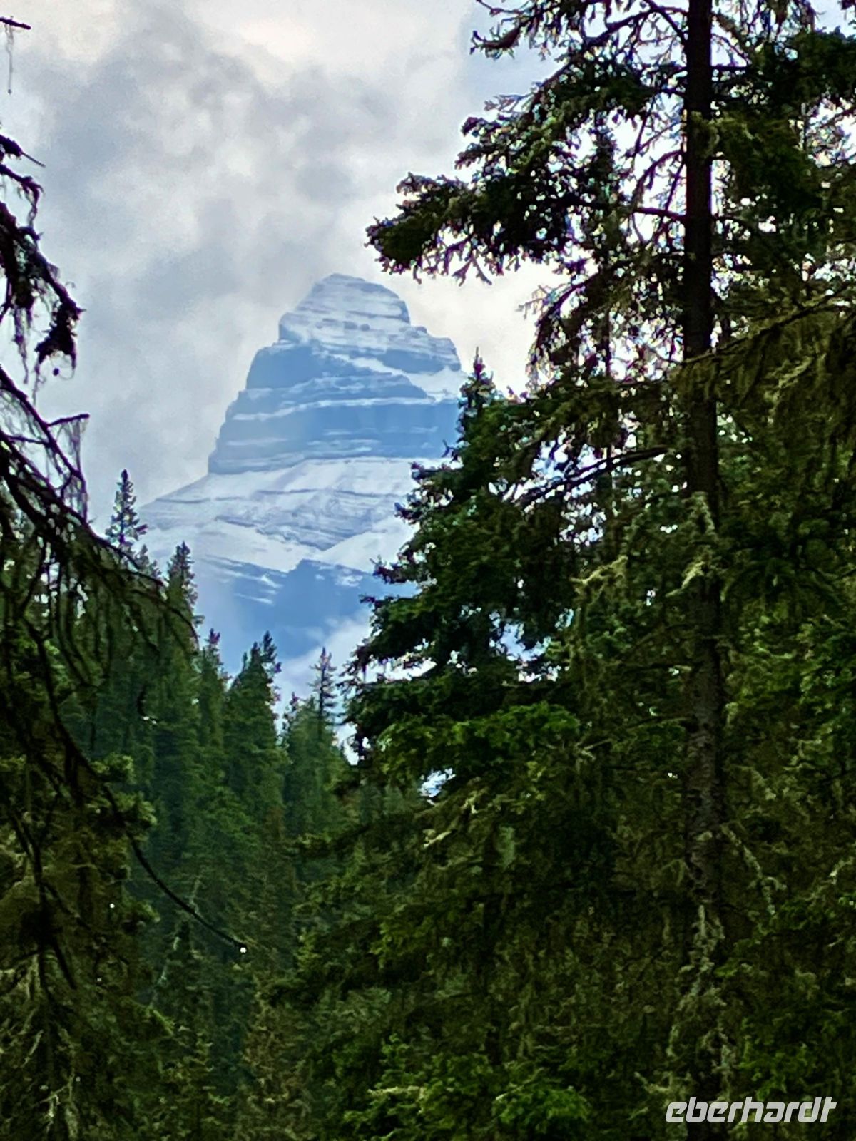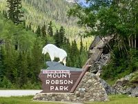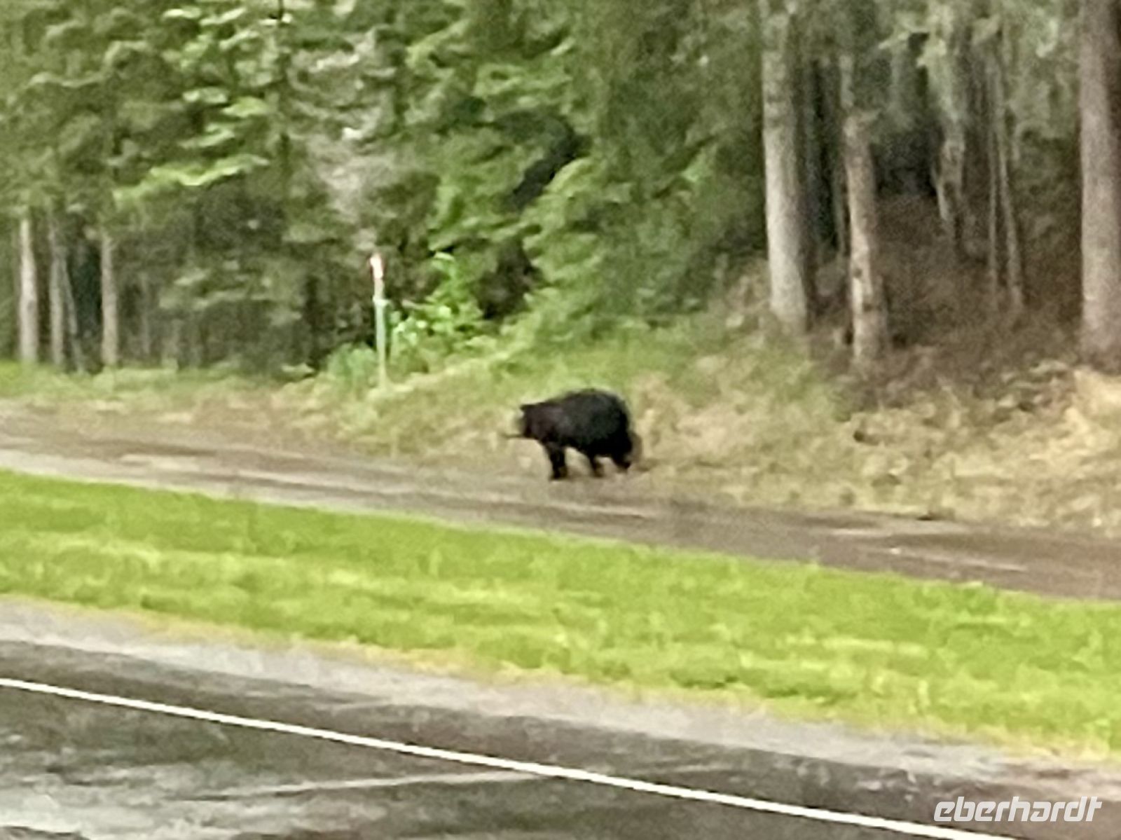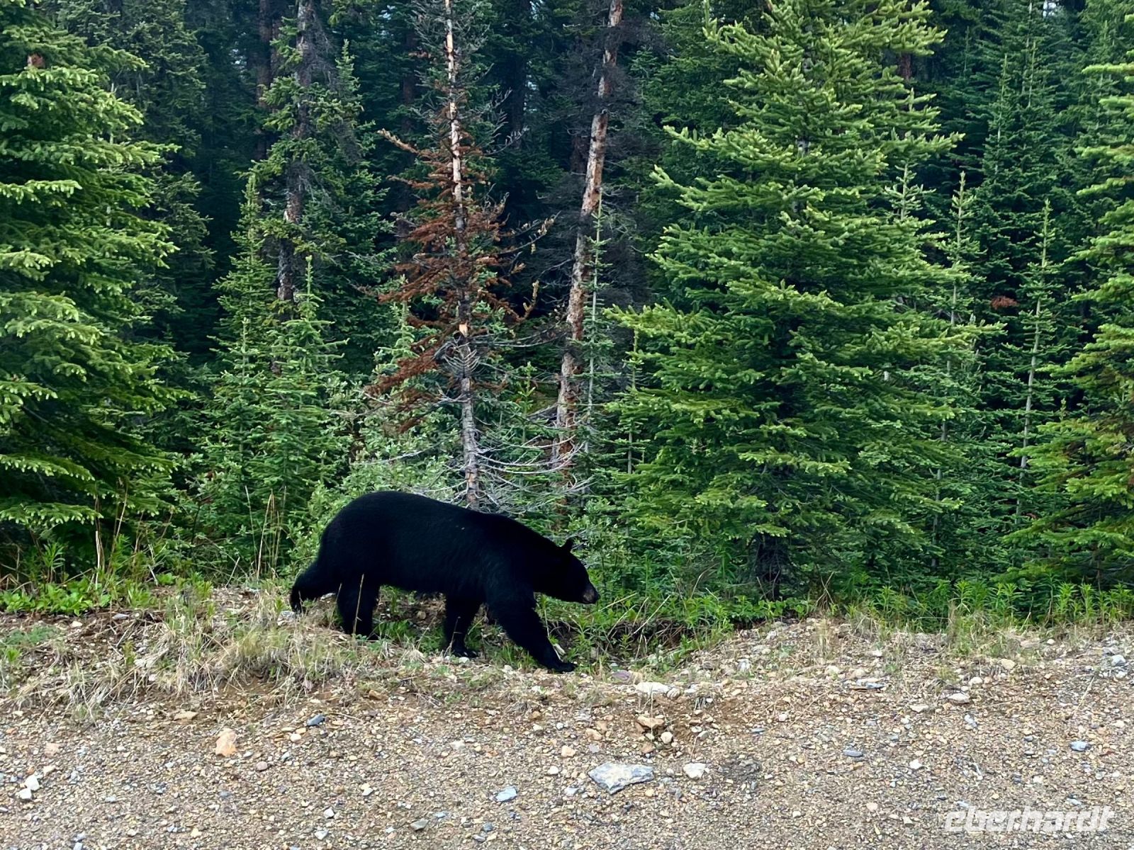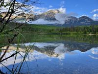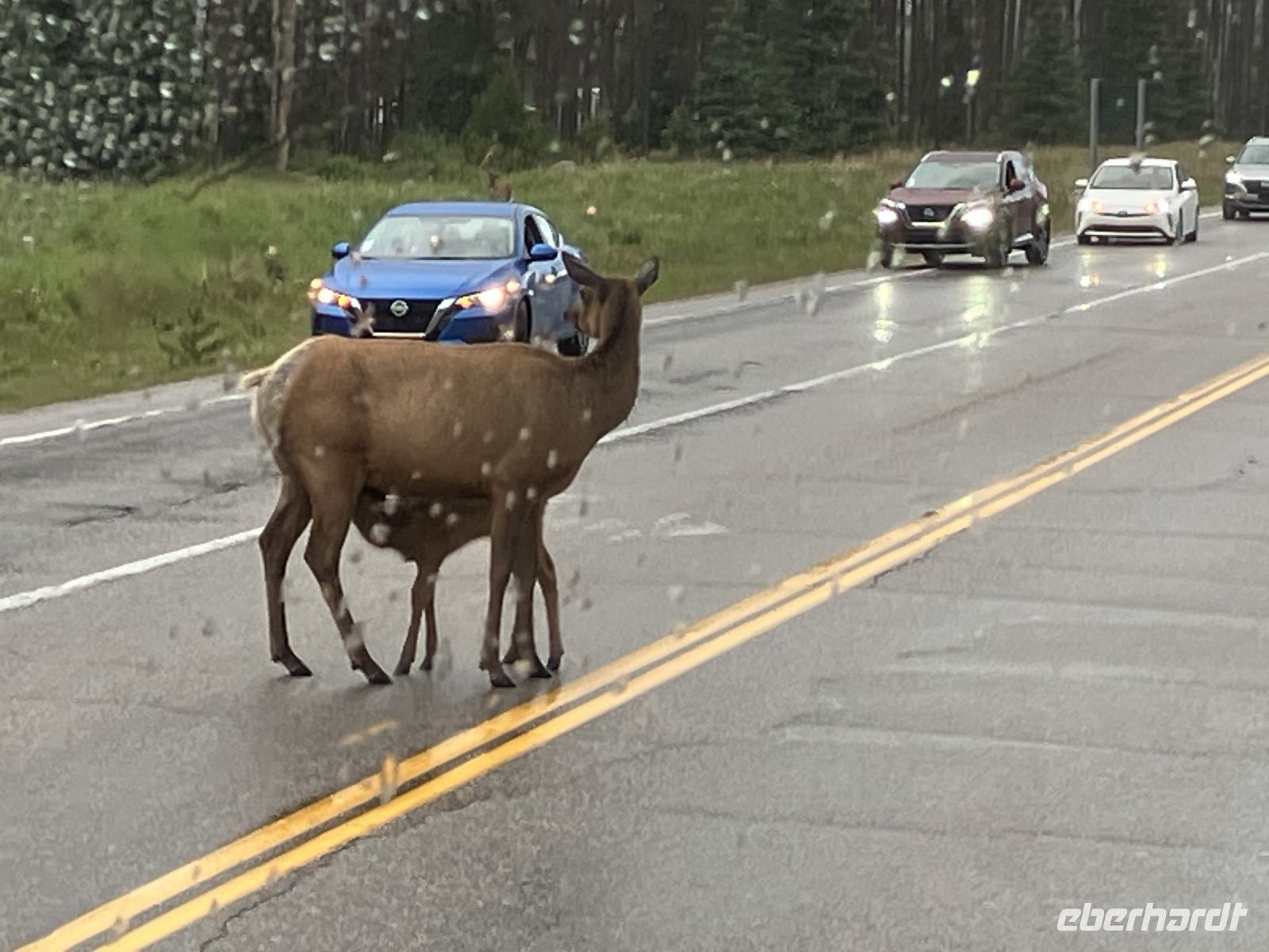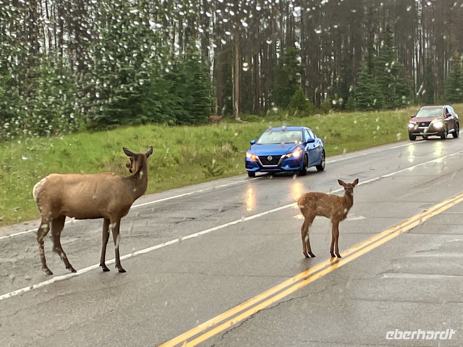 Die Nacht war kalt aber die schoen warmen Zudecken haben ihren Dienst gut geleistet. Frisch sehen wir uns alle wieder beim Fruehstuecksbuffet welches nur fuer uns hergerichtet ist. Heute fahren wir vorerst zu zwei kleineren Bergseen. Aber gleich schon beim Verlassen des Hotelareals auf der HWY sehen wir eine ganze Herde von Wapitidamen mit ihren Kids. Ploetzlich rennt auch ein gepunktetes Bambi ueber die Strasse, steht mitten drinnen stehen und schaut sich um. Alle Autos schauen gespannt dem Baby zu und es schaut angespannt wo denn auch die Mama bleibt. Ahhh da kommt sie ja, bleibt auch auf dem Mittelstreifen stehen schaut sich um, sieht dass alle Autos und Busse stehen, das Bambi kommt hungrig nahe und faengt auch an zu saeugen. Na sowas, die Kameras sind total im Stress denn niemand kann glauben was wir da gerade sehen. Das Schauspiel dauert etwa 3 Minuten, bis uns nicht ein Pickup ueberholt und die beiden Protagonisten von dem Buehnenbild verjagt. Wir werden diese Szene nie mehr vergessen. Nun ist es aber Zeit weiterzufahren wir wollen doch zu Patricia und Pyramid Lake. Beim ersten halten wir auch schnellstens an, denn das Wasser ist glatt, die Spiegelung perfekt und der schoene rote Pyramid Mountain hat sogar einen Wolken Schal um sich gewickelt. Nun schauen wir auch noch gleich ob die Habakuk Geschichte auch wahr sei. Ja, wir sehen die Fotos der Schiffswerft aus dem 2. Weltkrieg, eine unglaubliche Geschichte. Nach den vielen Fotos der Spiegelung gehts nun zu Pyramid Lake. Wir spazieren gemuetlich um die Insel und knipsen noch ein tolles Foto von uns fuer uns. Jetzt gehts aber weiter da wir heute noch viel vor haben. Uiii, da steht ja ein Baer mitten im Gebuesch, er knabbert was und graebt nach Wurzeln, wir koennen ihm zuschauen aber sehr fotogen ist er leider nicht. Unterwegs nach Clearwater halten wir bei der Grenze von Alberta-Britisch Kolumbien und stellen auch die Uhr eine Stunde zurueck. So verabschieden wir uns auch von den Rockies, fahren noch ein Stuendchen bis wir bei Mount Robson ankommen. Mit der Zeitverschiebung haben wir heute ein Spiel-Stunde dazubekommen. Das Mittagessen bei Mount Robson ist gut und der Mount Robson selbst zeigt sich zu ¾ was schon sehr schoen und besonders ist. Der 3954 Meter hohe Berg schliesst naemlich ein langes Tal ab und so ziert fast immer eine Wolkenkrone sein Haupt. Bei der Weiterfahrt verlassen wir nun den Fraser Fluss und fahren dem North Thompson River entlang. Ein Bierchen unterwegs beim wilden Larry in seinem Pub haelt uns bei Laune. Nicht dass wir das braeuchten, aber bitte. Dann heisst es bald mal Einchecken in Clearwater und das jeweilige niegel-nagel-neue Zimmer zu beziehen. Bloss noch 2 Sachen stehen auf Elisabeth’s heutigem Plan. Also gehts gleich wieder mit dem Bus ab auf eine 20 Minuetige Fahrt. Auf dem kurzen Wanderweg zu dem Spahat Wasserfall lernen wir einiges ueber den Wald. Wie erkenne ich Duglasien, wozu braucht man die Westliche Rote Zeder und wozu dient wohl eine Hemlock Tanne. Ach, hier ist eine Pappel und da eine Eibe welche man zur Heilung aller moeglichen Krankheit gebrauchen kann. Der praechtige Spahat Wasserfall ist sehr beeindruckend und sein Basaltgestein ist ein Augenschmaus eines jeden Geologen. Schau, wir wir unsere Augen tricksen koennen, die Basaltwand kann tanzen ! Auf und ab bewegen sich die Schichten ! Ausgetrickst gehts zurueck ins Hotel und spaeter zum Super Abendessen. Die schoenen neuen Zimmer rufen uns, kommt doch endlich, Zeit um sich zurueck zu ziehen. Heute nacht traeumen wir von den vielen Eindruecken und Abenteuer in den Rocky Mountains. Schoen wars. Tolle Tiere haben wir gesehen.