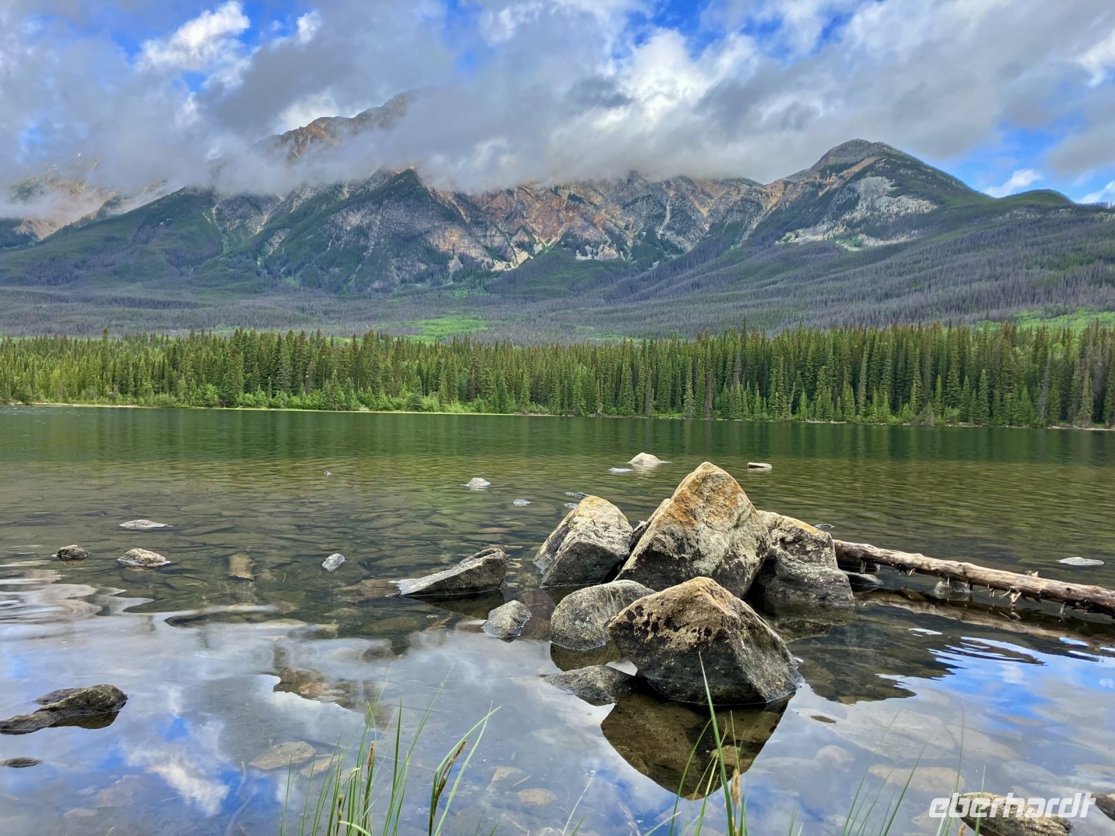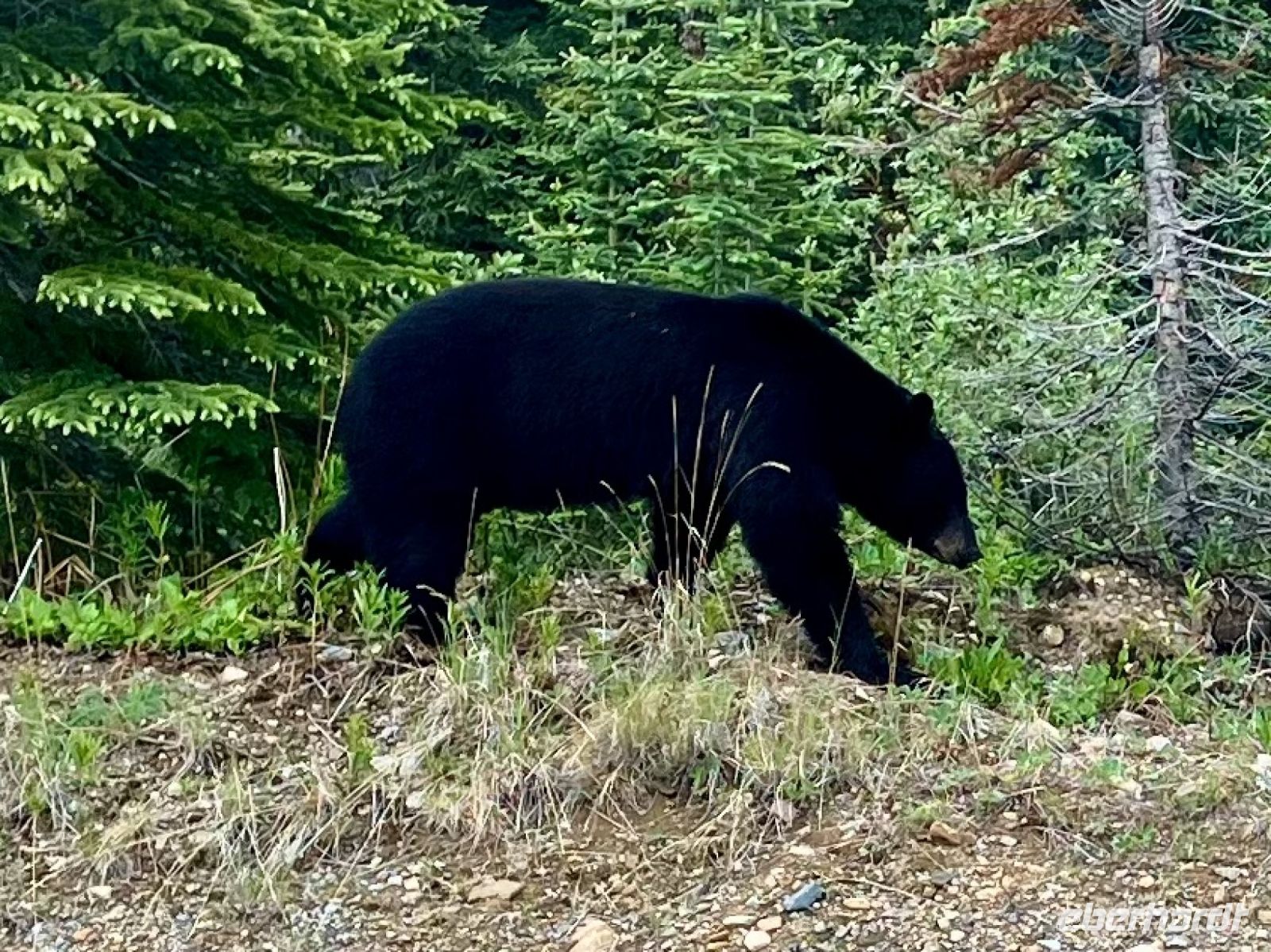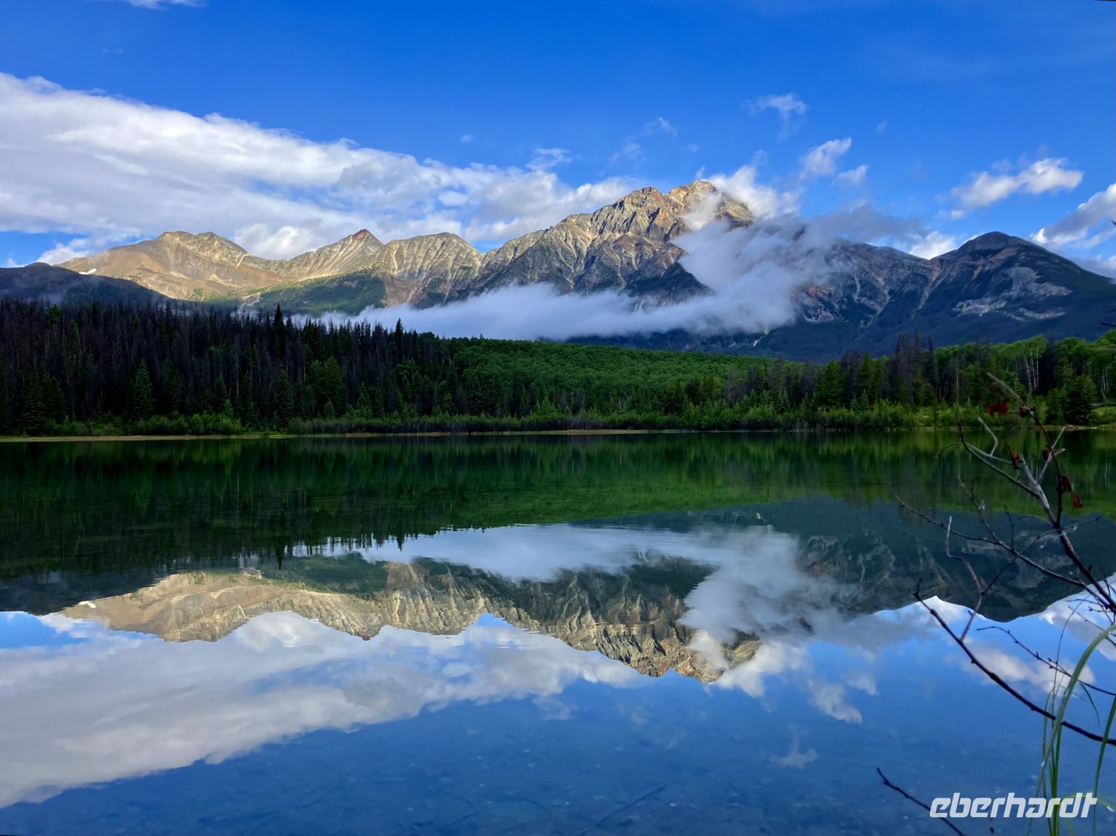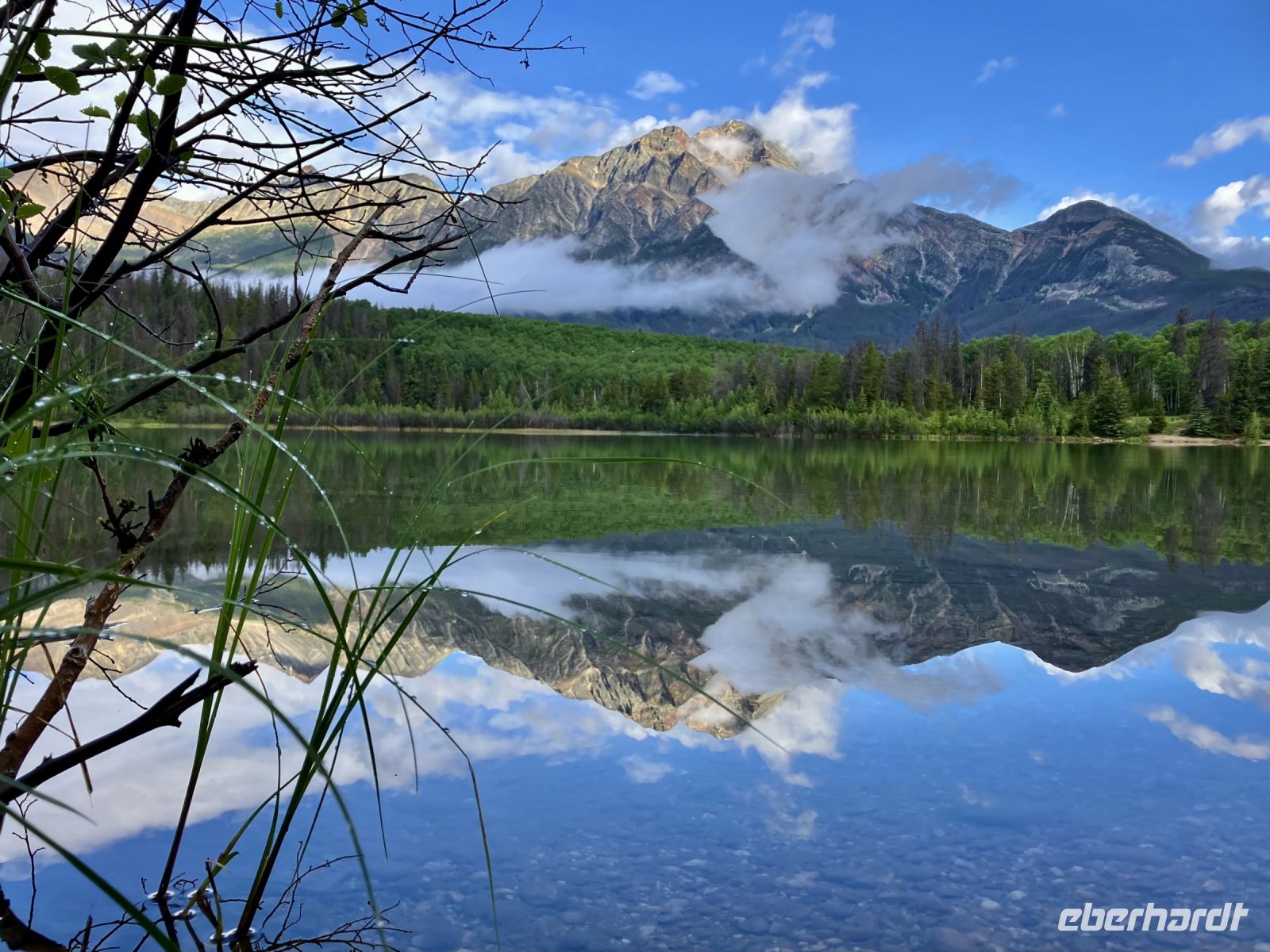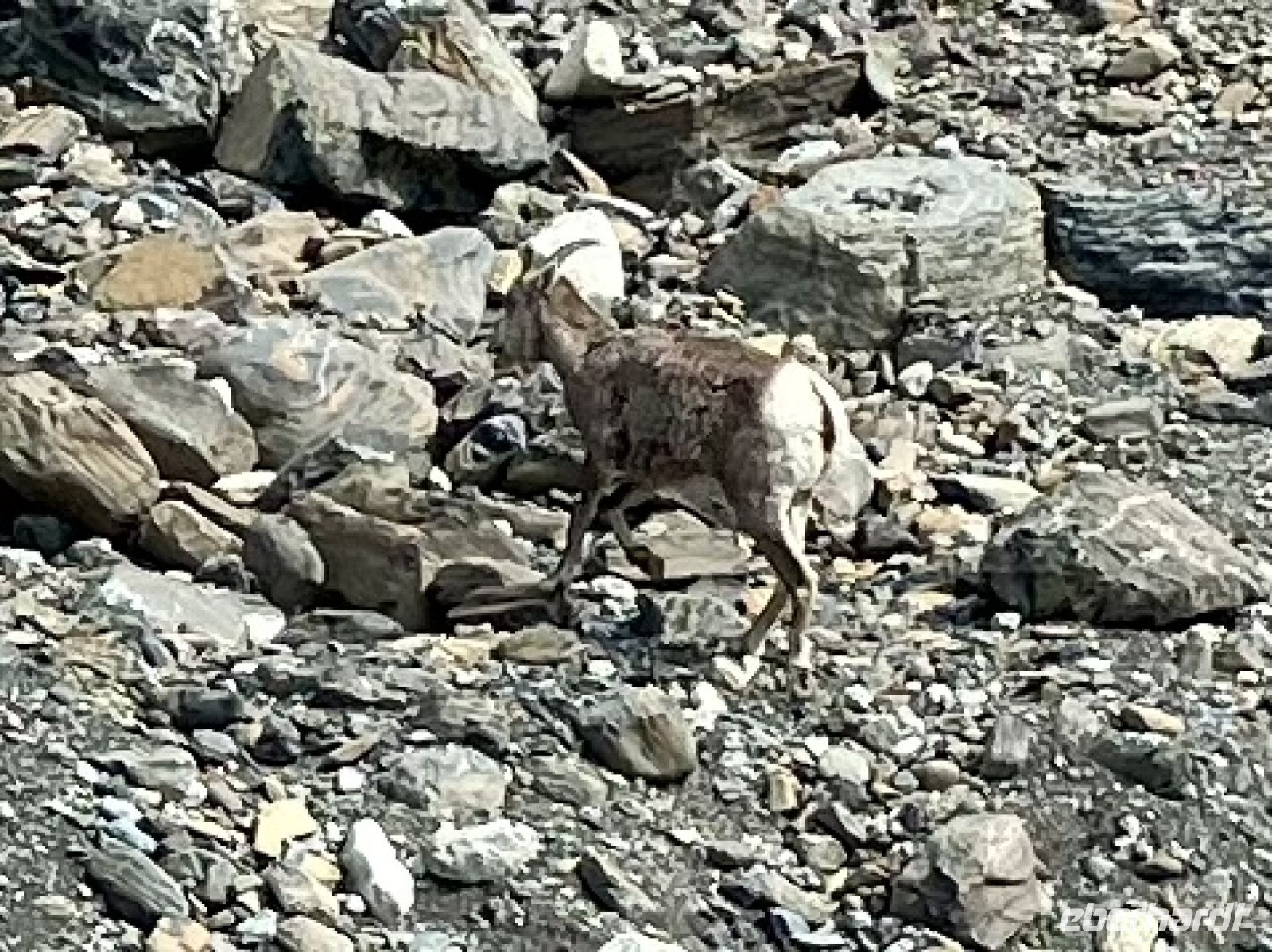 Die Nacht war kalt aber die schoen warmen Zudecken haben ihren Dienst gut geleistet. Frisch sehen wir uns alle wieder beim Fruehstuecksbuffet welches nur fuer uns hergerichtet ist. Heute fahren wir vorerst zu zwei kleineren Bergseen. Aber gleich schon beim Verlassen des Hotelareals auf der HWY sehen wir eine ganze Herde von Wapitidamen mit ihren Kids. Ploetzlich rennt auch ein gepunktetes Bambi ueber die Strasse, steht mitten drinnen stehen und schaut sich um. Alle Autos schauen gespannt dem Baby zu und es schaut angespannt wo denn auch die Mama bleibt. Ahhh da kommt sie ja, bleibt auch auf dem Mittelstreifen stehen schaut sich um, sieht dass alle Autos und Busse stehen, das Bambi kommt hungrig nahe und faengt auch an zu saeugen. Na sowas, die Kameras sind total im Stress denn niemand kann glauben was wir da gerade sehen. Das Schauspiel dauert etwa 3 Minuten, bis uns nicht ein Pickup ueberholt und die beiden Protagonisten von dem Buehnenbild verjagt. Wir werden diese Szene nie mehr vergessen. Nun ist es aber Zeit weiterzufahren wir wollen doch zu Patricia und Pyramid Lake. Beim ersten halten wir auch schnellstens an, denn das Wasser ist glatt, die Spiegelung perfekt und der schoene rote Pyramid Mountain hat sogar einen Wolken Schal um sich gewickelt. Nun schauen wir auch noch gleich ob die Habakuk Geschichte auch wahr sei. Ja, wir sehen die Fotos der Schiffswerft aus dem 2. Weltkrieg, eine unglaubliche Geschichte. Nach den vielen Fotos der Spiegelung gehts nun zu Pyramid Lake. Wir spazieren gemuetlich um die Insel und knipsen noch ein tolles Foto von uns fuer uns. Jetzt gehts aber weiter da wir heute noch viel vor haben. Uiii, da steht ja ein Baer mitten im Gebuesch, er knabbert was und graebt nach Wurzeln, wir koennen ihm zuschauen aber sehr fotogen ist er leider nicht. Unterwegs nach Clearwater halten wir bei der Grenze von Alberta-Britisch Kolumbien und stellen auch die Uhr eine Stunde zurueck. So verabschieden wir uns auch von den Rockies, fahren noch ein Stuendchen bis wir bei Mount Robson ankommen. Mit der Zeitverschiebung haben wir heute ein Spiel-Stunde dazubekommen. Das Mittagessen bei Mount Robson ist gut und der Mount Robson selbst zeigt sich zu ¾ was schon sehr schoen und besonders ist. Der 3954 Meter hohe Berg schliesst naemlich ein langes Tal ab und so ziert fast immer eine Wolkenkrone sein Haupt. Bei der Weiterfahrt verlassen wir nun den Fraser Fluss und fahren dem North Thompson River entlang. Ein Bierchen unterwegs beim wilden Larry in seinem Pub haelt uns bei Laune. Nicht dass wir das braeuchten, aber bitte. Dann heisst es bald mal Einchecken in Clearwater und das jeweilige niegel-nagel-neue Zimmer zu beziehen. Bloss noch 2 Sachen stehen auf Elisabeth’s heutigem Plan. Also gehts gleich wieder mit dem Bus ab auf eine 20 Minuetige Fahrt. Auf dem kurzen Wanderweg zu dem Spahat Wasserfall lernen wir einiges ueber den Wald. Wie erkenne ich Duglasien, wozu braucht man die Westliche Rote Zeder und wozu dient wohl eine Hemlock Tanne. Ach, hier ist eine Pappel und da eine Eibe welche man zur Heilung aller moeglichen Krankheit gebrauchen kann. Der praechtige Spahat Wasserfall ist sehr beeindruckend und sein Basaltgestein ist ein Augenschmaus eines jeden Geologen. Schau, wir wir unsere Augen tricksen koennen, die Basaltwand kann tanzen ! Auf und ab bewegen sich die Schichten ! Ausgetrickst gehts zurueck ins Hotel und spaeter zum Super Abendessen. Die schoenen neuen Zimmer rufen uns, kommt doch endlich, Zeit um sich zurueck zu ziehen. Heute nacht traeumen wir von den vielen Eindruecken und Abenteuer in den Rocky Mountains. Schoen wars. Tolle Tiere haben wir gesehen.