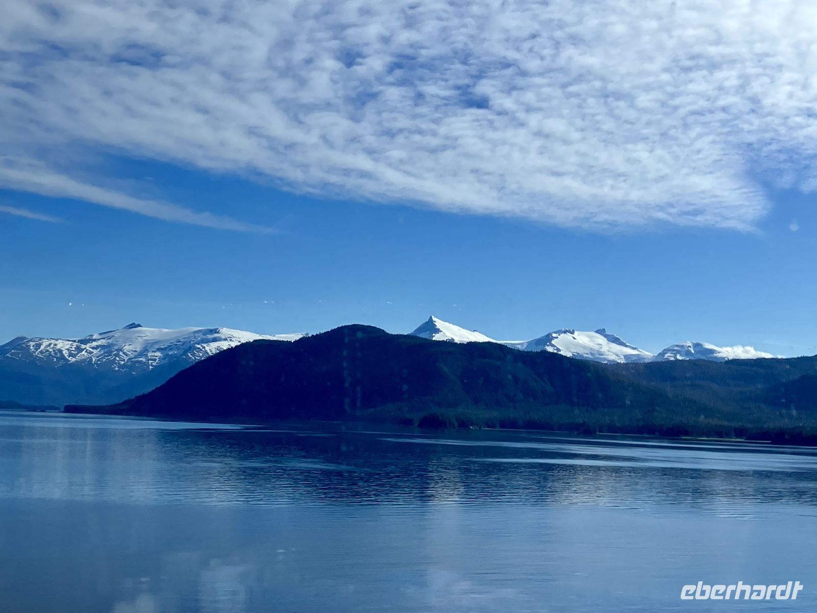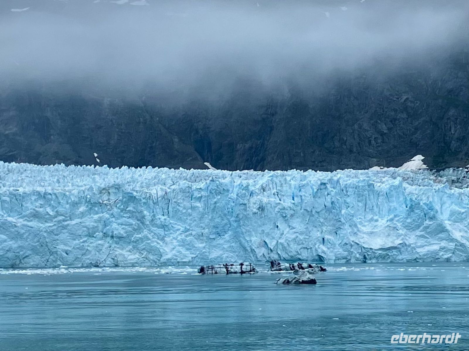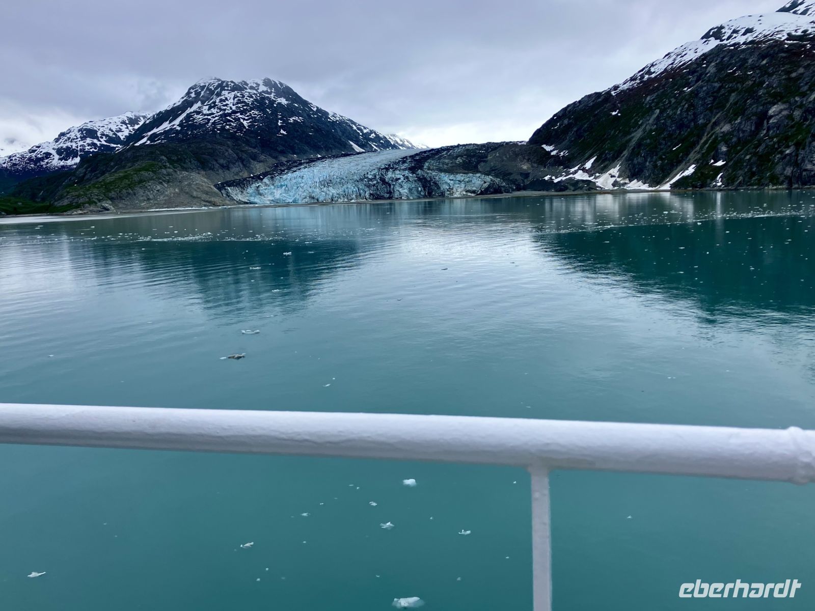 Um 6:30 stehen schon einige Gletscher-Freunde auf Deck um auch ja nichts zu verpassen. Vorerst ist das Wetter schoen und kalt aber sobald wir in die Glacier Bay hineinfahren, bedeckt sich der Himmel mit hellen Wolken, wohl so, dass alle die Fotos die wir nun knipsen auch gelingen moegen. In diesem Meeresarm ist es ganz ruhig, die Waelder sind unberuehrt die Berge mit Schnee und Gletscher bedeckt und das Meer mit vielen Eisschollen bestueckt. Sie haben alle recht ulkige bis artistische Formen, einige sind oben weiss und unten ganz blau, andere sind pures blaues Eis andere wieder ganz schwarz. Auf einigen Schollen sehen wir auch Robben die sich ausruhen. Wir stehen alle an der Reling und staunen ueber diese maechtige Schoenheit die sich hier bietet. Ein Stuendchen spaeter sehen wir bereits den ersten kalbernden Gletscher. So was tolles, so eine Farbe, es ist der Lamplugh Gletscher. Wir fahren ganz langsam an ihm vorbei. Die Seehunde staunen. Der Weisskopfadler dreht sich jedoch nicht um. Wir sind hier nicht die Wichtigkeit. Nun geht es weiter zu einem noch groesseren Gletscher der einen anderen Meeresarm abgrenzt. Es ist der Margerie Gletscher. Auch er gehoert zum Glacier Bay Naturpark. Er ist noch maechtiger als der Lamplugh und der John Hopkins Gletscher, so imposant glitzert er mit seinen spitzen Tuermchen und tiefen Crevassen. Er kalbert auch 2 mal waehrend wir ihn bestaunen. Unser Schiff ist ideal ausgeruestet mit seinen vielen Aussen- und Innen-Decks. Alle haben ganz vorne an der Reling Platz, so kommt heuer auch kein Gestuerme auf. Unser Kapitaen dreht auch das Riesenschiff in der Bucht einmal ganz langsam um seine eigene Achse. Wir bleiben 1 ½ Stunden sodass jeder dieses Spektakel in Ruhe anschauen, einpraegen und auch aufnehmen kann. Jetzt ist aber Zeit, uns von Margerie zu verabschieden denn wir wollen weiter bis nach Ketchikan. Wir erleben eine wunderbare Zeit an Bord. Der Regen hat ueberhand genommen, so gibt es vorerst mal ein feines Mittagessen, dann eine Yogastunde und danach macht jeder was er immer schon im Urlaub machen wollte. Der Fantasie sind hier keine Limiten gesetzt. Viele schneebedeckte Berge begleiten uns. So verbringen wir die Zeit an Bord mit viel Lachen, Gespraechen und dem einen oder anderen Nickerchen. Das Abendbrot ist wieder fein und die Show danach auch sehr interessant. Muede schleppen wir uns spaet in die Kabinen denn Morgen wartet Ketchikan auf uns.