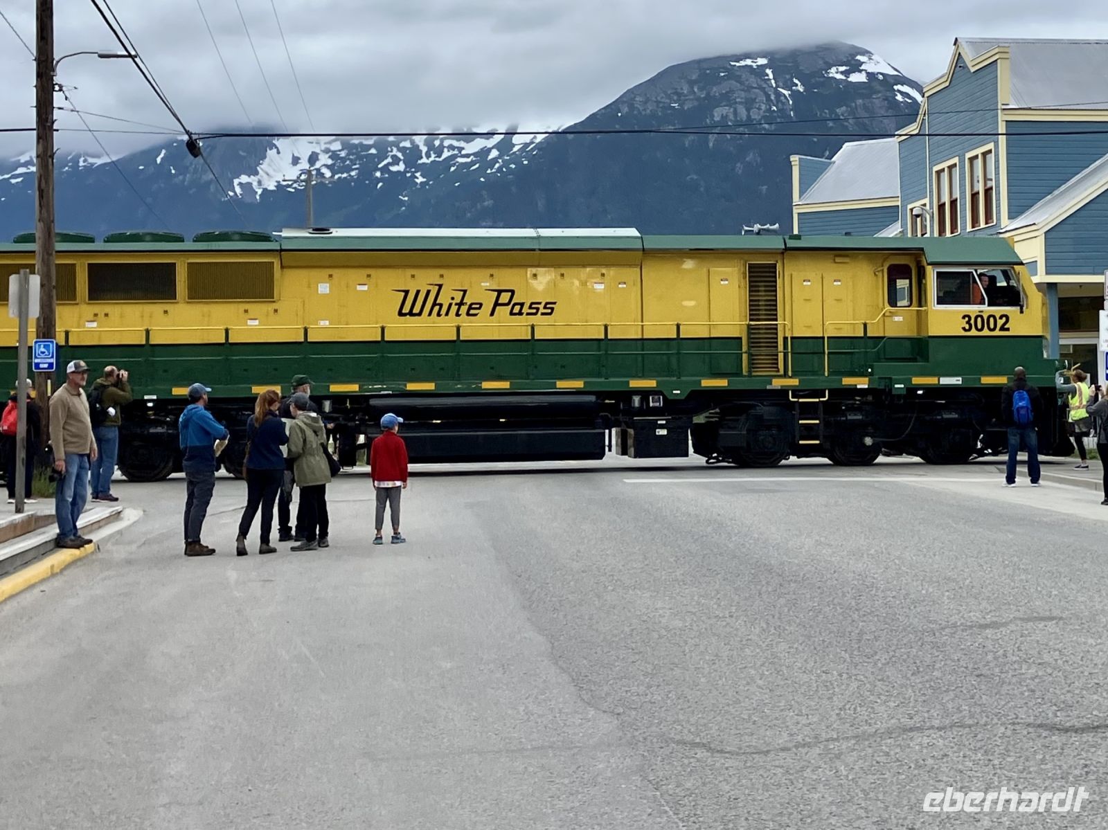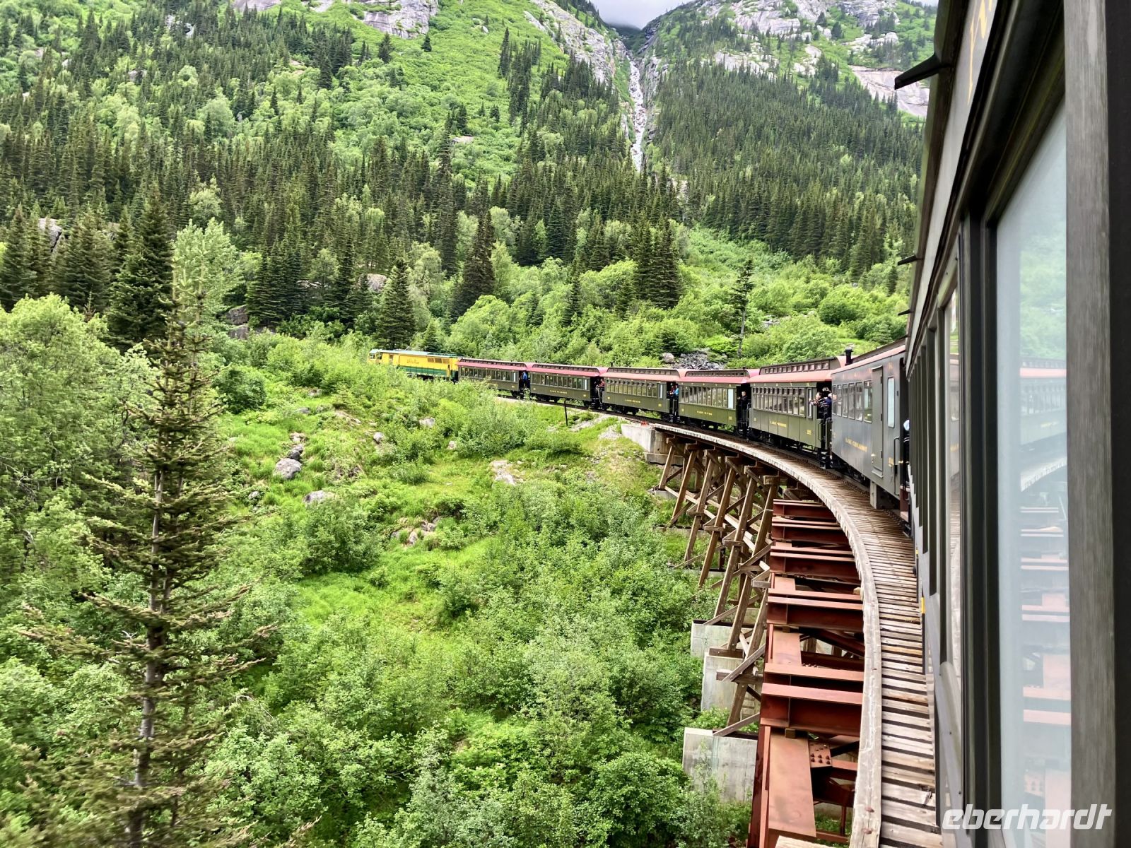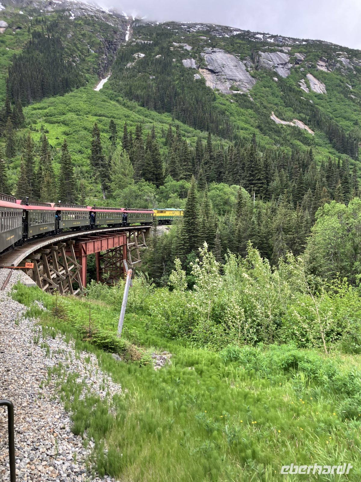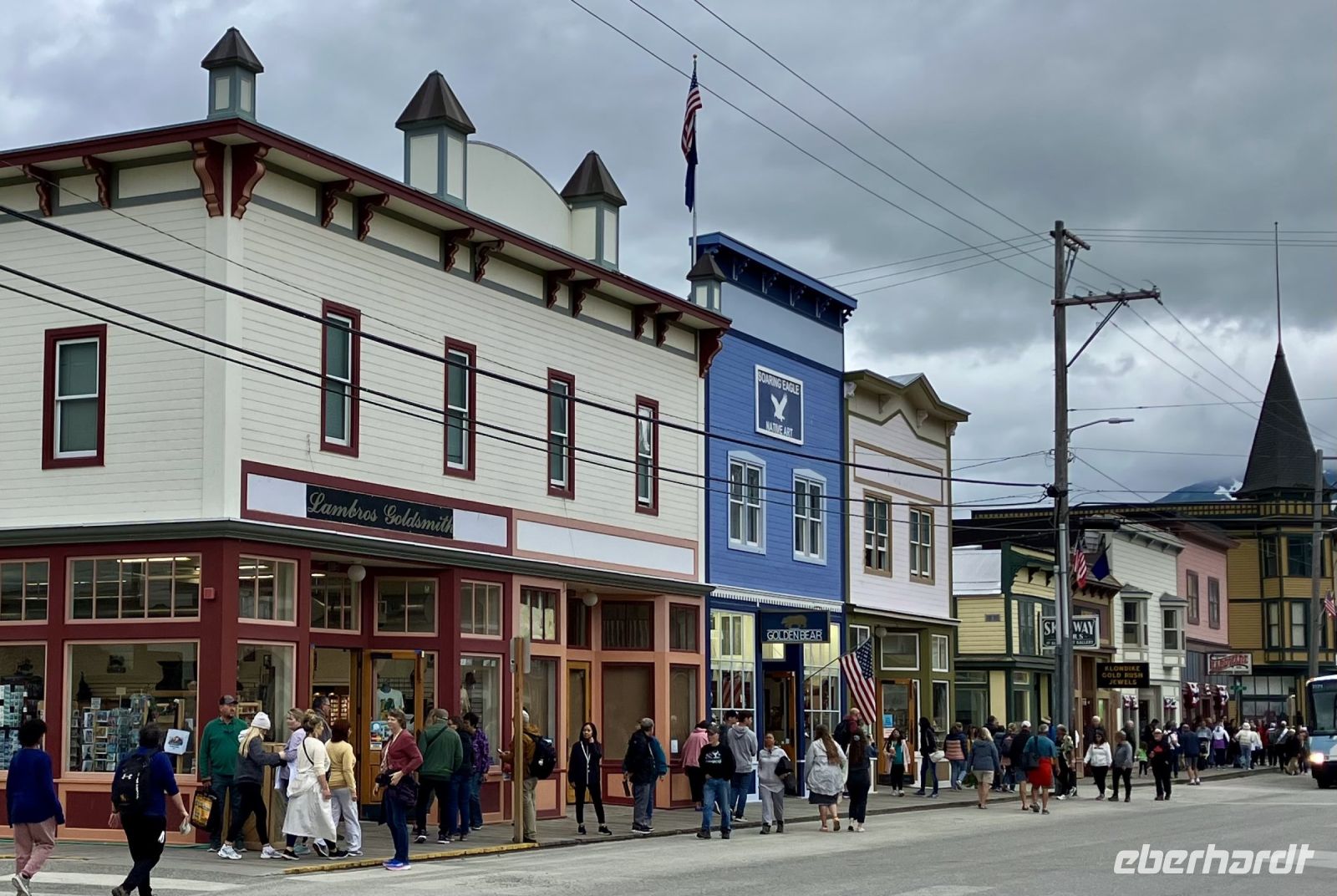 Bereits um 7:30 treffen wir uns in der Lobby, denn wir wollen die Zeit hier in Skagway gut nuetzen. Der Zug, der uns auf den White Pass fuehrt steht bereit und wir finden auch schon unseren Wagon. Alle Wagons haben Namen von Fluessen und Seen in Alaska und alle sind zwischen 30 und 100 Jahre alt. Wunderbar ! Langsam und gemaechlich, so wie die Goldgraeber im Jahre 1898 fahren wir auf Schienen die abenteuerlich an den steilen Abhaengen kleben. Ueber neue und alte Bruecken und durch zwei Tunnels fahren wir. Ein Tunnel heisst „das kurze dunkle Tunnel“ das ander ist etwas laenger und heisst „ ...“ . Schneebedeckte Berge schauen auf uns hinunter und wir schauen immer wieder bange in die tiefe Schlucht des Skagway Flusses. Da haben doch diese Goldgraeber echt die Pferde losgelassen und sind ohne diese weitergezogen da es nicht genug Platz auf dem Weg gab fuer Pferde. Die Geschichten ueber die Goldgraeber Zeit sind aeusserst interessant aber manchmal auch brutal. Diese Bahn zu bauen muss ein Fest der Ingenieure gewesen sein. Mr. Henley war der Eisenbahn-Kuenstler seiner Zeit und legte diese Schienen innert 2 Jahren. Wir fahren sogar wieder nach Kanada, steigen jedoch nicht aus und muessen daher auch nicht einreisen. Die Rueckfahrt mit dem Zug vergeht viel zu schnell denn wir muessen noch viele Photos machen von den vielen Eindruecken dieser Strecke. Wieder in Skagway, gehen wir vorerst auf einen Spaziergang in das schoene Staedtchen hinein. Toll schaut es hier aus mit den vielen bunten Haeuser. Wie im Wilden Westen mit aufgebauten Hausfassaden, Pubs, Geschaefte, Kaffeehaeuser, Banken und vielen Souvenir-Laeden. Nun gehts aber wieder aufs Schiff zum Mittagessen denn der Magen knurrt. Ja und danach kommt die Siesta. Niemand will um 14:30 die Hurley Girly Show schauen und so treffen wir uns spaeter wieder zum Besuch in der hiesigen „In-Bar“. Ah, in der Kabine liegt auch schon die Bordzeitung und hier steht, dass wir morgen in der Frueh schon Gletscher sehen werden, also wird das wieder eine kurze Nacht denn wir lassen uns gar nichts entgehen.