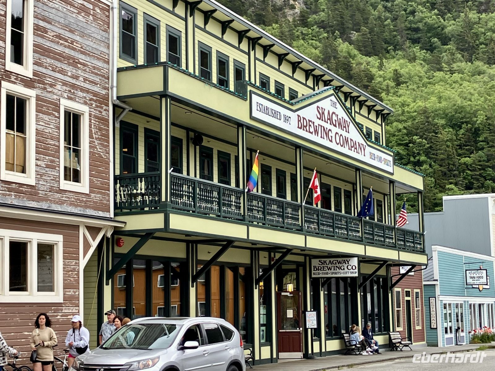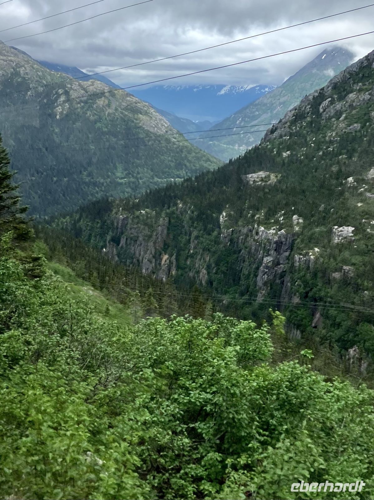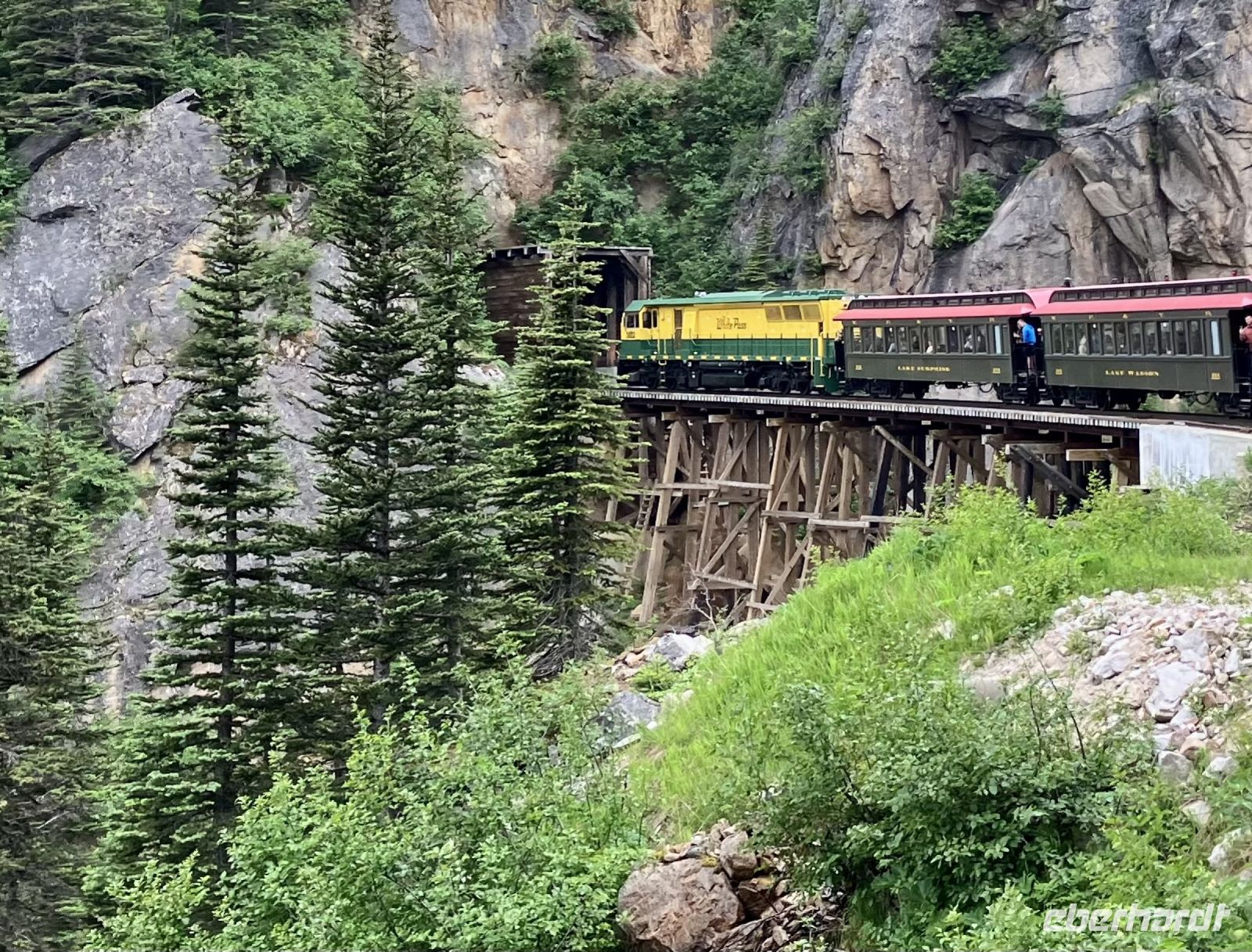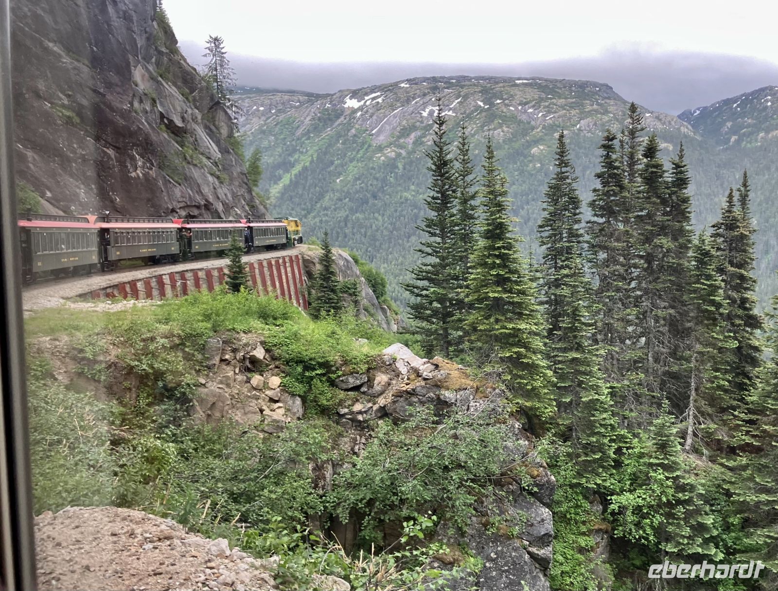 Bereits um 7:30 treffen wir uns in der Lobby, denn wir wollen die Zeit hier in Skagway gut nuetzen. Der Zug, der uns auf den White Pass fuehrt steht bereit und wir finden auch schon unseren Wagon. Alle Wagons haben Namen von Fluessen und Seen in Alaska und alle sind zwischen 30 und 100 Jahre alt. Wunderbar ! Langsam und gemaechlich, so wie die Goldgraeber im Jahre 1898 fahren wir auf Schienen die abenteuerlich an den steilen Abhaengen kleben. Ueber neue und alte Bruecken und durch zwei Tunnels fahren wir. Ein Tunnel heisst „das kurze dunkle Tunnel“ das ander ist etwas laenger und heisst „ ...“ . Schneebedeckte Berge schauen auf uns hinunter und wir schauen immer wieder bange in die tiefe Schlucht des Skagway Flusses. Da haben doch diese Goldgraeber echt die Pferde losgelassen und sind ohne diese weitergezogen da es nicht genug Platz auf dem Weg gab fuer Pferde. Die Geschichten ueber die Goldgraeber Zeit sind aeusserst interessant aber manchmal auch brutal. Diese Bahn zu bauen muss ein Fest der Ingenieure gewesen sein. Mr. Henley war der Eisenbahn-Kuenstler seiner Zeit und legte diese Schienen innert 2 Jahren. Wir fahren sogar wieder nach Kanada, steigen jedoch nicht aus und muessen daher auch nicht einreisen. Die Rueckfahrt mit dem Zug vergeht viel zu schnell denn wir muessen noch viele Photos machen von den vielen Eindruecken dieser Strecke. Wieder in Skagway, gehen wir vorerst auf einen Spaziergang in das schoene Staedtchen hinein. Toll schaut es hier aus mit den vielen bunten Haeuser. Wie im Wilden Westen mit aufgebauten Hausfassaden, Pubs, Geschaefte, Kaffeehaeuser, Banken und vielen Souvenir-Laeden. Nun gehts aber wieder aufs Schiff zum Mittagessen denn der Magen knurrt. Ja und danach kommt die Siesta. Niemand will um 14:30 die Hurley Girly Show schauen und so treffen wir uns spaeter wieder zum Besuch in der hiesigen „In-Bar“. Ah, in der Kabine liegt auch schon die Bordzeitung und hier steht, dass wir morgen in der Frueh schon Gletscher sehen werden, also wird das wieder eine kurze Nacht denn wir lassen uns gar nichts entgehen.