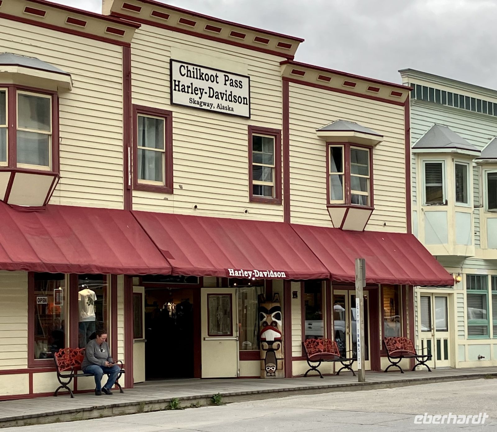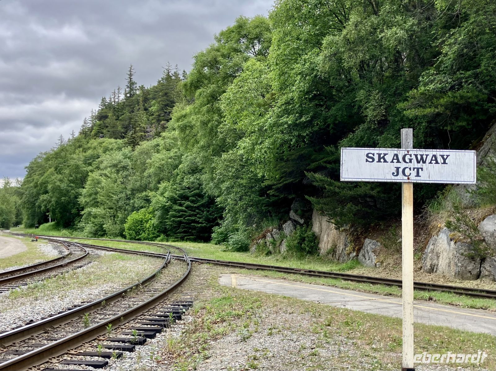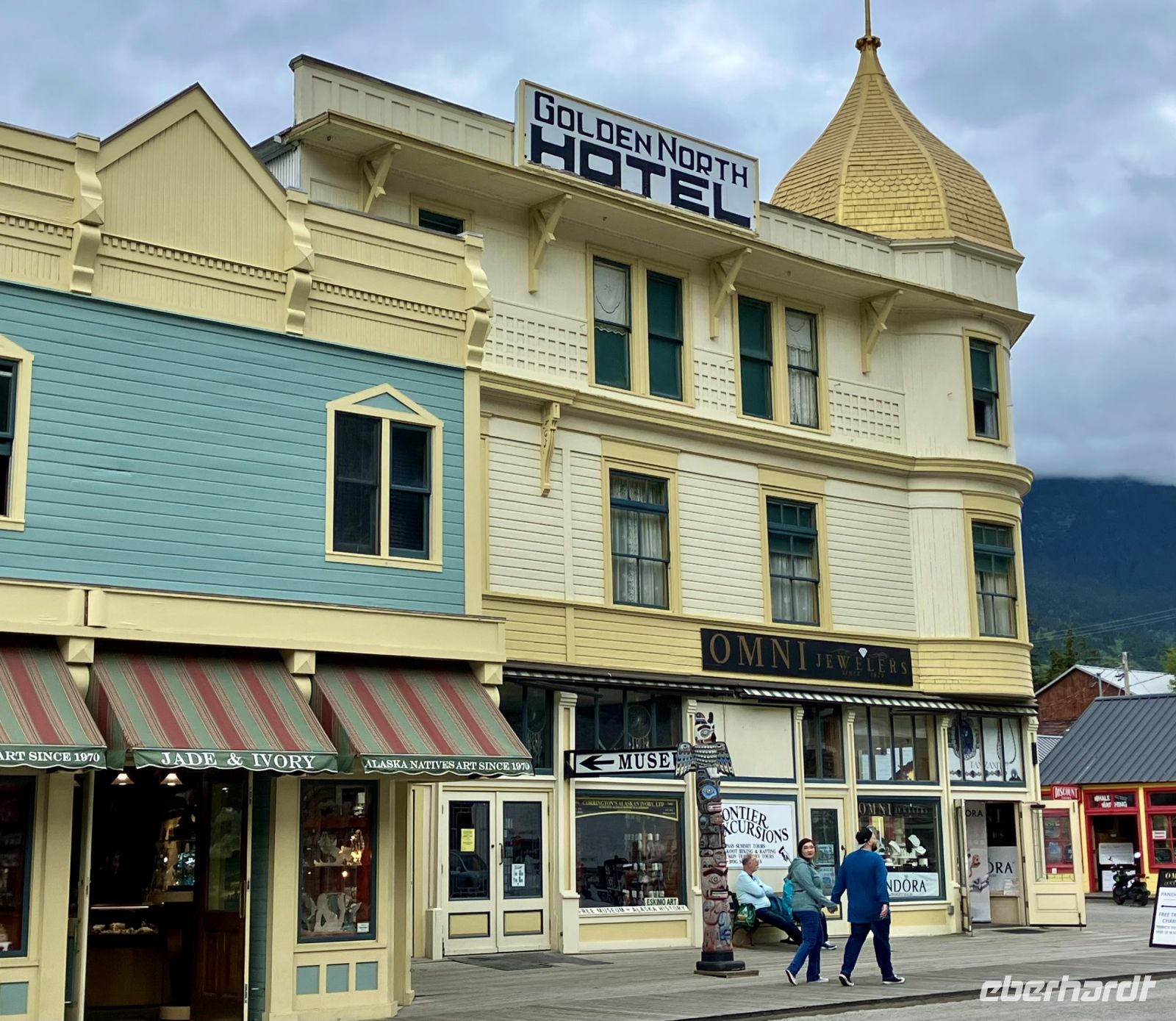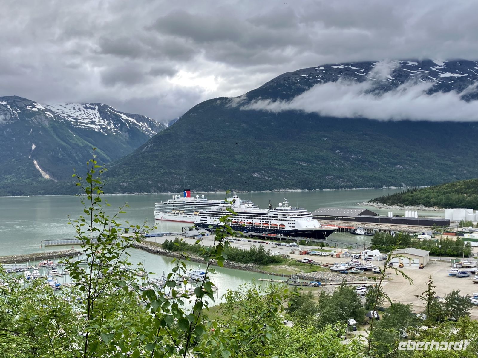 Bereits um 7:30 treffen wir uns in der Lobby, denn wir wollen die Zeit hier in Skagway gut nuetzen. Der Zug, der uns auf den White Pass fuehrt steht bereit und wir finden auch schon unseren Wagon. Alle Wagons haben Namen von Fluessen und Seen in Alaska und alle sind zwischen 30 und 100 Jahre alt. Wunderbar ! Langsam und gemaechlich, so wie die Goldgraeber im Jahre 1898 fahren wir auf Schienen die abenteuerlich an den steilen Abhaengen kleben. Ueber neue und alte Bruecken und durch zwei Tunnels fahren wir. Ein Tunnel heisst „das kurze dunkle Tunnel“ das ander ist etwas laenger und heisst „ ...“ . Schneebedeckte Berge schauen auf uns hinunter und wir schauen immer wieder bange in die tiefe Schlucht des Skagway Flusses. Da haben doch diese Goldgraeber echt die Pferde losgelassen und sind ohne diese weitergezogen da es nicht genug Platz auf dem Weg gab fuer Pferde. Die Geschichten ueber die Goldgraeber Zeit sind aeusserst interessant aber manchmal auch brutal. Diese Bahn zu bauen muss ein Fest der Ingenieure gewesen sein. Mr. Henley war der Eisenbahn-Kuenstler seiner Zeit und legte diese Schienen innert 2 Jahren. Wir fahren sogar wieder nach Kanada, steigen jedoch nicht aus und muessen daher auch nicht einreisen. Die Rueckfahrt mit dem Zug vergeht viel zu schnell denn wir muessen noch viele Photos machen von den vielen Eindruecken dieser Strecke. Wieder in Skagway, gehen wir vorerst auf einen Spaziergang in das schoene Staedtchen hinein. Toll schaut es hier aus mit den vielen bunten Haeuser. Wie im Wilden Westen mit aufgebauten Hausfassaden, Pubs, Geschaefte, Kaffeehaeuser, Banken und vielen Souvenir-Laeden. Nun gehts aber wieder aufs Schiff zum Mittagessen denn der Magen knurrt. Ja und danach kommt die Siesta. Niemand will um 14:30 die Hurley Girly Show schauen und so treffen wir uns spaeter wieder zum Besuch in der hiesigen „In-Bar“. Ah, in der Kabine liegt auch schon die Bordzeitung und hier steht, dass wir morgen in der Frueh schon Gletscher sehen werden, also wird das wieder eine kurze Nacht denn wir lassen uns gar nichts entgehen.