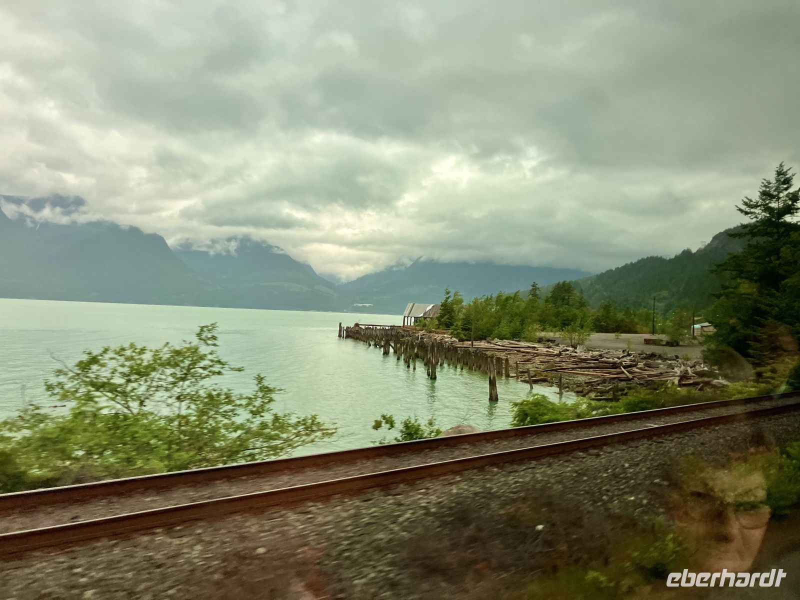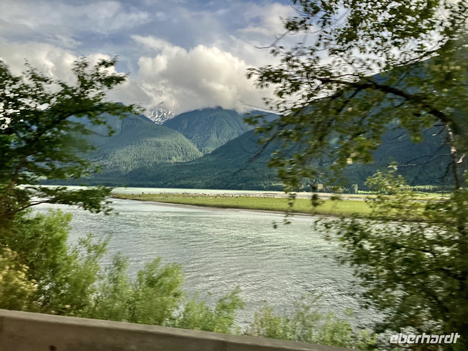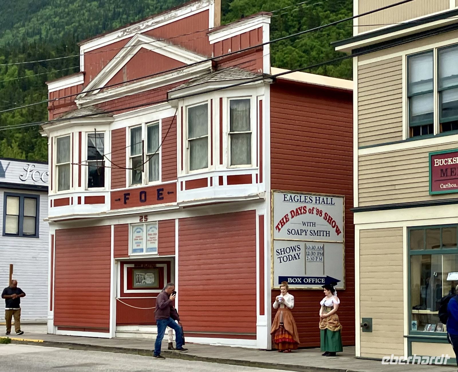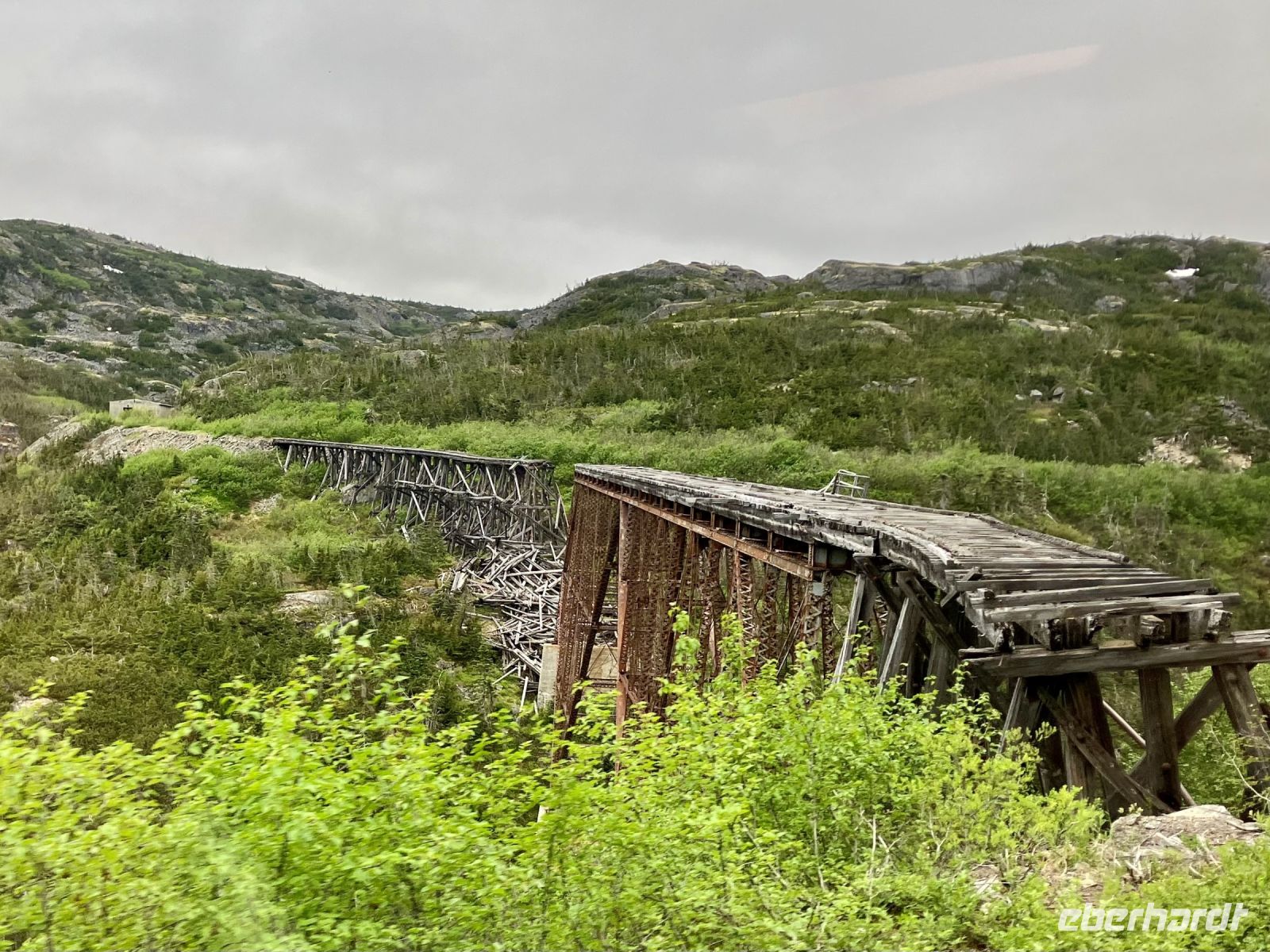 Bereits um 7:30 treffen wir uns in der Lobby, denn wir wollen die Zeit hier in Skagway gut nuetzen. Der Zug, der uns auf den White Pass fuehrt steht bereit und wir finden auch schon unseren Wagon. Alle Wagons haben Namen von Fluessen und Seen in Alaska und alle sind zwischen 30 und 100 Jahre alt. Wunderbar ! Langsam und gemaechlich, so wie die Goldgraeber im Jahre 1898 fahren wir auf Schienen die abenteuerlich an den steilen Abhaengen kleben. Ueber neue und alte Bruecken und durch zwei Tunnels fahren wir. Ein Tunnel heisst „das kurze dunkle Tunnel“ das ander ist etwas laenger und heisst „ ...“ . Schneebedeckte Berge schauen auf uns hinunter und wir schauen immer wieder bange in die tiefe Schlucht des Skagway Flusses. Da haben doch diese Goldgraeber echt die Pferde losgelassen und sind ohne diese weitergezogen da es nicht genug Platz auf dem Weg gab fuer Pferde. Die Geschichten ueber die Goldgraeber Zeit sind aeusserst interessant aber manchmal auch brutal. Diese Bahn zu bauen muss ein Fest der Ingenieure gewesen sein. Mr. Henley war der Eisenbahn-Kuenstler seiner Zeit und legte diese Schienen innert 2 Jahren. Wir fahren sogar wieder nach Kanada, steigen jedoch nicht aus und muessen daher auch nicht einreisen. Die Rueckfahrt mit dem Zug vergeht viel zu schnell denn wir muessen noch viele Photos machen von den vielen Eindruecken dieser Strecke. Wieder in Skagway, gehen wir vorerst auf einen Spaziergang in das schoene Staedtchen hinein. Toll schaut es hier aus mit den vielen bunten Haeuser. Wie im Wilden Westen mit aufgebauten Hausfassaden, Pubs, Geschaefte, Kaffeehaeuser, Banken und vielen Souvenir-Laeden. Nun gehts aber wieder aufs Schiff zum Mittagessen denn der Magen knurrt. Ja und danach kommt die Siesta. Niemand will um 14:30 die Hurley Girly Show schauen und so treffen wir uns spaeter wieder zum Besuch in der hiesigen „In-Bar“. Ah, in der Kabine liegt auch schon die Bordzeitung und hier steht, dass wir morgen in der Frueh schon Gletscher sehen werden, also wird das wieder eine kurze Nacht denn wir lassen uns gar nichts entgehen.