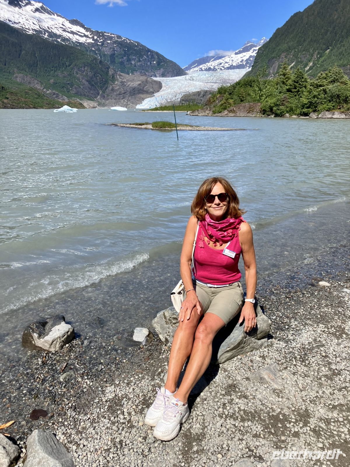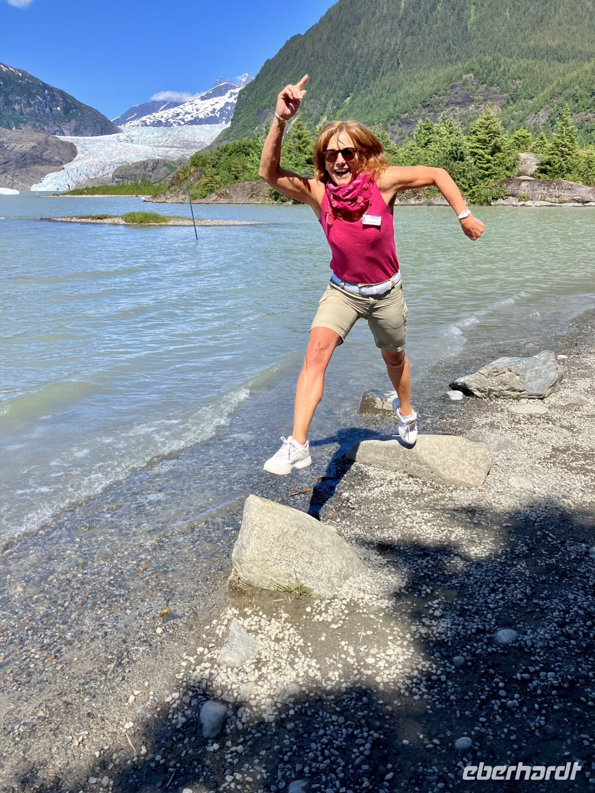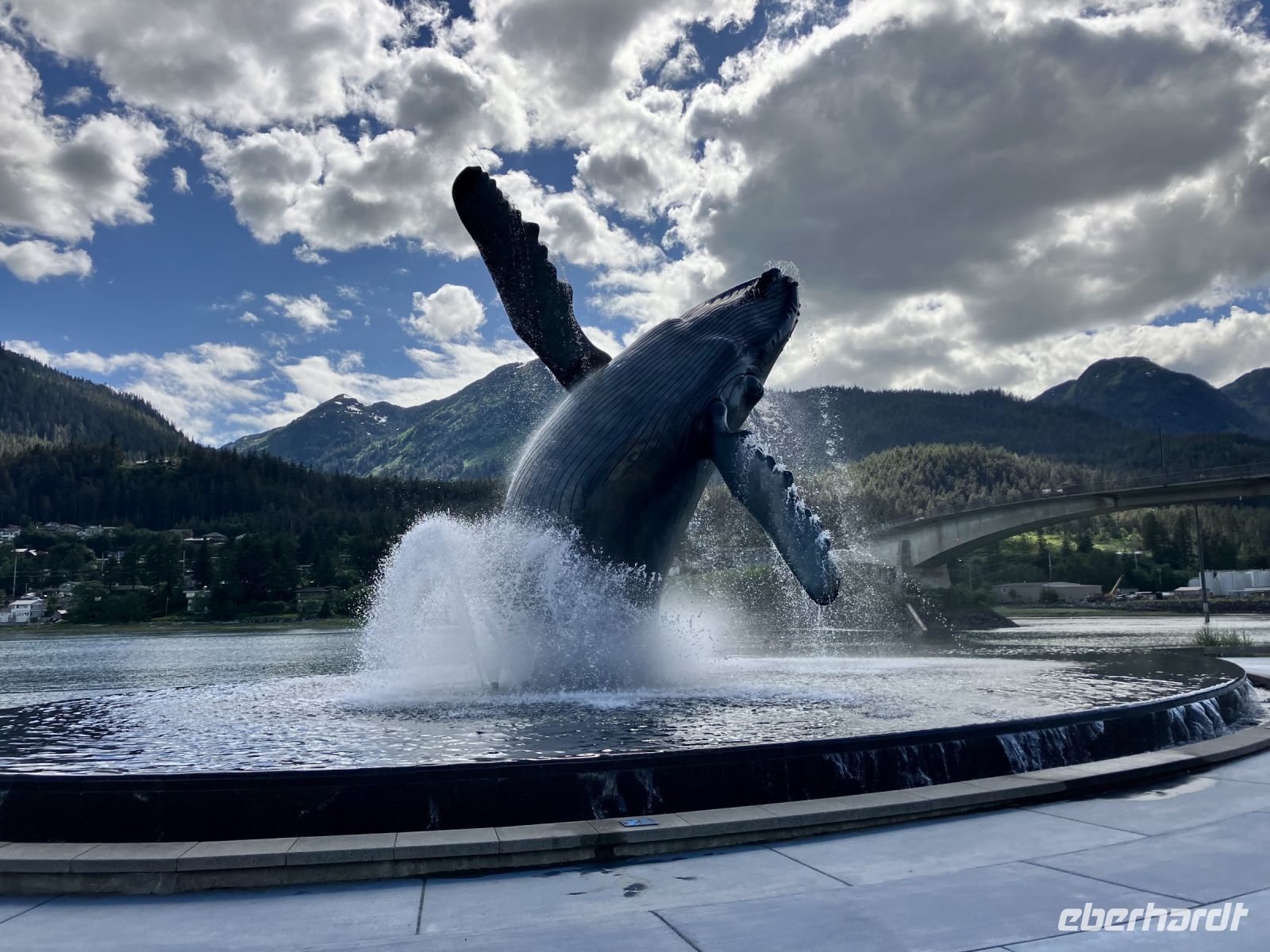 Heute bekommen wir wieder eine Stunde dazu. Wir haben nun bereits 10 Stunden unterschied mit unseren Lieben zu Hause. Wir sind fast auf der anderen Seite der Welt. Schon toll. Einige treffen sich wieder auf Deck 9 zum Yoga, aber dieses mal eine Stunde und wir lassen den Tai Chi sein. Aber uuups. Es war heute Nacht so nebelig, dass das Deck ganz nass ist. Also gibt es Yoga drinnen. Danach schmeckt das Fruehstueck immer noch besser. Heute wollen wir in den Tracy Arm segeln um dort den Sayward Gletscher zu sehen, wie er in das Meer kalbert. Leider wird das nichts, da wir so schnell wie moeglich nach Juneau weiterreisen muessen da ein Mitreisender auf dem Schiff schwer erkrankt ist. Die Person ist nicht von unserer Gruppe. So erreichen wir bereits um 11:30 die Hauptstadt Alaskas bei tollem Sonnenschein. Nach einem kleinen Mittagessen im Selbstbedienungs Restaurant treffen wir uns in der Lobby wie ausgemacht da wir heute einen privat – Ausflug unternehmen werden. Nach dem Ausschiffen spazieren wir gemuetlich zum Tramway wo wir auch bald unseren Bus sichten. Aaron, heisst der nette Fahrer der die uns heute zum Gletscher faehrt, er erzaehlt uns auch die Geschichte von Juneau, Hauptstadt Alaskas. Diese Stadt an der West Kueste Alaskas hat bloss 32‘000 Einwohner und kann nur per Schiff oder Flugzeug erreicht werden da sie von Eisfelder und Gletscher umrahmt ist. Es gibt jedoch eine 4-spurige Autobahn die liebevoll „the road“ heisst und etwa 30 Kilometer lang ist. Auf dieser Strasse fahren wir vorerst zum Aussichtspunkt des Mendenhall Gletschers mit seinem Besucherzentrum und Spaziergang. Das Wetter spielt heute auch mit und wir sehen wie sich dieser Gletscher, mit seinen hellblauen Spalten, wehrt in den See zu gleiten. Einige kleine Eisberge sind auf dem Mendenhall See zu sehen die muessen wohl kurz vor unserem Eintreffen gefallen sein. Wir haben genuegend Zeit einen schoenen Spaziergang bis zum grossen Wasserfall zu unternehmen. Es ist so warm, dass wir alle Jacken und Pullis in die Taschen und Beutel verstauen und im T-Shirt wandern. Es ist wunderschoen und sehr geruhsam hier. Nach diesem tollen Ausflug gehts mit dem Bus weiter, wieder in die Stadt hinein zum Hafen. Vorerst machen wir jedoch noch einen Stop bei einem kleinen Park wo sich eine Skulptur eines springenden Buckelwales befindet. Es ist auch ein Wasserspiel. Der Wal schaut toll aus, schaut Euch die Fotogalerie an. Nach diesem Fotostop fahren wir weiter Richtung Hafen zu der Seilbahn die hier Tramway genannt wird. Hinauffahren ist super und sehr unterhaltsam. Oben begeben wir uns auch gleich auf Wanderschaft auf die Aussichtsterassen. Was fuer eine herrliche Aussicht auf Juneau und den Gastineau Kanal. Einige schaffen es bis zum Gipfelkreuz zu gelangen in der gegebener Zeit. Nun kommt noch die die Talfahrt mit der Seilbahn und gleich danach den Absacker im Red Onion Pub. Flotte Musik, gutes Bier, Saegespaene am Boden, so geniessen wir den Abschluss von Juneau. Das Abendessen im grossen Speisesaal ist wieder sehr lecker und die Pianistin in der Piano Bar unterhaelt uns noch lange, bis wir nicht in unsere Kabinen gelangen. Morgen muessen wir schon in der Frueh fit sein, da Skagway auf uns warten wird. Also, gute Nacht allerseits, traeumet suess von dem schoenen Tag in Alaska.