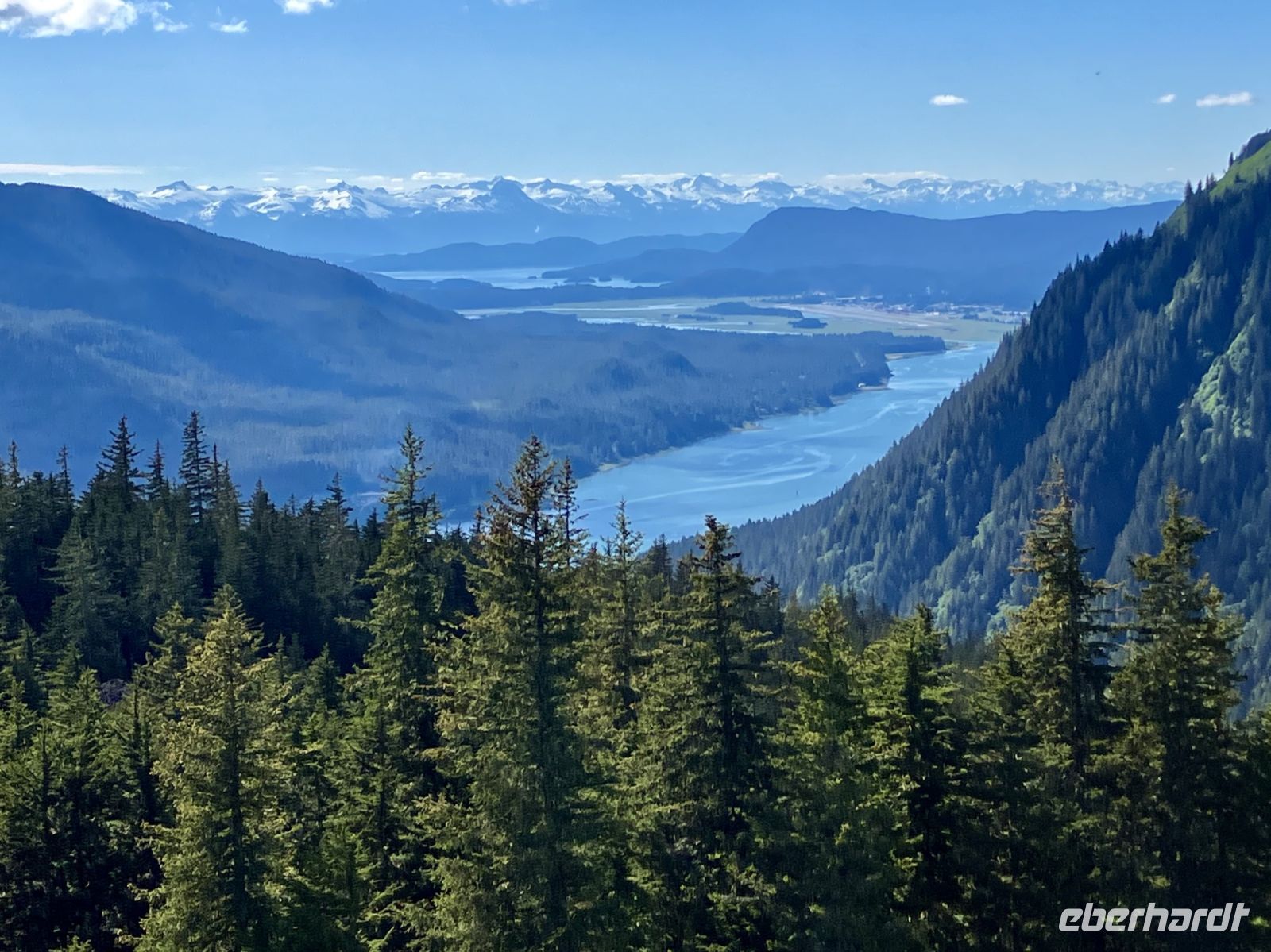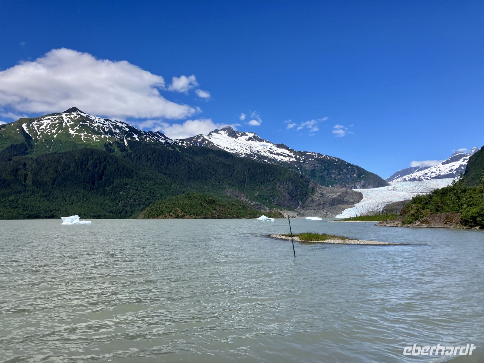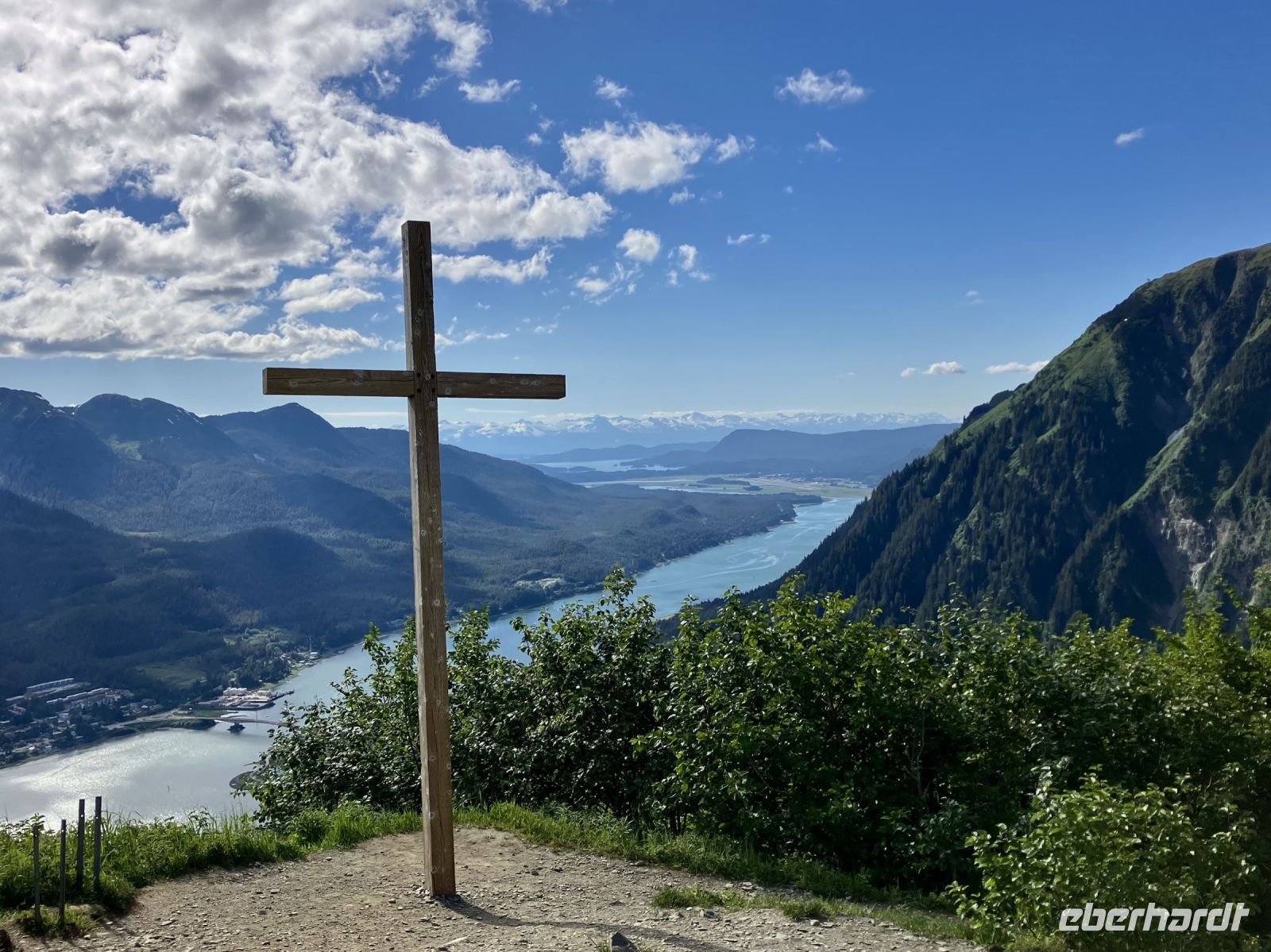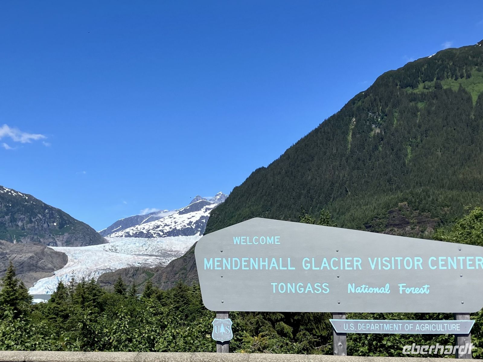 Heute bekommen wir wieder eine Stunde dazu. Wir haben nun bereits 10 Stunden unterschied mit unseren Lieben zu Hause. Wir sind fast auf der anderen Seite der Welt. Schon toll. Einige treffen sich wieder auf Deck 9 zum Yoga, aber dieses mal eine Stunde und wir lassen den Tai Chi sein. Aber uuups. Es war heute Nacht so nebelig, dass das Deck ganz nass ist. Also gibt es Yoga drinnen. Danach schmeckt das Fruehstueck immer noch besser. Heute wollen wir in den Tracy Arm segeln um dort den Sayward Gletscher zu sehen, wie er in das Meer kalbert. Leider wird das nichts, da wir so schnell wie moeglich nach Juneau weiterreisen muessen da ein Mitreisender auf dem Schiff schwer erkrankt ist. Die Person ist nicht von unserer Gruppe. So erreichen wir bereits um 11:30 die Hauptstadt Alaskas bei tollem Sonnenschein. Nach einem kleinen Mittagessen im Selbstbedienungs Restaurant treffen wir uns in der Lobby wie ausgemacht da wir heute einen privat – Ausflug unternehmen werden. Nach dem Ausschiffen spazieren wir gemuetlich zum Tramway wo wir auch bald unseren Bus sichten. Aaron, heisst der nette Fahrer der die uns heute zum Gletscher faehrt, er erzaehlt uns auch die Geschichte von Juneau, Hauptstadt Alaskas. Diese Stadt an der West Kueste Alaskas hat bloss 32‘000 Einwohner und kann nur per Schiff oder Flugzeug erreicht werden da sie von Eisfelder und Gletscher umrahmt ist. Es gibt jedoch eine 4-spurige Autobahn die liebevoll „the road“ heisst und etwa 30 Kilometer lang ist. Auf dieser Strasse fahren wir vorerst zum Aussichtspunkt des Mendenhall Gletschers mit seinem Besucherzentrum und Spaziergang. Das Wetter spielt heute auch mit und wir sehen wie sich dieser Gletscher, mit seinen hellblauen Spalten, wehrt in den See zu gleiten. Einige kleine Eisberge sind auf dem Mendenhall See zu sehen die muessen wohl kurz vor unserem Eintreffen gefallen sein. Wir haben genuegend Zeit einen schoenen Spaziergang bis zum grossen Wasserfall zu unternehmen. Es ist so warm, dass wir alle Jacken und Pullis in die Taschen und Beutel verstauen und im T-Shirt wandern. Es ist wunderschoen und sehr geruhsam hier. Nach diesem tollen Ausflug gehts mit dem Bus weiter, wieder in die Stadt hinein zum Hafen. Vorerst machen wir jedoch noch einen Stop bei einem kleinen Park wo sich eine Skulptur eines springenden Buckelwales befindet. Es ist auch ein Wasserspiel. Der Wal schaut toll aus, schaut Euch die Fotogalerie an. Nach diesem Fotostop fahren wir weiter Richtung Hafen zu der Seilbahn die hier Tramway genannt wird. Hinauffahren ist super und sehr unterhaltsam. Oben begeben wir uns auch gleich auf Wanderschaft auf die Aussichtsterassen. Was fuer eine herrliche Aussicht auf Juneau und den Gastineau Kanal. Einige schaffen es bis zum Gipfelkreuz zu gelangen in der gegebener Zeit. Nun kommt noch die die Talfahrt mit der Seilbahn und gleich danach den Absacker im Red Onion Pub. Flotte Musik, gutes Bier, Saegespaene am Boden, so geniessen wir den Abschluss von Juneau. Das Abendessen im grossen Speisesaal ist wieder sehr lecker und die Pianistin in der Piano Bar unterhaelt uns noch lange, bis wir nicht in unsere Kabinen gelangen. Morgen muessen wir schon in der Frueh fit sein, da Skagway auf uns warten wird. Also, gute Nacht allerseits, traeumet suess von dem schoenen Tag in Alaska.