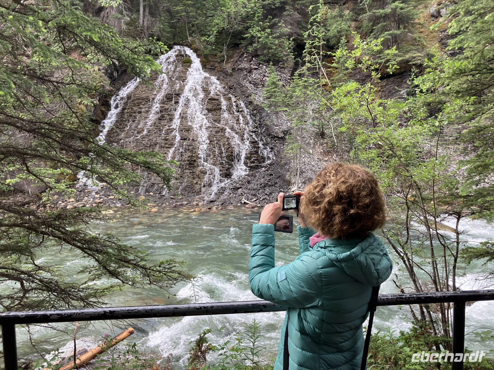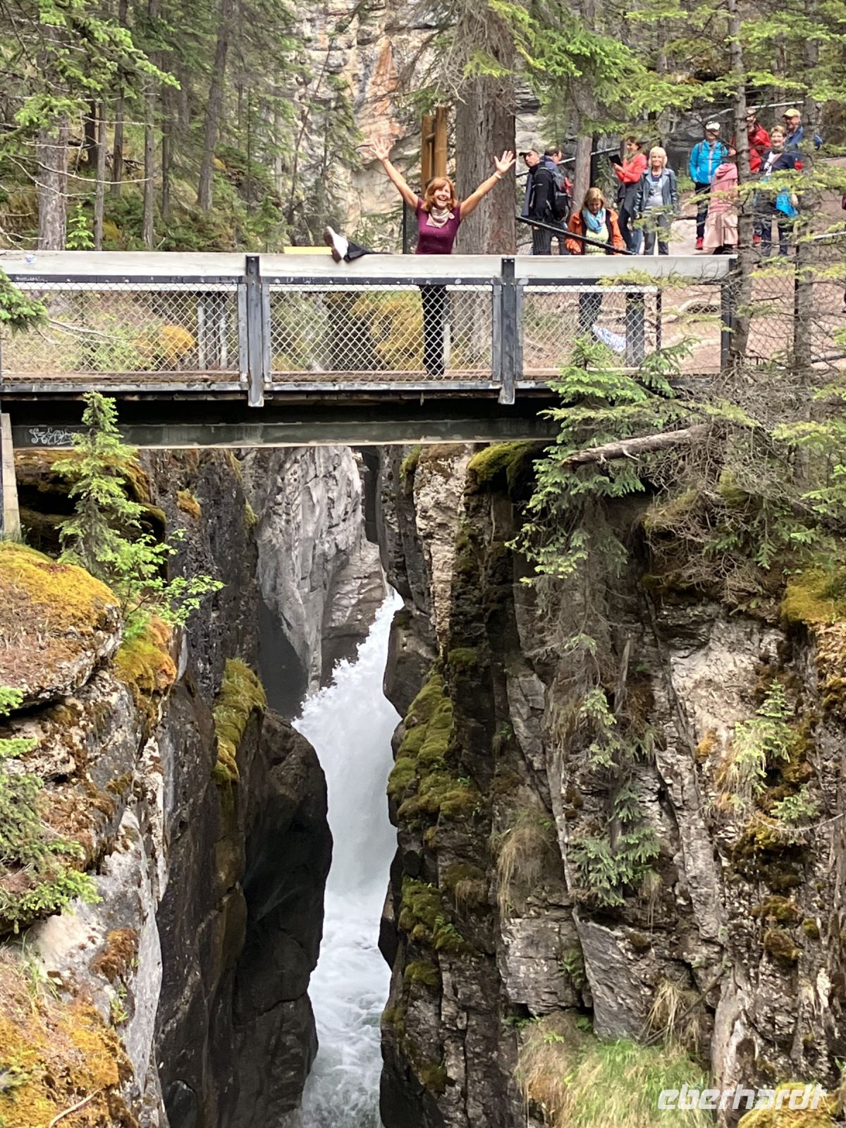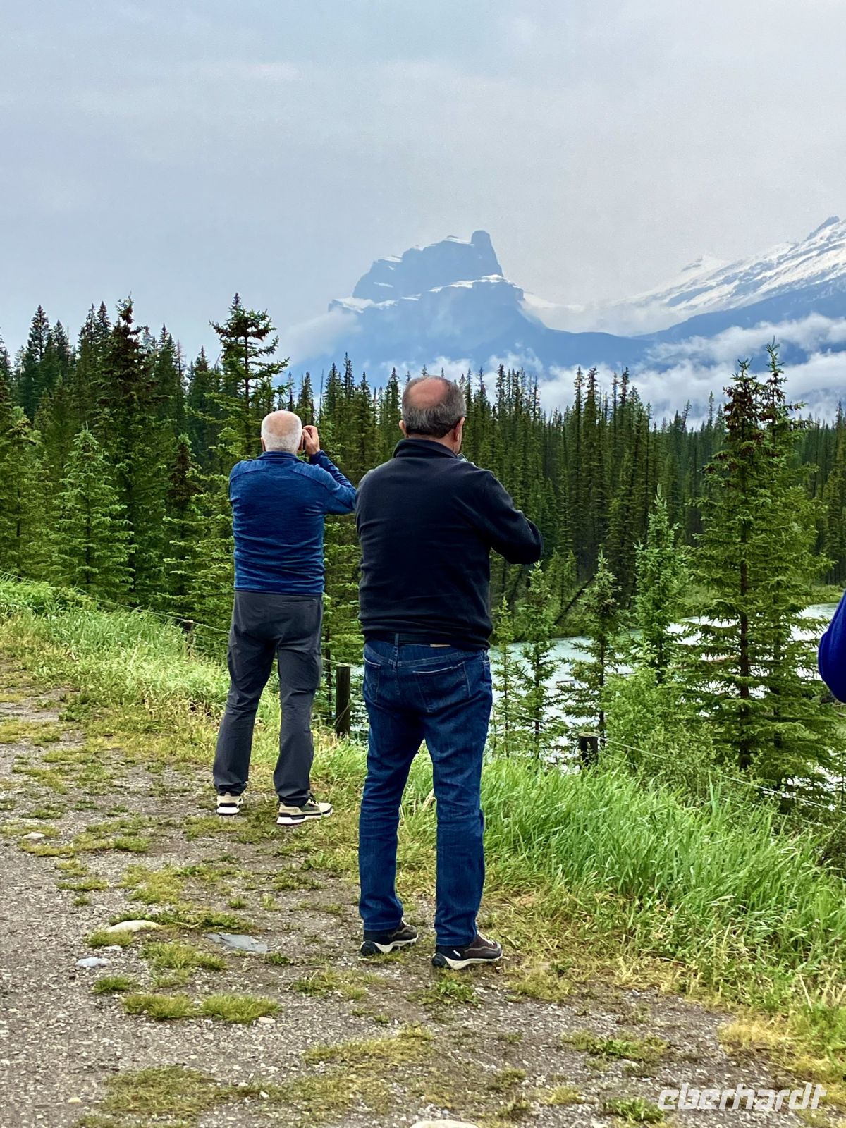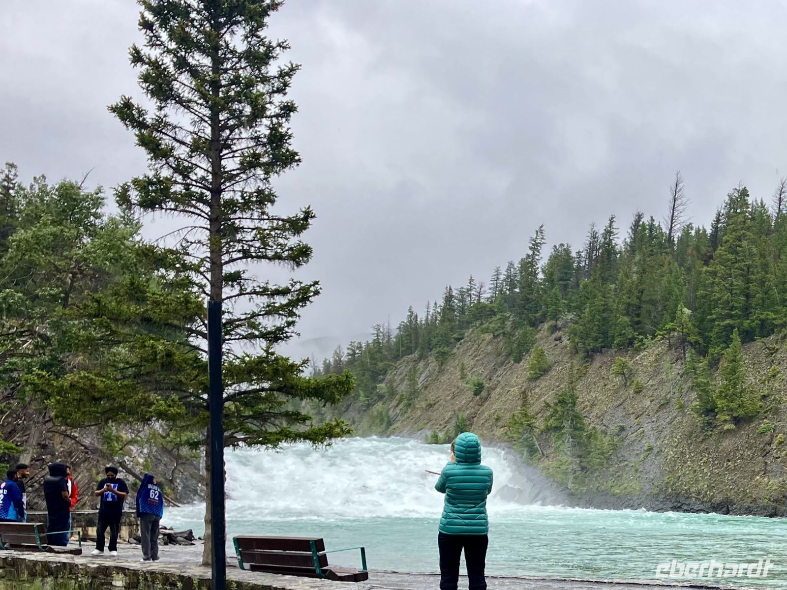 Guten Morgen ! Uuups es regnet wie vorhergesagt also werden die warmen und wasserdichten Klamotten aus dem Koffer befreit. Das Muesli ist ganz toll und die Pfannkuchen erst, ein schoenes Fruehstueck beglueckt uns. Kim steht strahlend mit ihrem Schirm bereit. Heute fahren wir erstmals mit der Gondel auf den Sulphur Mountain. Die Aussicht von dort oben ist sicher toll, wir sehen die Aussicht von der Gondel aus da die Wolken den ganzen Berg eingehuellt haben. Nichts desto trotz unternehmen fast alle die kurze Wanderung auf einem schoen angelegtem „Holzweg“. Sie fuehrt uns zu Samsons Cabin. Wir geniessen die Aussicht “Weiss in weiss”. Eine Stunde spaeter fahren wir mit der Gondel wieder ins Tal und gleich weiter auf unsere Banff Tour. Vorerst wird das imposante Banff Springs Hotel bestaunt und den Bow Wasserfall. Ach, wie mag sie bloss ausgeschaut haben, die schoene Marilyn Monroe mit ihrem Bein im Gips. Und der Lassie, der ist wohl ueber den Fluss geschwommen auf den kleinen Strand gegenueber, um jemanden zu retten… Unsere Besichtigung geht nun weiter mit schoenen wenn auch nassen Aussichten auf Banff und die Umgebung. Auch die lustigen Steinformationen werden in unseren Handys verewigt. Nun schwenken wir noch zum Miniwanka See ab, halten beim schoenen 2 Jack Lake an und schauen wo sich die Krummhornschafe verstecken. Ach ja, die haben wohl keinen Schirm und sind daheim geblieben. Nun ist aber Zeit fuer die Mittagspause in Banff ehe wir das Nachmittagsprogramm starten. Es geht in Richtung Lake Louise. Aber da es regnet in Stroemen fahren wir vorerst zu den Spiraltunnels. Ein Festschmaus der Ingenieure bietet sich hier unseren Augen. Nun ist Zeit fuer den Emerald Lake, er leuchtet in seiner gruenen Farbe umgeben von hohen Bergen die imposante Namen tragen, wie The President, The Prime Minister und so fort. Nach einem schoenen Spziergang entlang des Sees fahren wir zur Natuerlichen Bruecke. Toll, wie sich das Wasser kraftvoll unter der Steinbruecke durchzwaengt. Auf dem Weg wieder zurueck nach Banff machen wir noch einen Halt bei der Logan Bahnstation gleich neben Lake Louise. Hier presentiert sich ein Buehnenbild des Films Dr. Schiwago. Wir sehen sie fast, Lara, die dem guten Omar Shereef nachwinkt.