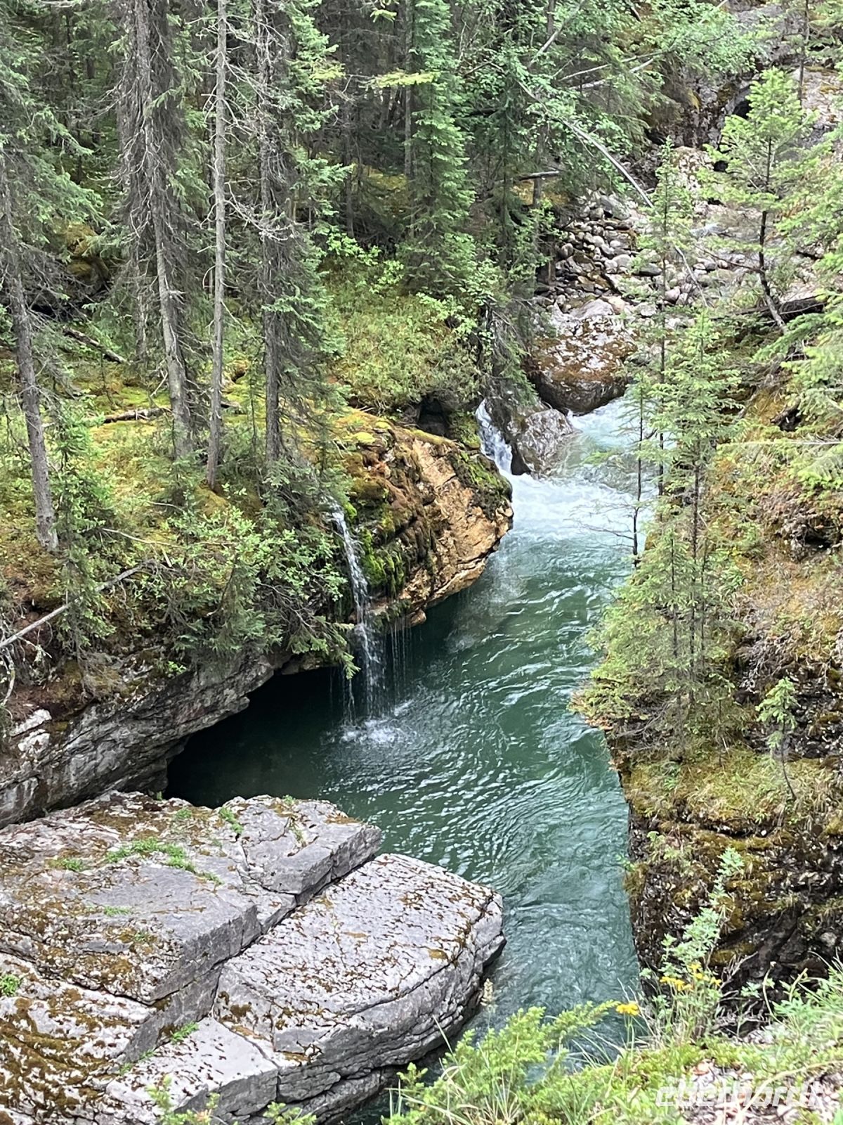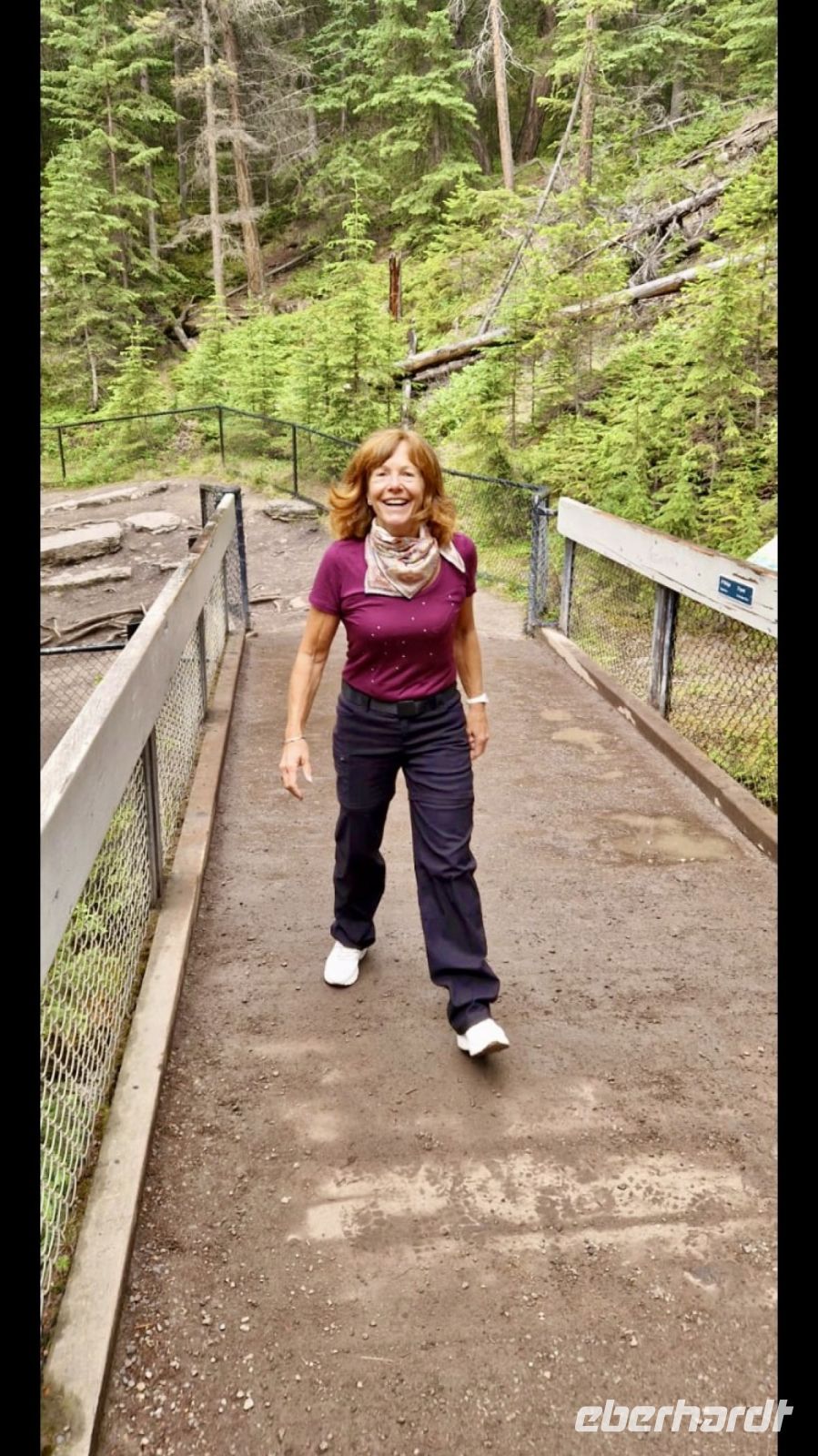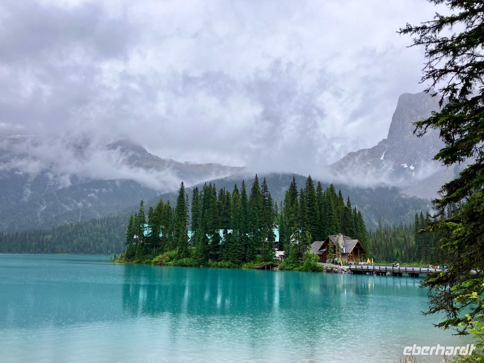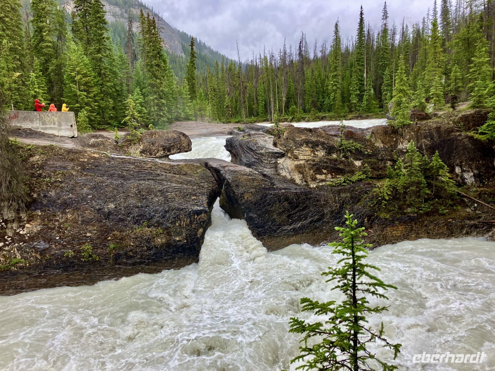 Guten Morgen ! Uuups es regnet wie vorhergesagt also werden die warmen und wasserdichten Klamotten aus dem Koffer befreit. Das Muesli ist ganz toll und die Pfannkuchen erst, ein schoenes Fruehstueck beglueckt uns. Kim steht strahlend mit ihrem Schirm bereit. Heute fahren wir erstmals mit der Gondel auf den Sulphur Mountain. Die Aussicht von dort oben ist sicher toll, wir sehen die Aussicht von der Gondel aus da die Wolken den ganzen Berg eingehuellt haben. Nichts desto trotz unternehmen fast alle die kurze Wanderung auf einem schoen angelegtem „Holzweg“. Sie fuehrt uns zu Samsons Cabin. Wir geniessen die Aussicht “Weiss in weiss”. Eine Stunde spaeter fahren wir mit der Gondel wieder ins Tal und gleich weiter auf unsere Banff Tour. Vorerst wird das imposante Banff Springs Hotel bestaunt und den Bow Wasserfall. Ach, wie mag sie bloss ausgeschaut haben, die schoene Marilyn Monroe mit ihrem Bein im Gips. Und der Lassie, der ist wohl ueber den Fluss geschwommen auf den kleinen Strand gegenueber, um jemanden zu retten… Unsere Besichtigung geht nun weiter mit schoenen wenn auch nassen Aussichten auf Banff und die Umgebung. Auch die lustigen Steinformationen werden in unseren Handys verewigt. Nun schwenken wir noch zum Miniwanka See ab, halten beim schoenen 2 Jack Lake an und schauen wo sich die Krummhornschafe verstecken. Ach ja, die haben wohl keinen Schirm und sind daheim geblieben. Nun ist aber Zeit fuer die Mittagspause in Banff ehe wir das Nachmittagsprogramm starten. Es geht in Richtung Lake Louise. Aber da es regnet in Stroemen fahren wir vorerst zu den Spiraltunnels. Ein Festschmaus der Ingenieure bietet sich hier unseren Augen. Nun ist Zeit fuer den Emerald Lake, er leuchtet in seiner gruenen Farbe umgeben von hohen Bergen die imposante Namen tragen, wie The President, The Prime Minister und so fort. Nach einem schoenen Spziergang entlang des Sees fahren wir zur Natuerlichen Bruecke. Toll, wie sich das Wasser kraftvoll unter der Steinbruecke durchzwaengt. Auf dem Weg wieder zurueck nach Banff machen wir noch einen Halt bei der Logan Bahnstation gleich neben Lake Louise. Hier presentiert sich ein Buehnenbild des Films Dr. Schiwago. Wir sehen sie fast, Lara, die dem guten Omar Shereef nachwinkt.