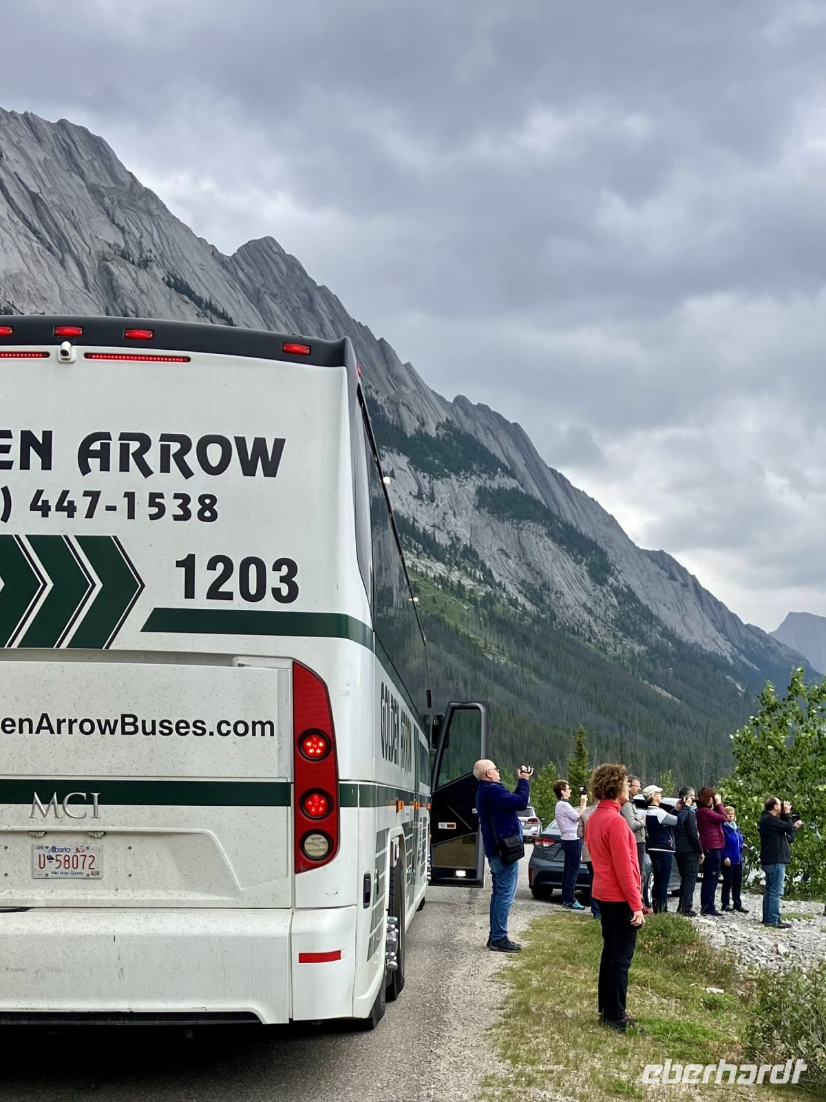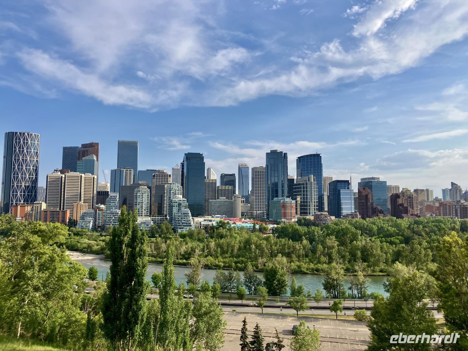 Bei Ankunft in Calgary wartet Kim, unsere Fahrerin bereits auf uns. Ein richtig grosser schoener Bus wird unser Daheim fuer die naechsten 6 Tage. Die Stadtbesichtigung von Calgary beeindruckt vor allem durch die moderne Skyline mit den vielen verglasten Hochhaeuser. Nun fahren wir beim Olympia-Zentrum der Spiele von 1988 vorbei, erinnern uns an Katharina Witt, Eddy the Eagle und die jamaikanische Bobmanschaft und schon gehts weiter in die lang ersehnten Rocky Mountains. Die Sonne lacht, alles ist perfekt. Wenn wir doch nur nicht so sehr muede waeren. Alles vergeht wie in einem Traum, denn wir sind nun bereits seit 24 Stunden unterwegs und sehnen uns nur noch nach dem schoenen Bett in unserem Hotel.