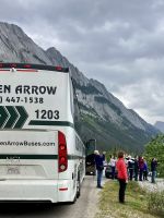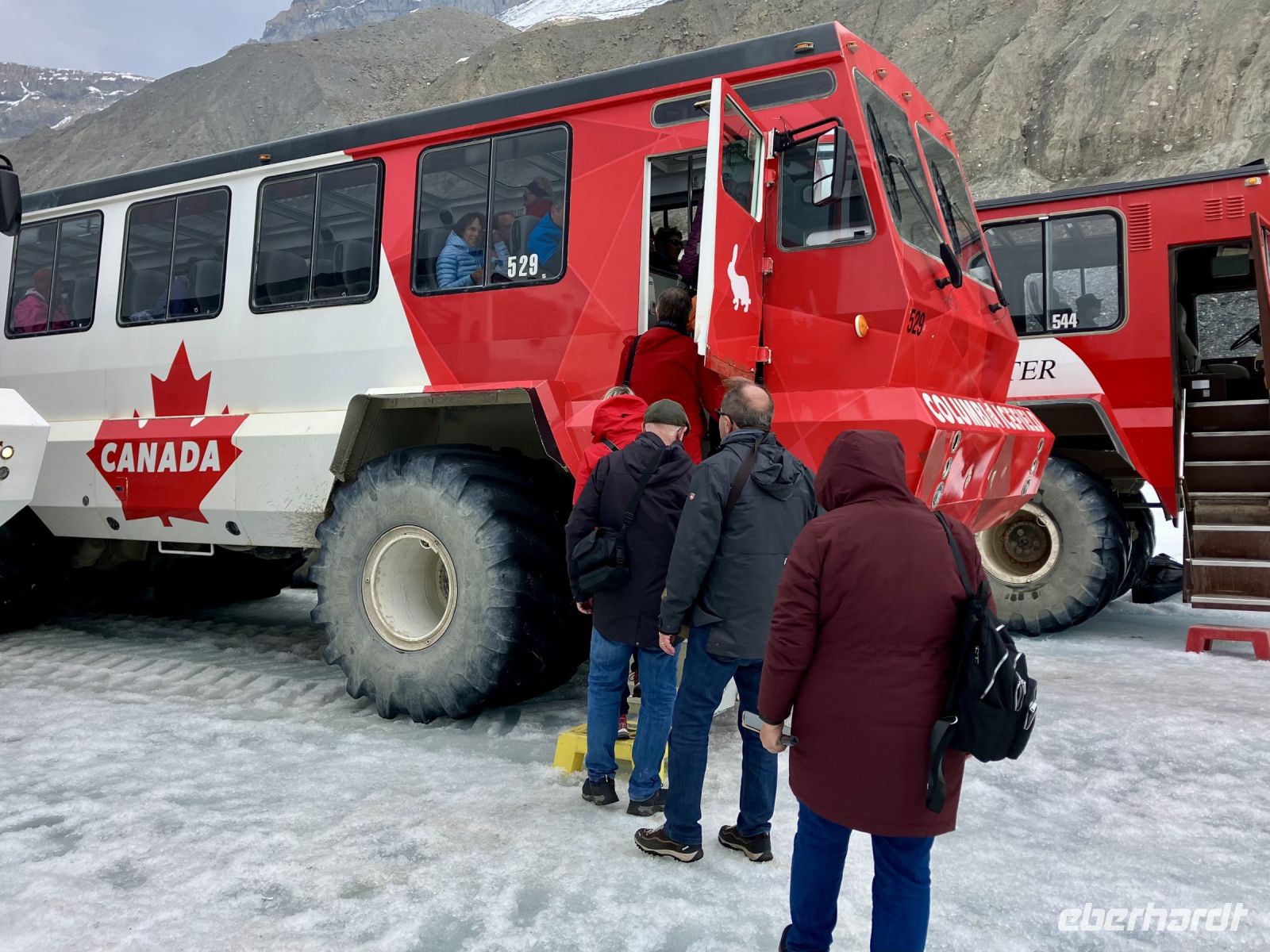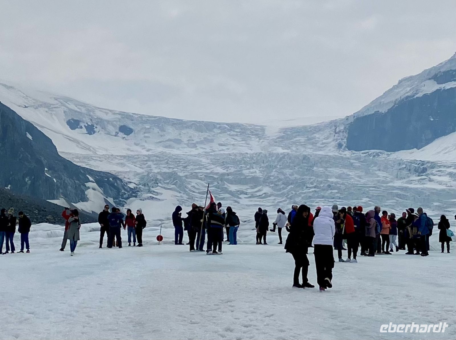 Super, es hat aufgehoert zu regnen und wir sehen endlich die Bergspitzen die sogar etwas angezuckert wurden ueber Nacht. Es ist leicht bewoelkt und wir sind heilfroh, dass wir die Sommer-garderobe aus dem Koffer holen koennen. Heute wollen wir gleich eine kleine Wanderung im Johnston Canyon unternehmen. Vorerst aber halten wir um den schoenen Schlossberg bildlich festzuhalten. So ein tolles Motiv mit dem hellen Bow Fluss davor. Die Wanderung in die Schlucht des Johnston Cayon ist wunderschoen und sehr angenehm zu gehen. Wir muessen uns heute jedoch ein wenig beeilen da wir vieles auf dem Programm stehen haben. Also fahren wir auch gleich weiter zum weltbekannten Lake Louise. Ja, beim Anblick dieses Sees ist es sehr wohl verstaendlich, dass wir hier nicht die einzigen sein koennen, die den Lake Louise gefunden haben. Der milchig-hellblaue See, die bewaldeten Berge, der Victoria Gletscher und die Blumen, alles ist wie im Bilderbuch. Nach diesem schoenen Aufenthalt geht es nun weiter auf die beruehmte Gletscherstrasse. Da, beim Hektor Lake sehen wir auch einen wunderschoenen grossen glaenzenden Baer, wie er gleich neben dem Bus dahergeht. Er schaut uns nicht mal an, wobei wir doch an den Fenstern kleben mit unseren Handys und Photoapparaten. Er ist so gelassen, dass er sich sogar bei einem kleineren Baum aufrichtet und sich den Ruecken massiert. So was suesses. Beim Kraehenfuss Gletscher halten wir auch an, denn es ist der erste schoene Haengegletscher den wir gleich neben der Strasse sehen. Wenn das der Haeuptling Crowfoot wuesste dass da einmal Touristenbusse halten werden….so, nun aber weiter, zum Bow Lake mit seinem Bow Gletscher auf dem Mt Bow !! Heute gibt es auch Fotokurs fuer Landschaftsbilder mit See. Kein See bietet schoenere Motive als der Bow See. Und so biegen, kruemmen und strecken sich unsere Fotografen in alle moegliche und unmoegliche Positionen um das beste Spiegel-Bild von Bow Lake mit oder ohne Steine im Wasser oder Baeumchen im Vordergrund zu erhaschen. Peyto See ist danach auf unserem Programm. Man sieht auf ihn hinunter und er schaut doch wirklich fast wie ein langer Dackel aus. Aber es ist die Farbe dieses Sees, die so einzigartig schoen ist. Nun gibt es eine kurze Erholung im Bus ehe wir einen Stopp beim Saskatchewan River Crossing einlegen. Hier nehmen wir ein kleines Mittagessen ein, ehe wir zum naechsten Highlight fahren : Die Gletscherfahrt auf dem Athabasca Gletscher. Mit einem Bus, der mit Riesenraeder versehen ist, auf einen Gletscher hinaufzufahren ist schon ein sehr interessanter Ausflug. Auf dem ewigen Eis stehend stossen wir mit einem Glaeschen kanadischem Whiskey auf einen schoenen Urlaub an und knipsen 100 Photos. Nach der halben Stunde auf dem Eis, fahren wir nun wieder den Gletscher hinunter, sehen ein Krummhorn-maedchen und rollen danach mit einem normalen Bus wieder zum Ausgangspunkt. Nun eilen wir noch zu den Toi’s des Guiness Buches, schauen uns das Museum an, ehe wir in Richtung Jasper weiterfahren. Noch einen Abstecher zu den Athabasca Faellen. Toll dieser Wasserfall und vor allem das bunte Gestein der Schlucht fasziniert uns. Nun sind wir aber muede und freuen uns, dass unser Hotel nicht mehr weit ist. Die Zimmer in der Beckers Lodge sind Blockhuetten am Athabasca Fluss, romantisch, idyllisch wunderschoen. Das Abendessen schmeckt sehr fein und ist auch sehr ueppig, sodass wir nur schnell in die Federn fallen wolle um lange von dem ereignisreichen Tag traeumen zu koennen.