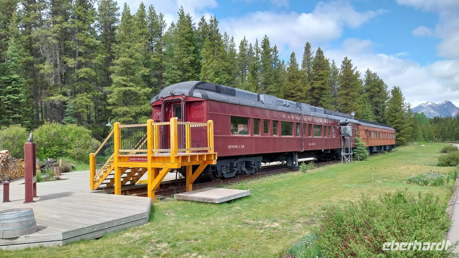 Gleich zu Beginn entdeckten wir am Bahnhof von Banff den berühmten Rocky Mountaineer – ein luxuriöser Panoramazug, der seit den 1990er-Jahren auf einer der spektakulärsten Bahnstrecken der Welt unterwegs ist. Die großen Glasdächer der Waggons und das elegante Design machen ihn zum Traum vieler Kanada-Reisender. Ihn hier live zu sehen, war ein kleiner Bonusmoment am Morgen.