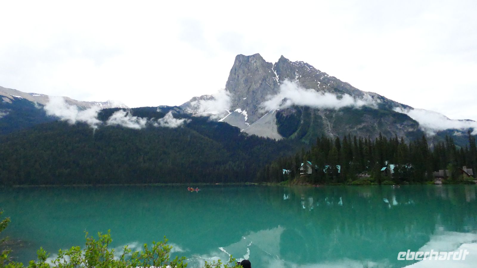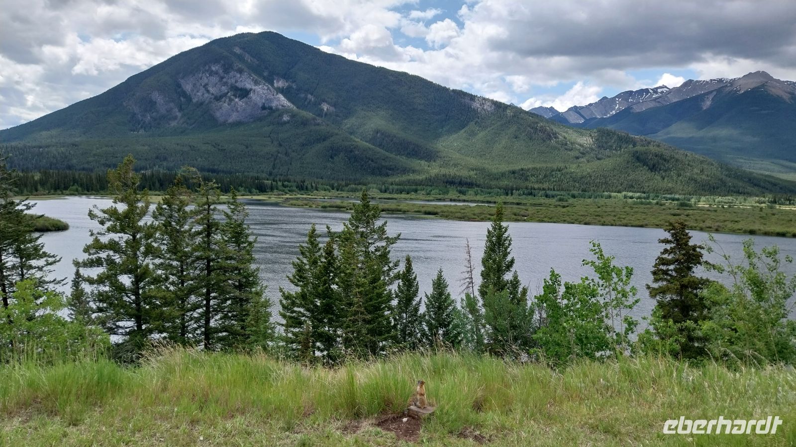 Anschließend fuhren wir durch den Marmor Canyon, vorbei an türkisblauen Seen und durch ein Reservatgebiet, in dem wir erneut tierisches Glück hatten: Ein junger Schwarzbär hatte sich in einen kleinen Baum zurückgezogen und lugte vorsichtig durch das Geäst.