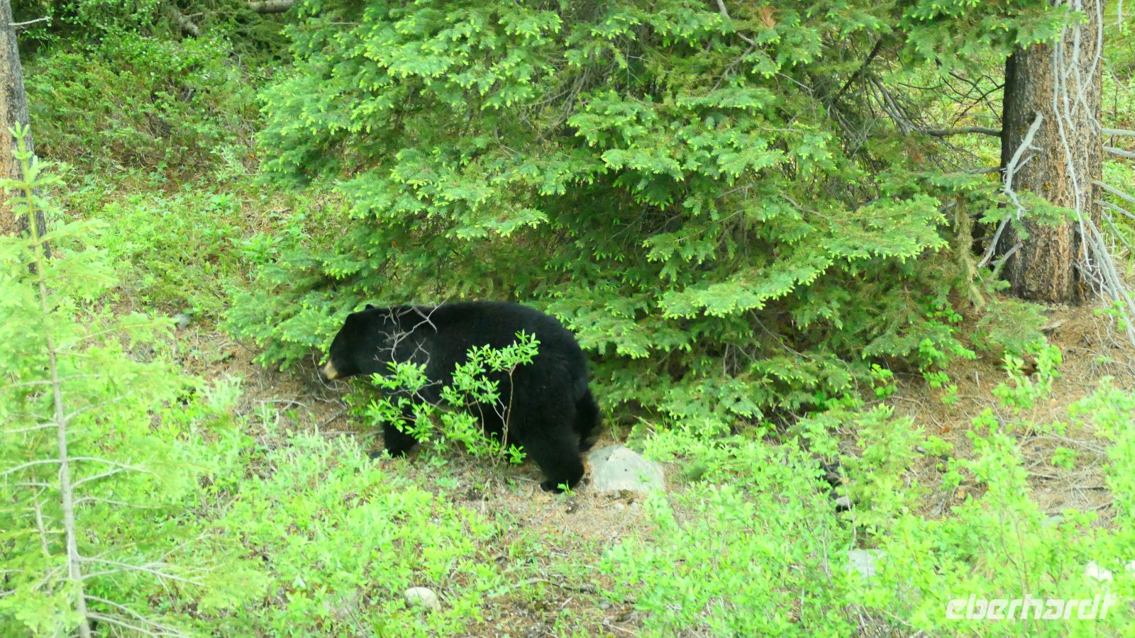 Unterwegs entdeckten wir wieder einen Schwarzbären – diesmal hoch oben in einem Baum. Offenbar war er auf der Suche nach Eßbarem oder einfach vor den zahlreichen Schaulustigen geflüchtet.