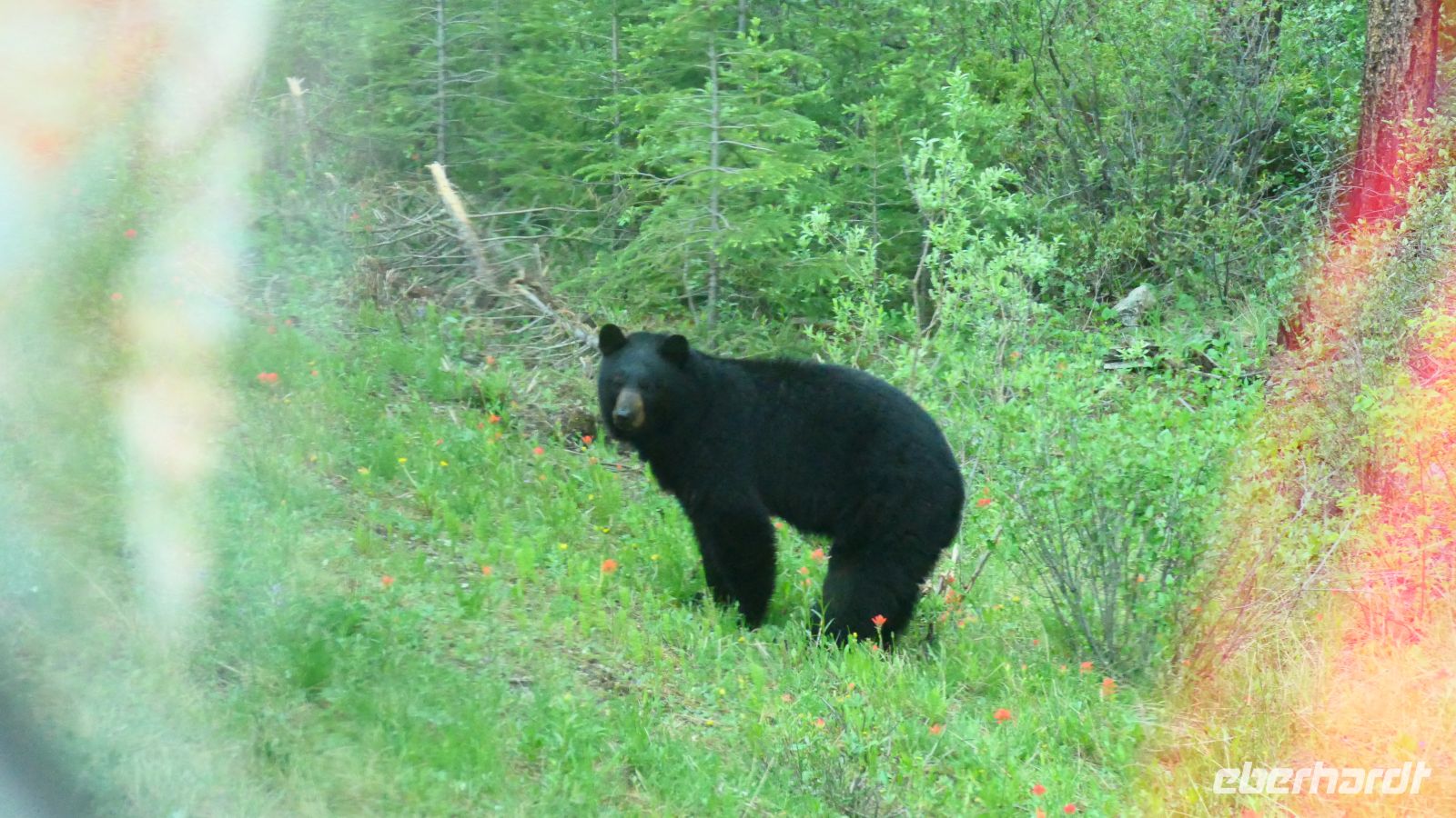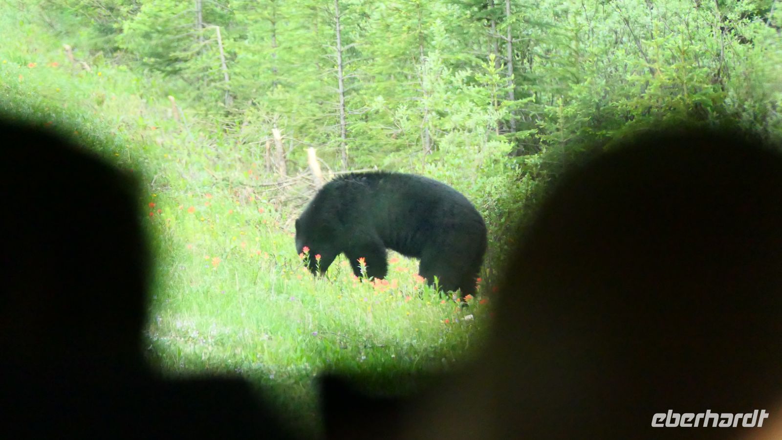Schon kurz nach der Abfahrt legten wir zwei schöne Fotostopps ein – die Bergwelt rund um Banff präsentierte sich von ihrer besten Seite, und die Kameras waren schnell zur Hand. Und dann passierte es: Am Straßenrand entdeckten wir unseren ersten Schwarzbären! Ganz entspannt schlenderte er durchs Gras, während wir ihn aus dem Bus beobachteten – ein tolles Erlebnis gleich zu Beginn.