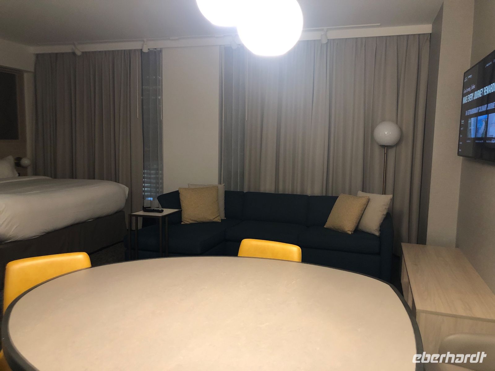 Die Zimmer sind groß und üppig ausgestattet: komplette Küche, Kaffee-Ecke, Kühlschrank und Tiefkühltruhe, Bügelbrett und Bügeleisen. Es gibt ein modernes Bad und ein großes weiches Bett. Der Blick aus den Fenstern im 11. bis 27. Stock fällt auf beleuchtete Wolkenkratzer und für einige auch auf den Calgary Tower, den Fernsehturm von Calgary.