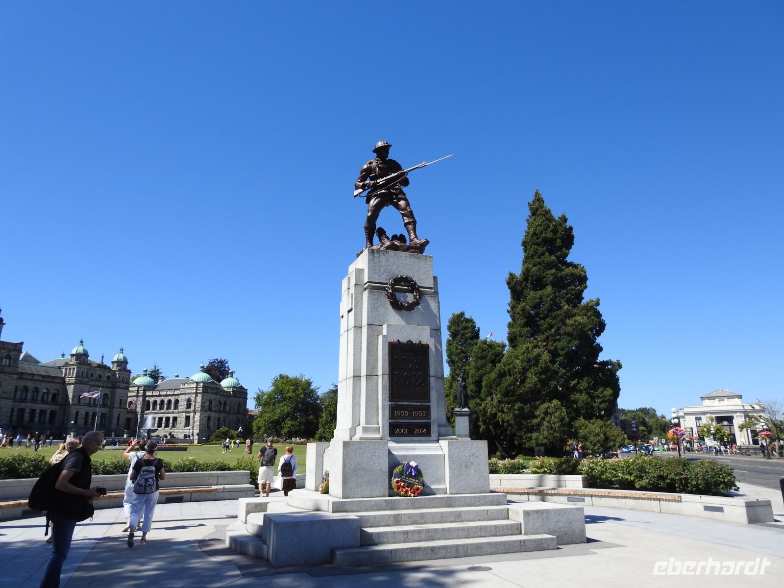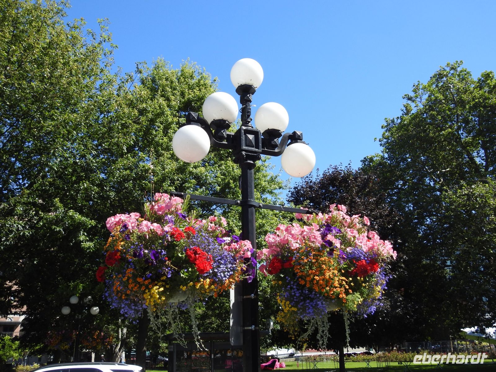 Wir unternehmen eine Minikreuzfahrt - heißt wir fahren mit der Fähre nach Vancouver Island, immerhin eineinhalb Stunden dauert die Überfahrt. Der Himmel ist blau und die Sonne lacht. Vancouver Island ist die größte Pazifikinsel Nordamerikas. Victoria ist die attraktive Hauptstadt der Provinz British Columbia. An der Südseite des Inner Harbour befindet sich das beeindruckende Parlamentsgebäude mit einer vergoldete Statue des George Vancouver auf der Kuppel. Nicht weit davon könnte man im Nobelhotel The Empress very british einen Afternoon Tea für viel Geld genießen. Wir besuchen den Thunderbird Park, wo einige Totempfähle zu bewundern sind und sich auch das Helmcken House befindet, seines Zeichens das älteste am Originalstandort verbliebene Gebäude der Provinz. In Chinatown durchqueren wir die schmalste Gasse Kanadas und kehren anschließend bei einem Bäcker zum Mittagessen ein. Den Nachmittag verbringen wir in Butchard Gardens und erfreuen uns an der üppigen Blumenpracht. Per Bus und Fähre geht es dann zurück nach Vancouver.
