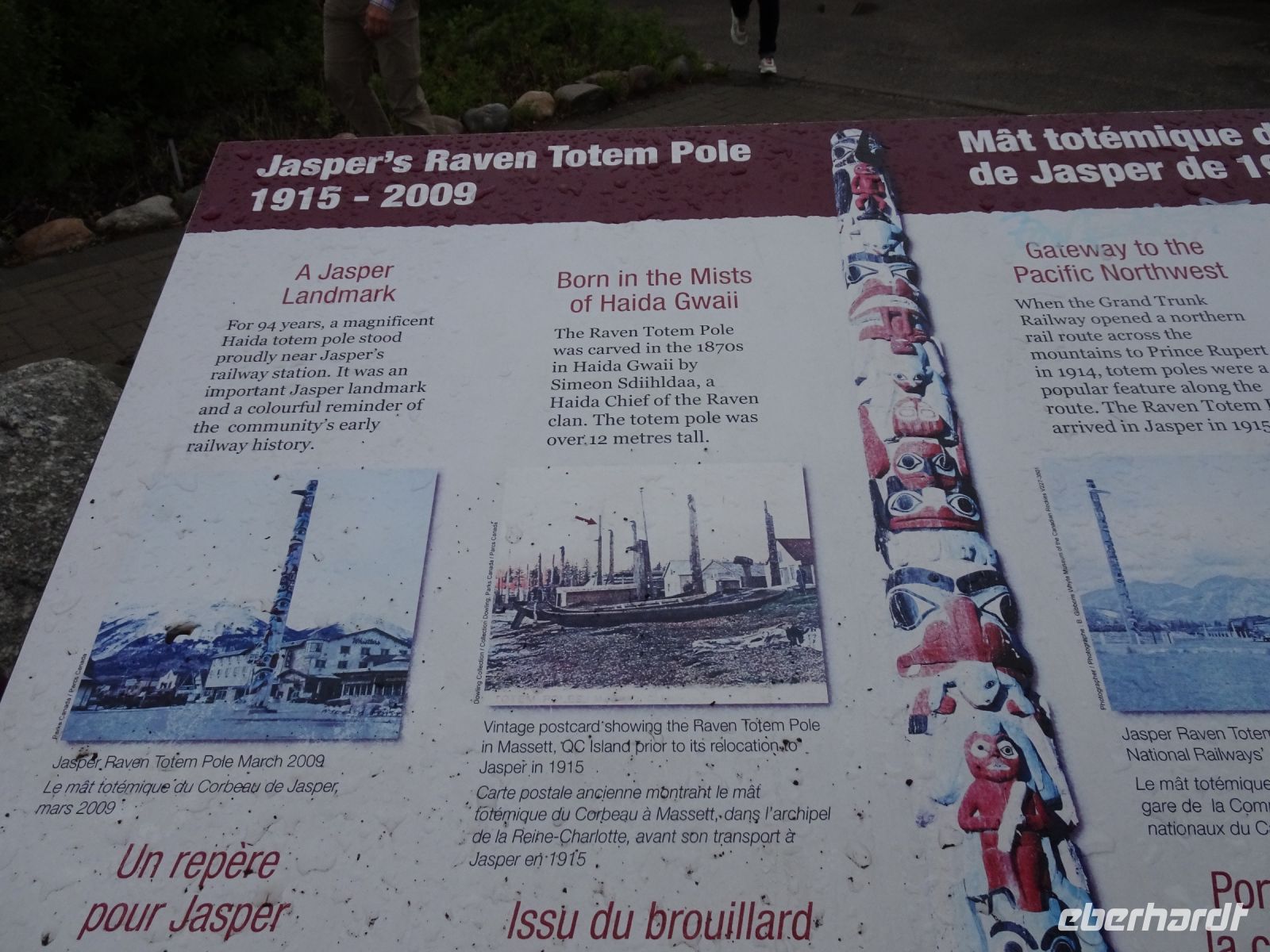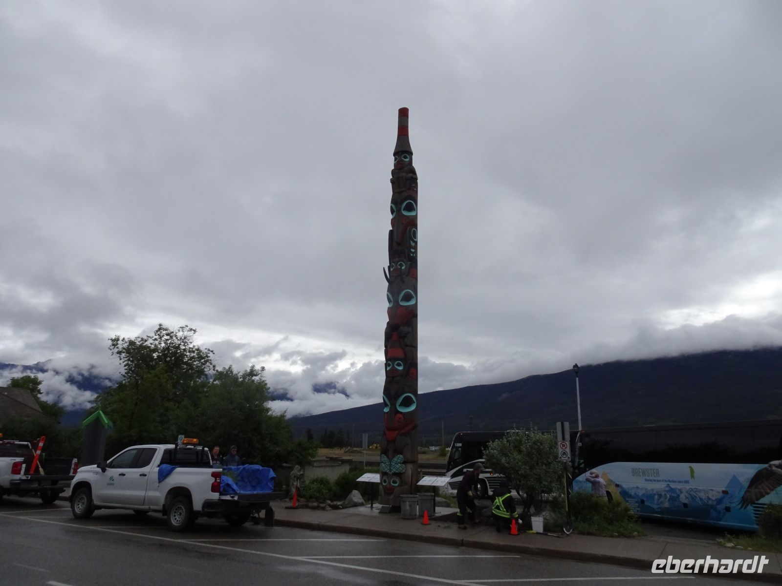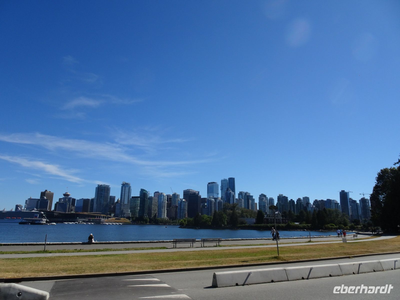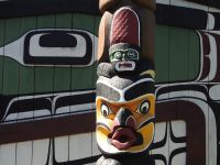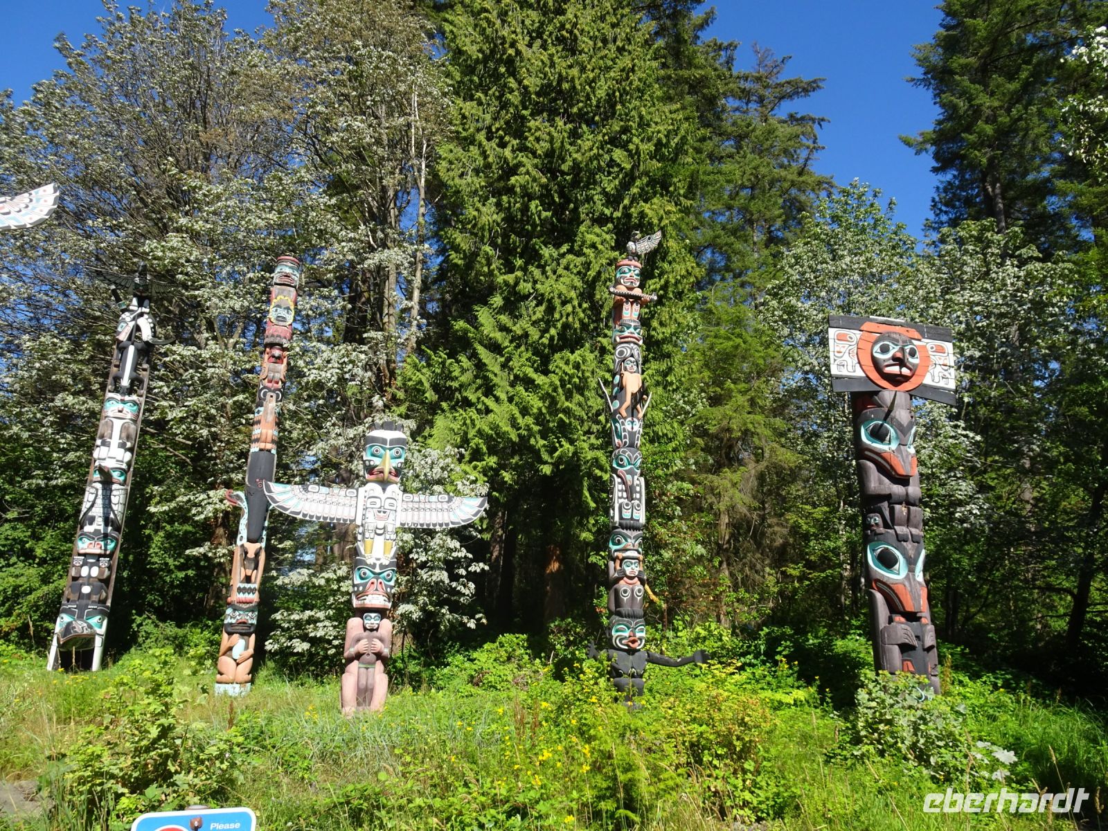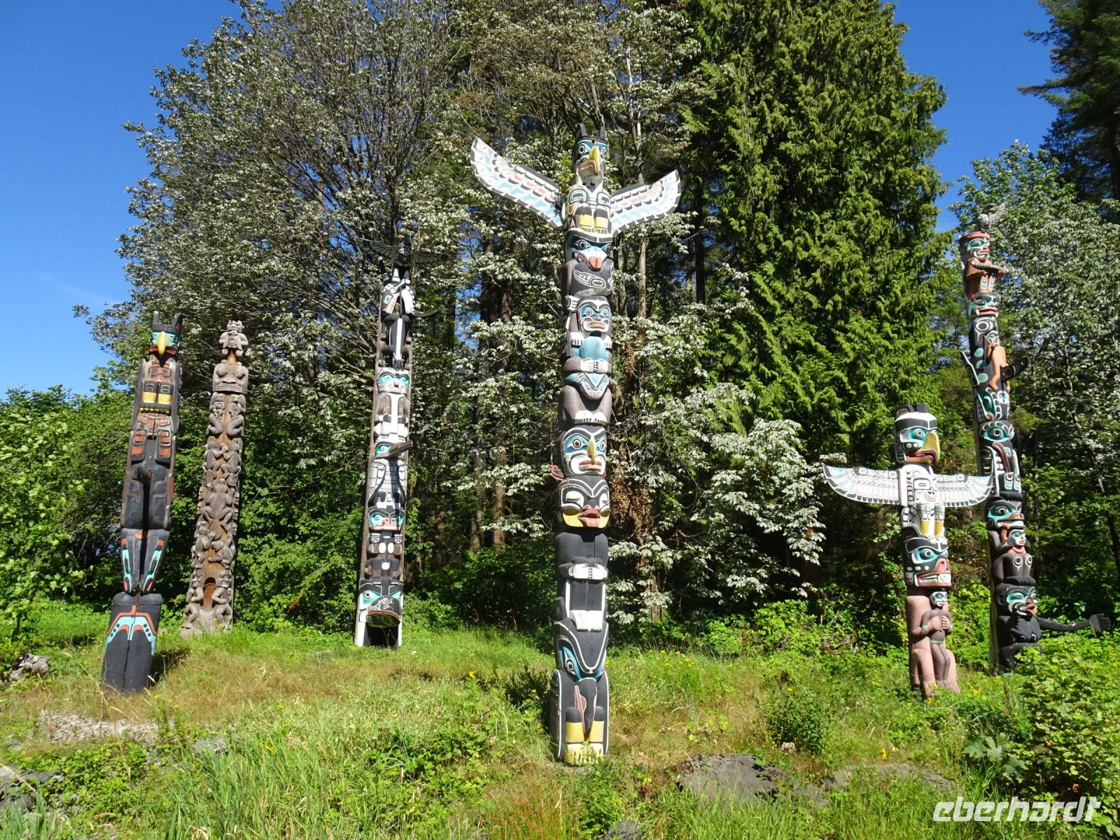 Ein langer Tag im Bus liegt heute vor uns, deshalb starten wir schon um acht. Die Fahrt führt uns durch eine beeindruckende Berglandschaft. Von weitem ist der Lac Le Jeune zu sehen, ein stahlblauer Fleck umgeben von tiefgrünem Wald. Weiter geht es durch Lower Nicola mit ein paar Stopps, bevor wir am Nachmittag Vancouver erreichen. Nun haben wir es nicht mehr mit aufragenden Bergen zu tun, sondern mit spiegelblanken Wolkenkratzern in beeindruckenden Formen. Wir fahren durch Chinatown und durch das Stadtviertel Gastown, wo just in dem Moment die Dampfuhr dampft und pfeift. Weiter geht es vorbei am Hafen, an der olympischen Fackelschale am Vancouver Convention Center, am ehemaligen Trumptower, der jetzt Paradox Hotel heißt, weil keiner dort Räume mieten wollte, bis zum Stanley Park. Hier bleibt Zeit für einen Fotostopp. Der Stanley Park befindet sich auf einer, mit Regenwald bedeckten, Landzunge. Hier gibt es ein umfangreiches Wegesystem, das von Fahrradfahrern, Joggern, Skatern und Spaziergängern genutzt wird. Am Brockton Point, wo wir unseren Stopp einlegen, haben wir einen fantastischen Blick auf die Skyline von Vancouver. Außerdem befinden sich hier mehrere Totempfähle, die zwar Nachbildungen alter Haida-Indianer Totems sind, aber uns trotzdem beeindrucken.