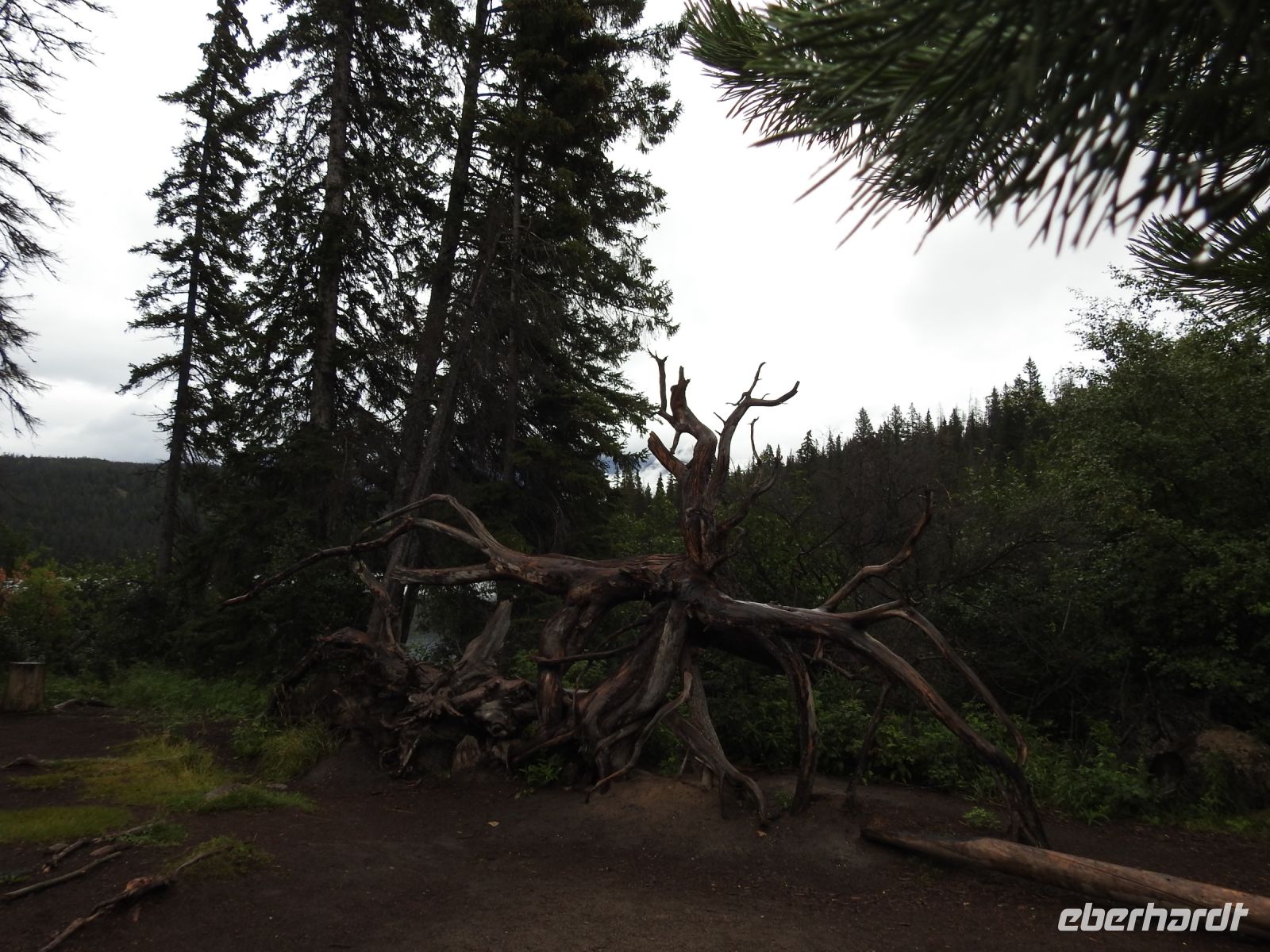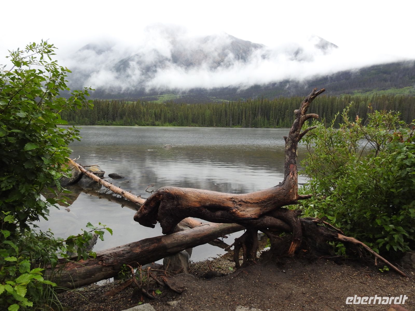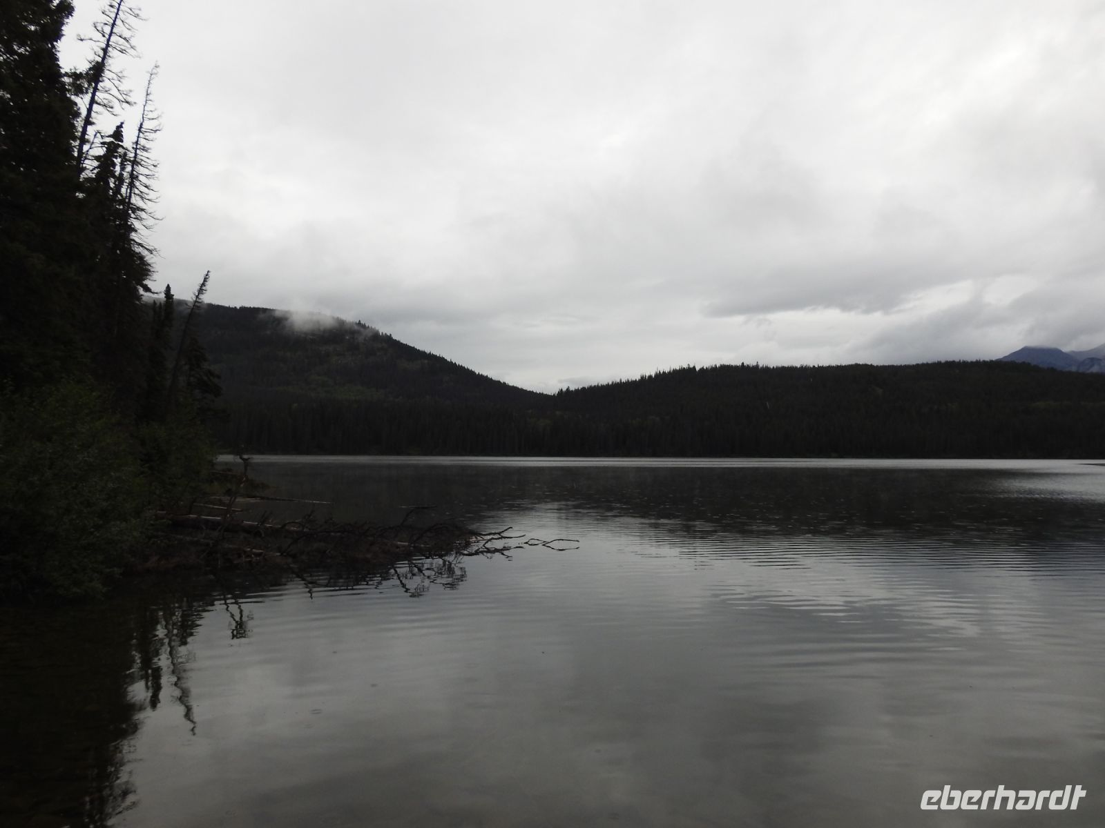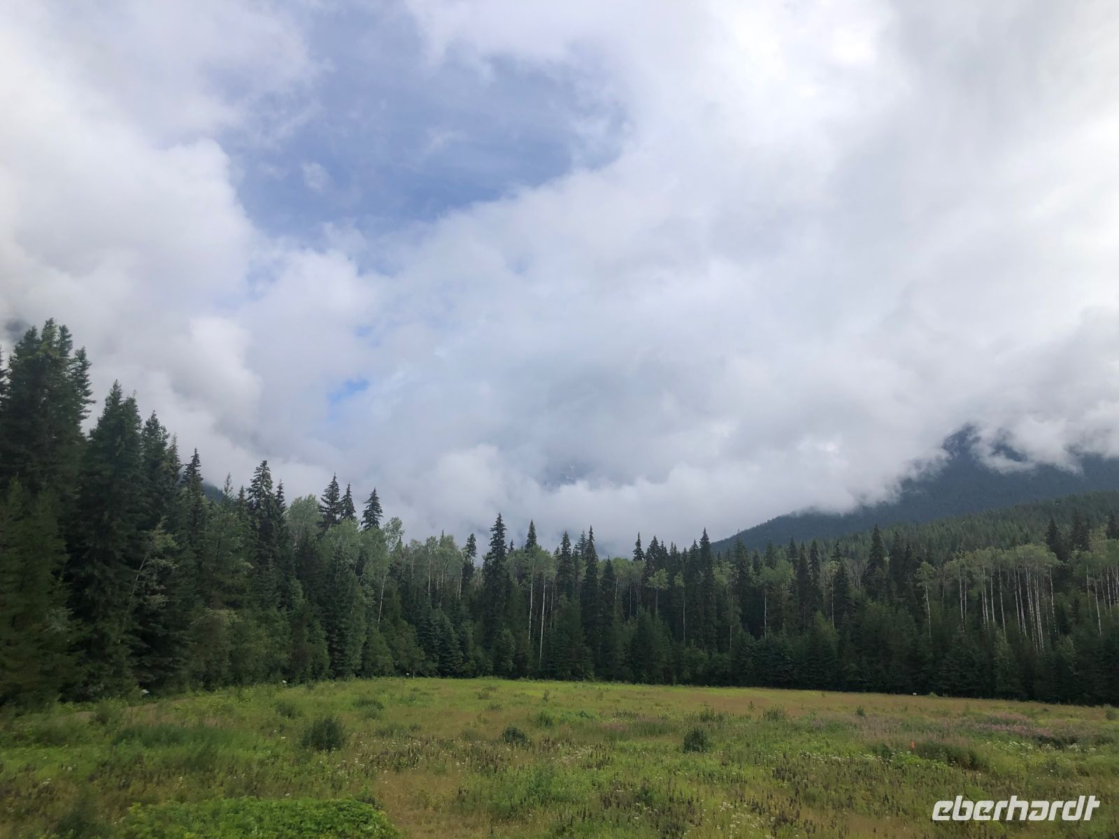 Der Tag beginnt grau und regnerisch. Wir durchqueren Jasper und fahren zum Mount Robson Provincial Park. Der Mount Robson ist mit 3954 Metern Höhe der höchste Berg in den kanadischen Rocky Mountains. Leider versteckt er sich heute hinter den Wolken. Nur auf der anderen Straßenseite sind schneebedeckte Gipfel zu sehen und wir können erahnen, wie schön der Mount Robson anzuschauen wäre.